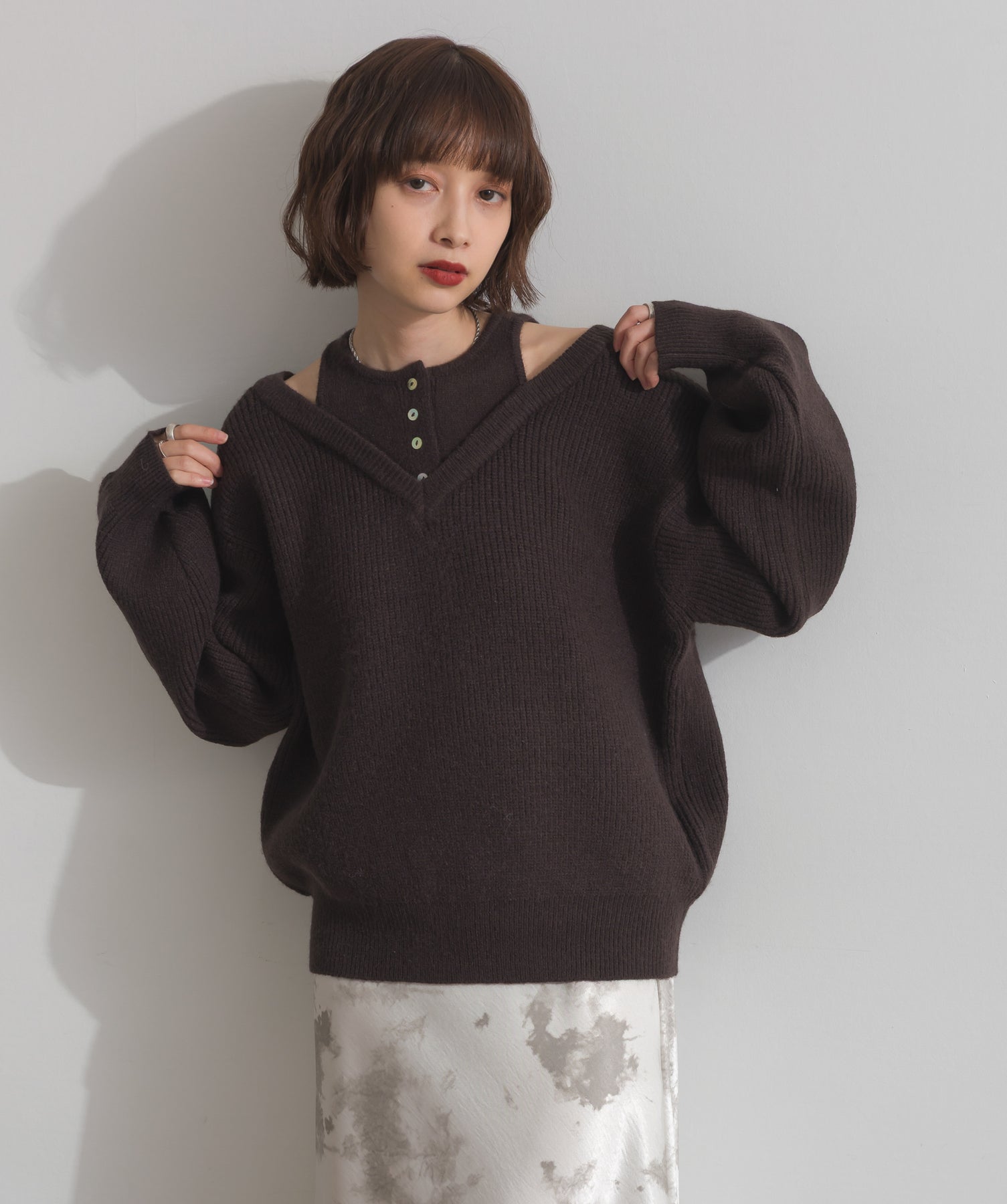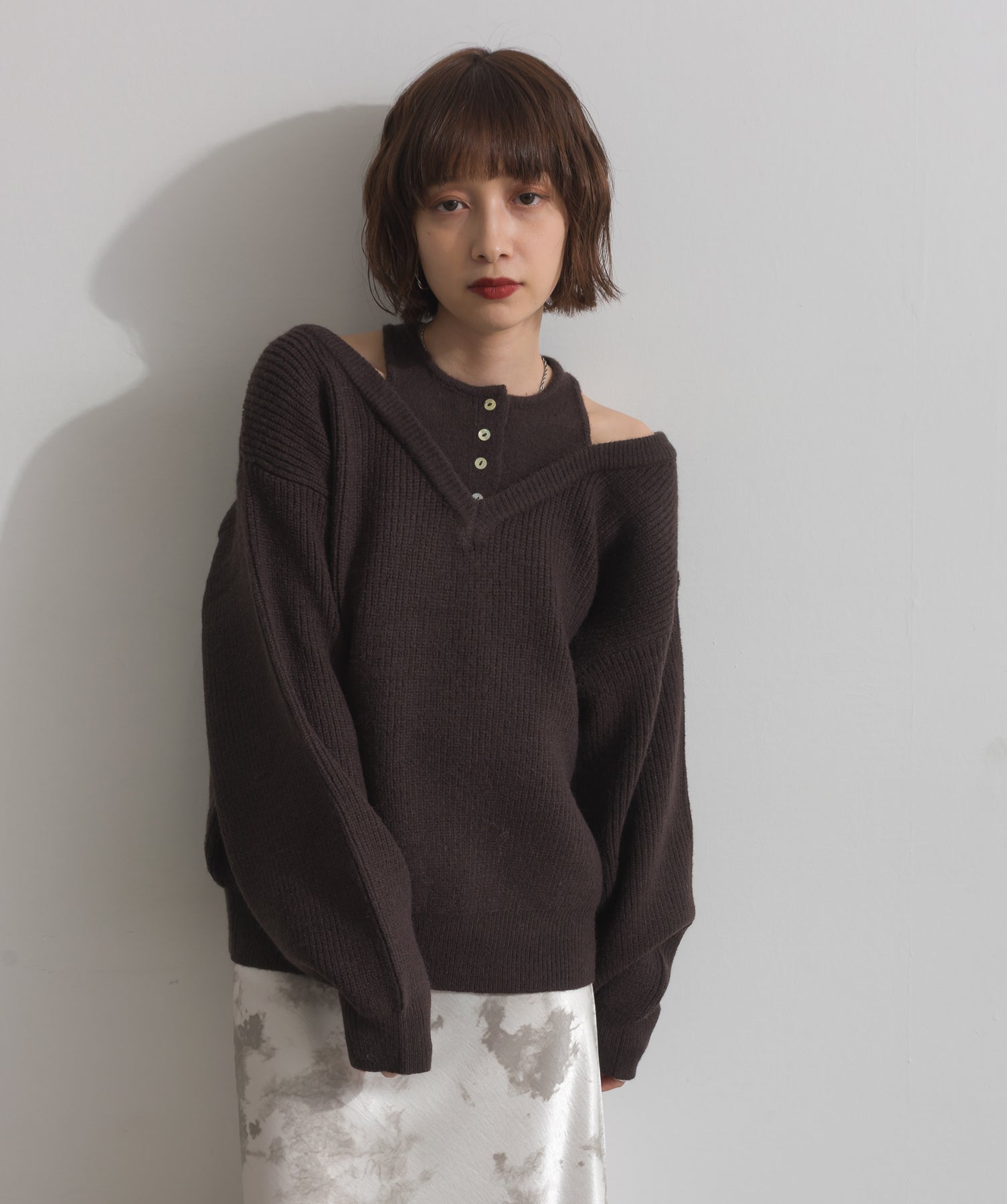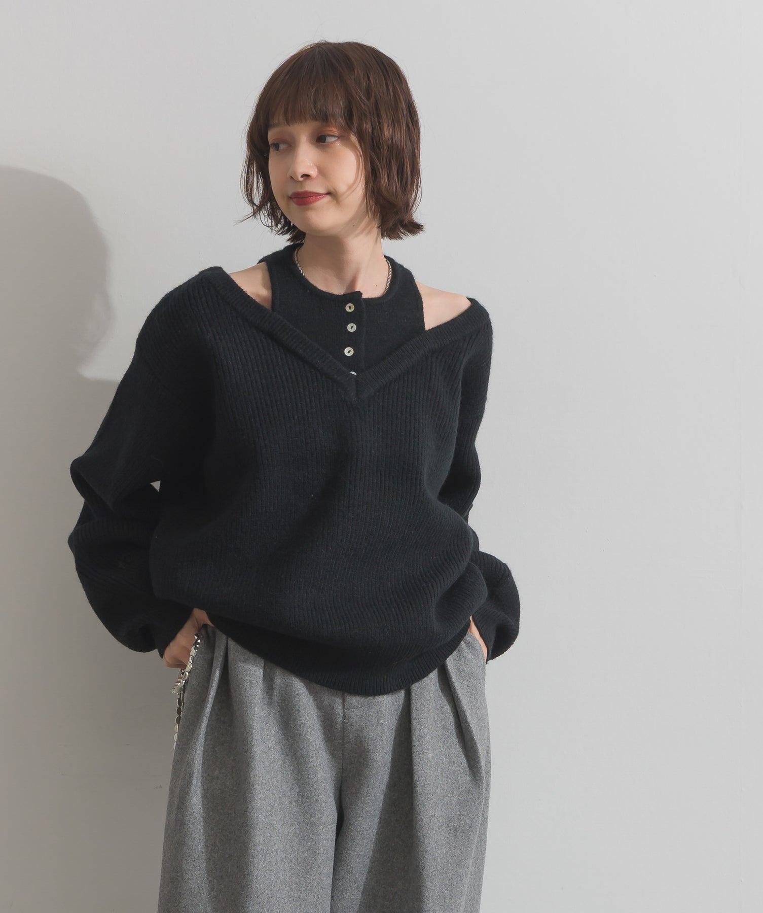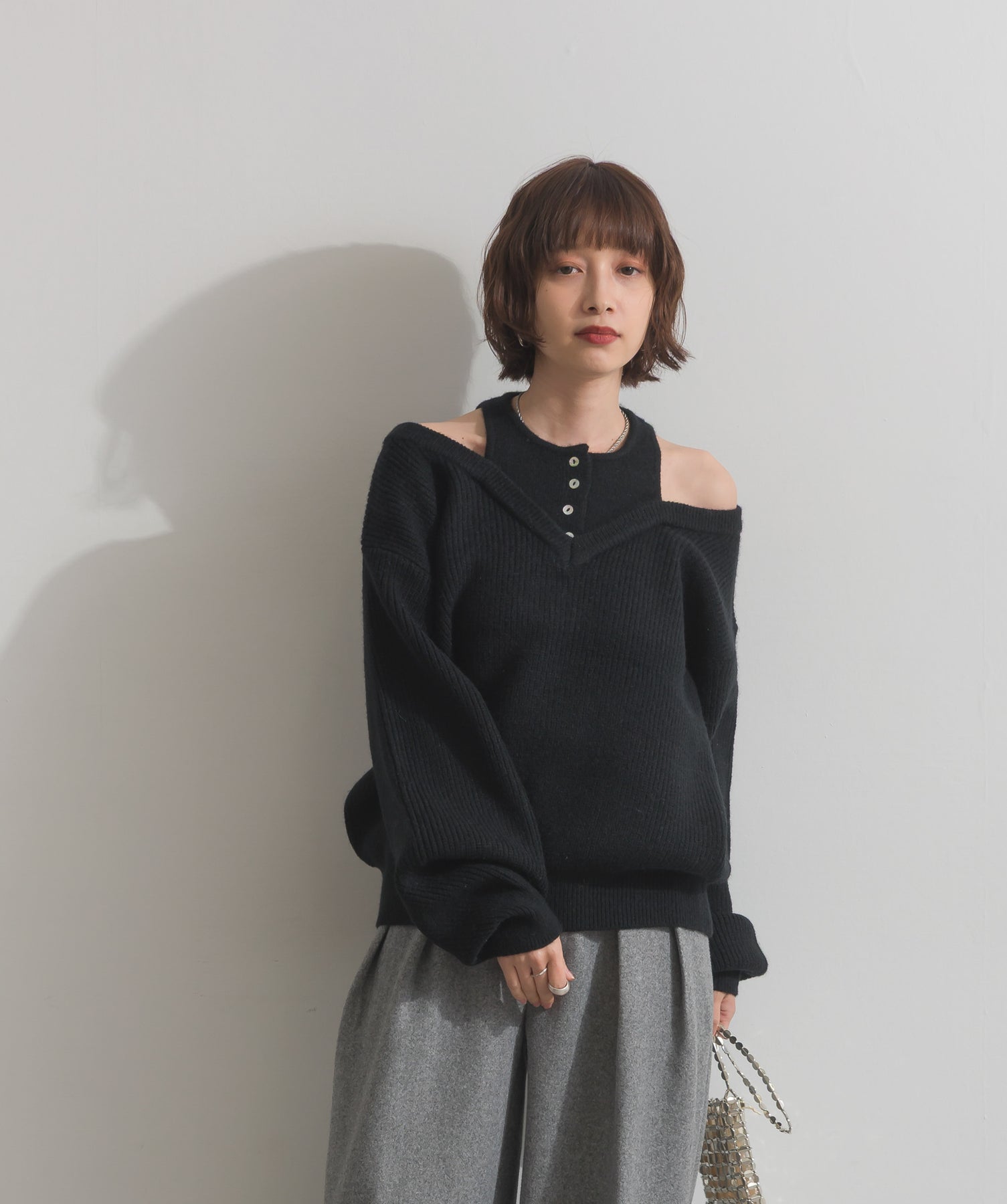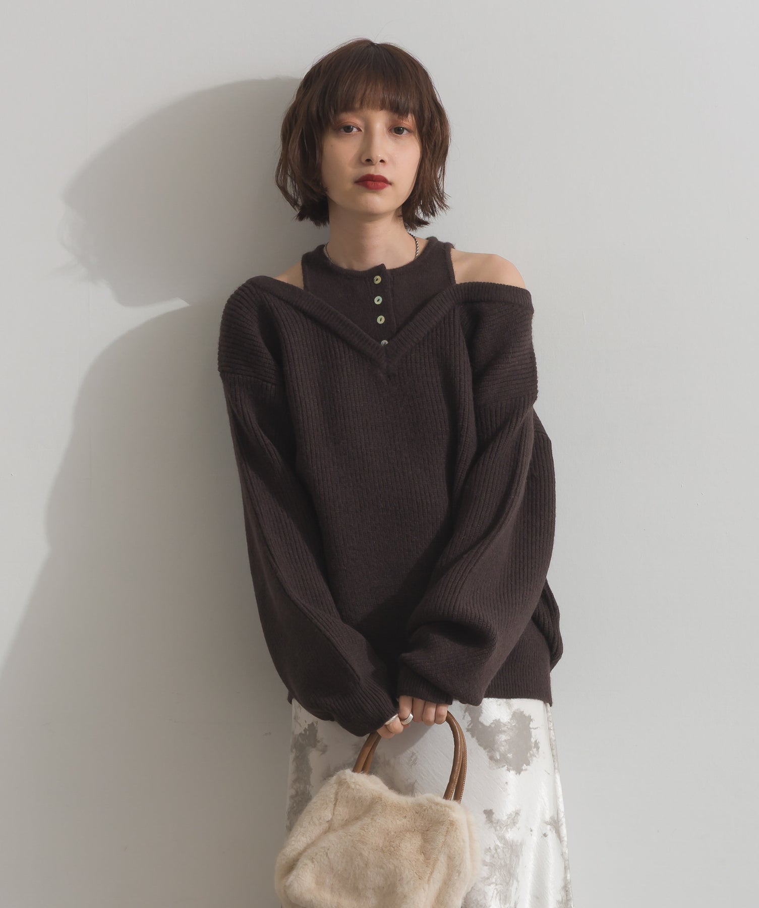 視線を惹きつける、ギャップを楽しむニットトップス。-material-柔らかく膨らみのあるアクリル混素材を使用。ニット特有のチクチク感を軽減し、デイリーにもストレスなく着用可能。ふんわりとした厚みがありながらも軽量で、秋冬にぴったりの温もりを感じられる質感です。-design-肩開き×レイヤード風ディテールが映える、大人の遊び心を取り入れたデザイン。インナーにタンクトップを重ねたようなユニークなディテールで、1枚でレイヤードスタイルが完成。デコルテラインはVネックで抜け感がありつつ、ヘルシーな肌見せを叶えます。オーバーサイズシルエットがこなれた雰囲気を演出し、パンツにもスカートにも相性抜群。トレンド感と着映え力を兼ね備えた、主役級の一着です。