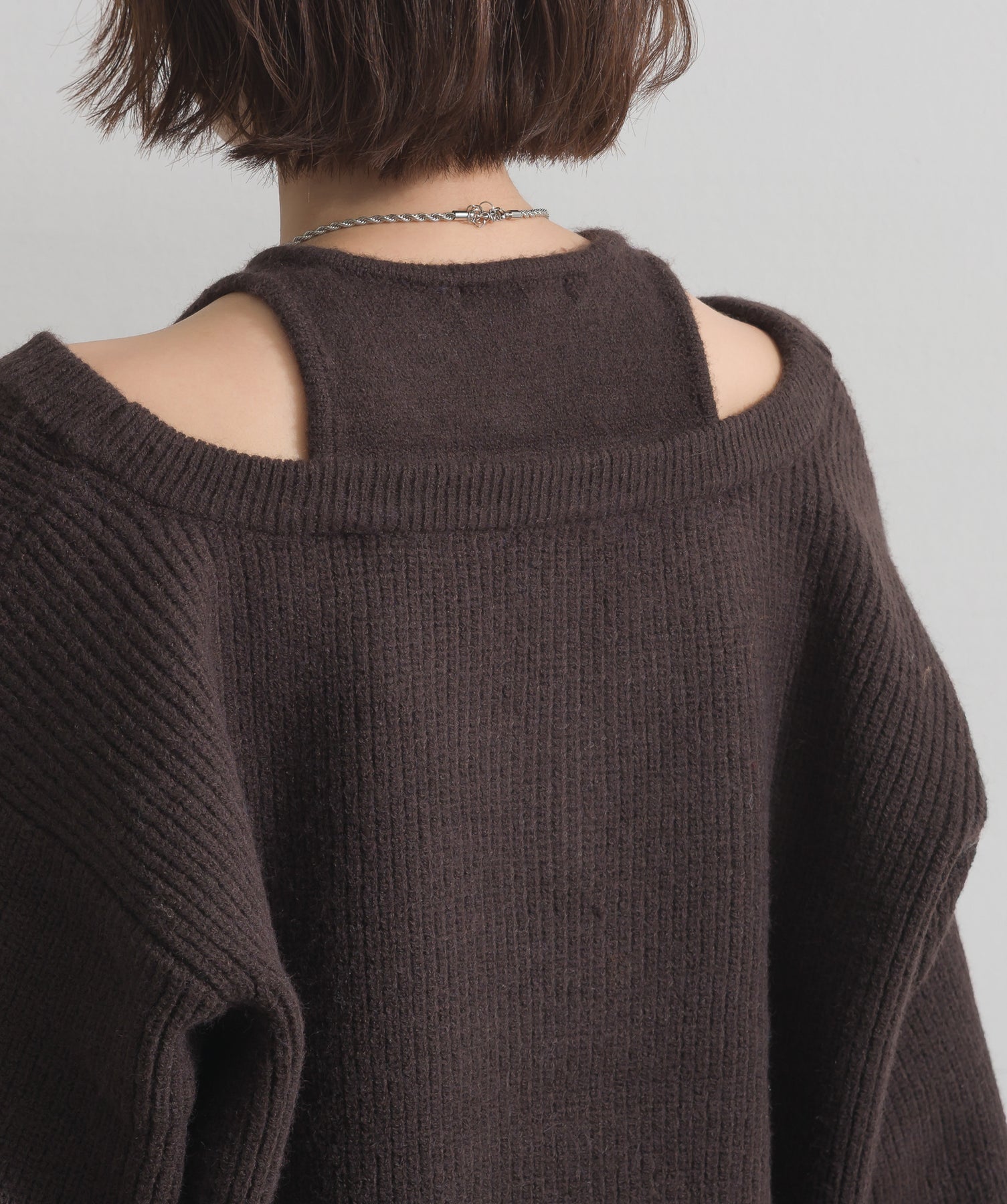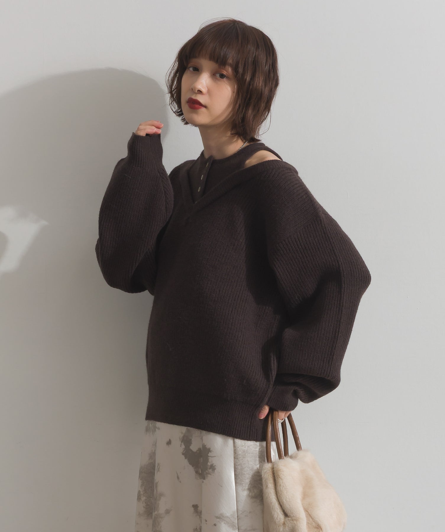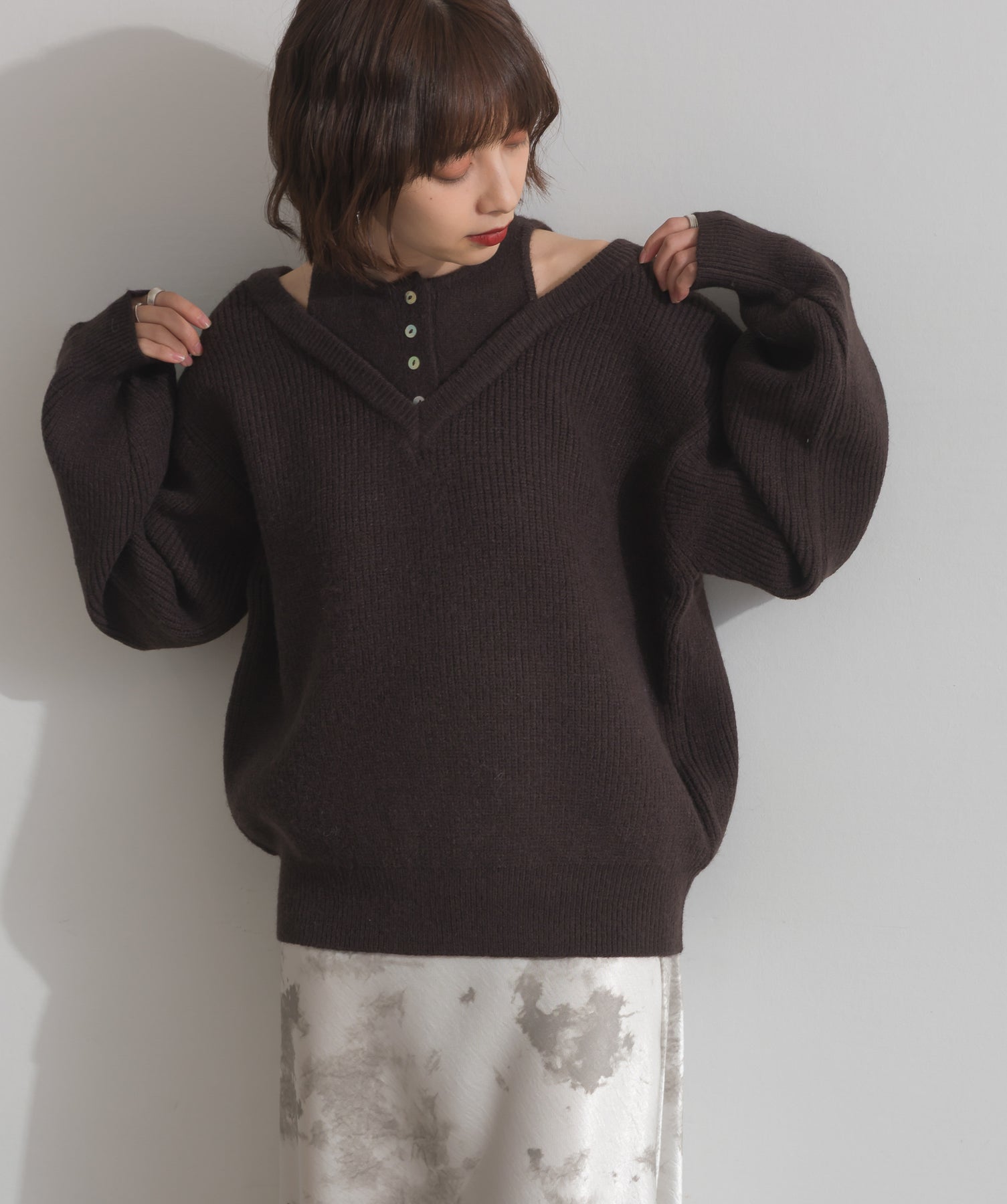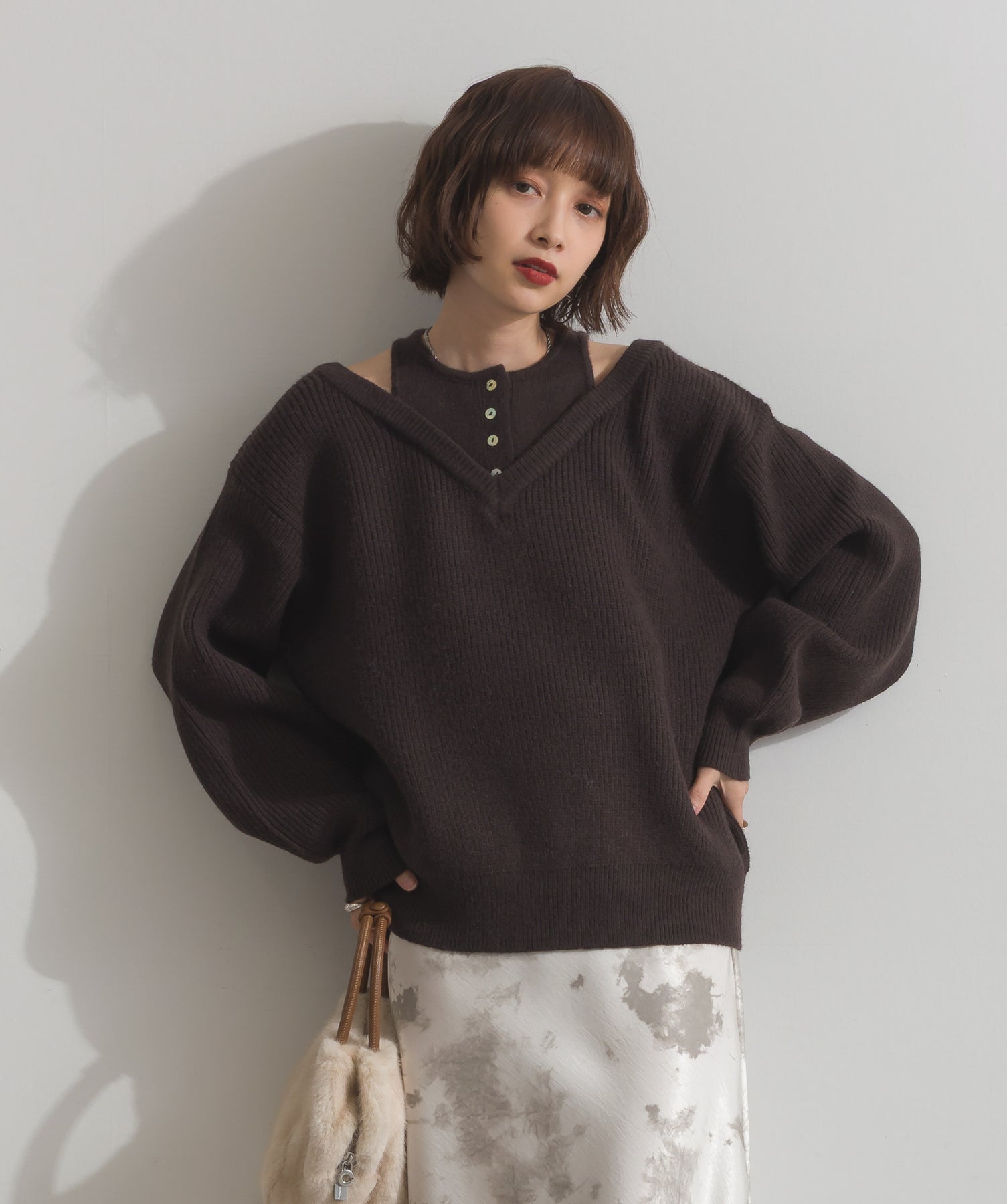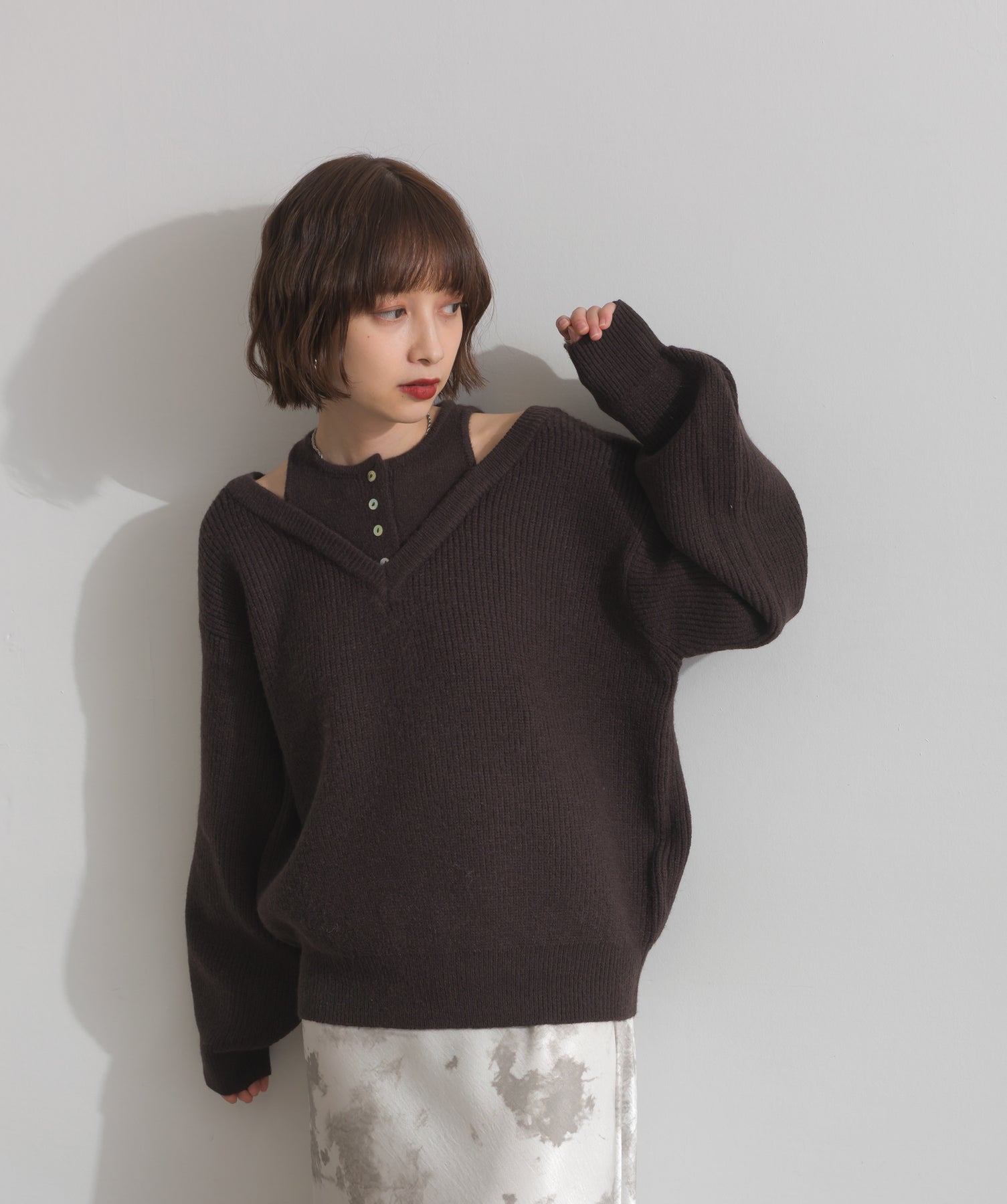 視線を惹きつける、ギャップを楽しむニットトップス。-material-柔らかく膨らみのあるアクリル混素材を使用。ニット特有のチクチク感を軽減し、デイリーにもストレスなく着用可能。ふんわりとした厚みがありながらも軽量で、秋冬にぴったりの温もりを感じられる質感です。-design-肩開き×レイヤード風ディテールが映える、大人の遊び心を取り入れたデザイン。インナーにタンクトップを重ねたようなユニークなディテールで、1枚でレイヤードスタイルが完成。デコルテラインはVネックで抜け感がありつつ、ヘルシーな肌見せを叶えます。オーバーサイズシルエットがこなれた雰囲気を演出し、パンツにもスカートにも相性抜群。トレンド感と着映え力を兼ね備えた、主役級の一着です。