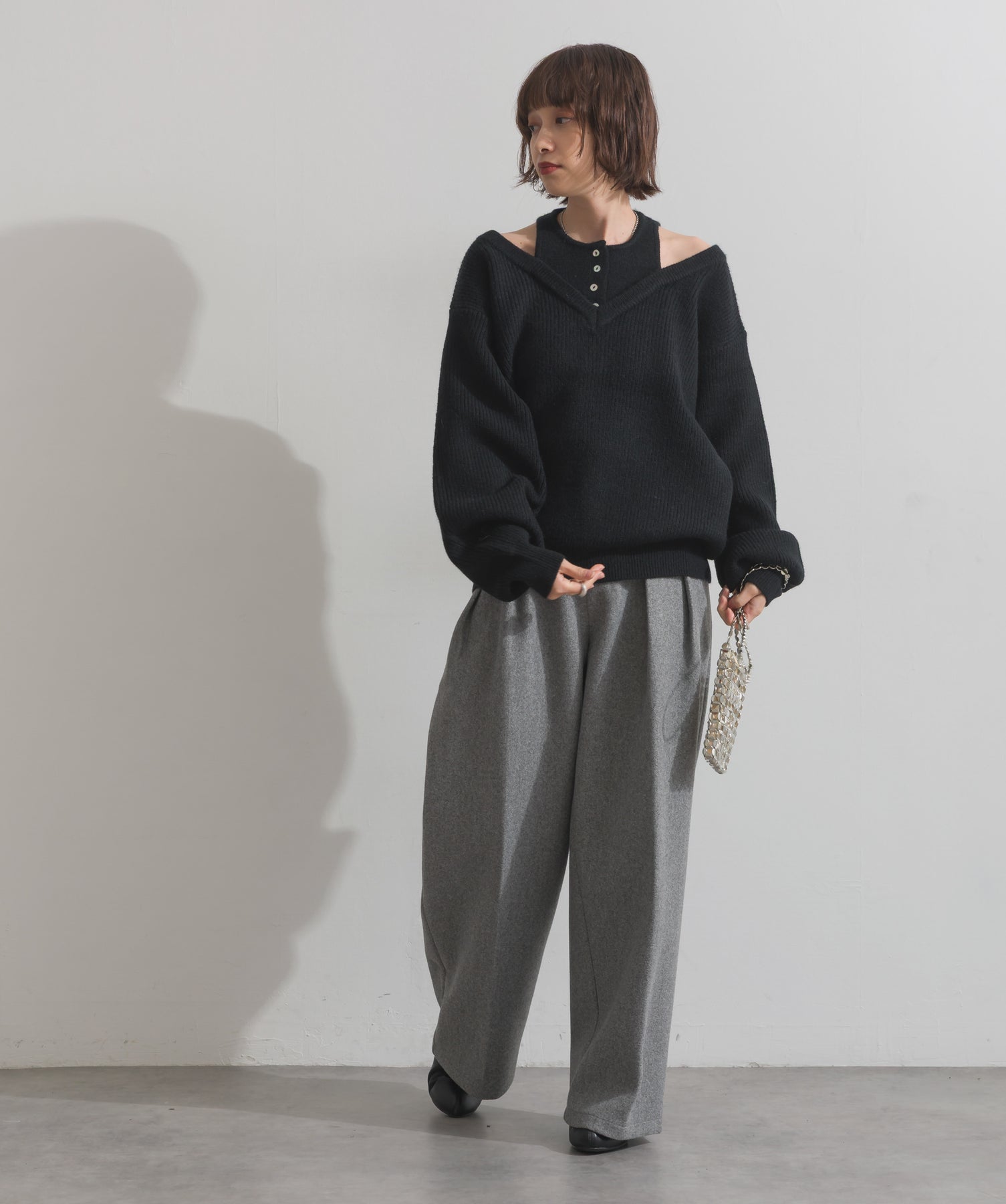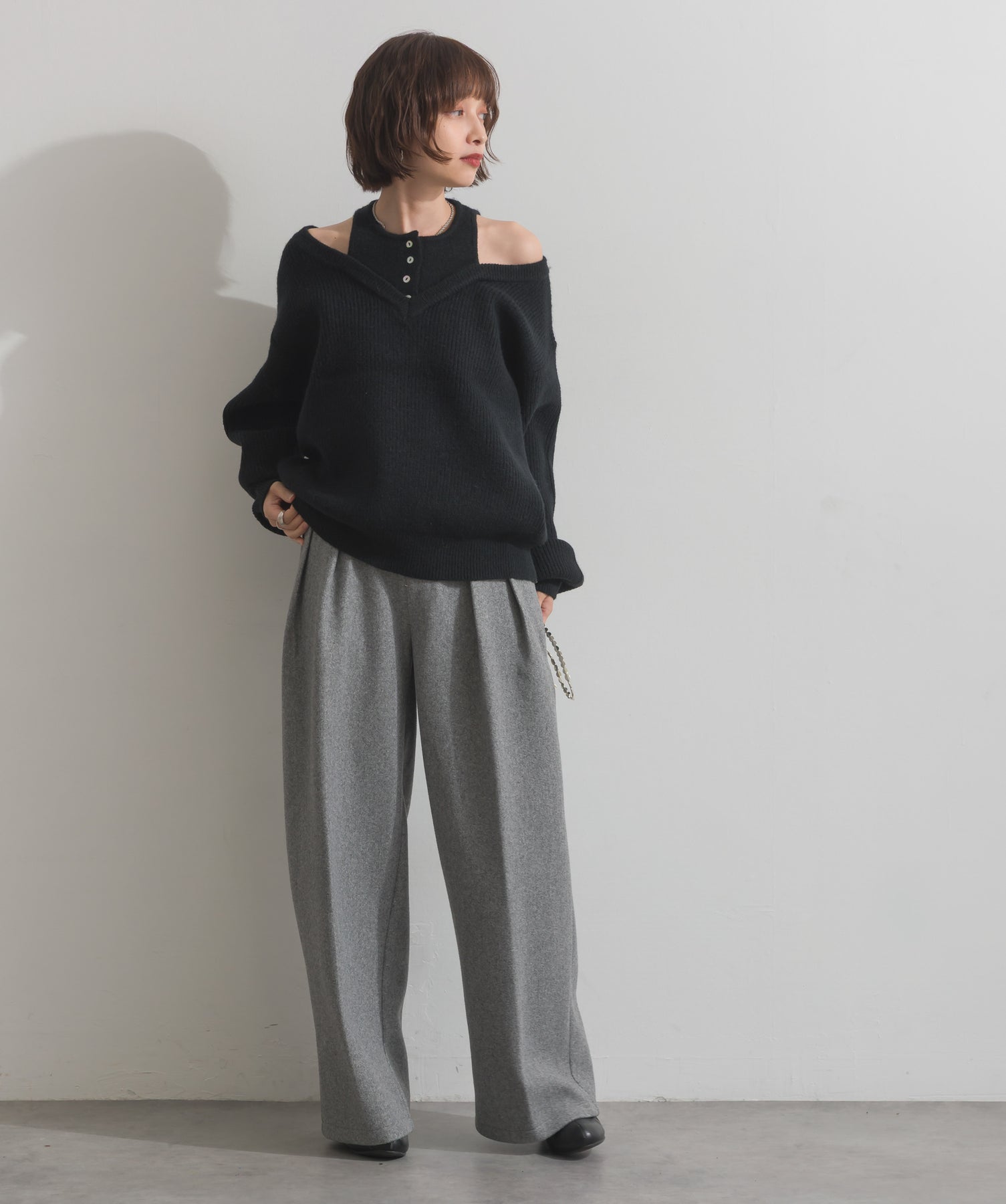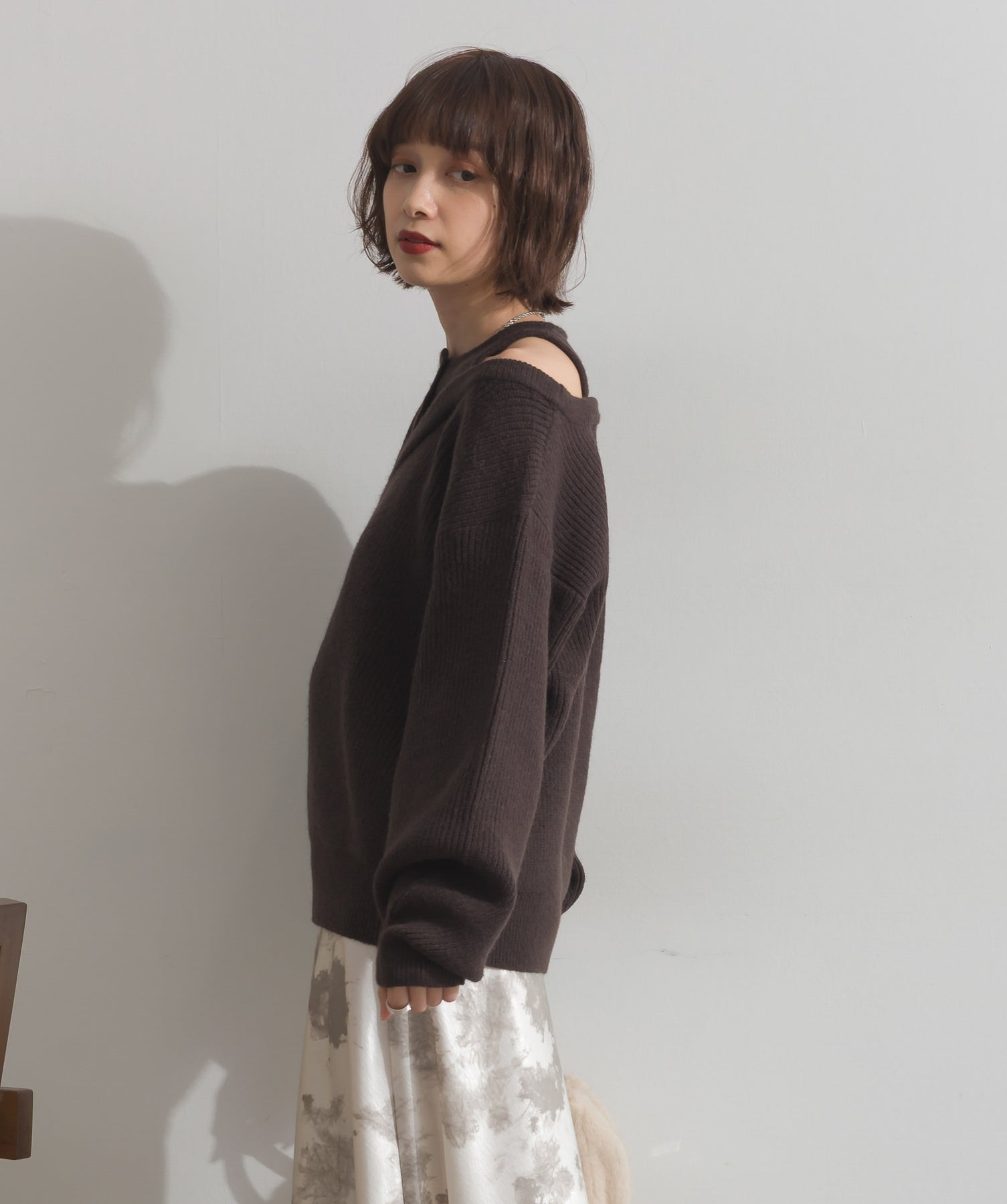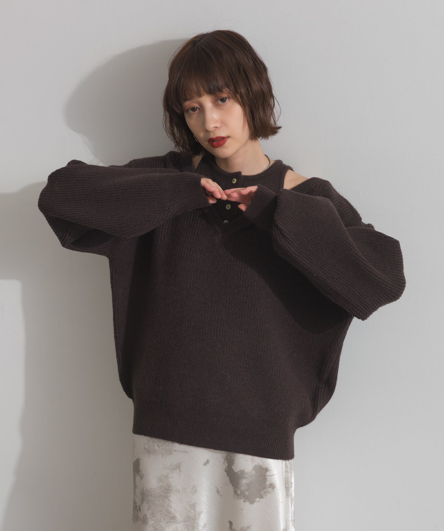 視線を惹きつける、ギャップを楽しむニットトップス。-material-柔らかく膨らみのあるアクリル混素材を使用。ニット特有のチクチク感を軽減し、デイリーにもストレスなく着用可能。ふんわりとした厚みがありながらも軽量で、秋冬にぴったりの温もりを感じられる質感です。-design-肩開き×レイヤード風ディテールが映える、大人の遊び心を取り入れたデザイン。インナーにタンクトップを重ねたようなユニークなディテールで、1枚でレイヤードスタイルが完成。デコルテラインはVネックで抜け感がありつつ、ヘルシーな肌見せを叶えます。オーバーサイズシルエットがこなれた雰囲気を演出し、パンツにもスカートにも相性抜群。トレンド感と着映え力を兼ね備えた、主役級の一着です。