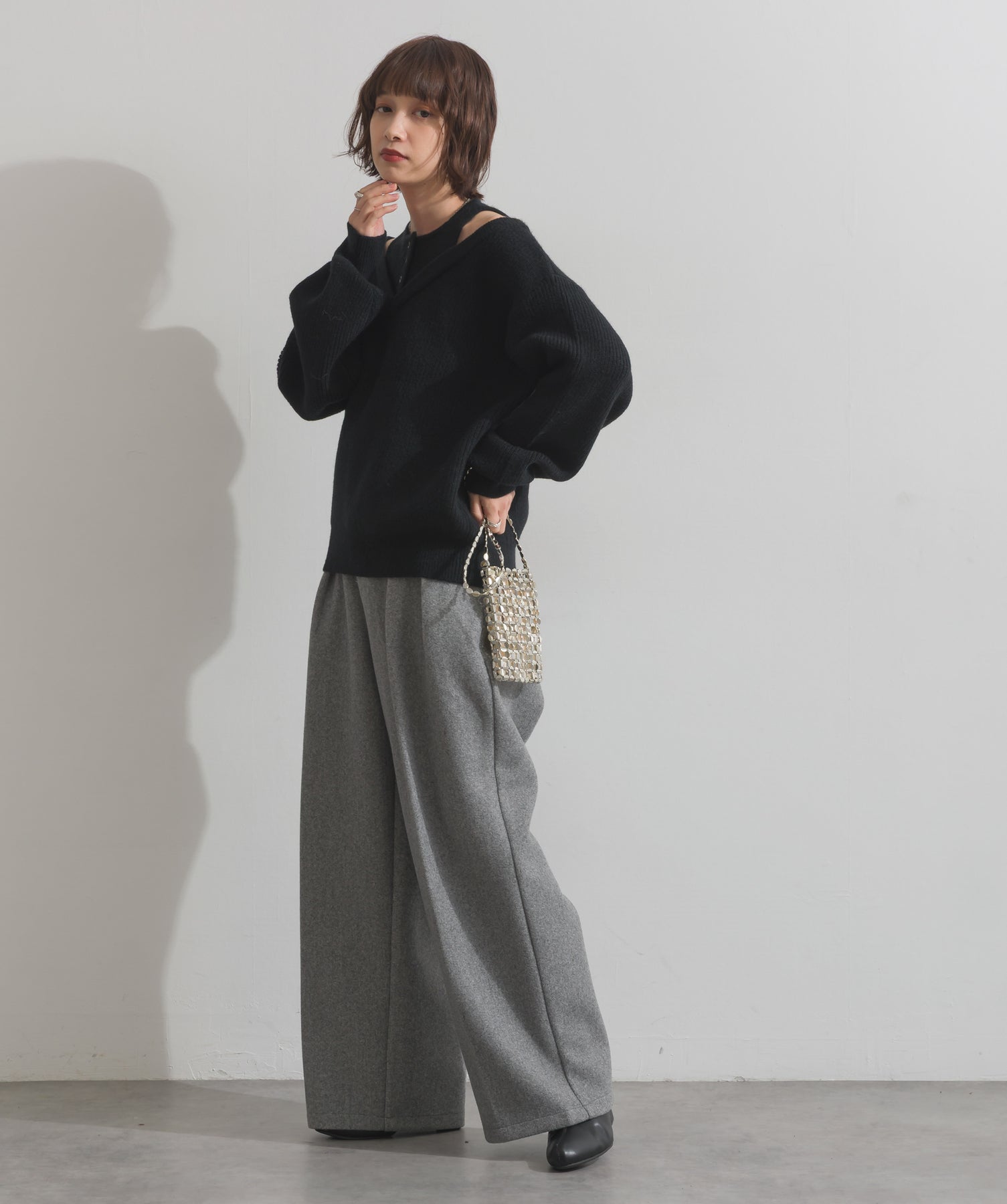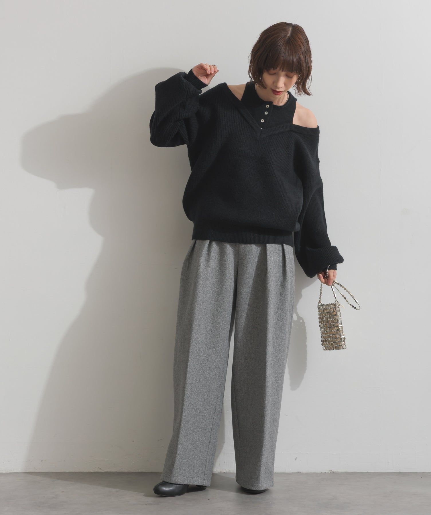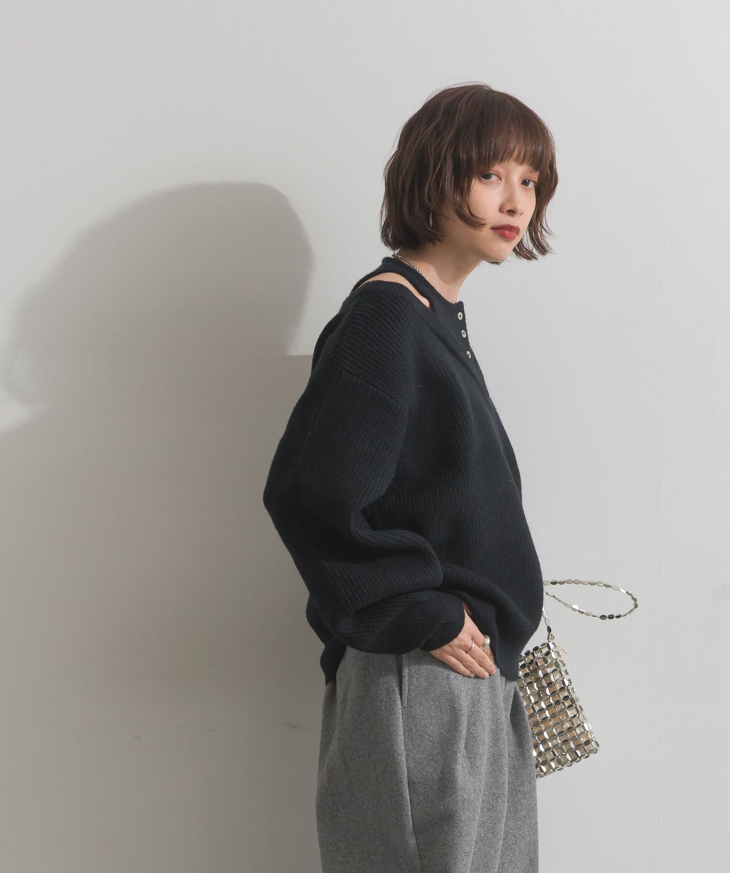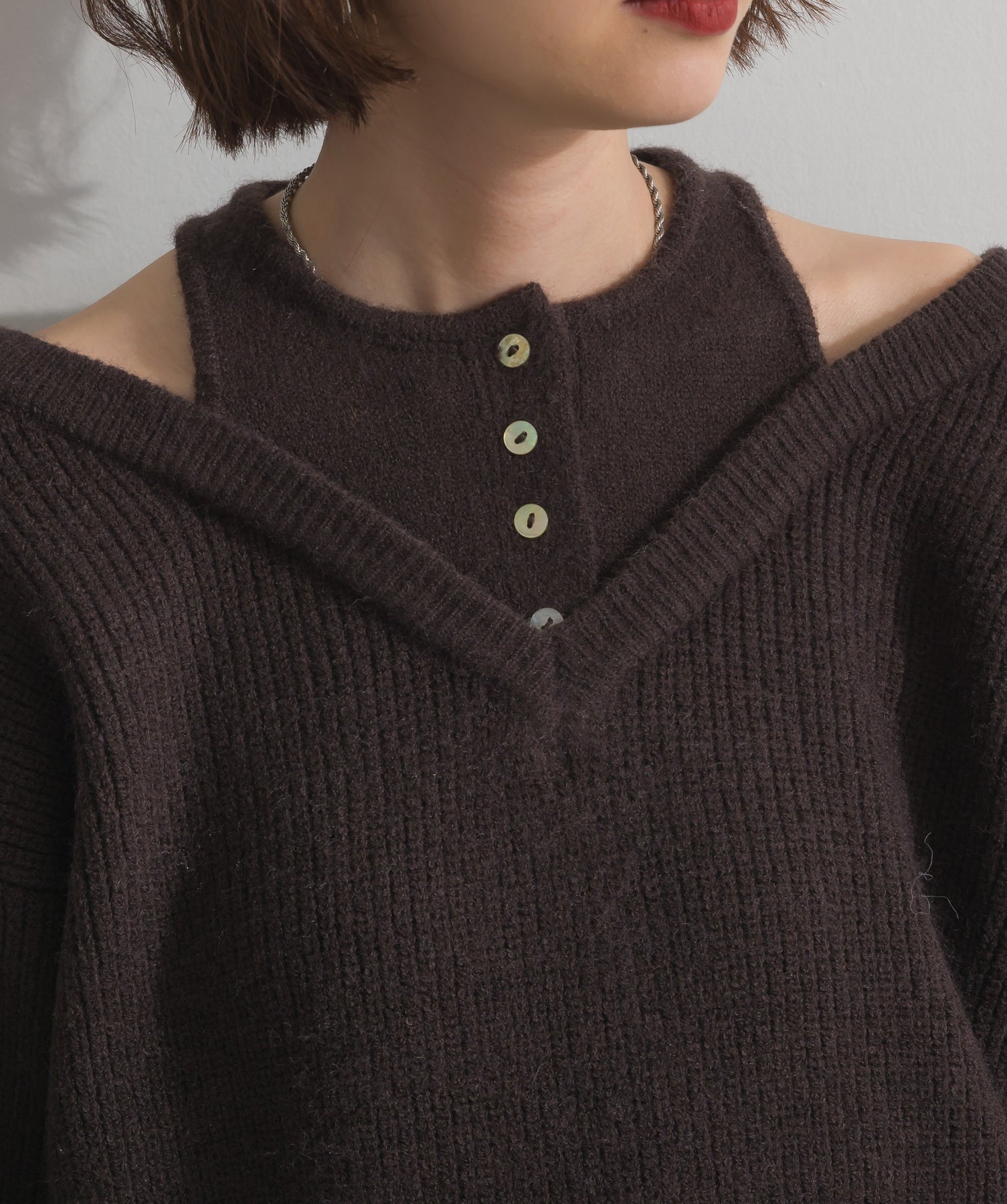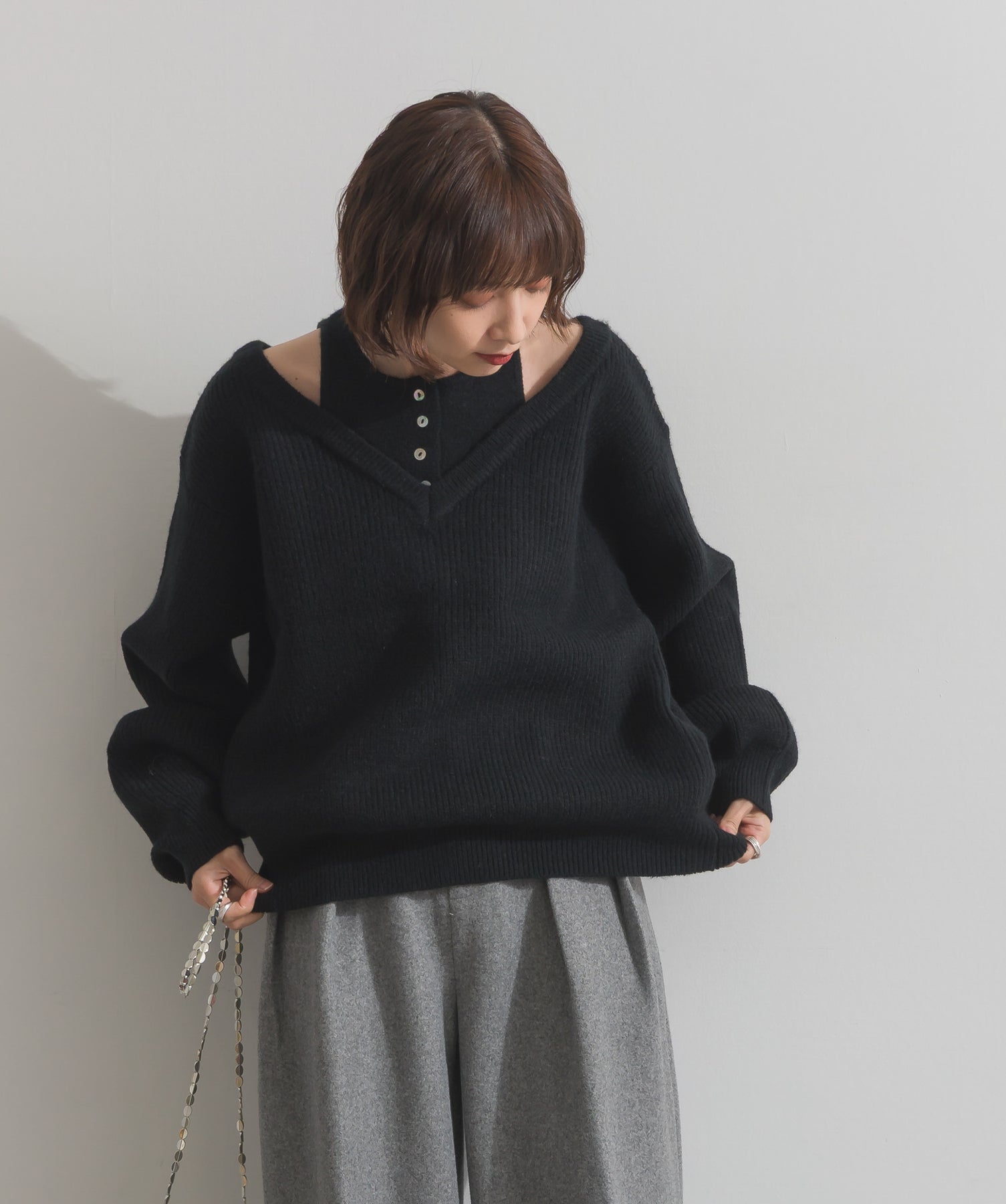 視線を惹きつける、ギャップを楽しむニットトップス。-material-柔らかく膨らみのあるアクリル混素材を使用。ニット特有のチクチク感を軽減し、デイリーにもストレスなく着用可能。ふんわりとした厚みがありながらも軽量で、秋冬にぴったりの温もりを感じられる質感です。-design-肩開き×レイヤード風ディテールが映える、大人の遊び心を取り入れたデザイン。インナーにタンクトップを重ねたようなユニークなディテールで、1枚でレイヤードスタイルが完成。デコルテラインはVネックで抜け感がありつつ、ヘルシーな肌見せを叶えます。オーバーサイズシルエットがこなれた雰囲気を演出し、パンツにもスカートにも相性抜群。トレンド感と着映え力を兼ね備えた、主役級の一着です。