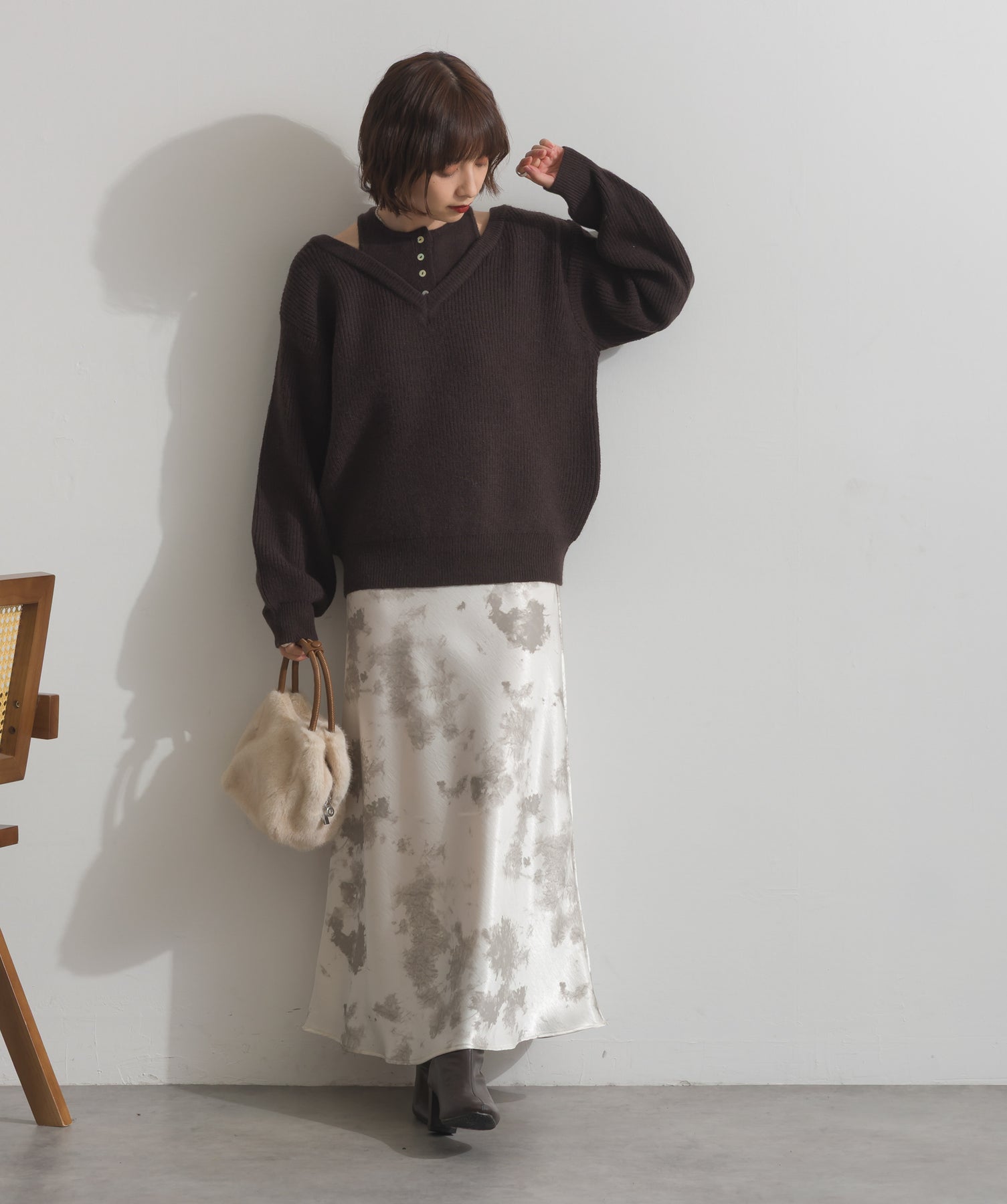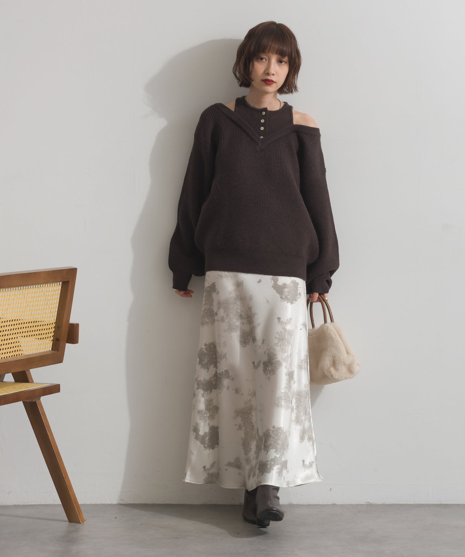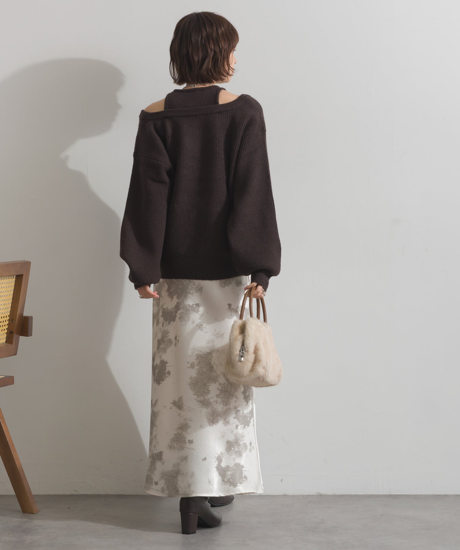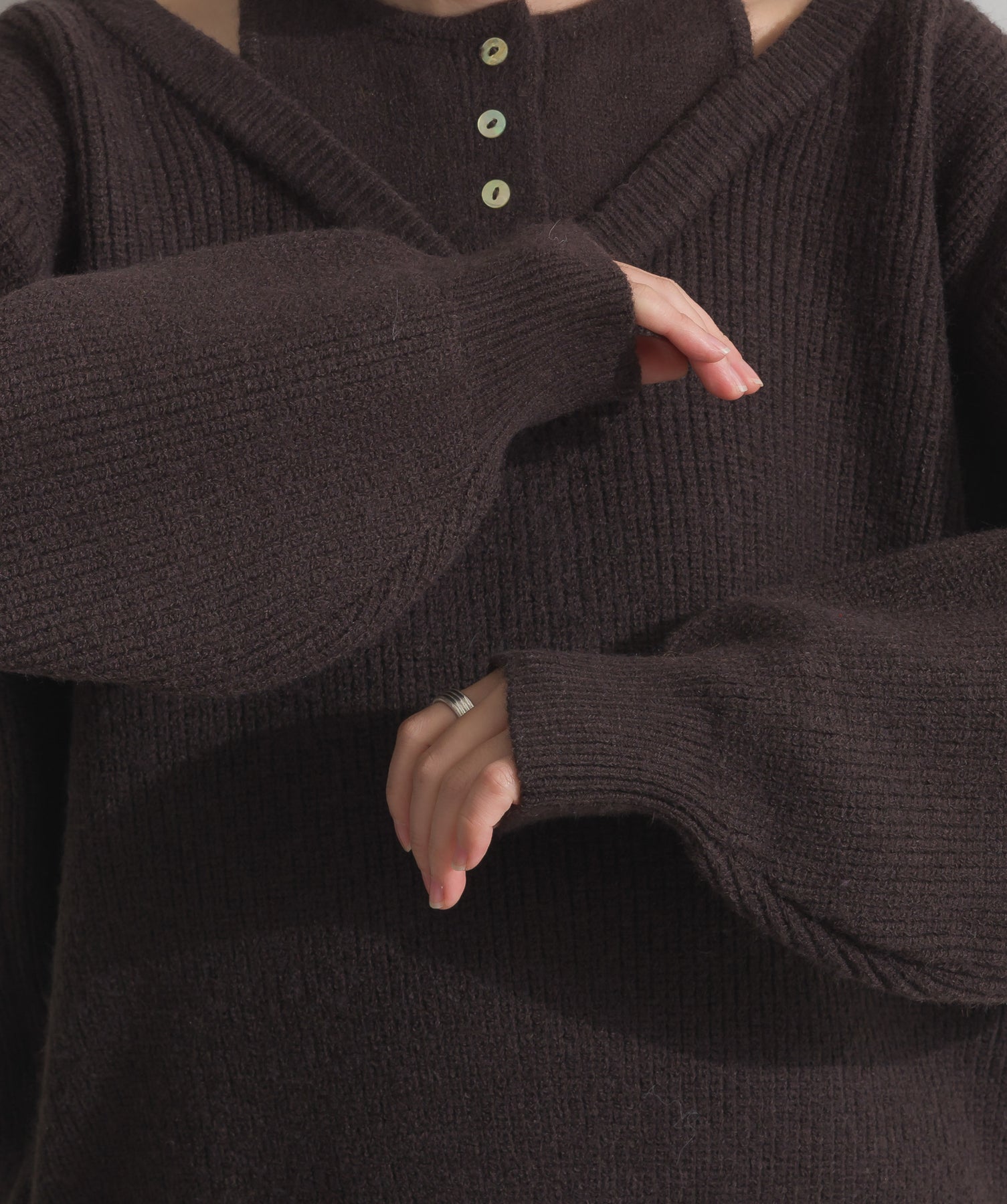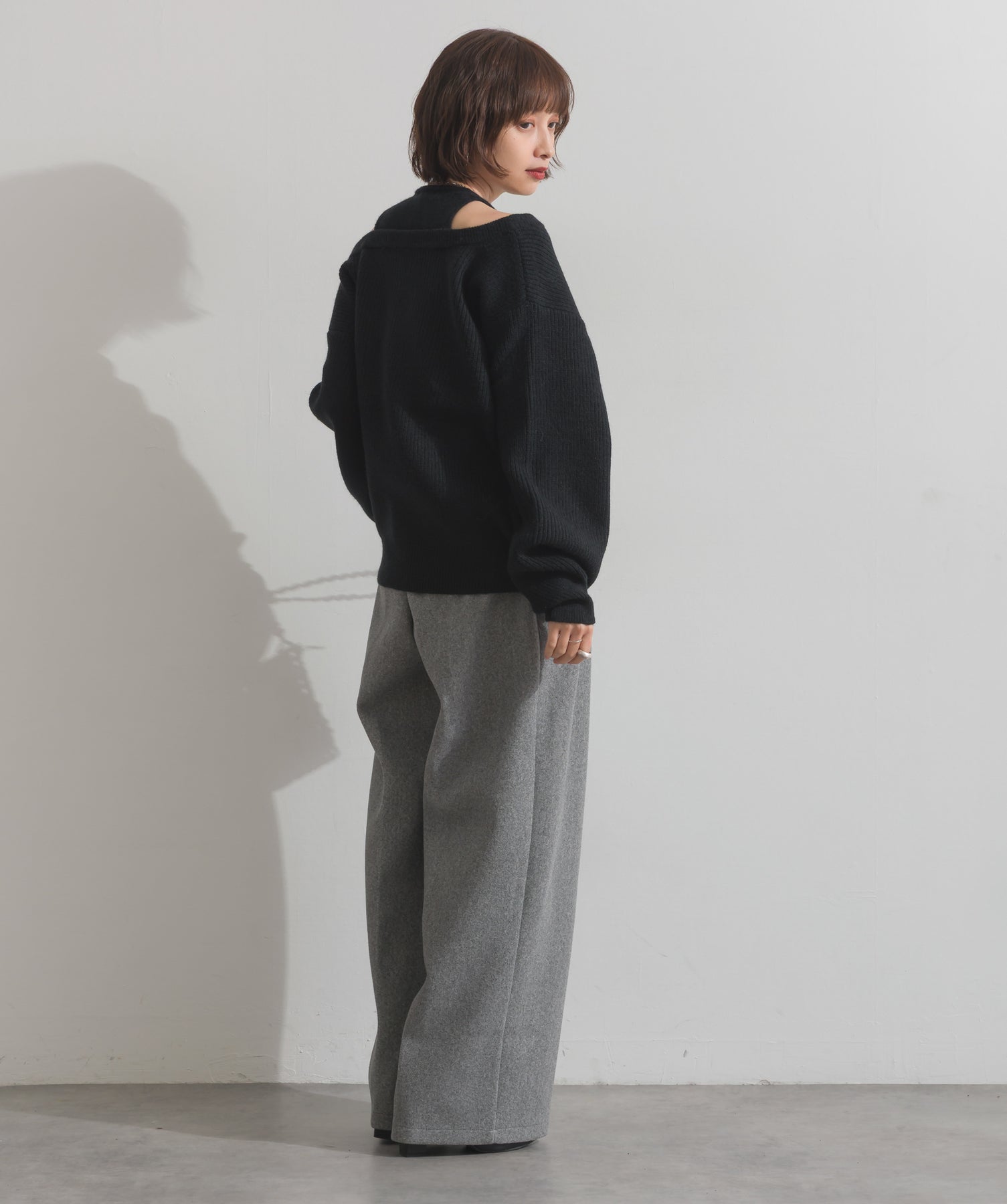 視線を惹きつける、ギャップを楽しむニットトップス。-material-柔らかく膨らみのあるアクリル混素材を使用。ニット特有のチクチク感を軽減し、デイリーにもストレスなく着用可能。ふんわりとした厚みがありながらも軽量で、秋冬にぴったりの温もりを感じられる質感です。-design-肩開き×レイヤード風ディテールが映える、大人の遊び心を取り入れたデザイン。インナーにタンクトップを重ねたようなユニークなディテールで、1枚でレイヤードスタイルが完成。デコルテラインはVネックで抜け感がありつつ、ヘルシーな肌見せを叶えます。オーバーサイズシルエットがこなれた雰囲気を演出し、パンツにもスカートにも相性抜群。トレンド感と着映え力を兼ね備えた、主役級の一着です。
