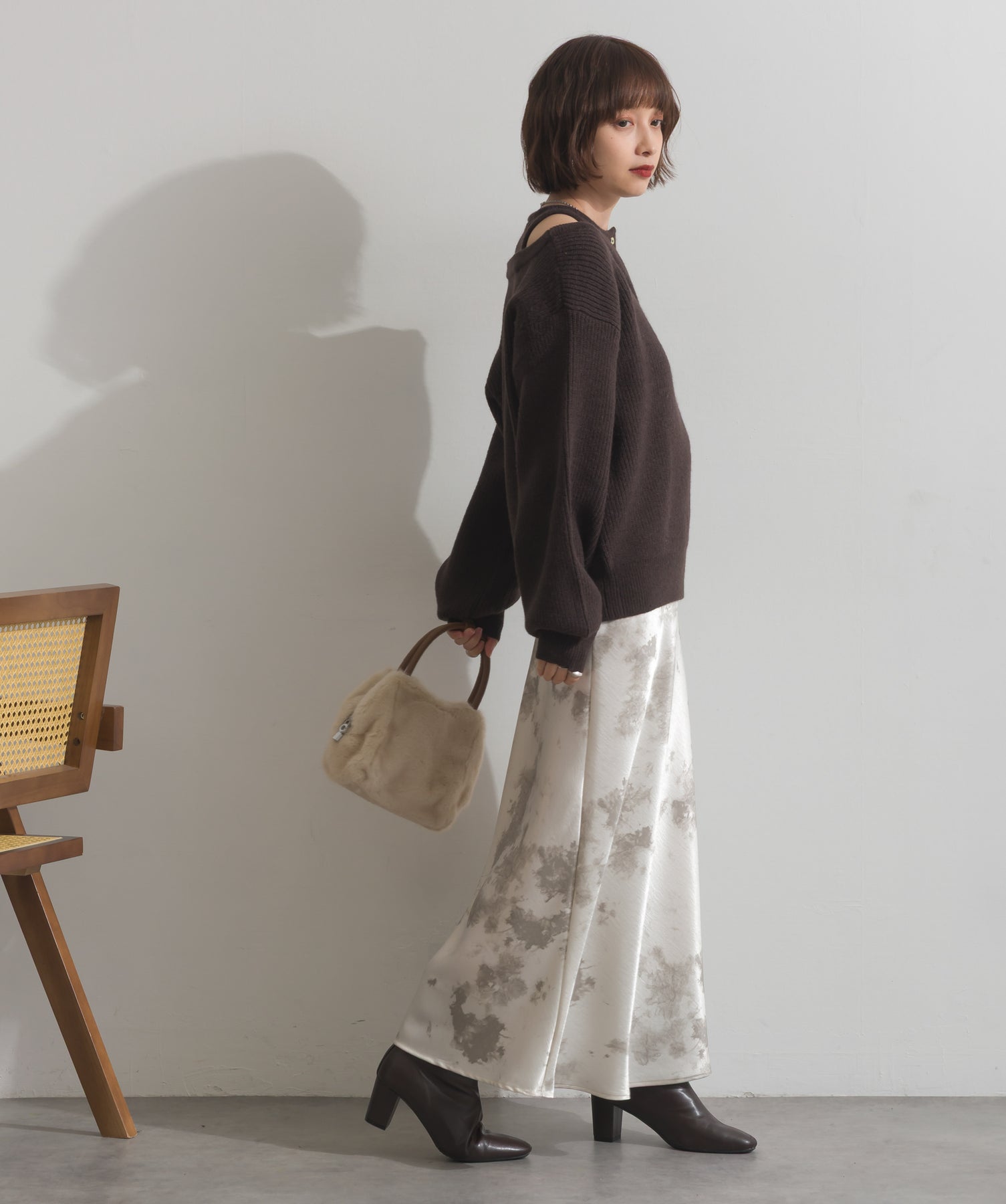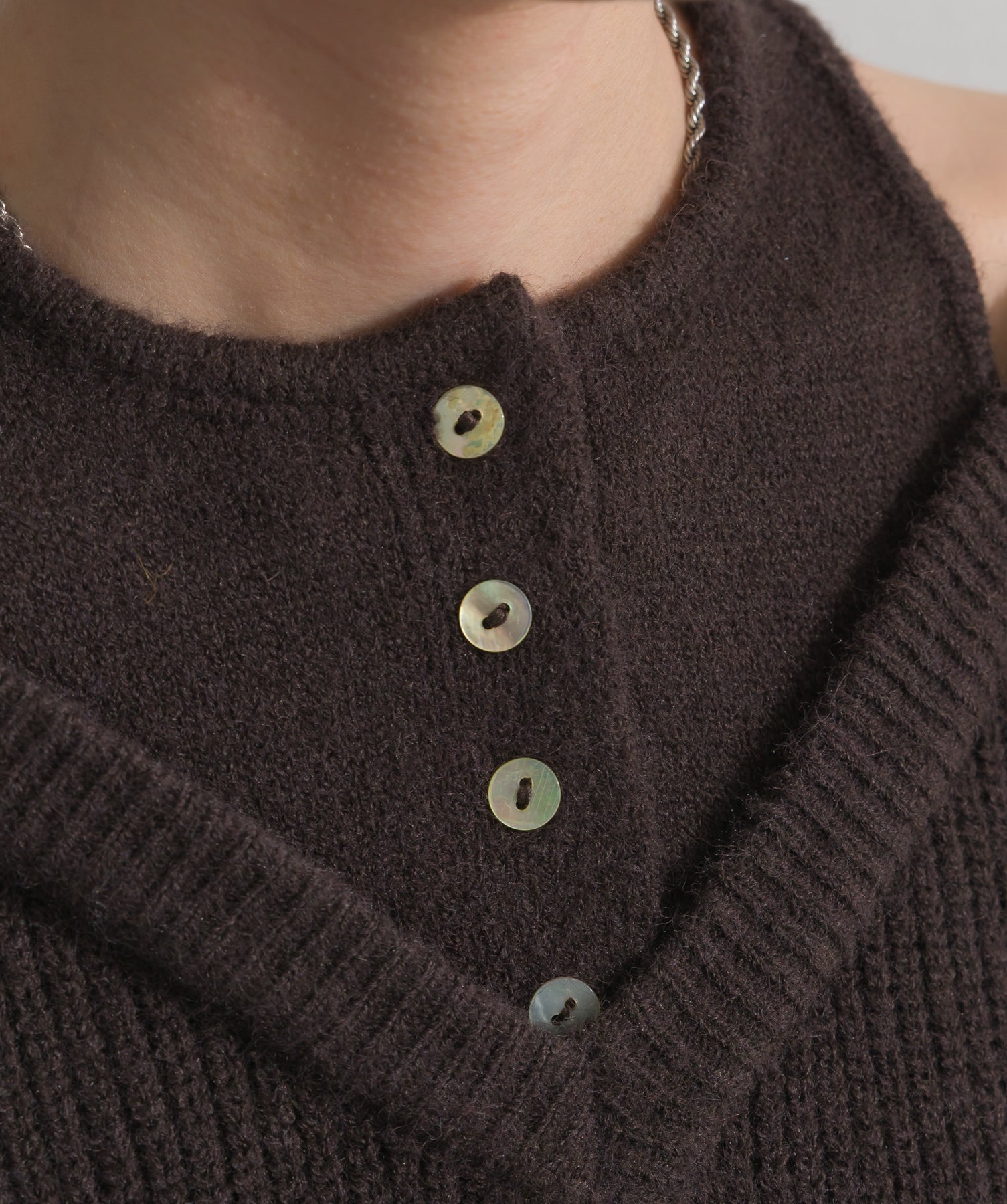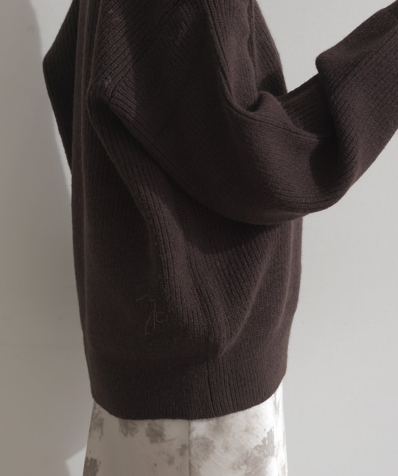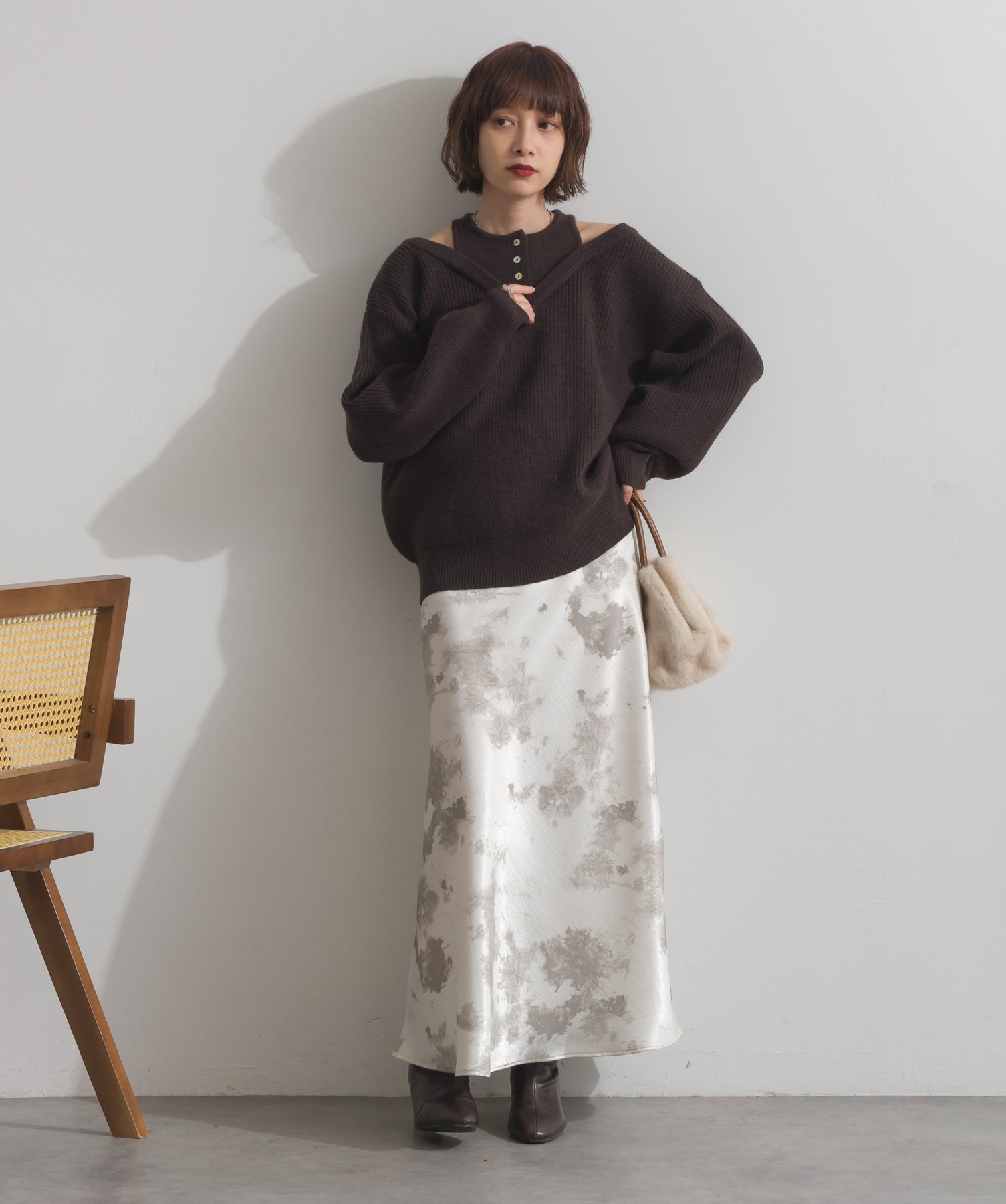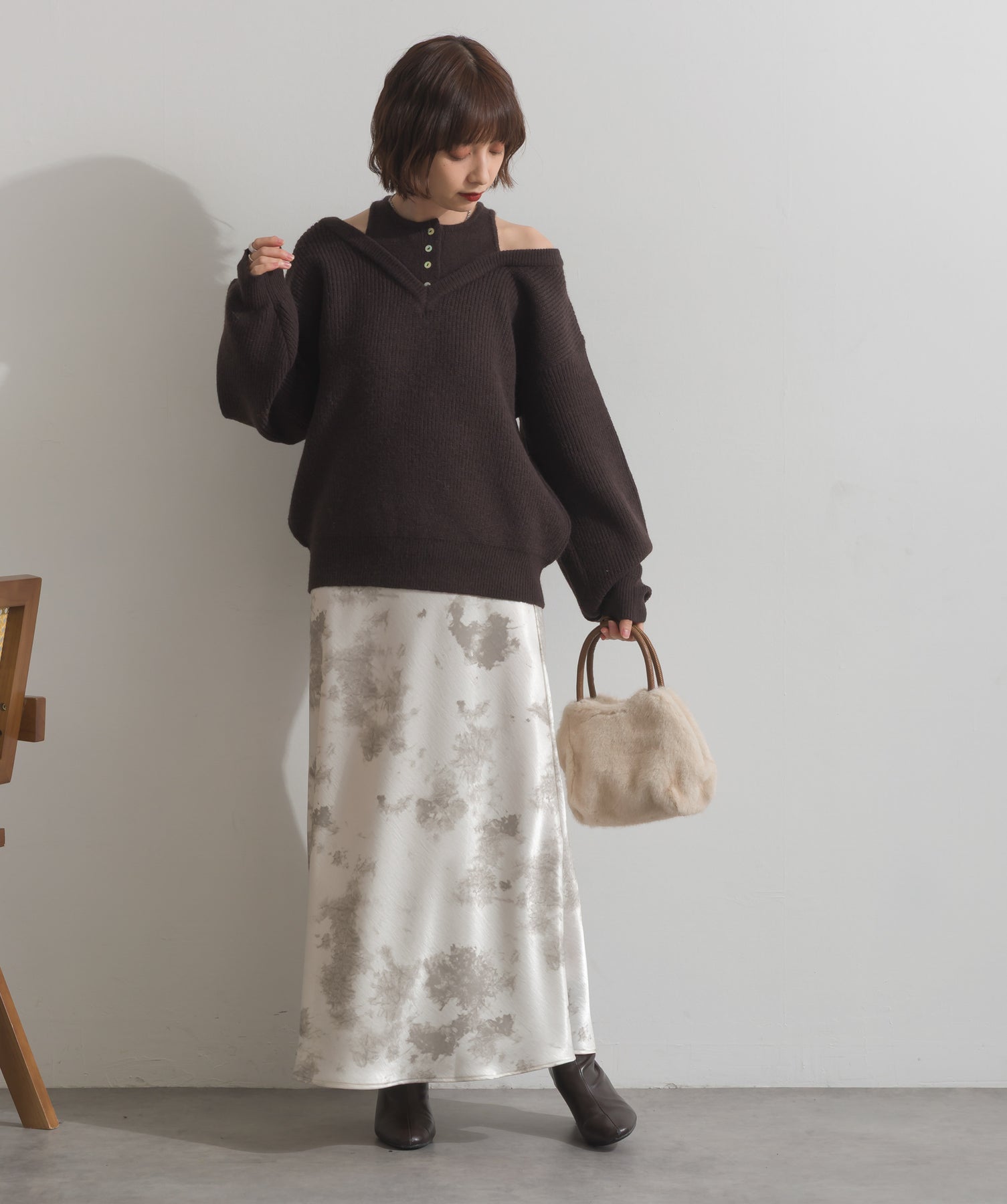 視線を惹きつける、ギャップを楽しむニットトップス。-material-柔らかく膨らみのあるアクリル混素材を使用。ニット特有のチクチク感を軽減し、デイリーにもストレスなく着用可能。ふんわりとした厚みがありながらも軽量で、秋冬にぴったりの温もりを感じられる質感です。-design-肩開き×レイヤード風ディテールが映える、大人の遊び心を取り入れたデザイン。インナーにタンクトップを重ねたようなユニークなディテールで、1枚でレイヤードスタイルが完成。デコルテラインはVネックで抜け感がありつつ、ヘルシーな肌見せを叶えます。オーバーサイズシルエットがこなれた雰囲気を演出し、パンツにもスカートにも相性抜群。トレンド感と着映え力を兼ね備えた、主役級の一着です。