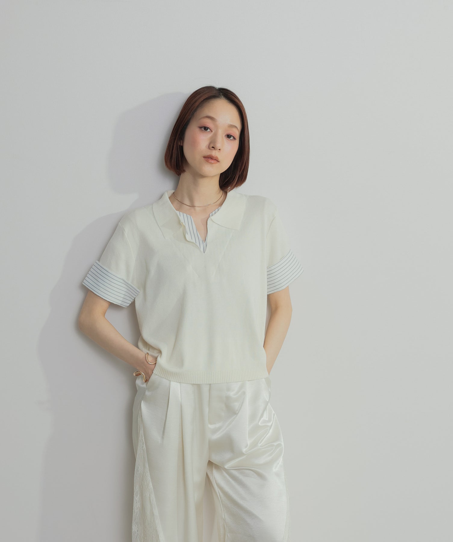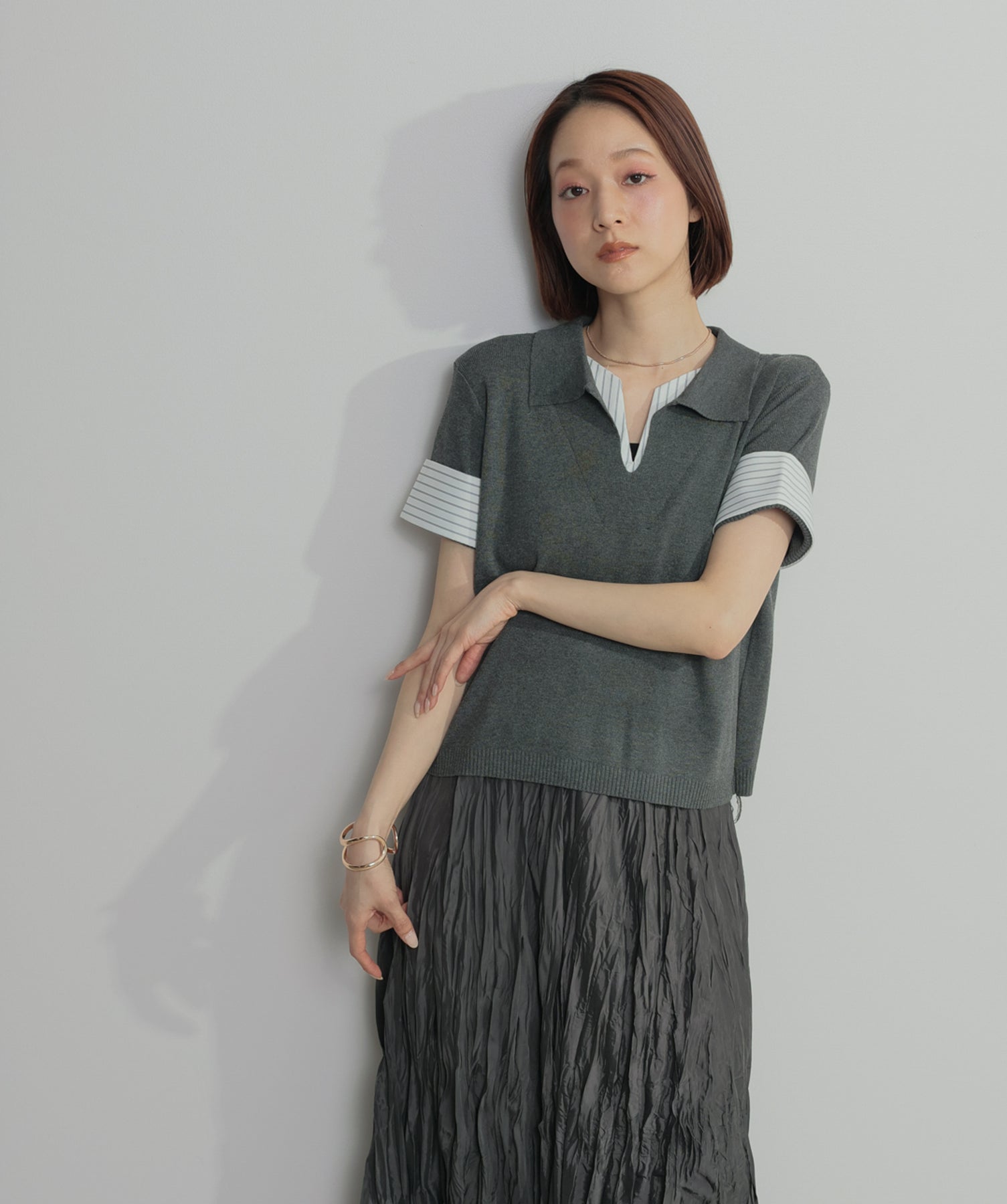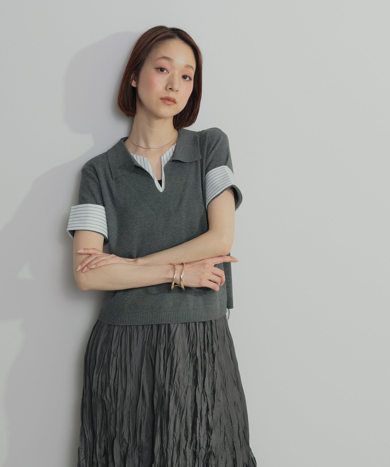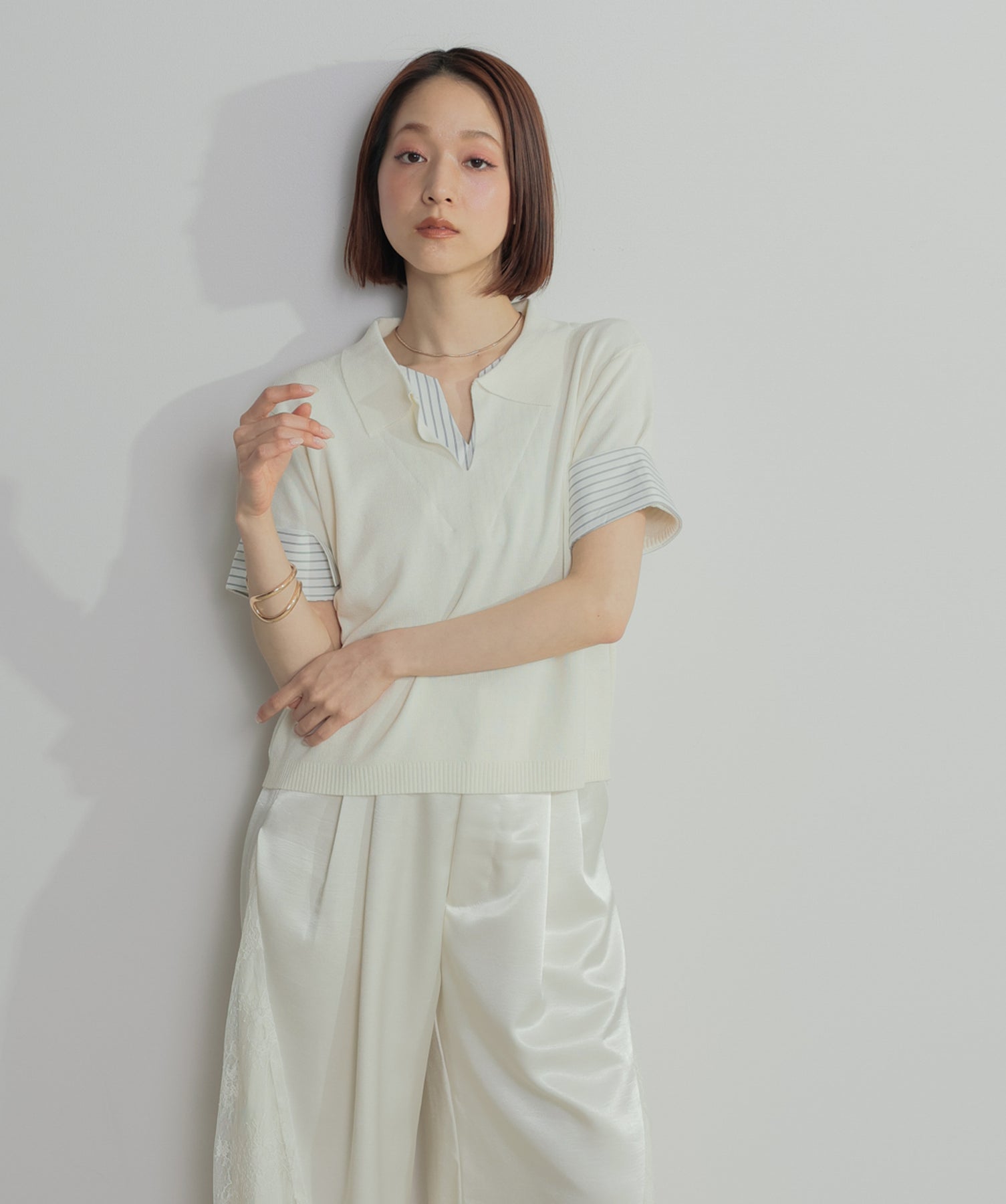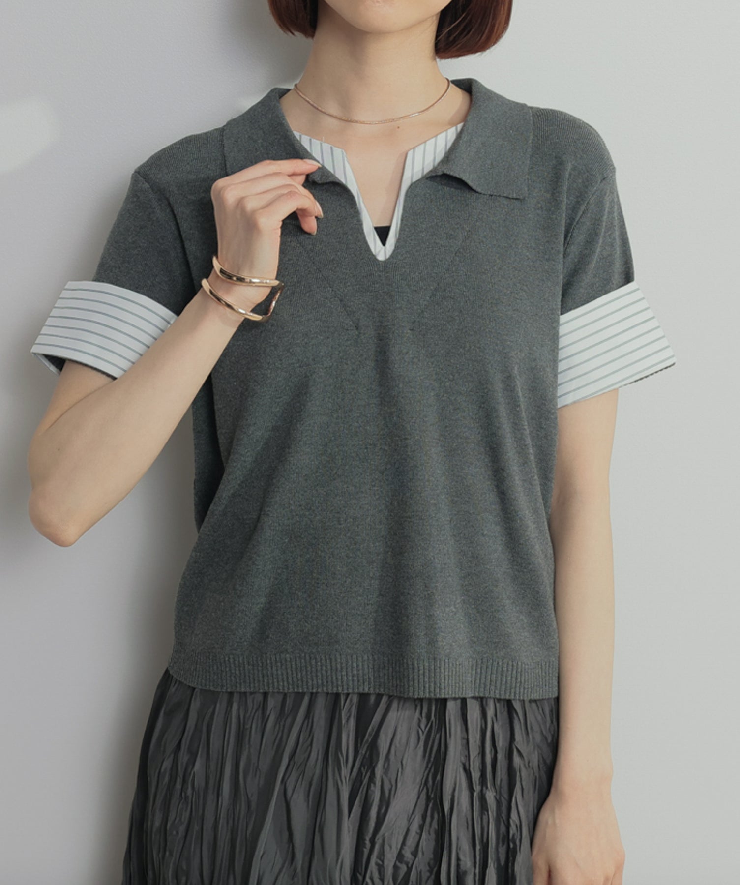 抜け感とレイヤードで魅せる、洗練ポロニットトップス。-material-柔らかく肌馴染みの良いニット素材をベースに、シャツ素材をドッキングした異素材デザイン。軽やかな着心地と程よい伸縮性で、ストレスフリーに着用可能。シンプルながらも素材のコントラストがスタイリングに奥行きをプラスします。-design-ポロニットにシャツディテールを重ねたようなレイヤード風デザインが特徴。襟元や袖口の切り替えがアクセントになり、1枚でこなれた印象に仕上がる一着。コンパクトな丈感でボトムとのバランスが取りやすく、ワイドパンツやスカートとも好相性。カジュアルさとモード感を兼ね備えた、着回し力の高いトップスです。