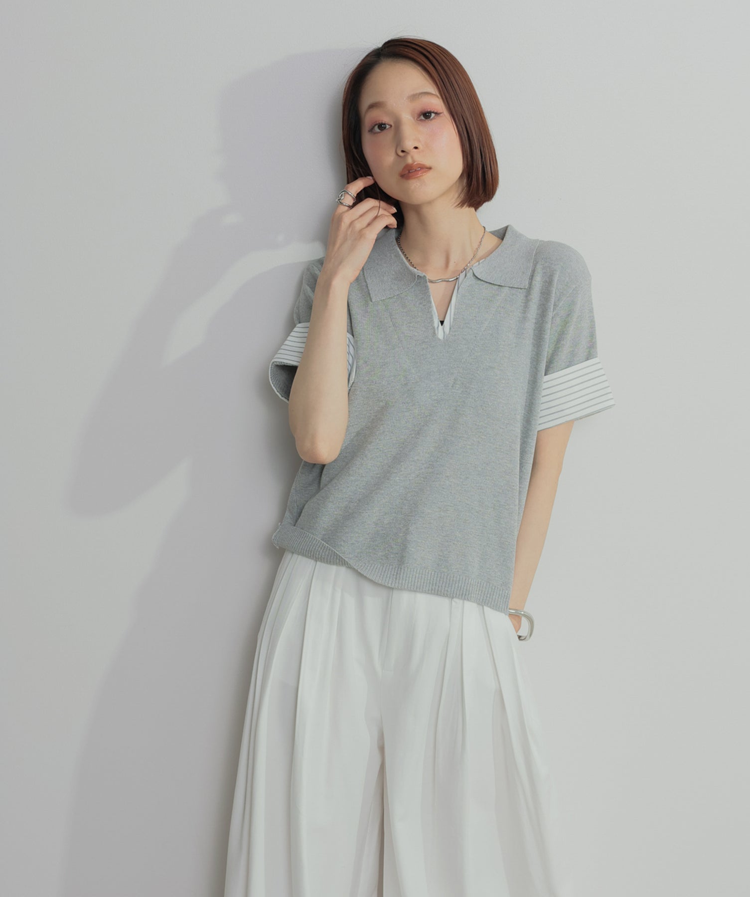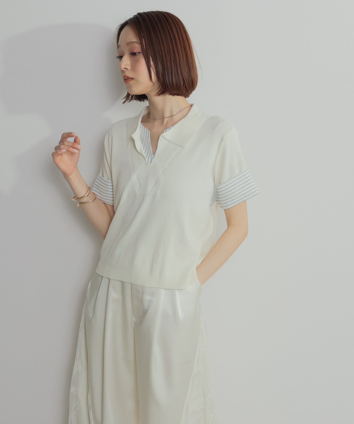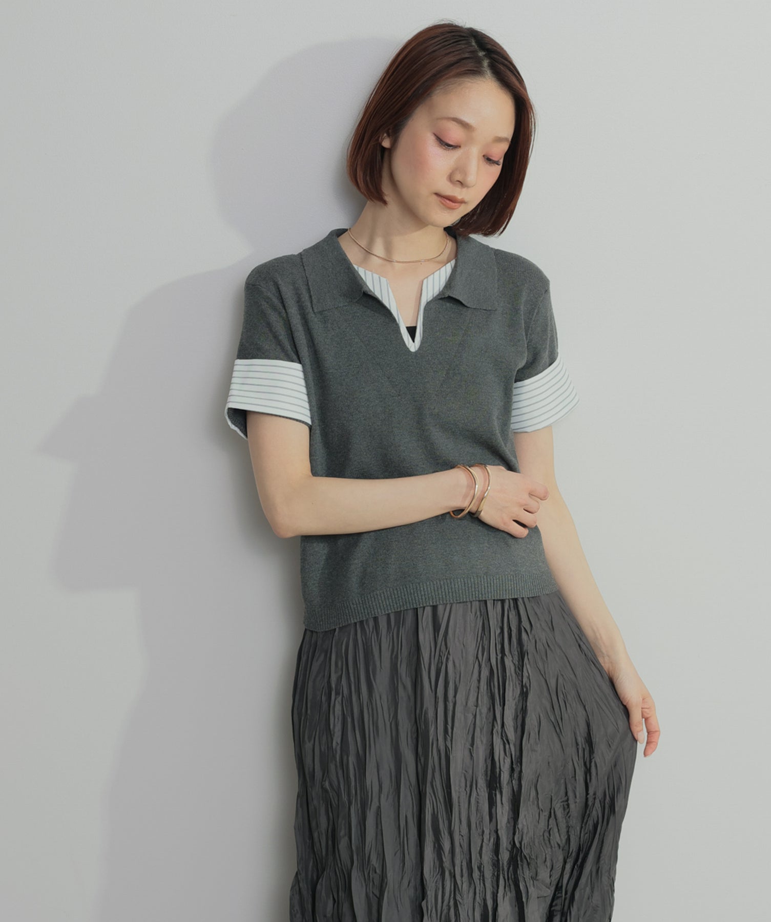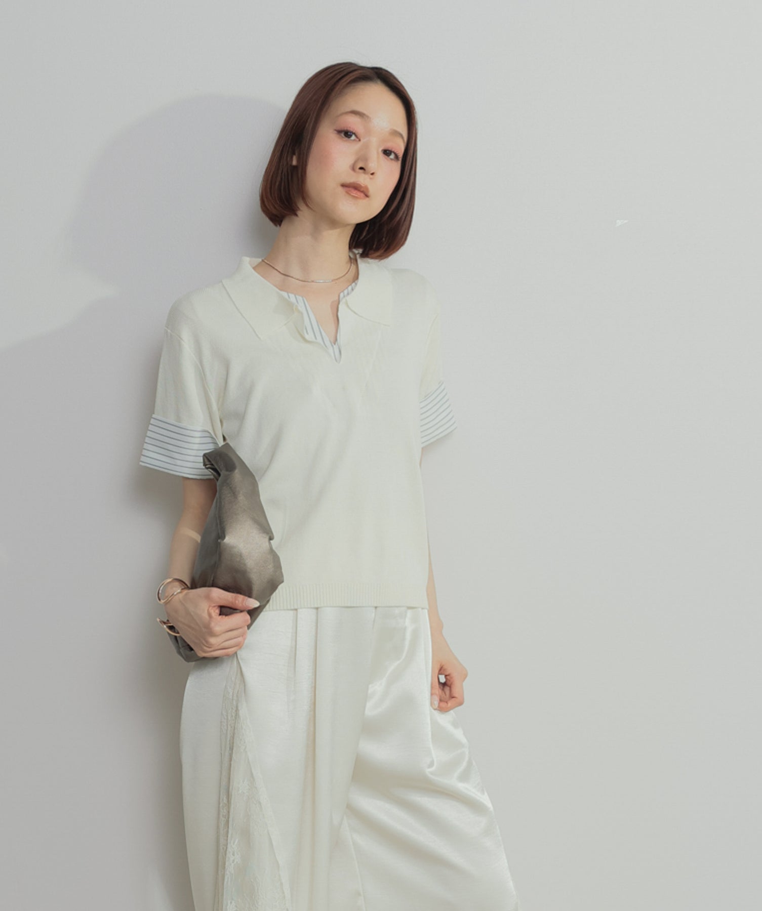 抜け感とレイヤードで魅せる、洗練ポロニットトップス。-material-柔らかく肌馴染みの良いニット素材をベースに、シャツ素材をドッキングした異素材デザイン。軽やかな着心地と程よい伸縮性で、ストレスフリーに着用可能。シンプルながらも素材のコントラストがスタイリングに奥行きをプラスします。-design-ポロニットにシャツディテールを重ねたようなレイヤード風デザインが特徴。襟元や袖口の切り替えがアクセントになり、1枚でこなれた印象に仕上がる一着。コンパクトな丈感でボトムとのバランスが取りやすく、ワイドパンツやスカートとも好相性。カジュアルさとモード感を兼ね備えた、着回し力の高いトップスです。