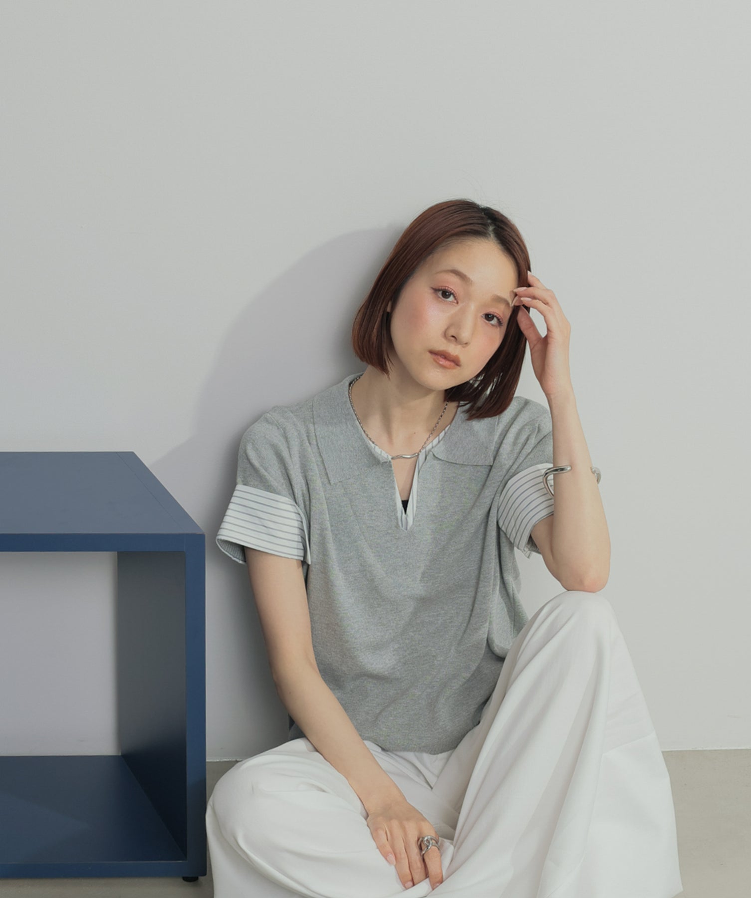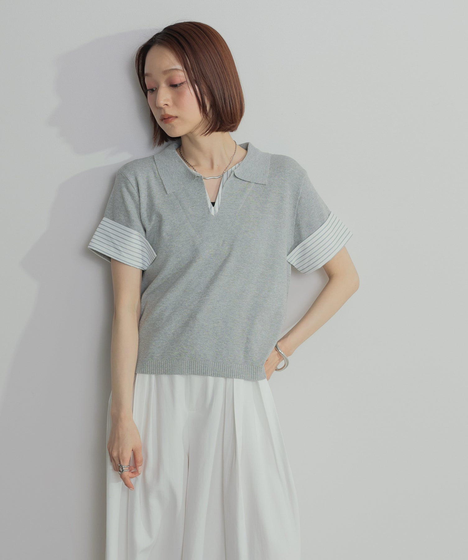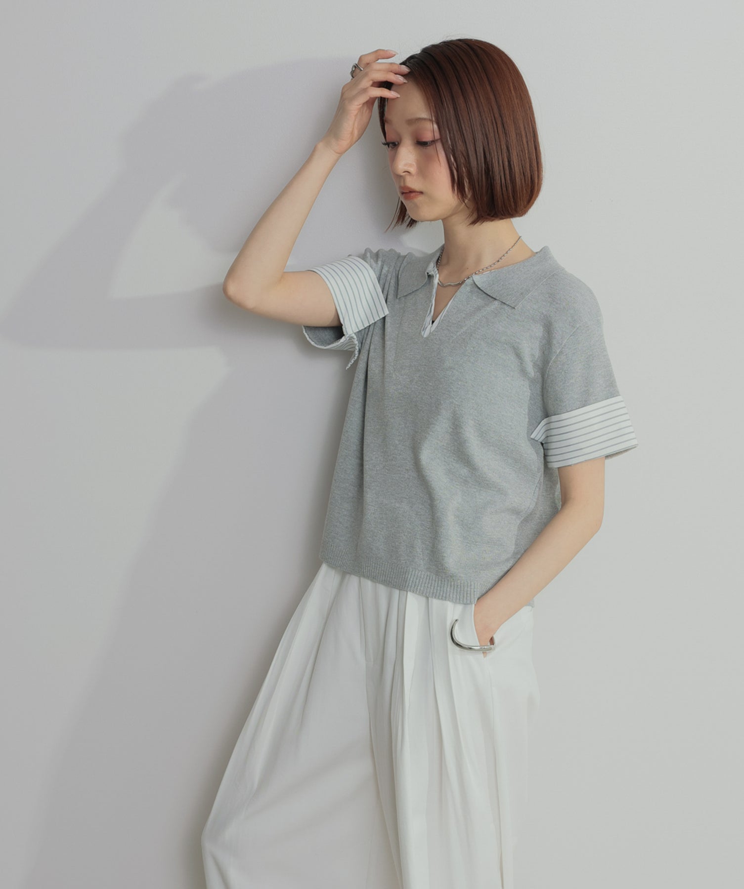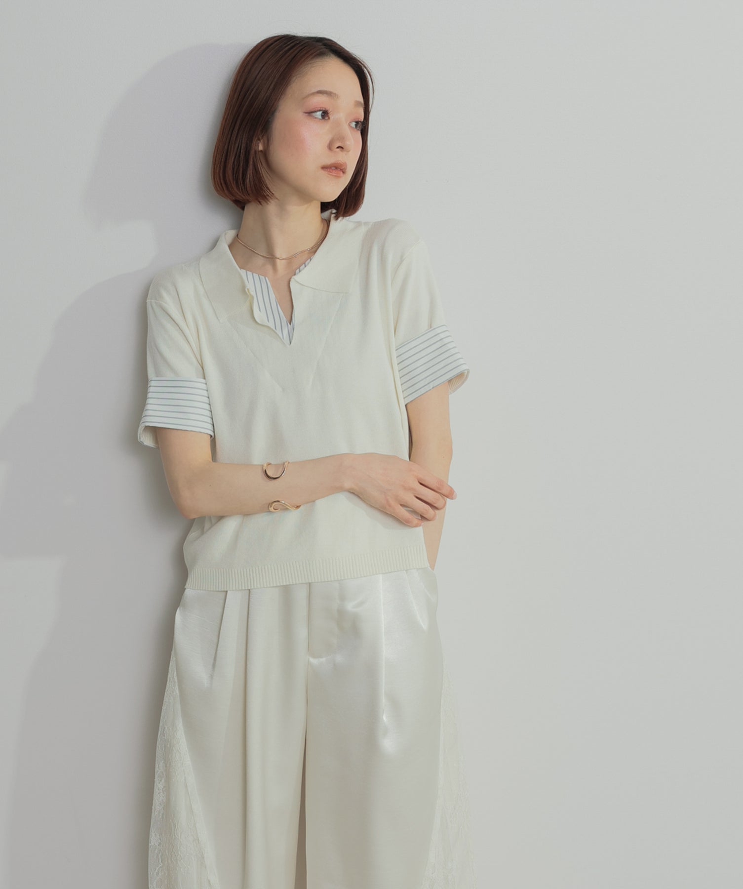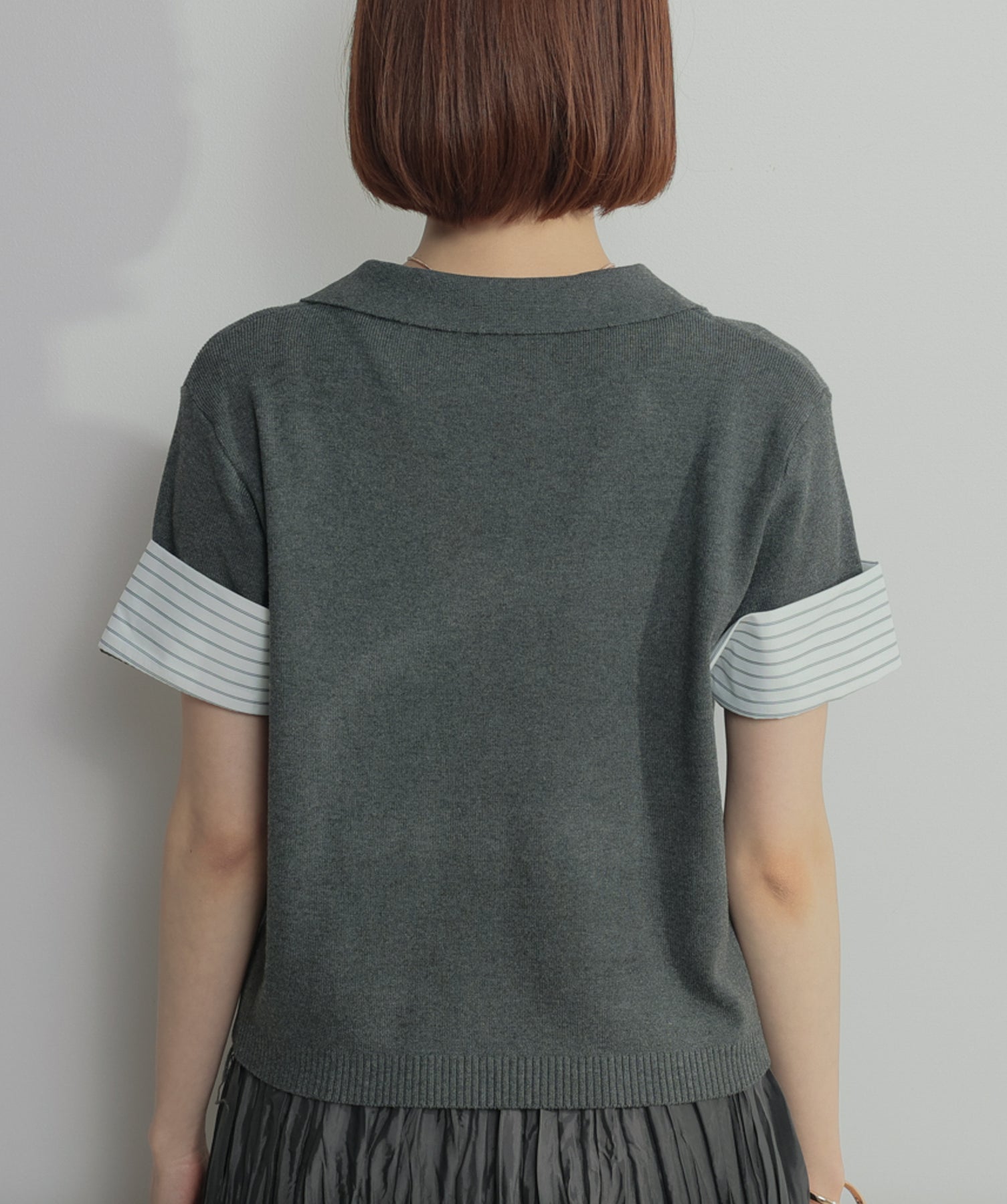 抜け感とレイヤードで魅せる、洗練ポロニットトップス。-material-柔らかく肌馴染みの良いニット素材をベースに、シャツ素材をドッキングした異素材デザイン。軽やかな着心地と程よい伸縮性で、ストレスフリーに着用可能。シンプルながらも素材のコントラストがスタイリングに奥行きをプラスします。-design-ポロニットにシャツディテールを重ねたようなレイヤード風デザインが特徴。襟元や袖口の切り替えがアクセントになり、1枚でこなれた印象に仕上がる一着。コンパクトな丈感でボトムとのバランスが取りやすく、ワイドパンツやスカートとも好相性。カジュアルさとモード感を兼ね備えた、着回し力の高いトップスです。