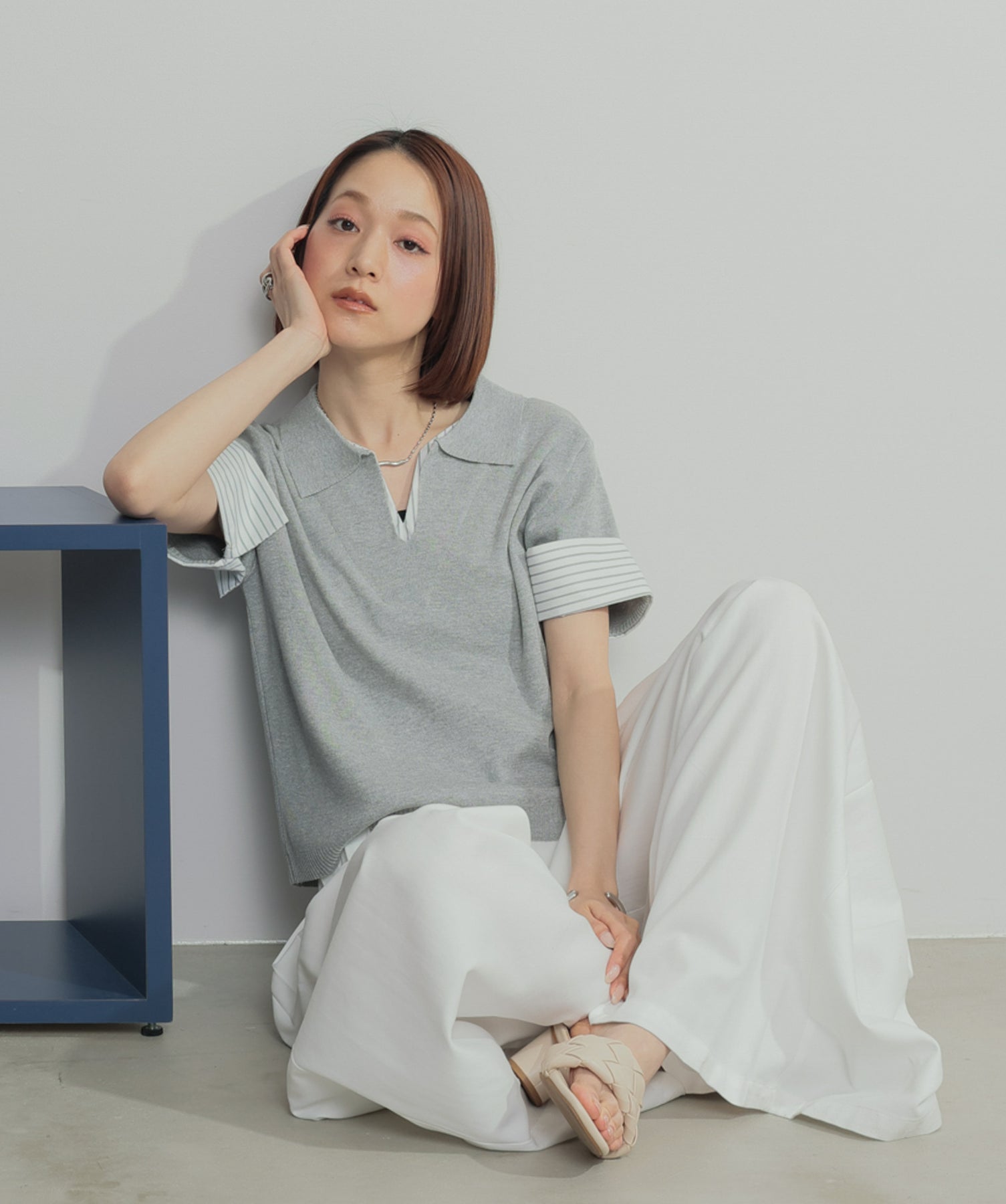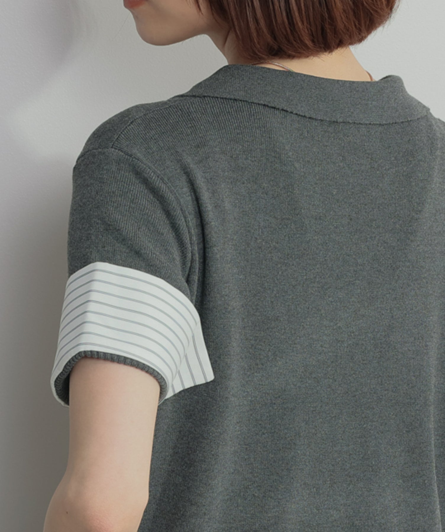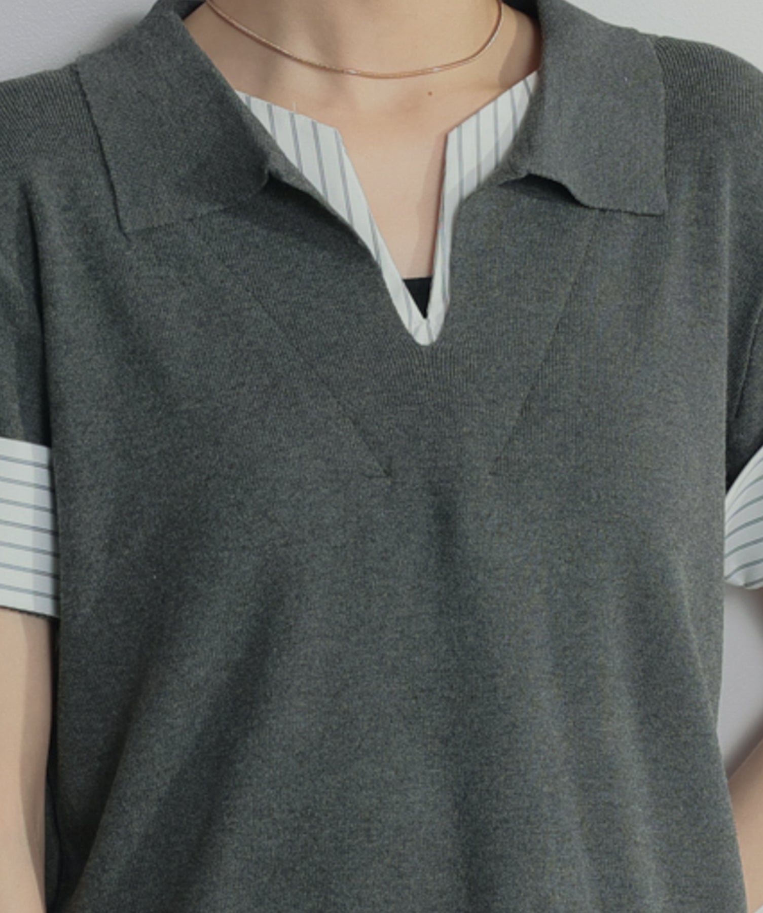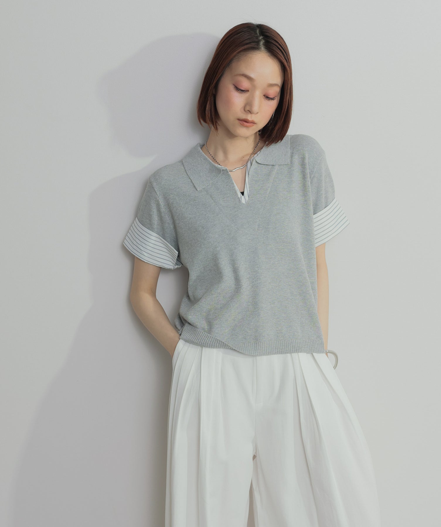 抜け感とレイヤードで魅せる、洗練ポロニットトップス。-material-柔らかく肌馴染みの良いニット素材をベースに、シャツ素材をドッキングした異素材デザイン。軽やかな着心地と程よい伸縮性で、ストレスフリーに着用可能。シンプルながらも素材のコントラストがスタイリングに奥行きをプラスします。-design-ポロニットにシャツディテールを重ねたようなレイヤード風デザインが特徴。襟元や袖口の切り替えがアクセントになり、1枚でこなれた印象に仕上がる一着。コンパクトな丈感でボトムとのバランスが取りやすく、ワイドパンツやスカートとも好相性。カジュアルさとモード感を兼ね備えた、着回し力の高いトップスです。