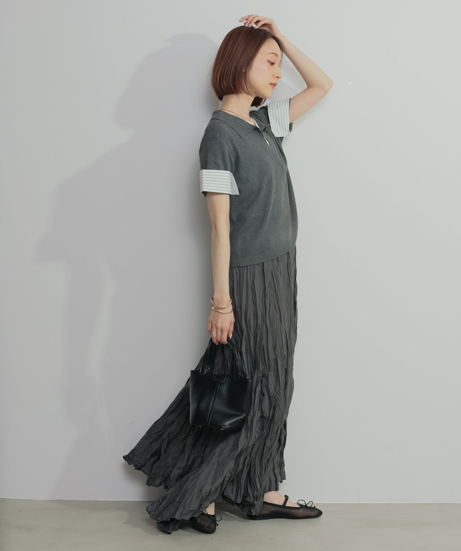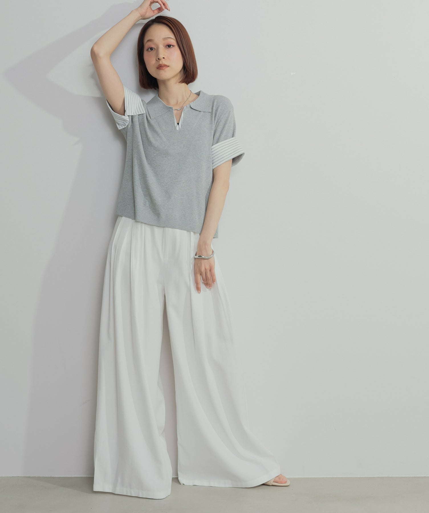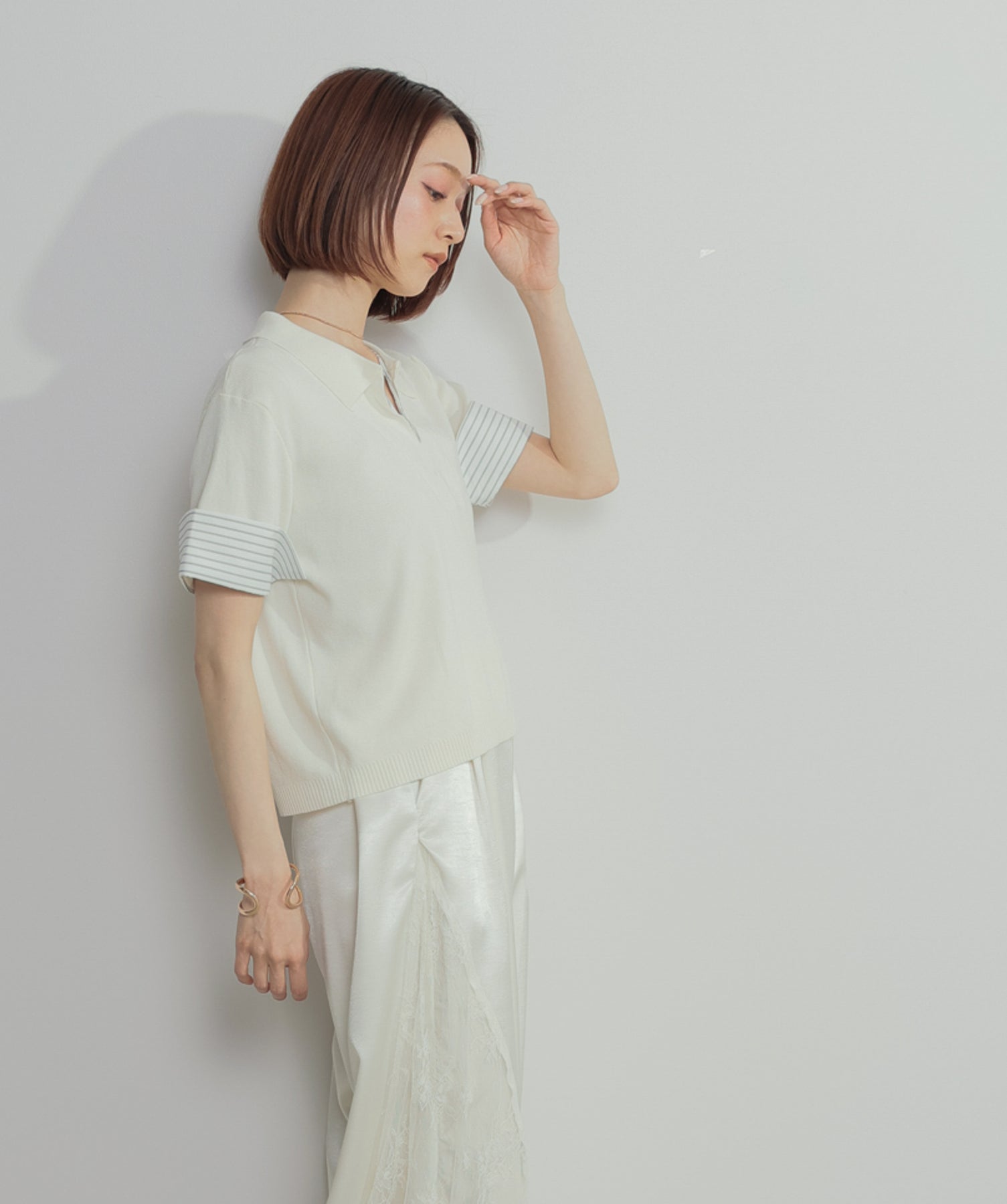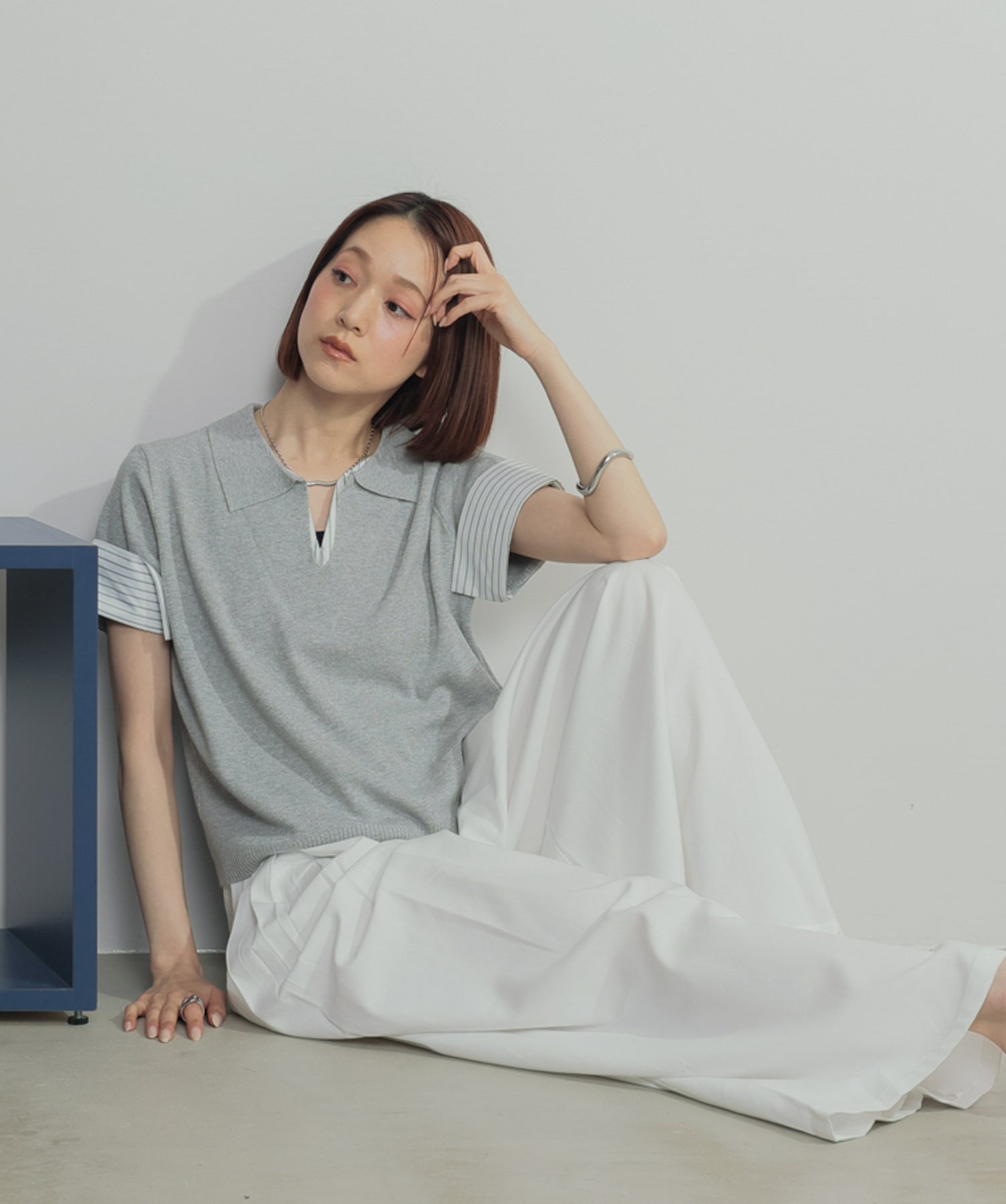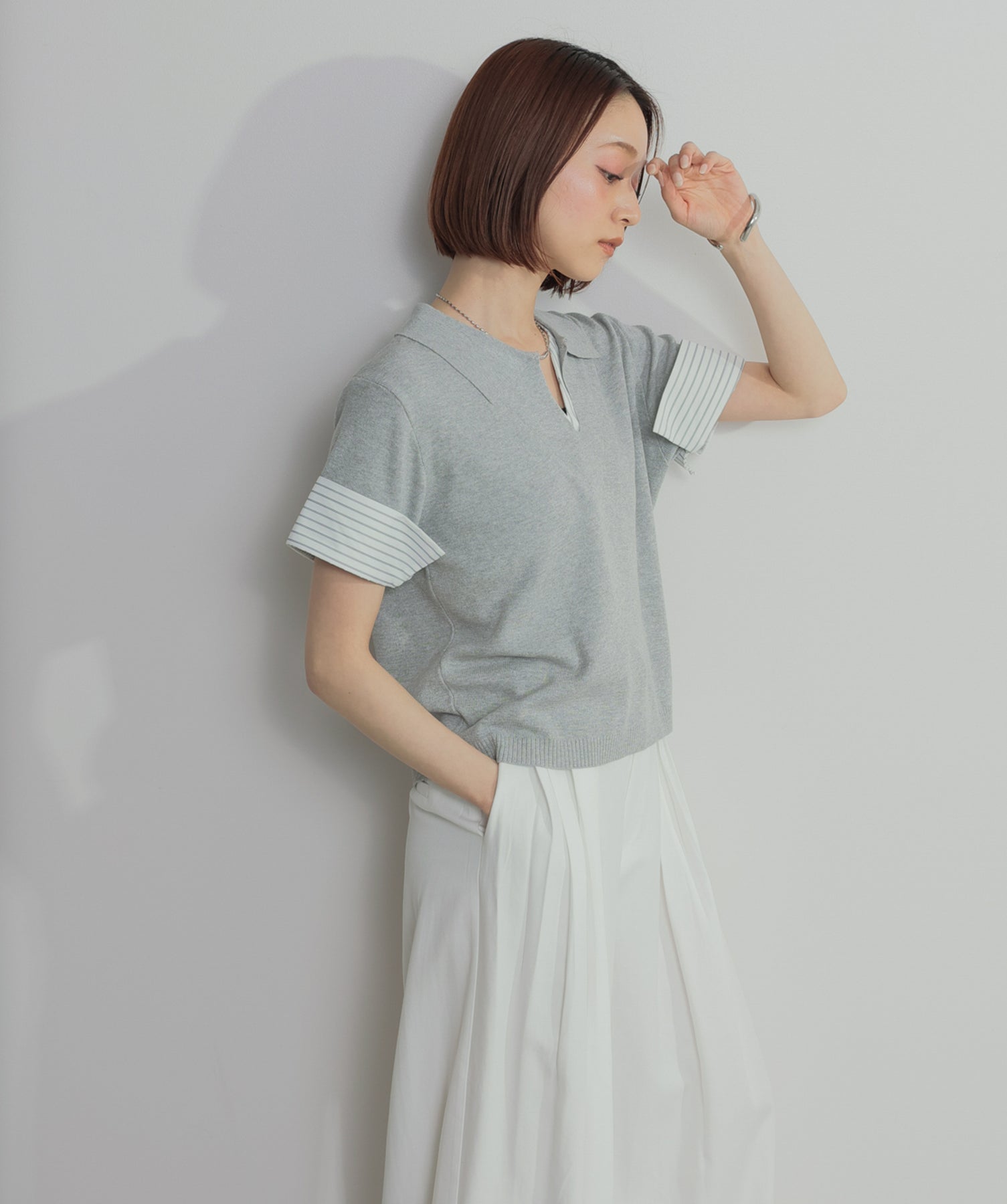 抜け感とレイヤードで魅せる、洗練ポロニットトップス。-material-柔らかく肌馴染みの良いニット素材をベースに、シャツ素材をドッキングした異素材デザイン。軽やかな着心地と程よい伸縮性で、ストレスフリーに着用可能。シンプルながらも素材のコントラストがスタイリングに奥行きをプラスします。-design-ポロニットにシャツディテールを重ねたようなレイヤード風デザインが特徴。襟元や袖口の切り替えがアクセントになり、1枚でこなれた印象に仕上がる一着。コンパクトな丈感でボトムとのバランスが取りやすく、ワイドパンツやスカートとも好相性。カジュアルさとモード感を兼ね備えた、着回し力の高いトップスです。