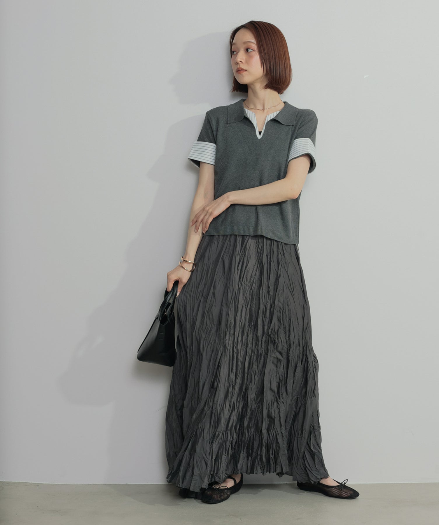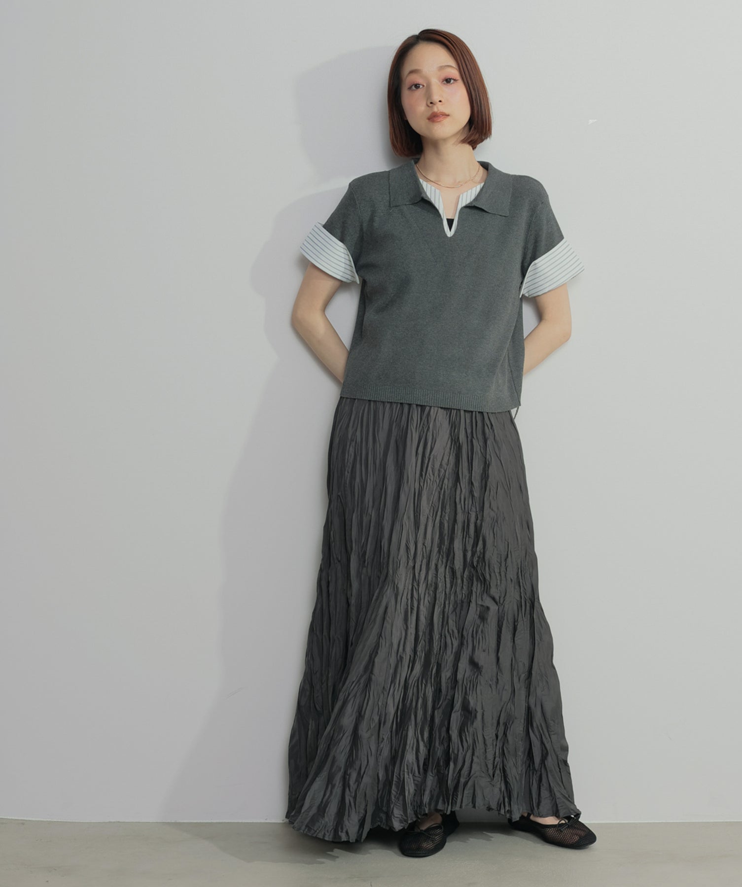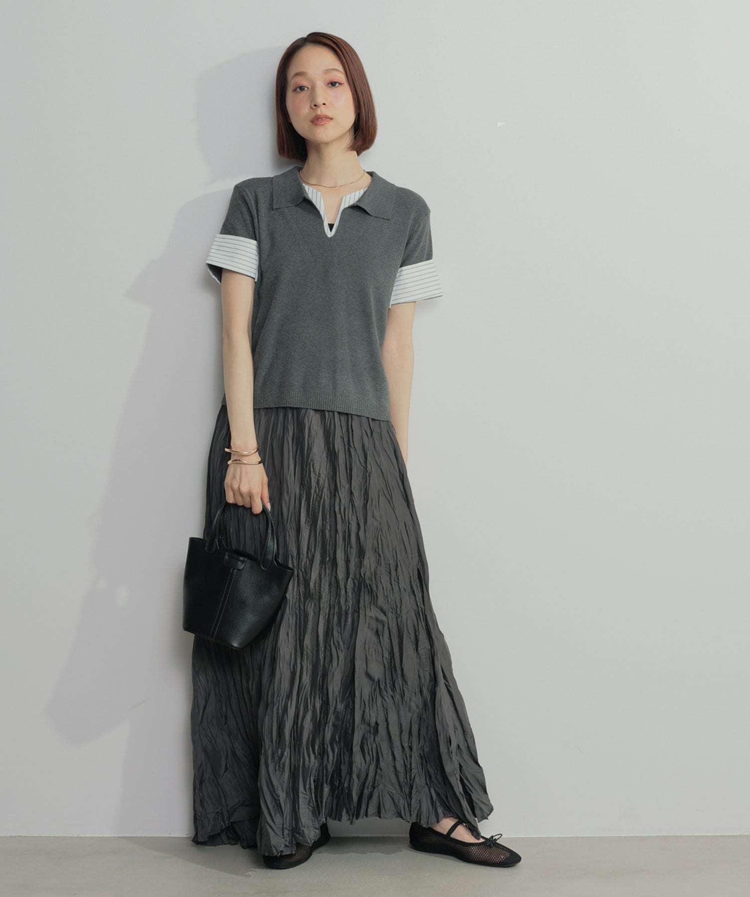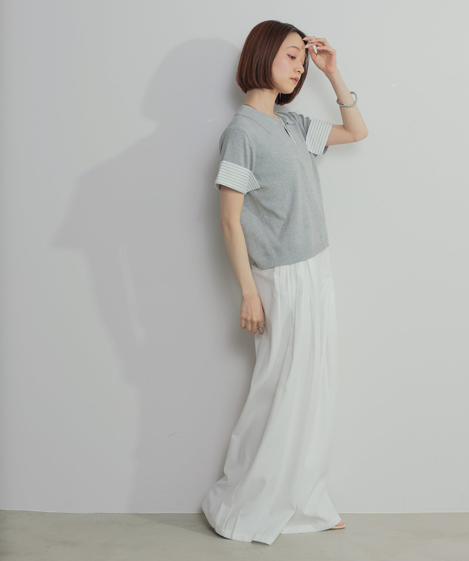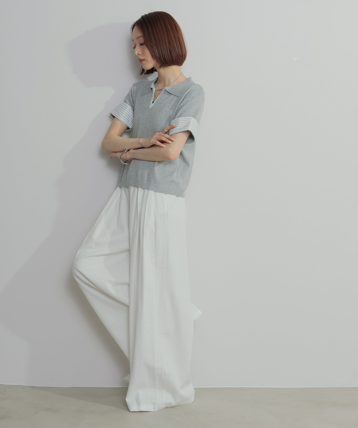 抜け感とレイヤードで魅せる、洗練ポロニットトップス。-material-柔らかく肌馴染みの良いニット素材をベースに、シャツ素材をドッキングした異素材デザイン。軽やかな着心地と程よい伸縮性で、ストレスフリーに着用可能。シンプルながらも素材のコントラストがスタイリングに奥行きをプラスします。-design-ポロニットにシャツディテールを重ねたようなレイヤード風デザインが特徴。襟元や袖口の切り替えがアクセントになり、1枚でこなれた印象に仕上がる一着。コンパクトな丈感でボトムとのバランスが取りやすく、ワイドパンツやスカートとも好相性。カジュアルさとモード感を兼ね備えた、着回し力の高いトップスです。