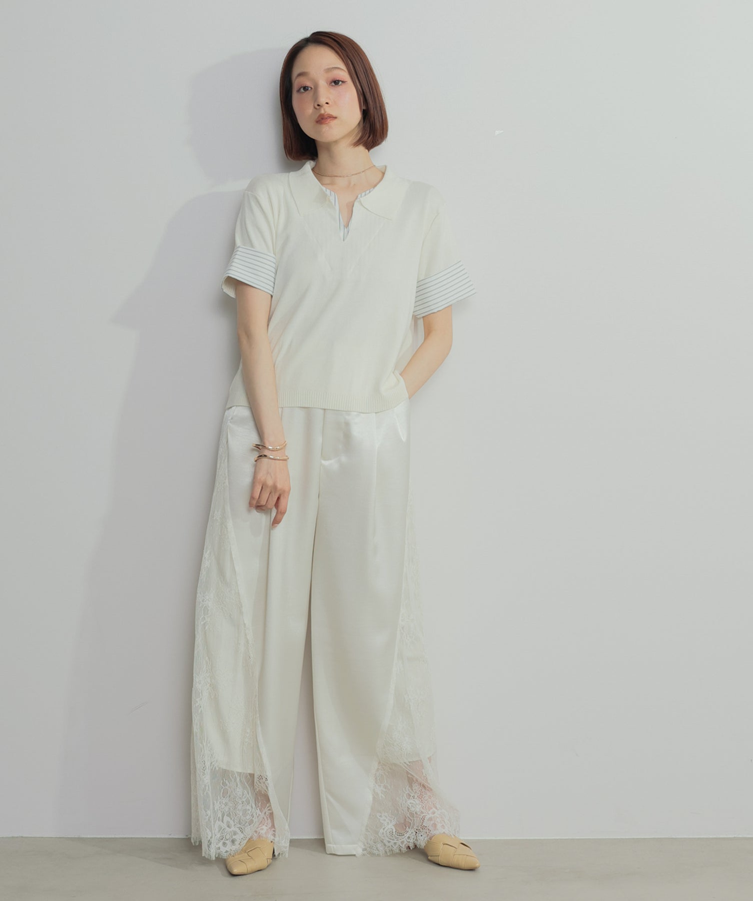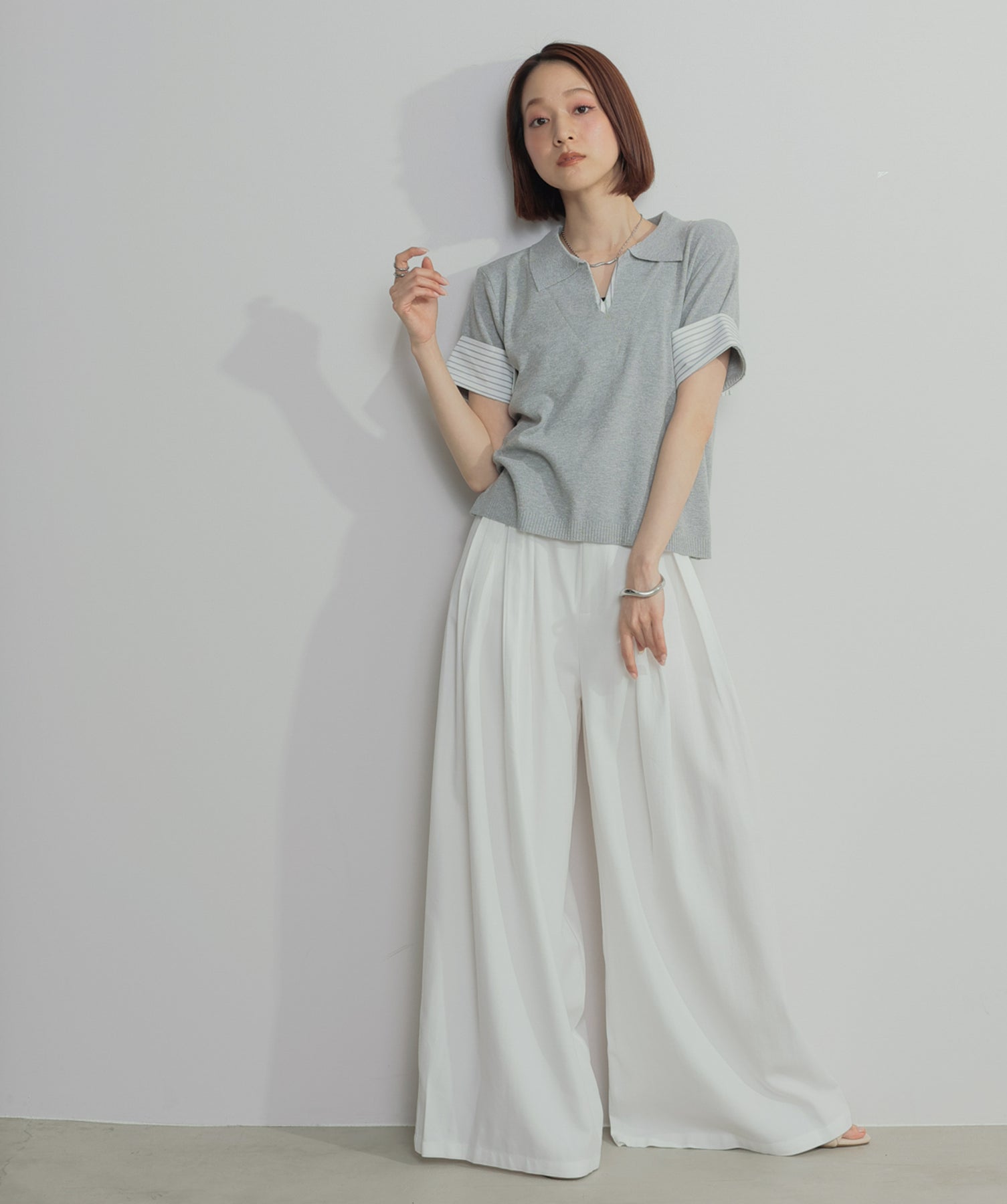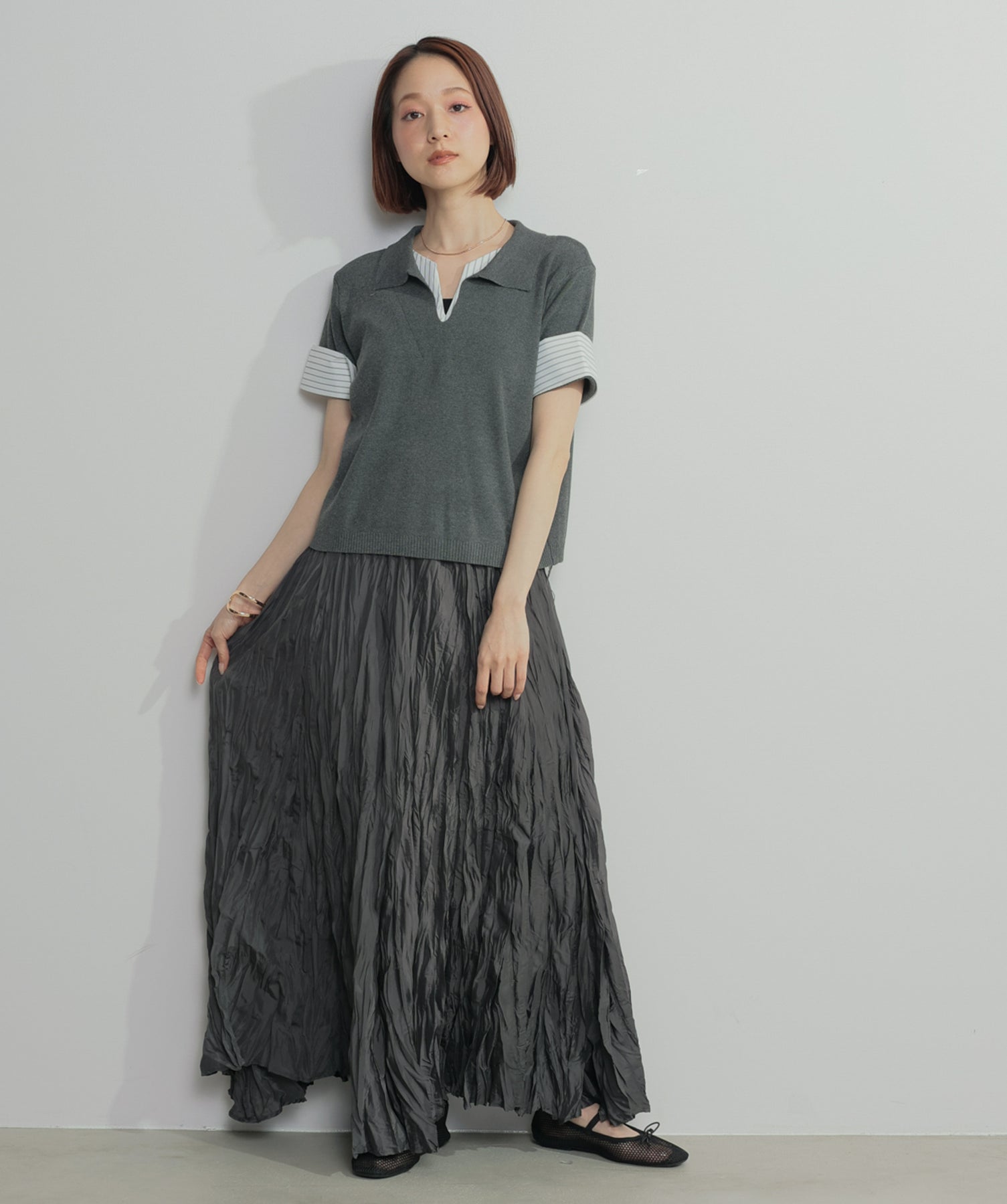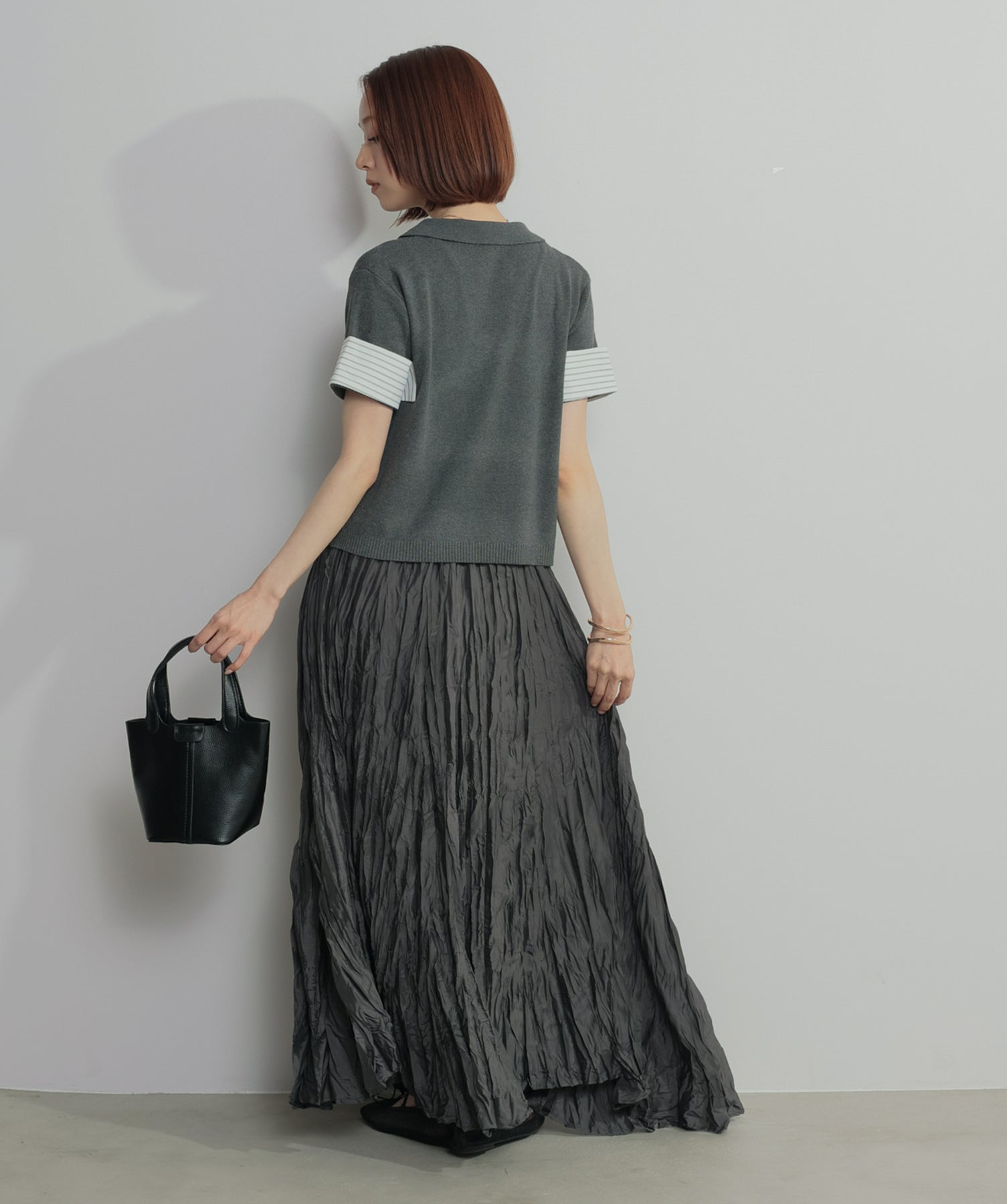 抜け感とレイヤードで魅せる、洗練ポロニットトップス。-material-柔らかく肌馴染みの良いニット素材をベースに、シャツ素材をドッキングした異素材デザイン。軽やかな着心地と程よい伸縮性で、ストレスフリーに着用可能。シンプルながらも素材のコントラストがスタイリングに奥行きをプラスします。-design-ポロニットにシャツディテールを重ねたようなレイヤード風デザインが特徴。襟元や袖口の切り替えがアクセントになり、1枚でこなれた印象に仕上がる一着。コンパクトな丈感でボトムとのバランスが取りやすく、ワイドパンツやスカートとも好相性。カジュアルさとモード感を兼ね備えた、着回し力の高いトップスです。