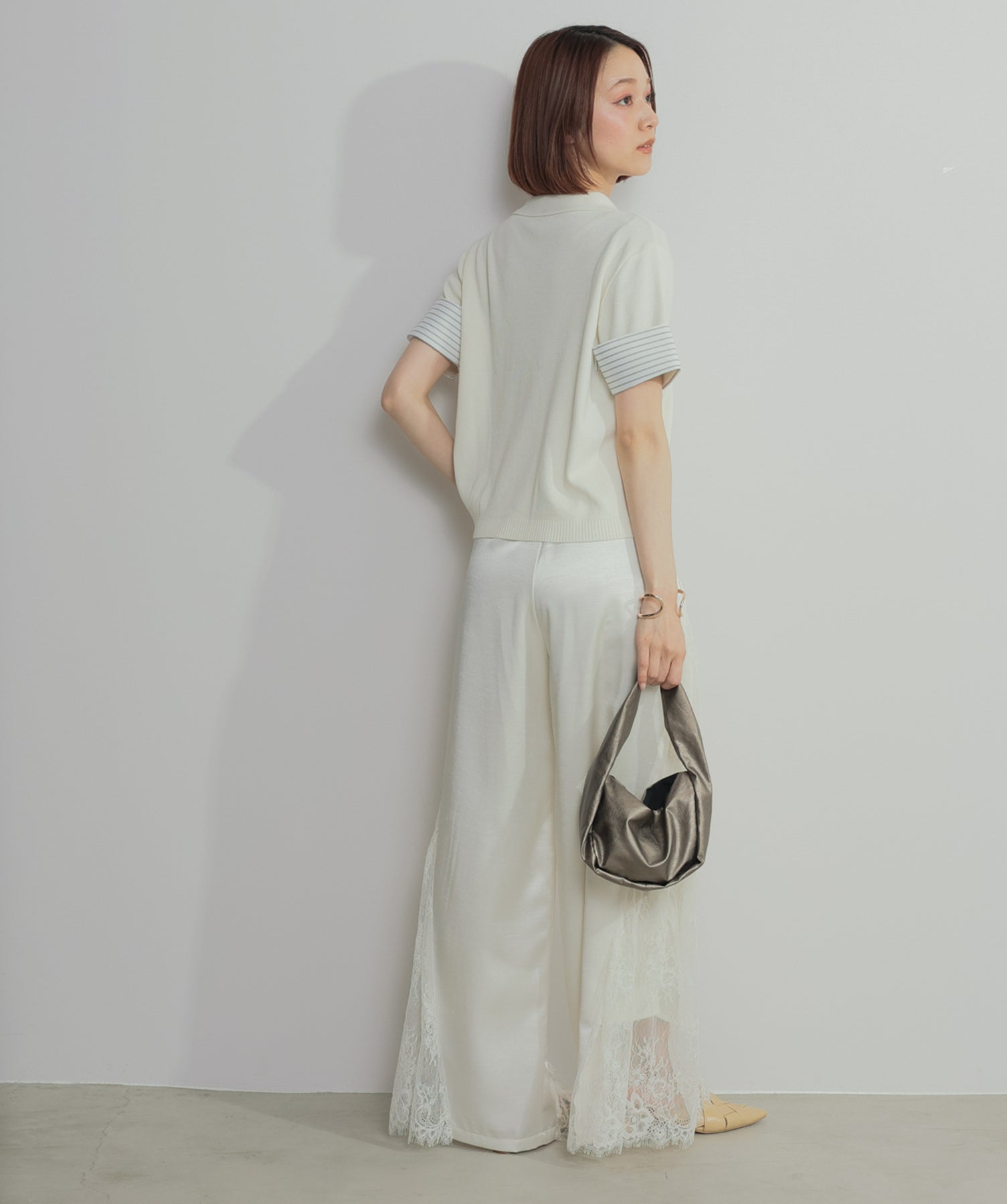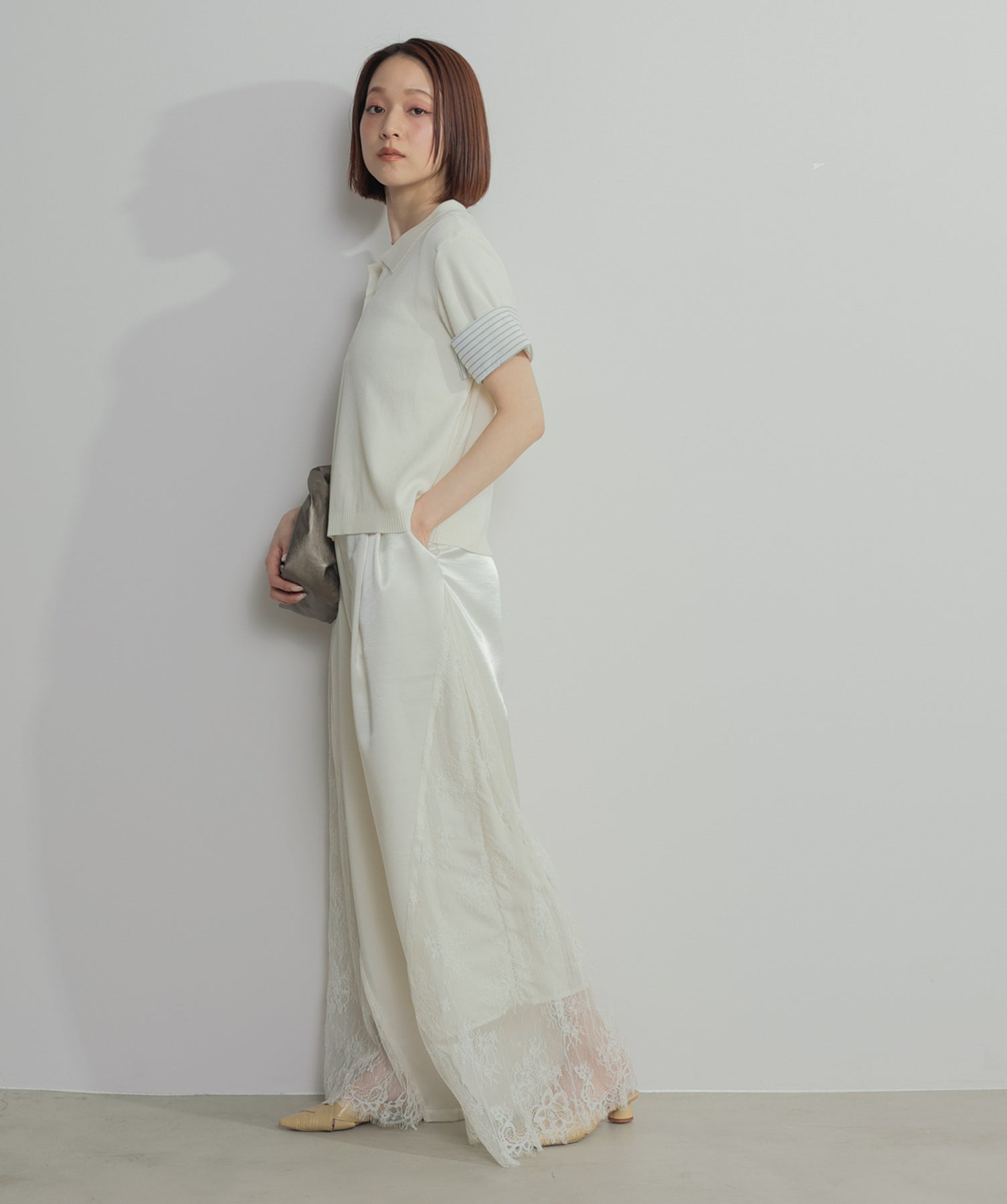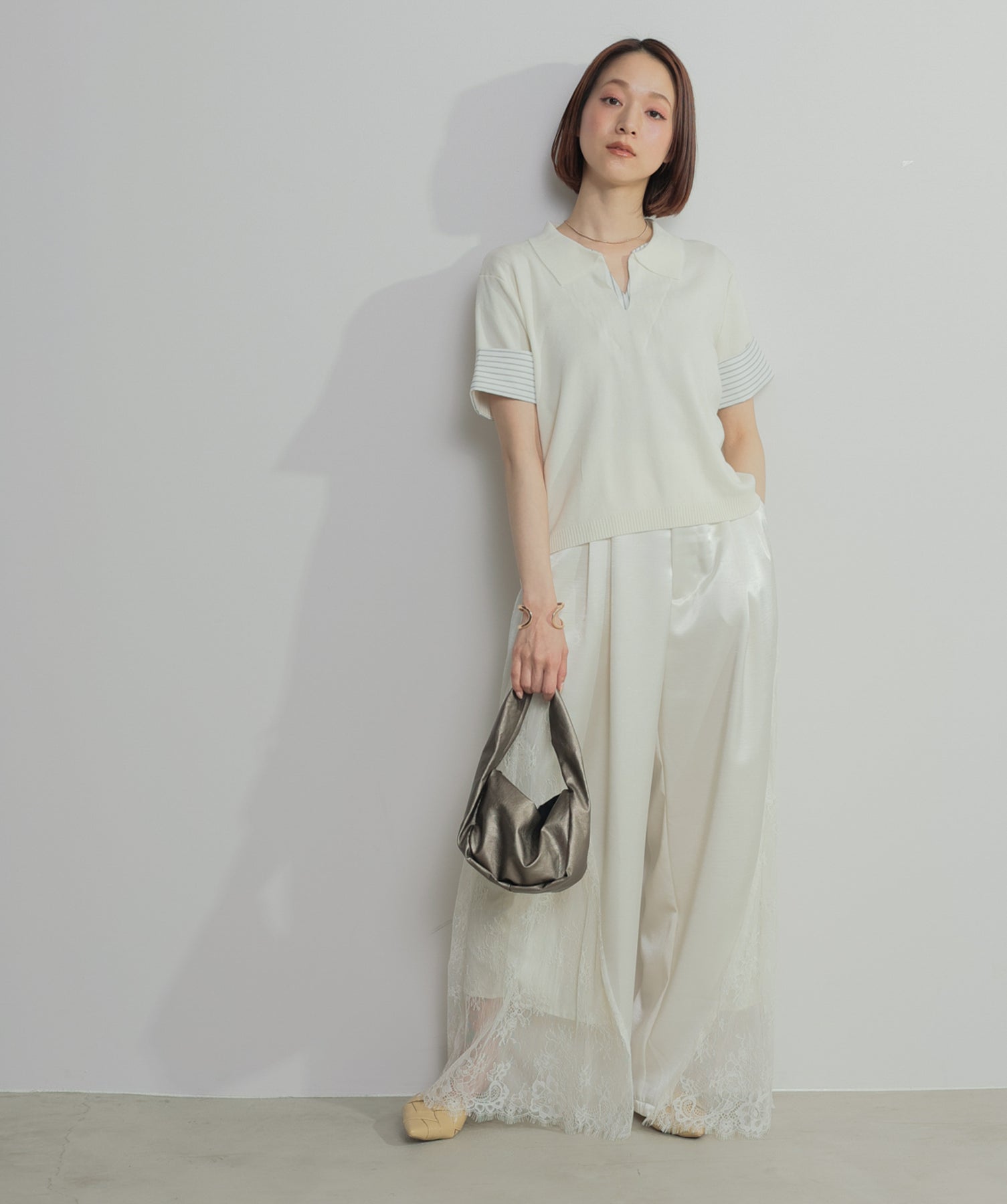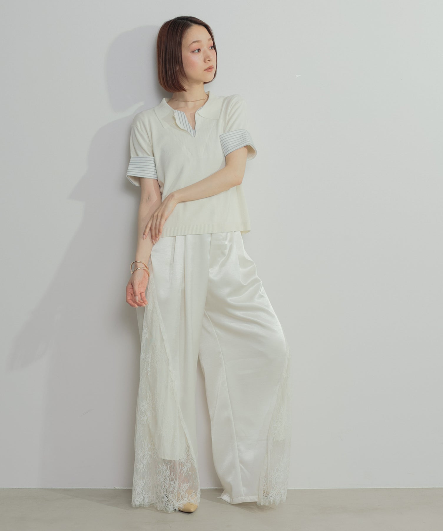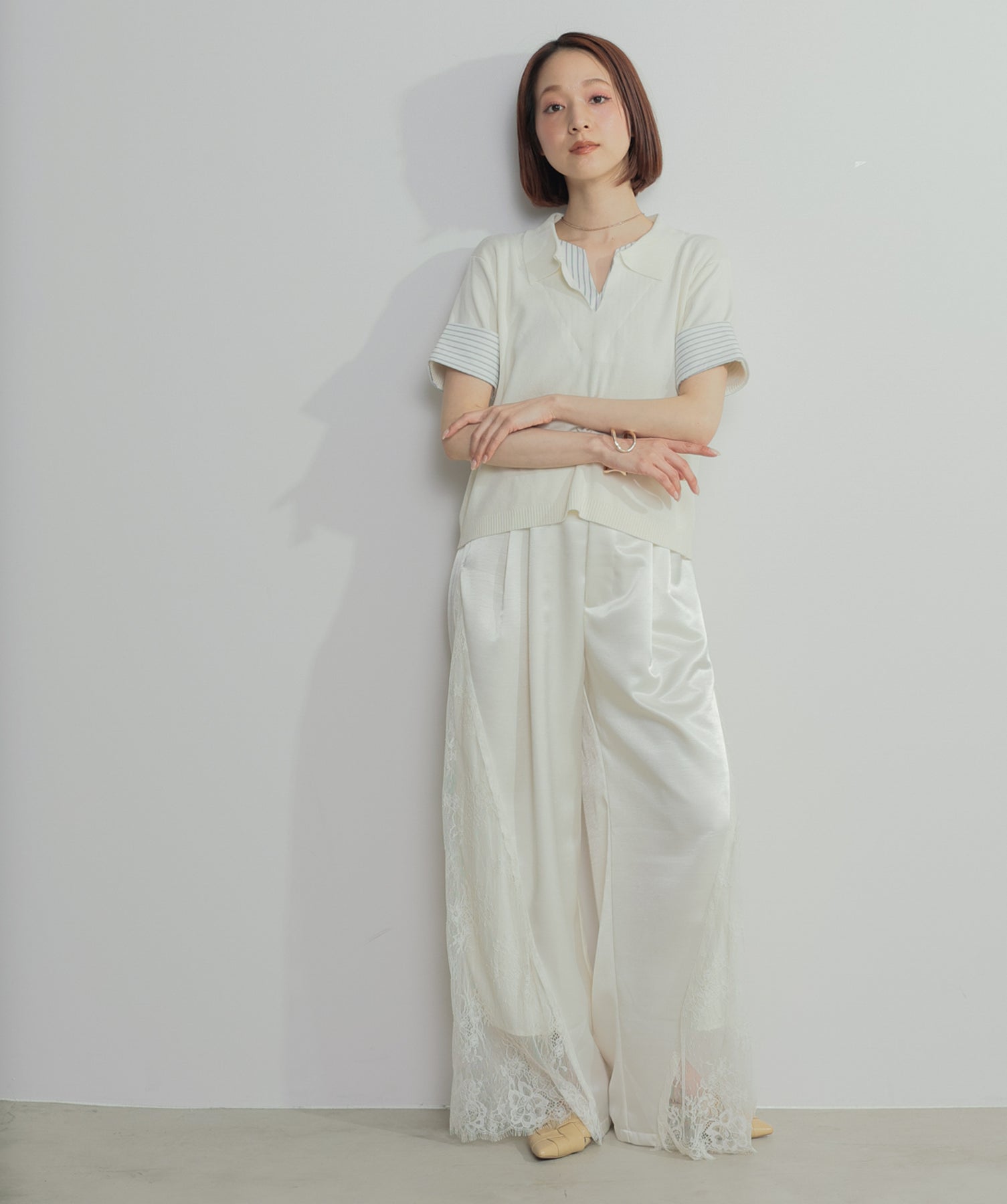 抜け感とレイヤードで魅せる、洗練ポロニットトップス。-material-柔らかく肌馴染みの良いニット素材をベースに、シャツ素材をドッキングした異素材デザイン。軽やかな着心地と程よい伸縮性で、ストレスフリーに着用可能。シンプルながらも素材のコントラストがスタイリングに奥行きをプラスします。-design-ポロニットにシャツディテールを重ねたようなレイヤード風デザインが特徴。襟元や袖口の切り替えがアクセントになり、1枚でこなれた印象に仕上がる一着。コンパクトな丈感でボトムとのバランスが取りやすく、ワイドパンツやスカートとも好相性。カジュアルさとモード感を兼ね備えた、着回し力の高いトップスです。