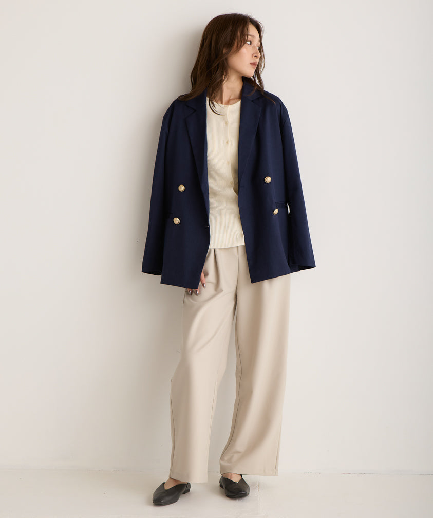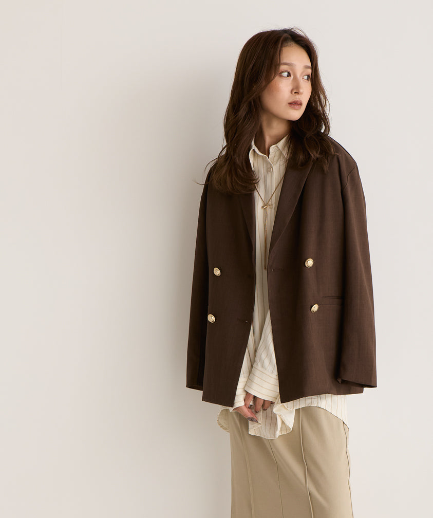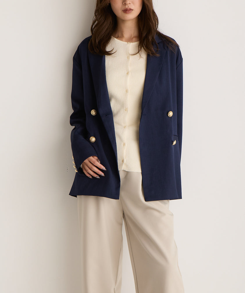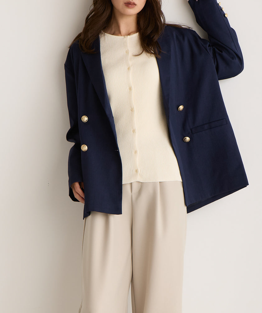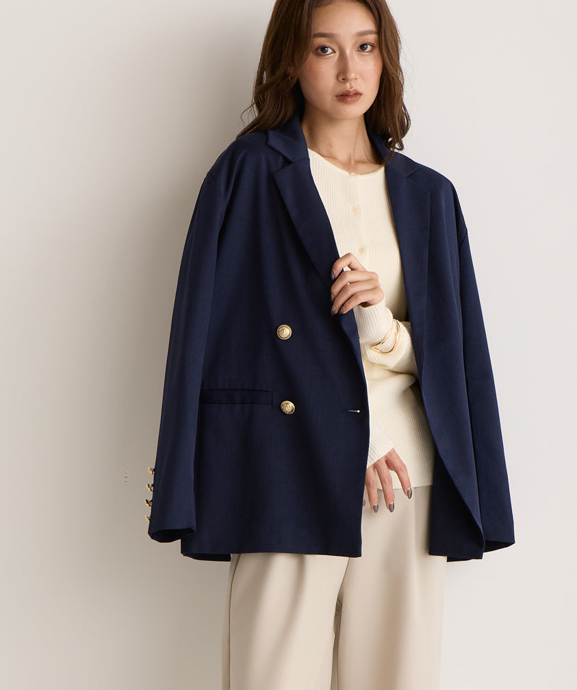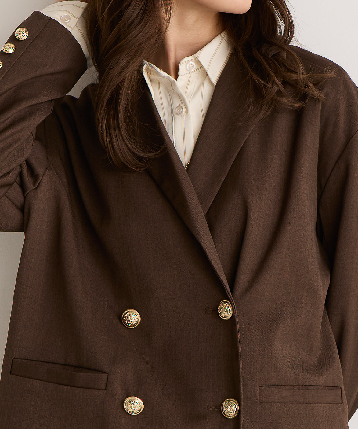 クラシカルな華やぎを添える、ゴールドボタンテーラードジャケット。上品な光沢感のあるゴールドボタンがアクセントになったダブルブレスト仕様のテーラードジャケット。ハンサムな印象を与える端正なシルエットながら、程よくゆとりのあるサイズ感でこなれ感も演出。ヒップにかかる丈感はパンツにもスカートにも合わせやすく、幅広いスタイリングに活躍します。さらりと羽織れる軽やかなポリエステルツイル素材を使用し、オンオフ問わずデイリーに取り入れやすい一着。インナーにシャツやニットを合わせれば秋冬の通勤コーデにも◎。
