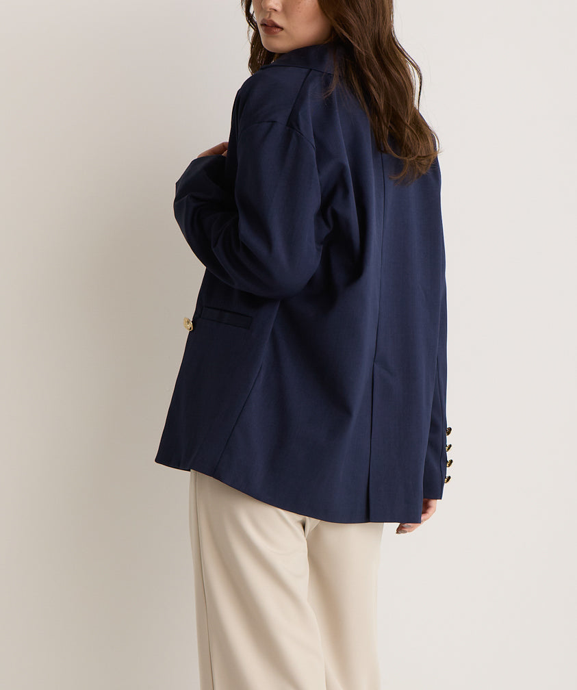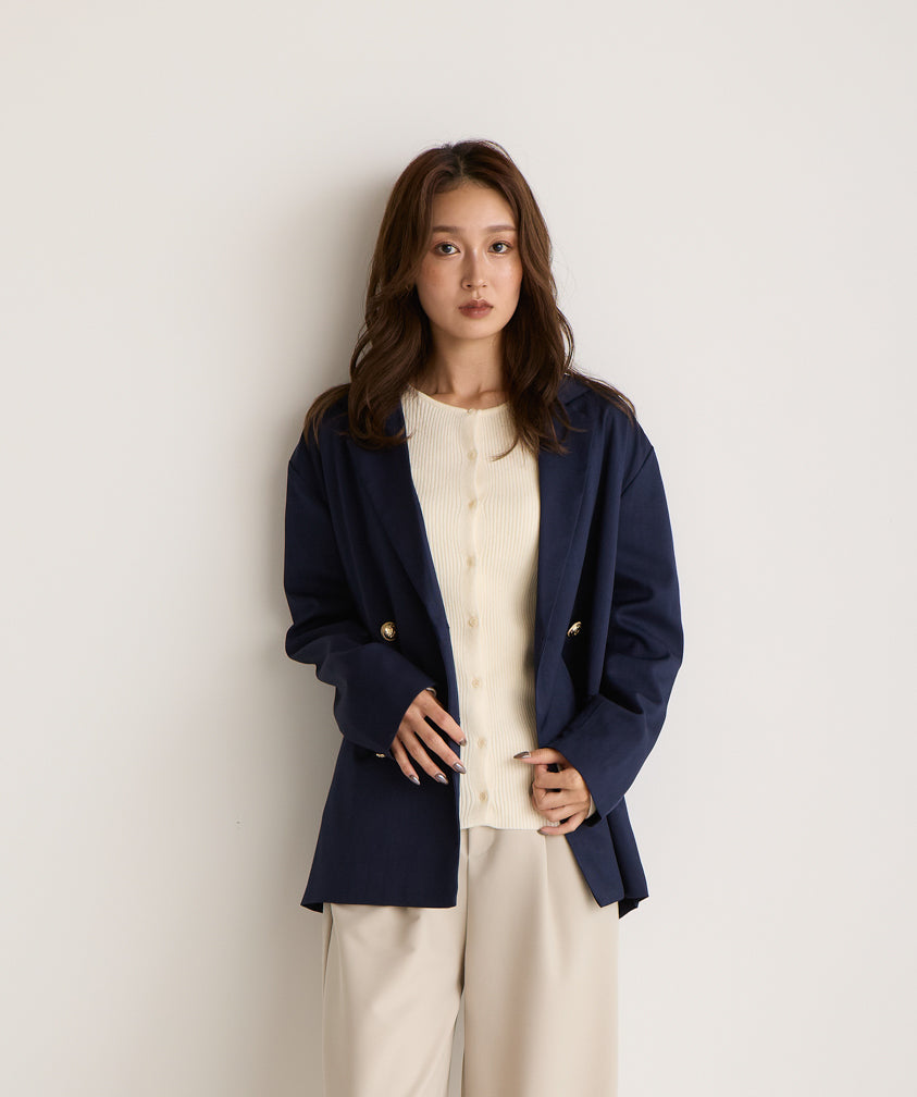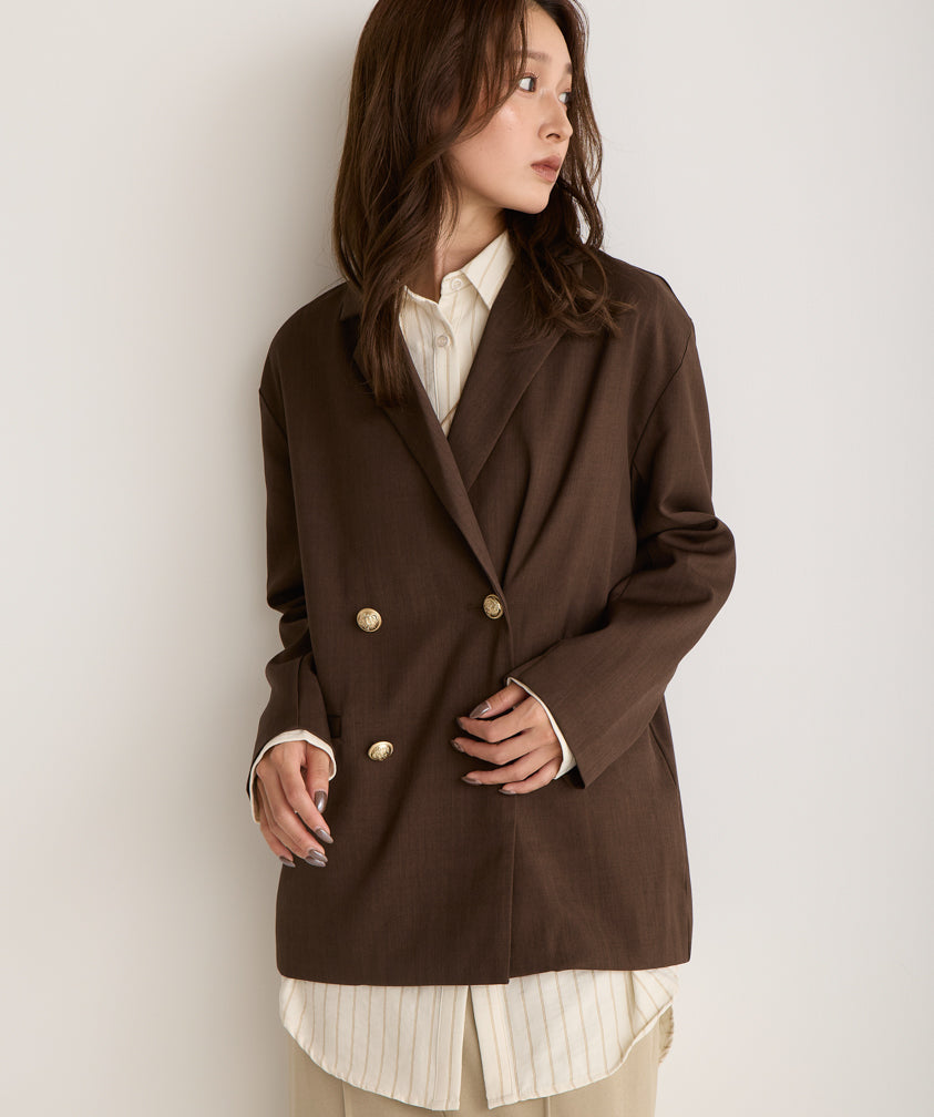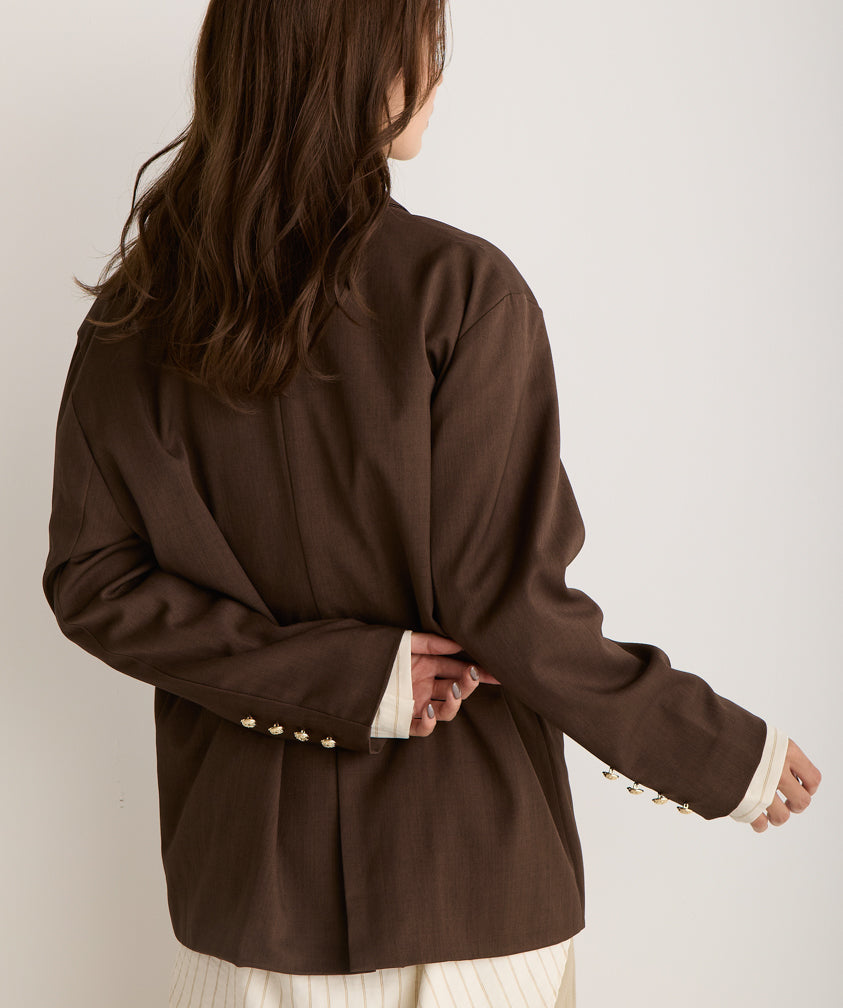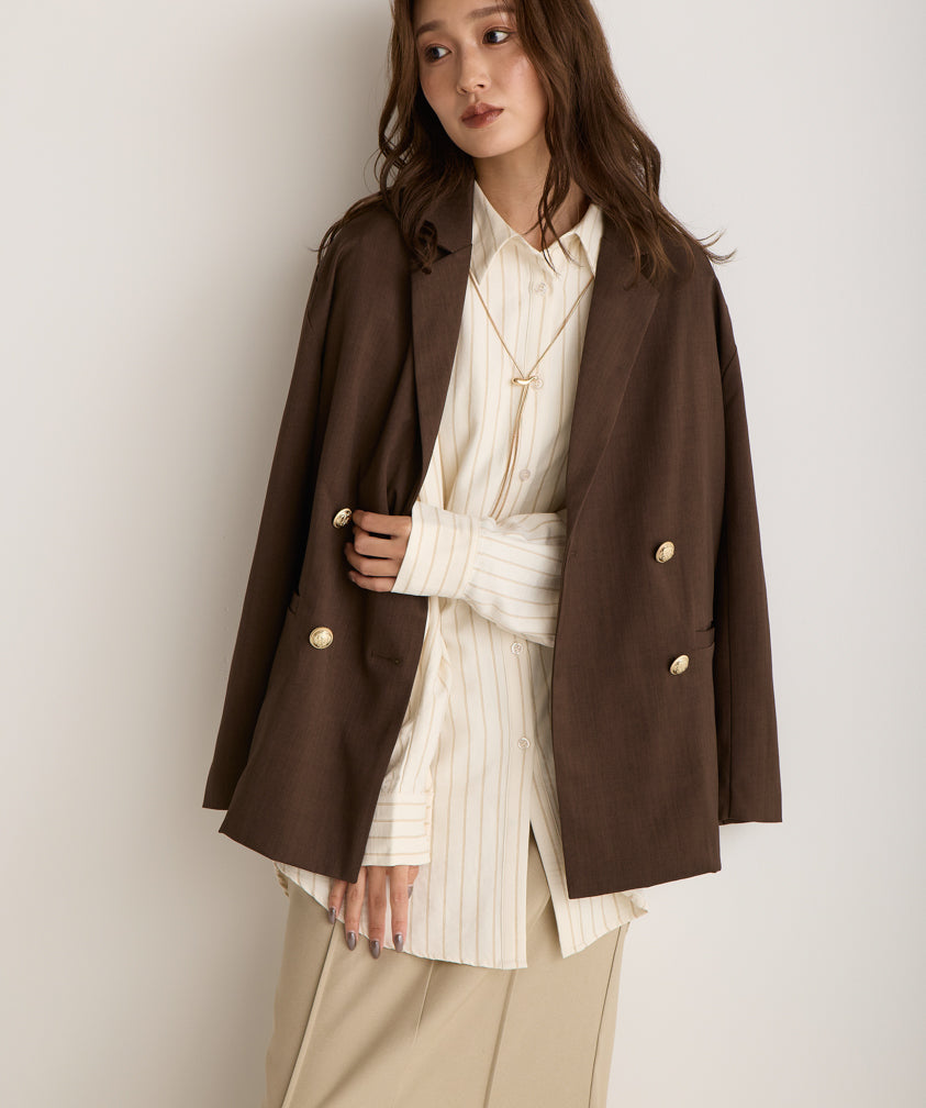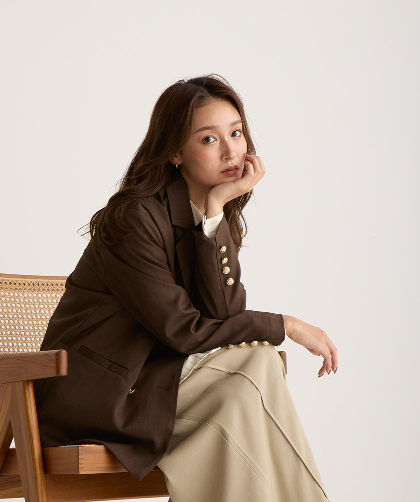 クラシカルな華やぎを添える、ゴールドボタンテーラードジャケット。上品な光沢感のあるゴールドボタンがアクセントになったダブルブレスト仕様のテーラードジャケット。ハンサムな印象を与える端正なシルエットながら、程よくゆとりのあるサイズ感でこなれ感も演出。ヒップにかかる丈感はパンツにもスカートにも合わせやすく、幅広いスタイリングに活躍します。さらりと羽織れる軽やかなポリエステルツイル素材を使用し、オンオフ問わずデイリーに取り入れやすい一着。インナーにシャツやニットを合わせれば秋冬の通勤コーデにも◎。