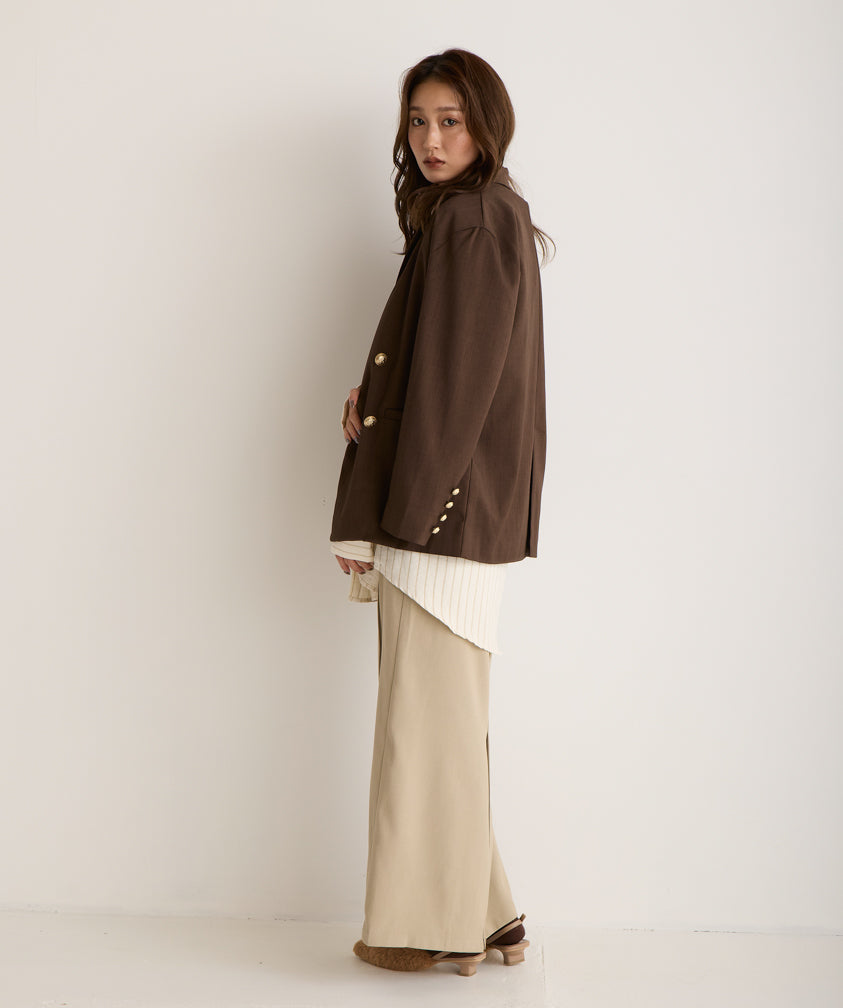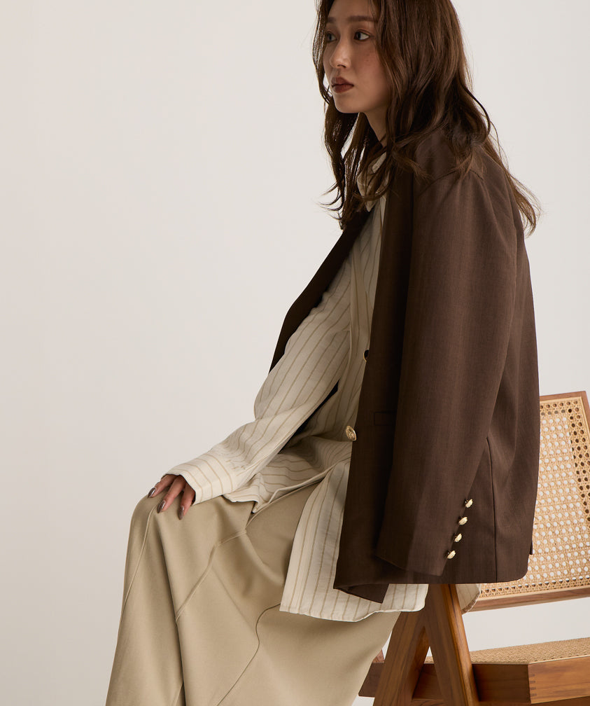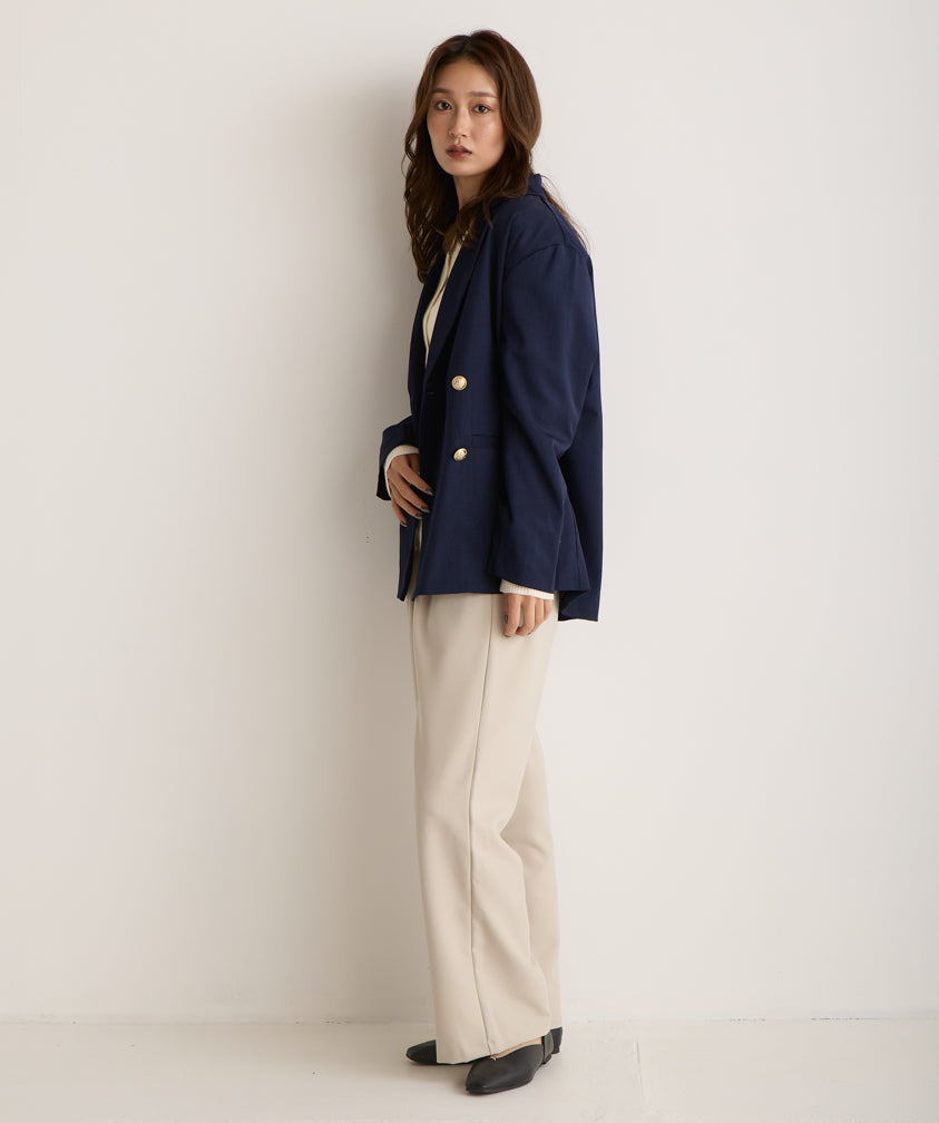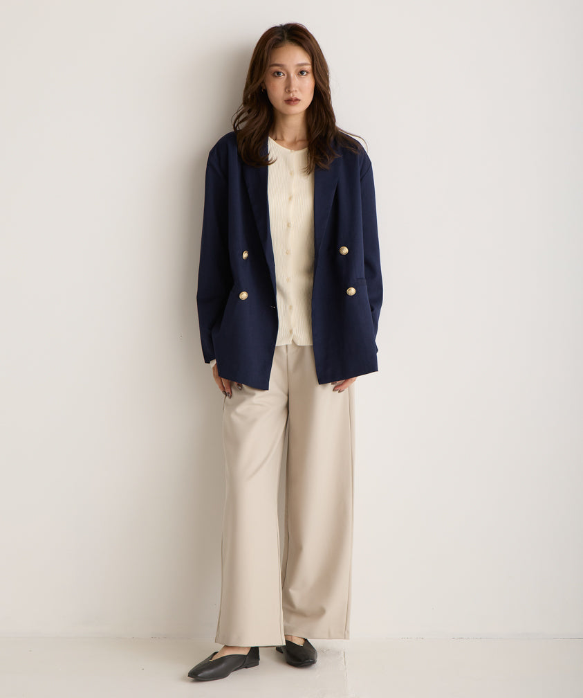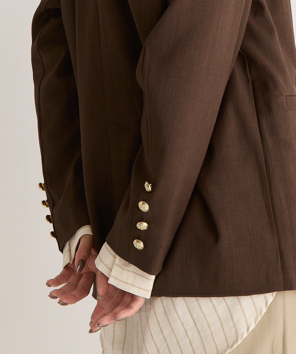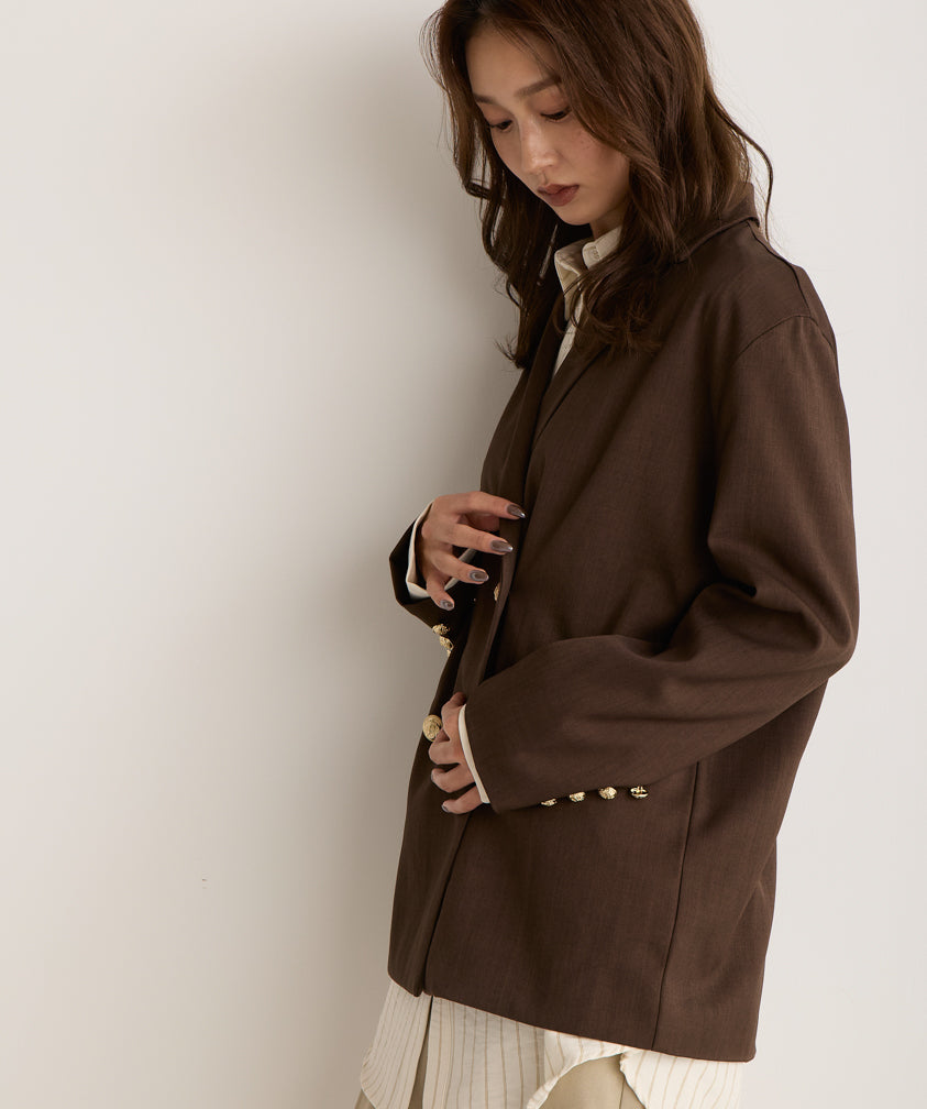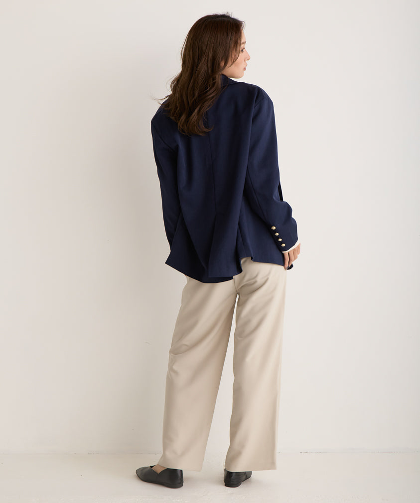 クラシカルな華やぎを添える、ゴールドボタンテーラードジャケット。上品な光沢感のあるゴールドボタンがアクセントになったダブルブレスト仕様のテーラードジャケット。ハンサムな印象を与える端正なシルエットながら、程よくゆとりのあるサイズ感でこなれ感も演出。ヒップにかかる丈感はパンツにもスカートにも合わせやすく、幅広いスタイリングに活躍します。さらりと羽織れる軽やかなポリエステルツイル素材を使用し、オンオフ問わずデイリーに取り入れやすい一着。インナーにシャツやニットを合わせれば秋冬の通勤コーデにも◎。