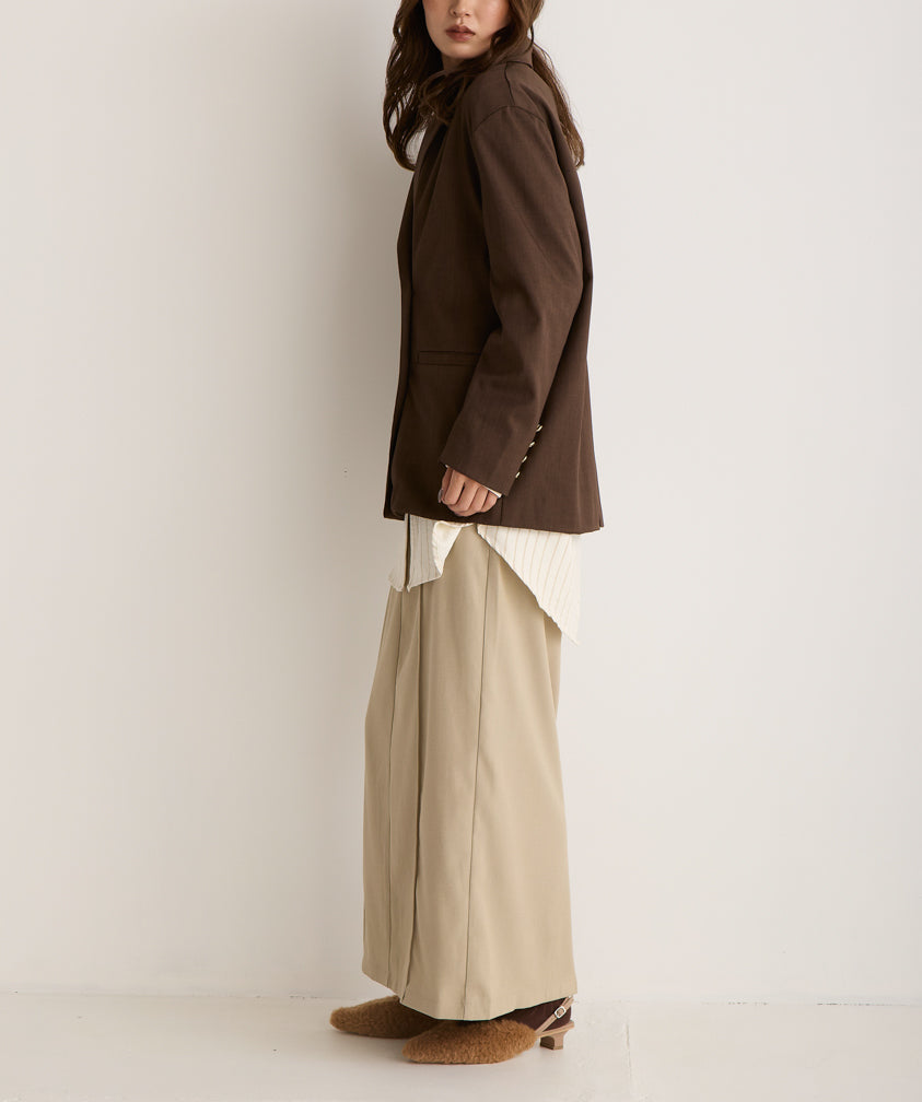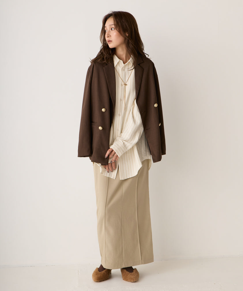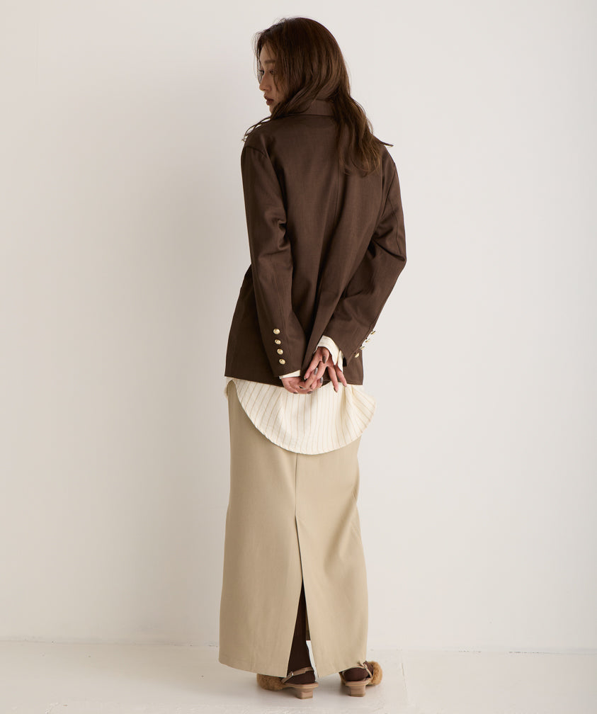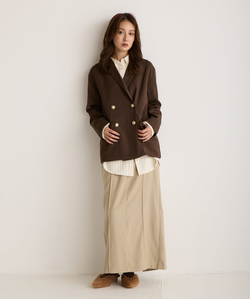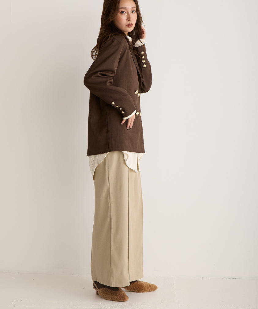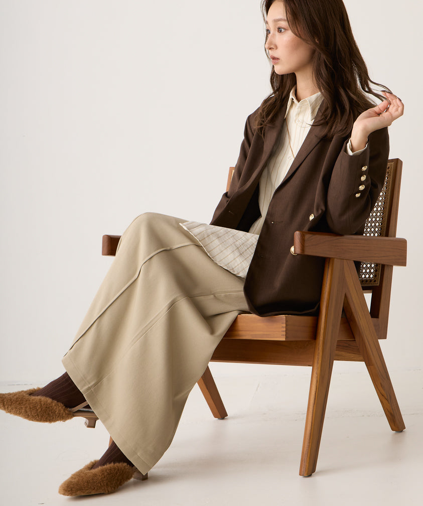 クラシカルな華やぎを添える、ゴールドボタンテーラードジャケット。上品な光沢感のあるゴールドボタンがアクセントになったダブルブレスト仕様のテーラードジャケット。ハンサムな印象を与える端正なシルエットながら、程よくゆとりのあるサイズ感でこなれ感も演出。ヒップにかかる丈感はパンツにもスカートにも合わせやすく、幅広いスタイリングに活躍します。さらりと羽織れる軽やかなポリエステルツイル素材を使用し、オンオフ問わずデイリーに取り入れやすい一着。インナーにシャツやニットを合わせれば秋冬の通勤コーデにも◎。