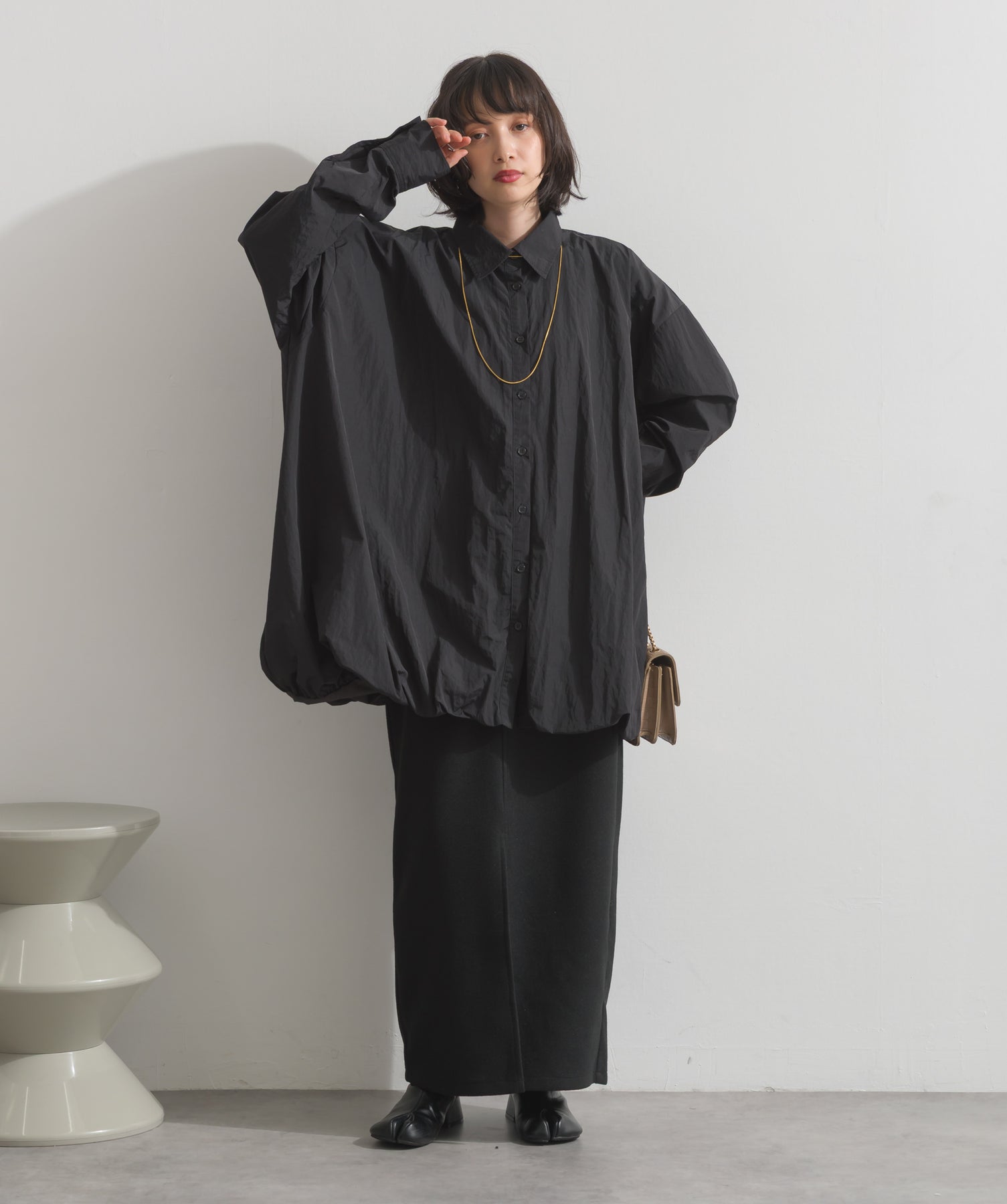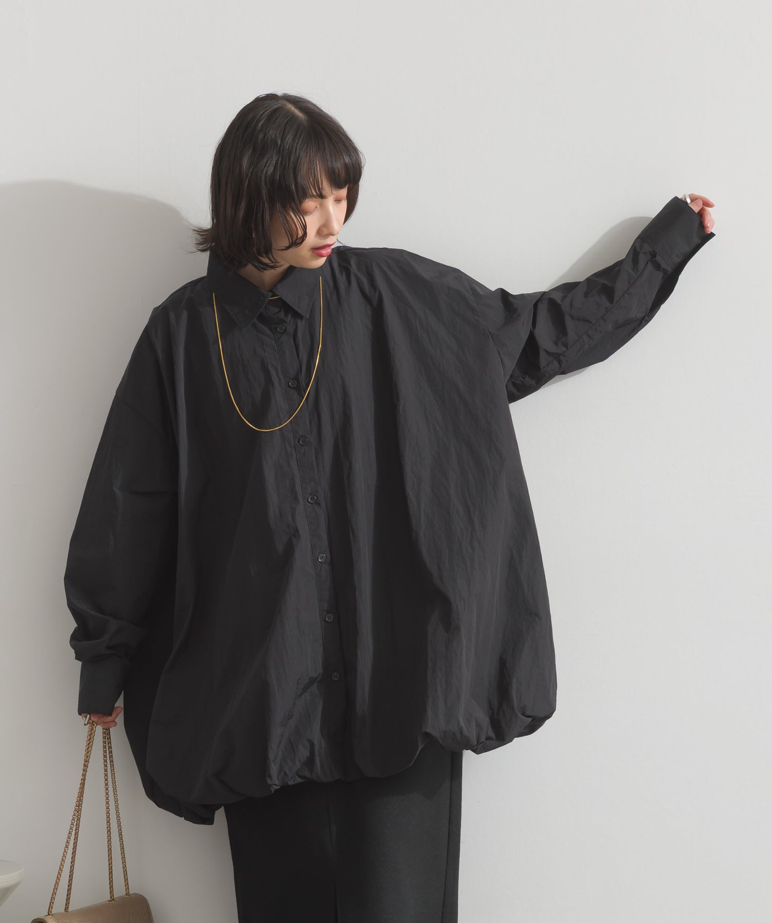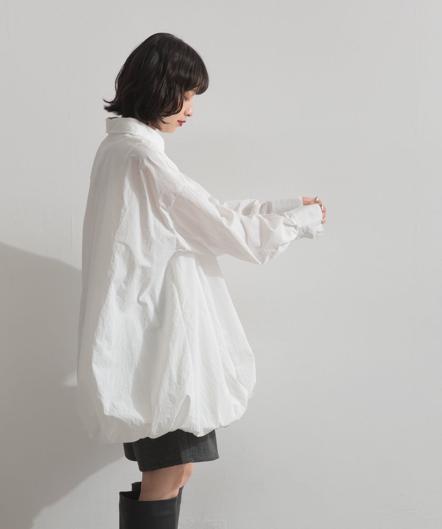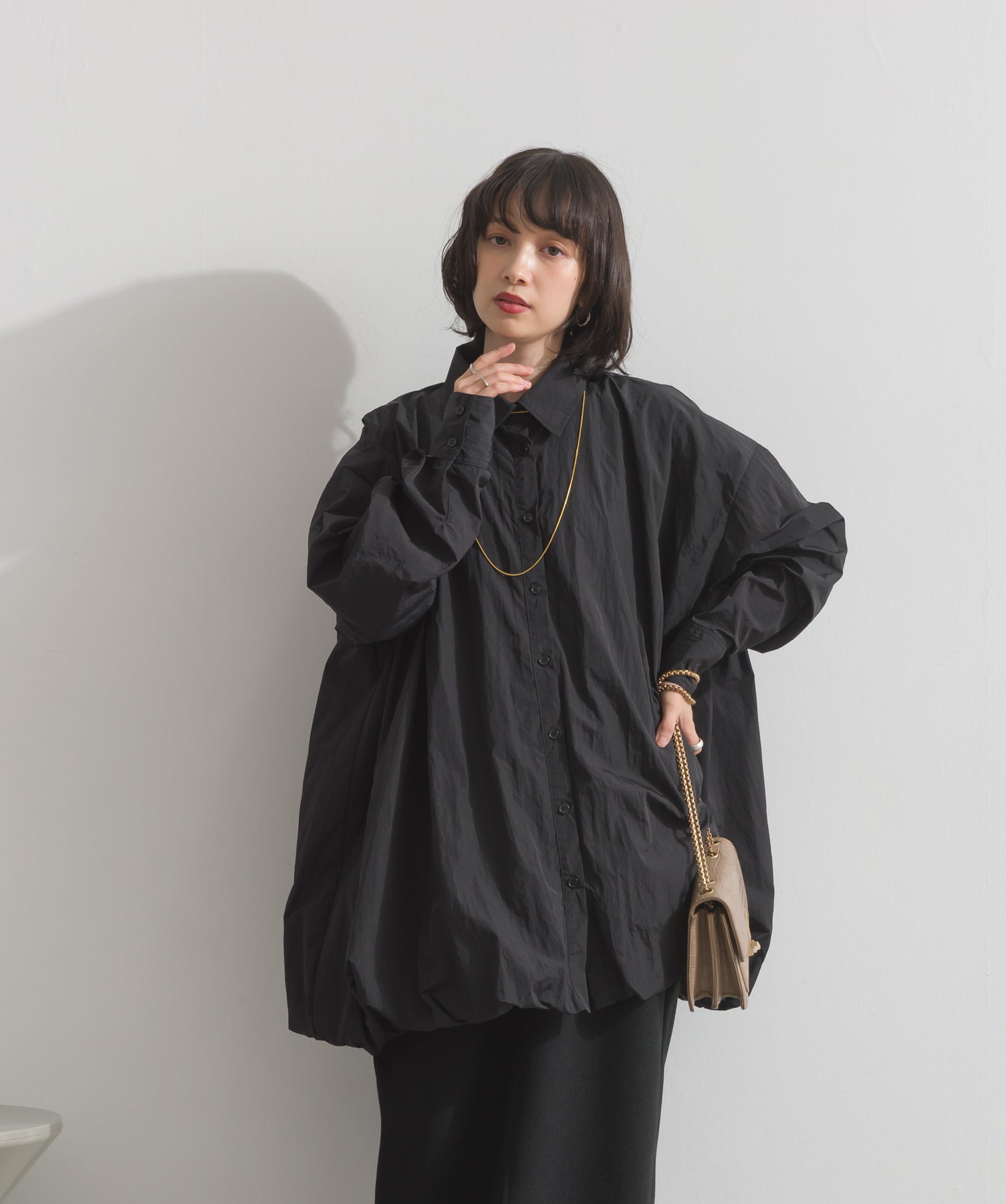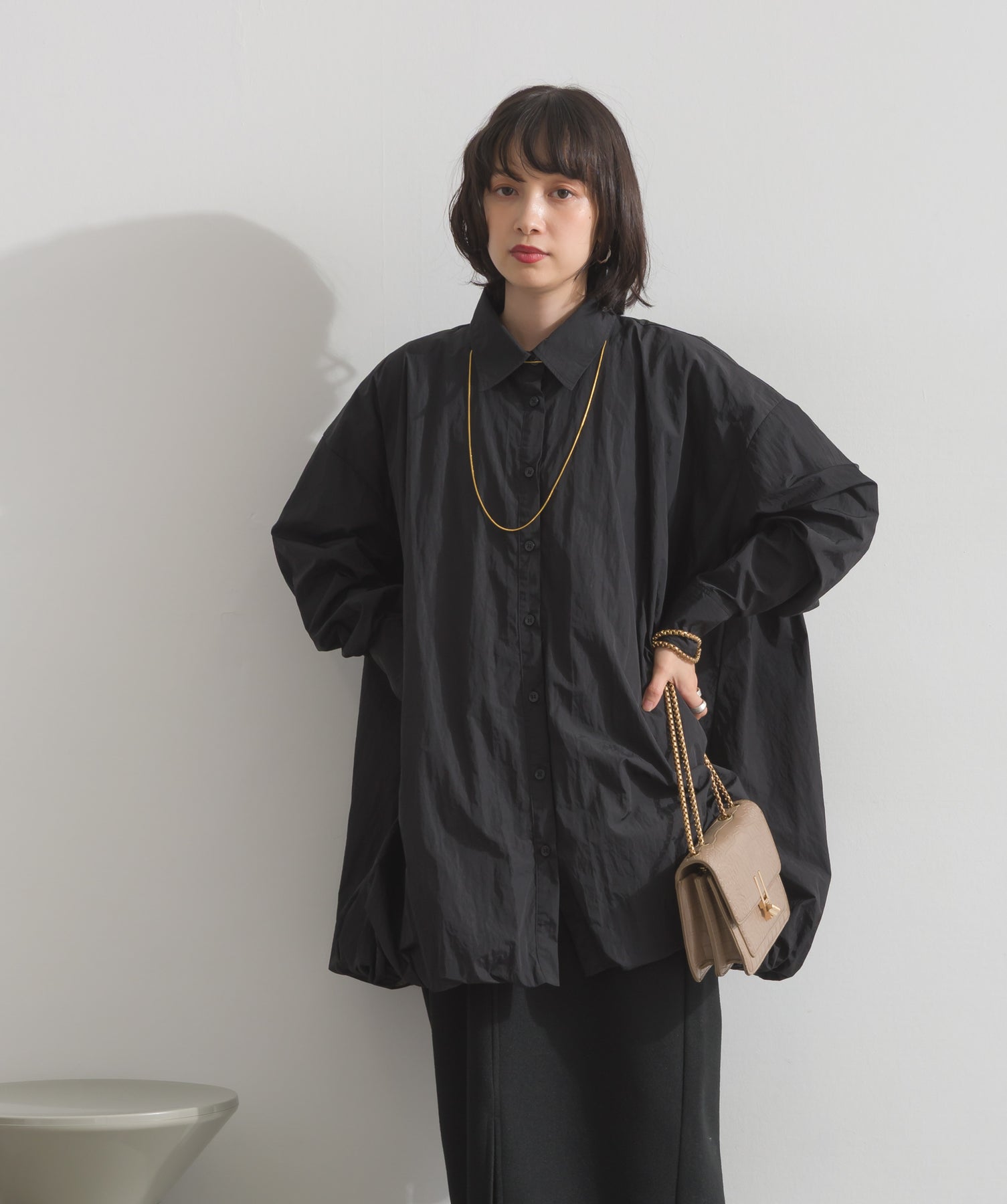大胆なフォルムで差をつける。シンプル×立体感が冴えるバルーンシャツ。-material-軽やかでハリのあるナイロンタフタ素材を使用。ほのかな光沢感が上品さをプラスし、さらっと羽織るだけでシーズンムードを高めてくれる質感です。-design-裾に向かって膨らむバルーンシルエットが個性を引き立てる一枚。前後差のある丈感とオーバーサイズデザインで、こなれた抜け感を演出します。比翼仕立てのフロントが洗練された印象を与え、モードにもカジュアルにも振れる万能アイテム。デニムやタイトスカートとの相性も抜群で、幅広いスタイリングが楽しめます。