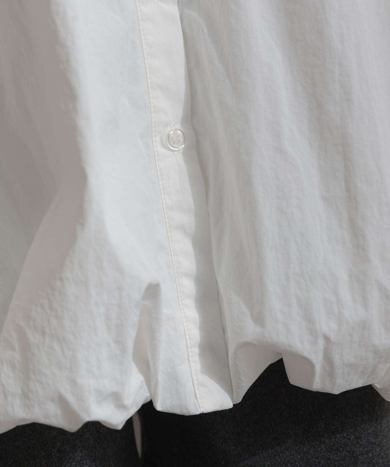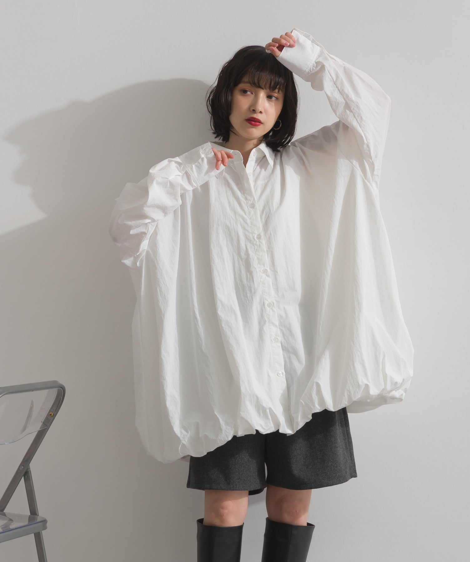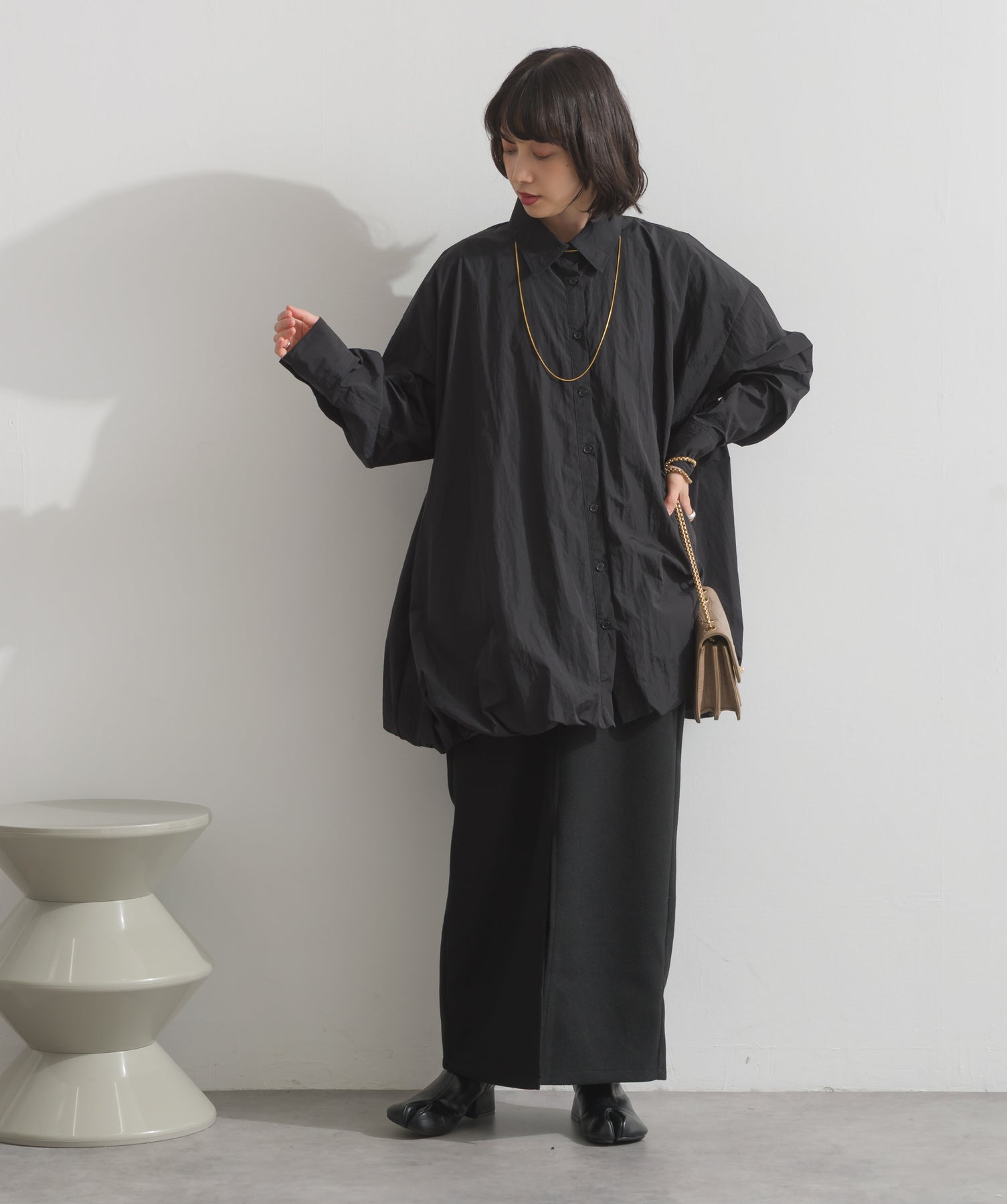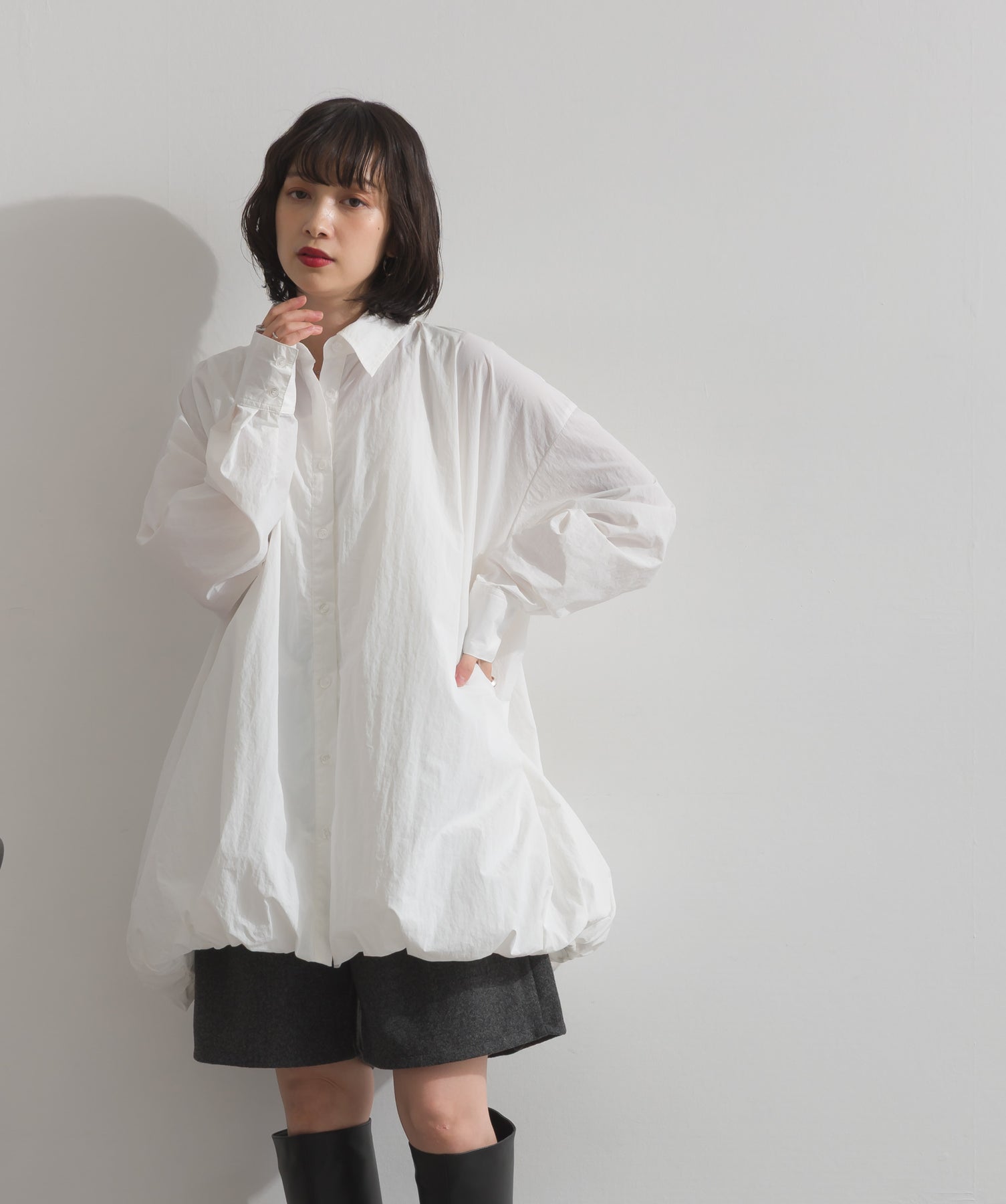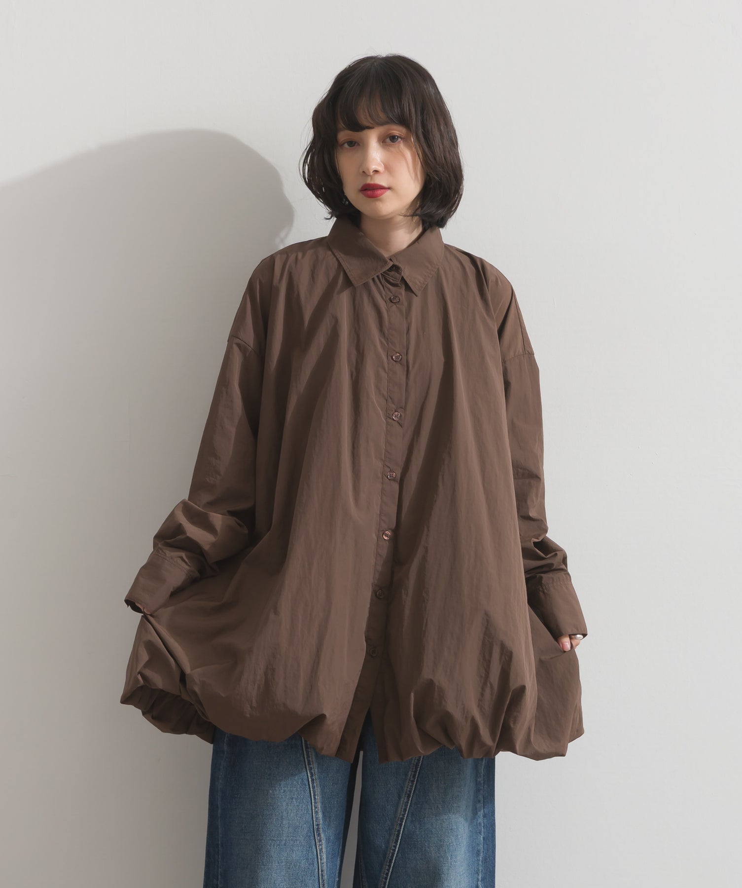 大胆なフォルムで差をつける。シンプル×立体感が冴えるバルーンシャツ。-material-軽やかでハリのあるナイロンタフタ素材を使用。ほのかな光沢感が上品さをプラスし、さらっと羽織るだけでシーズンムードを高めてくれる質感です。-design-裾に向かって膨らむバルーンシルエットが個性を引き立てる一枚。前後差のある丈感とオーバーサイズデザインで、こなれた抜け感を演出します。比翼仕立てのフロントが洗練された印象を与え、モードにもカジュアルにも振れる万能アイテム。デニムやタイトスカートとの相性も抜群で、幅広いスタイリングが楽しめます。