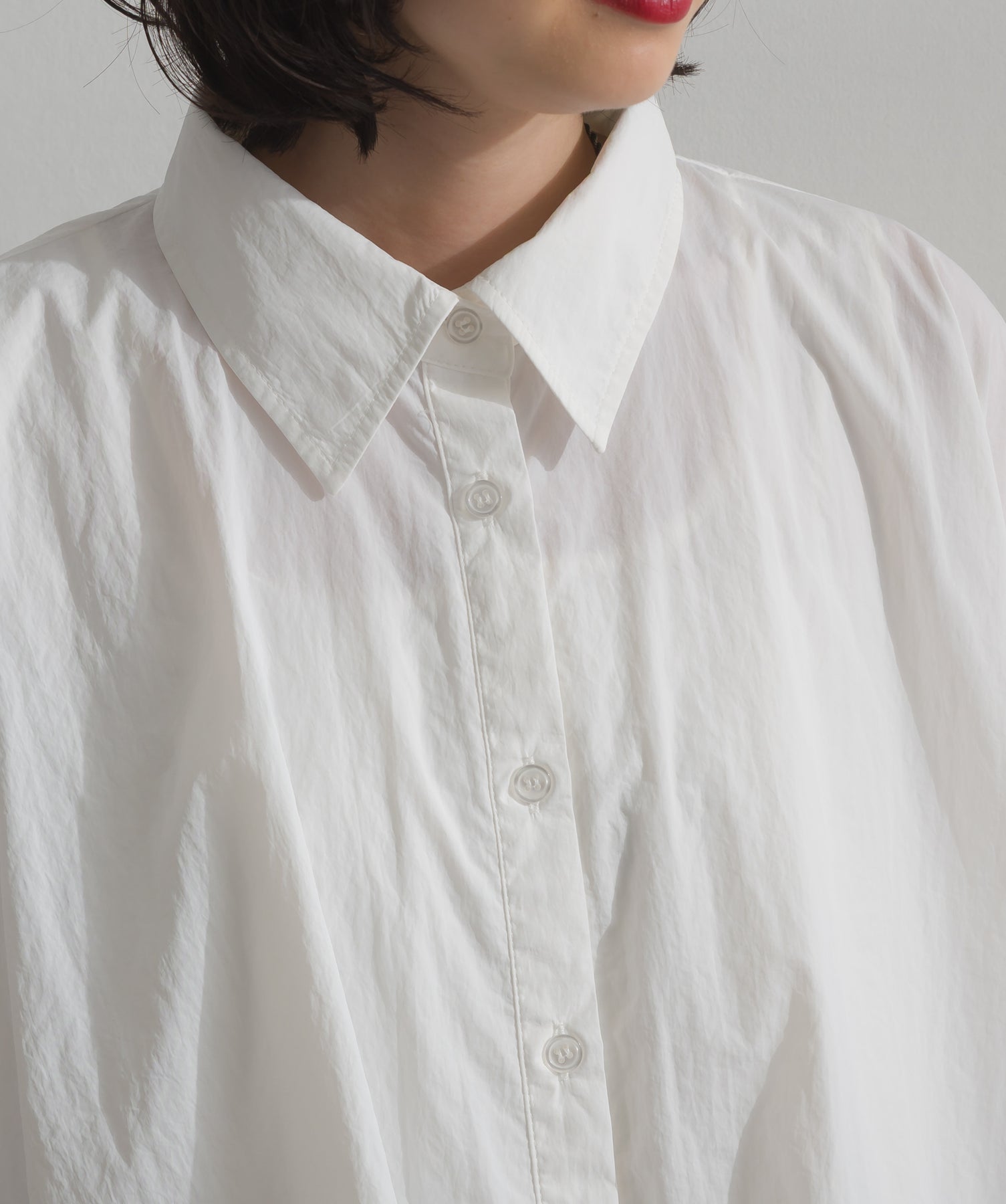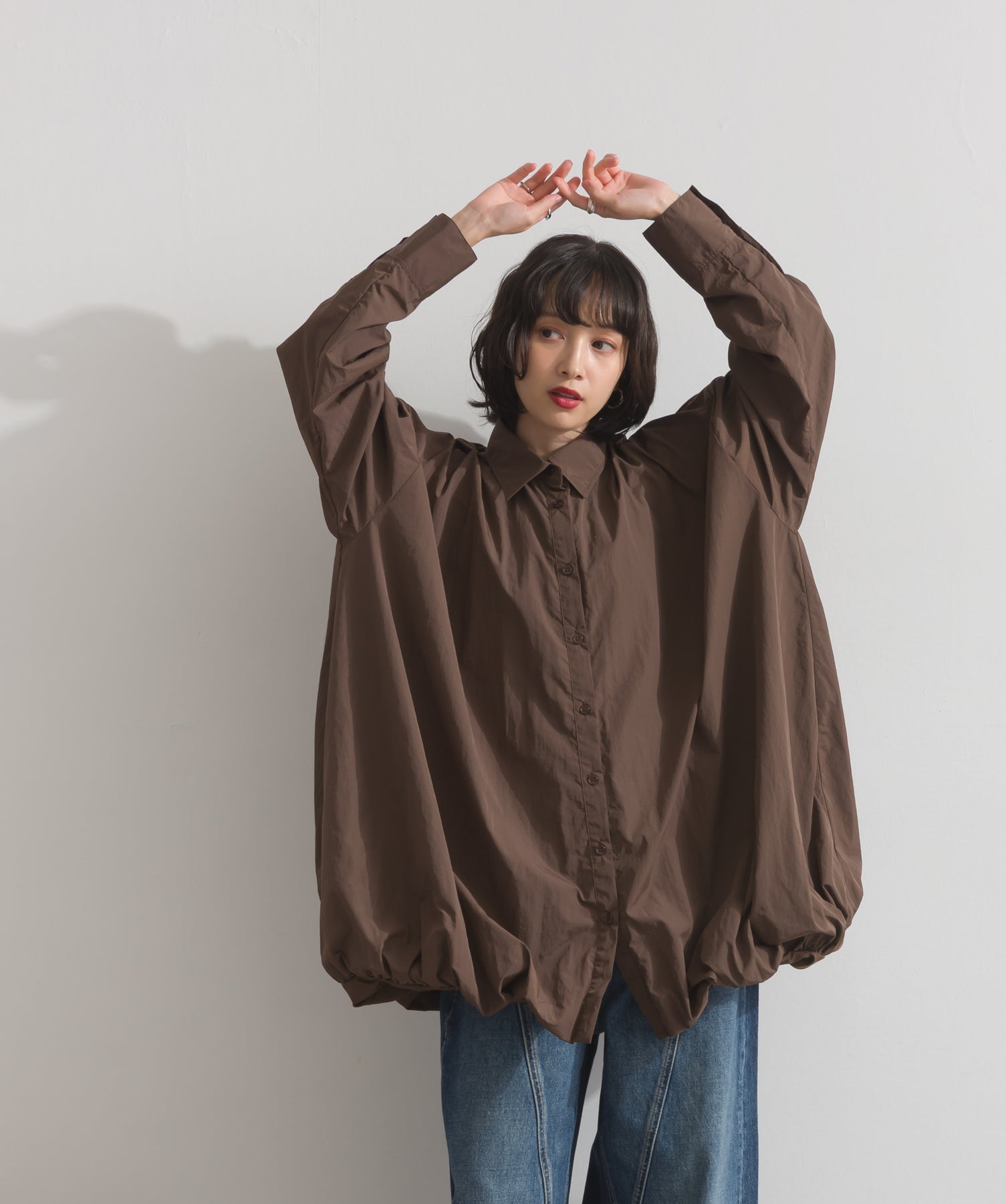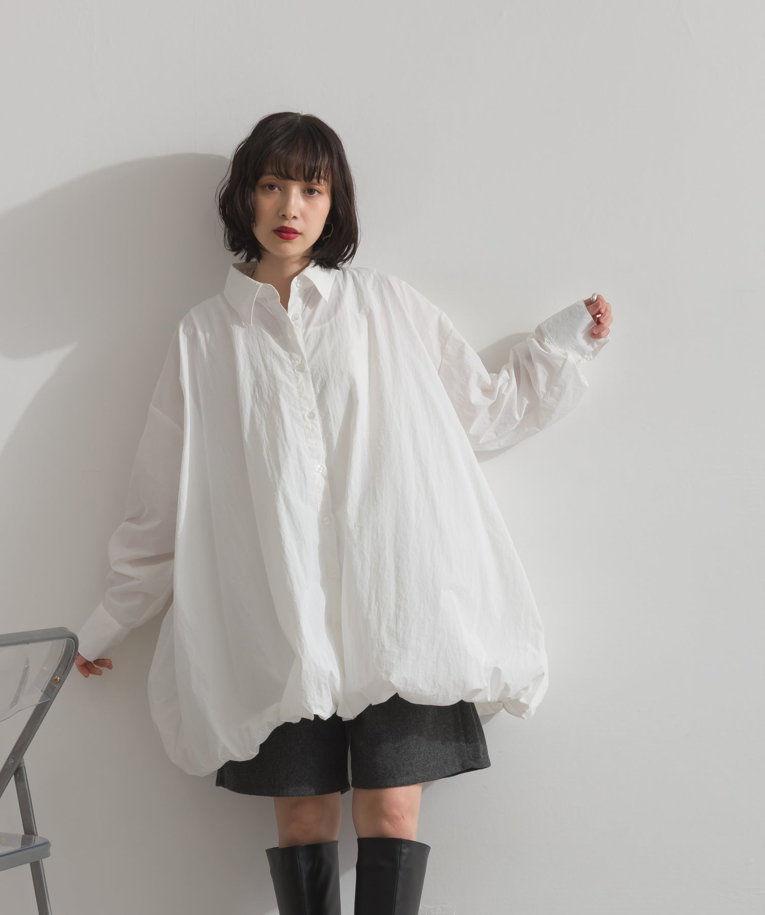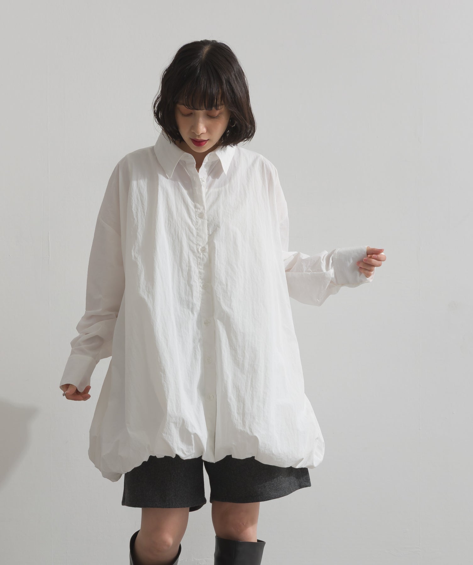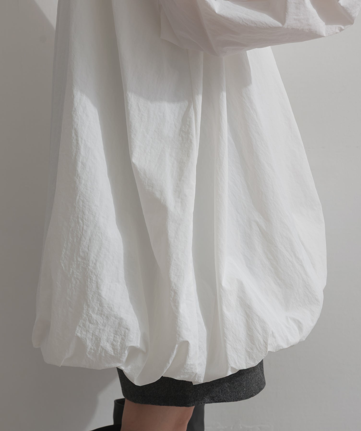 大胆なフォルムで差をつける。シンプル×立体感が冴えるバルーンシャツ。-material-軽やかでハリのあるナイロンタフタ素材を使用。ほのかな光沢感が上品さをプラスし、さらっと羽織るだけでシーズンムードを高めてくれる質感です。-design-裾に向かって膨らむバルーンシルエットが個性を引き立てる一枚。前後差のある丈感とオーバーサイズデザインで、こなれた抜け感を演出します。比翼仕立てのフロントが洗練された印象を与え、モードにもカジュアルにも振れる万能アイテム。デニムやタイトスカートとの相性も抜群で、幅広いスタイリングが楽しめます。