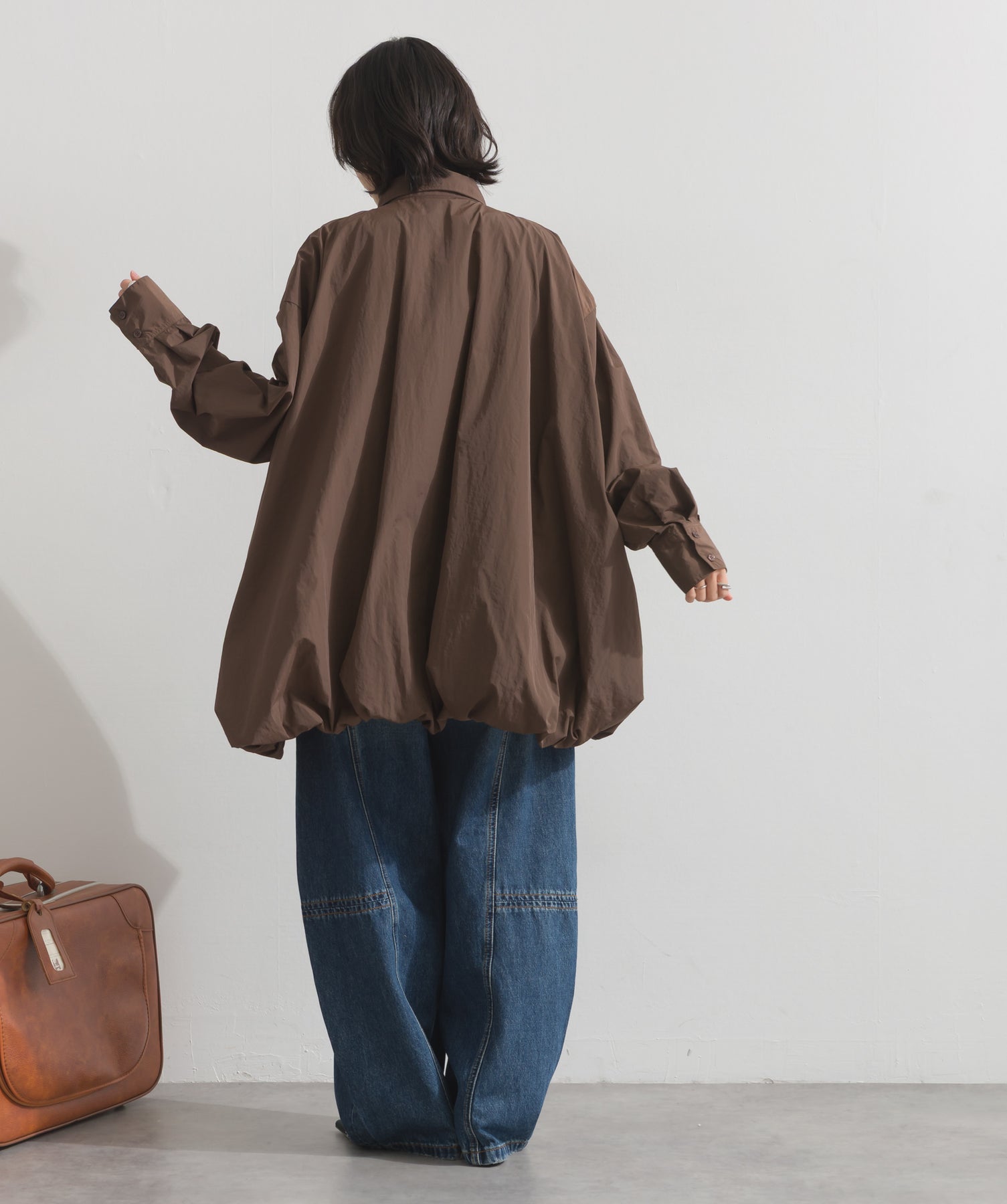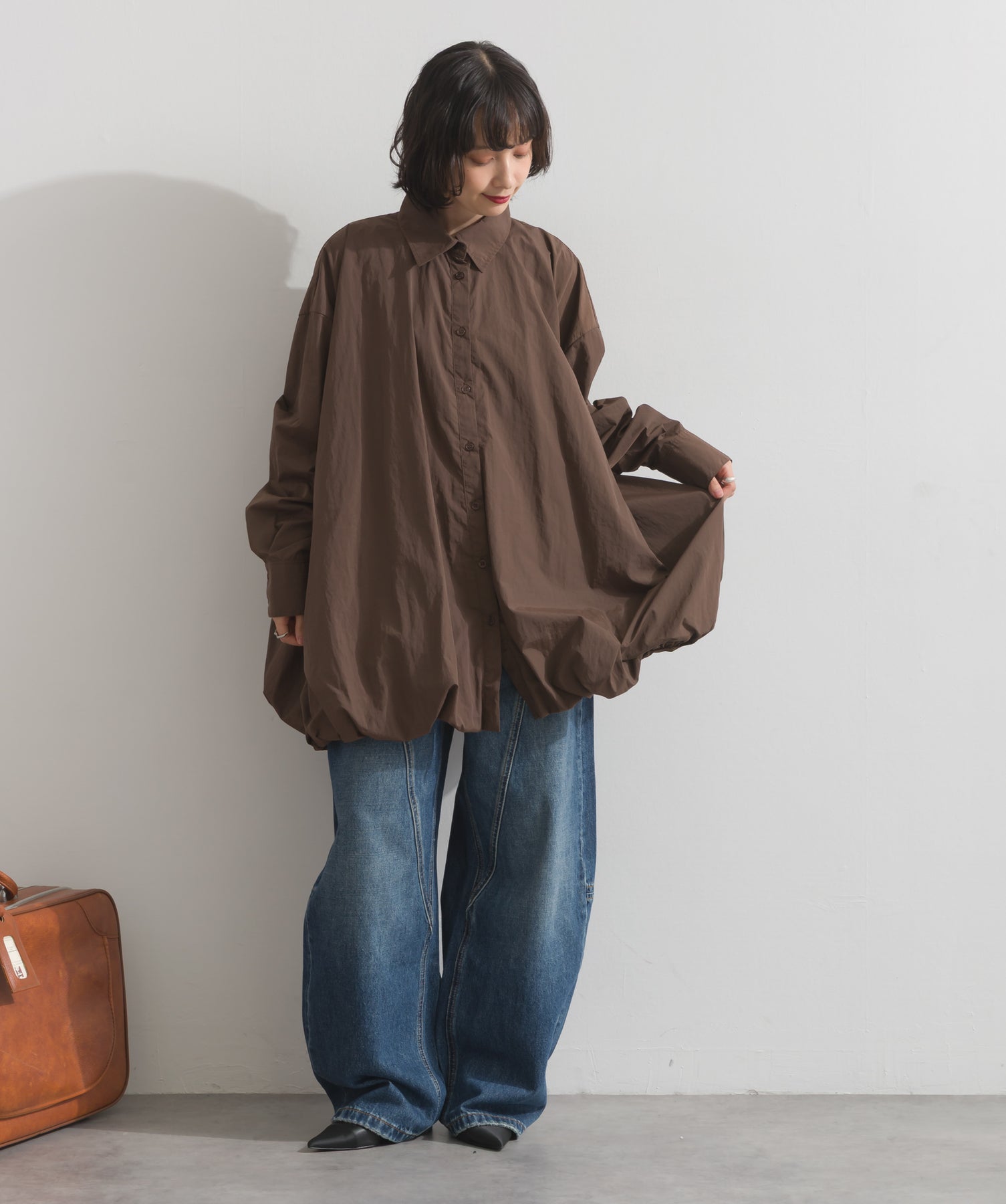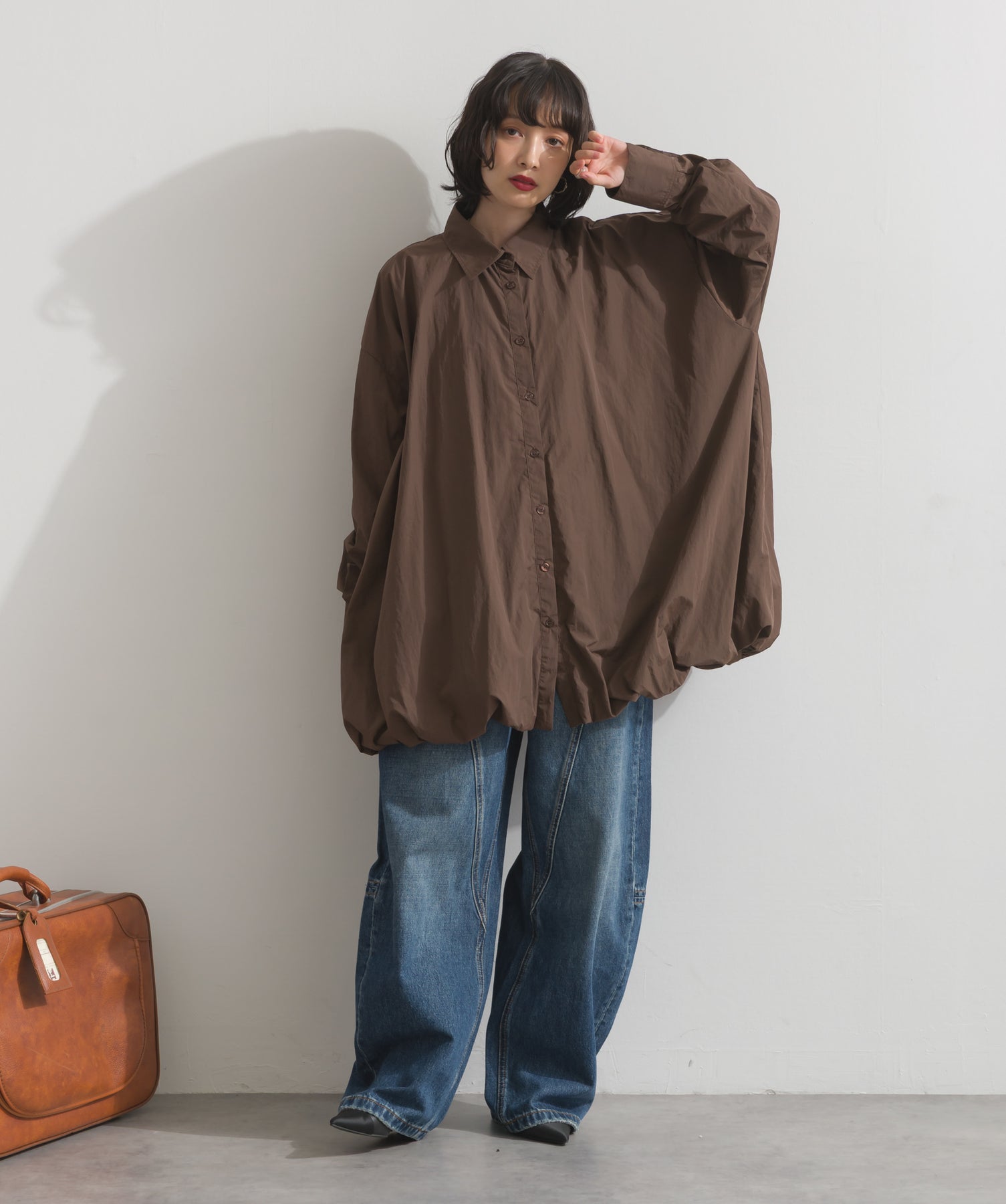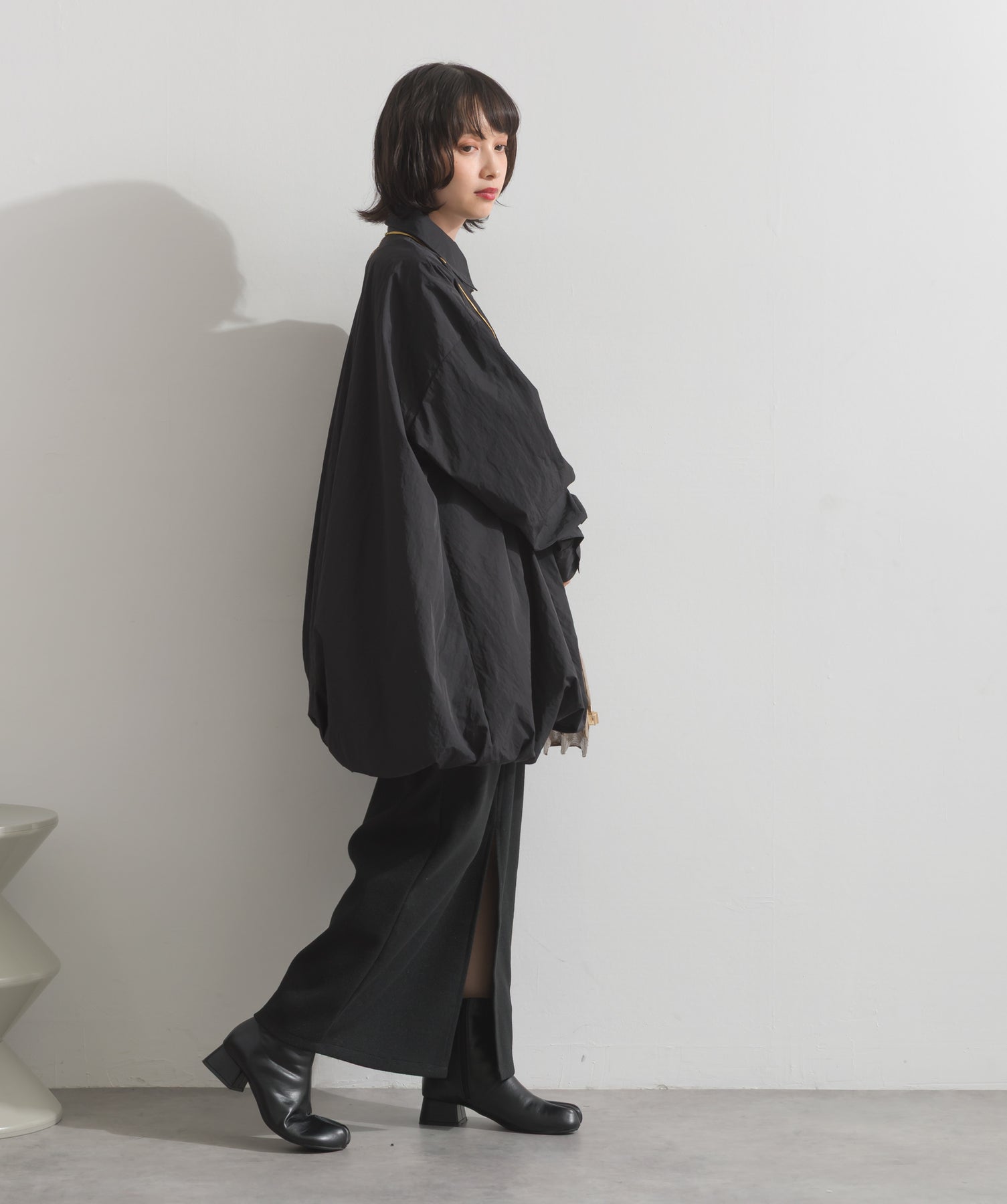 大胆なフォルムで差をつける。シンプル×立体感が冴えるバルーンシャツ。-material-軽やかでハリのあるナイロンタフタ素材を使用。ほのかな光沢感が上品さをプラスし、さらっと羽織るだけでシーズンムードを高めてくれる質感です。-design-裾に向かって膨らむバルーンシルエットが個性を引き立てる一枚。前後差のある丈感とオーバーサイズデザインで、こなれた抜け感を演出します。比翼仕立てのフロントが洗練された印象を与え、モードにもカジュアルにも振れる万能アイテム。デニムやタイトスカートとの相性も抜群で、幅広いスタイリングが楽しめます。