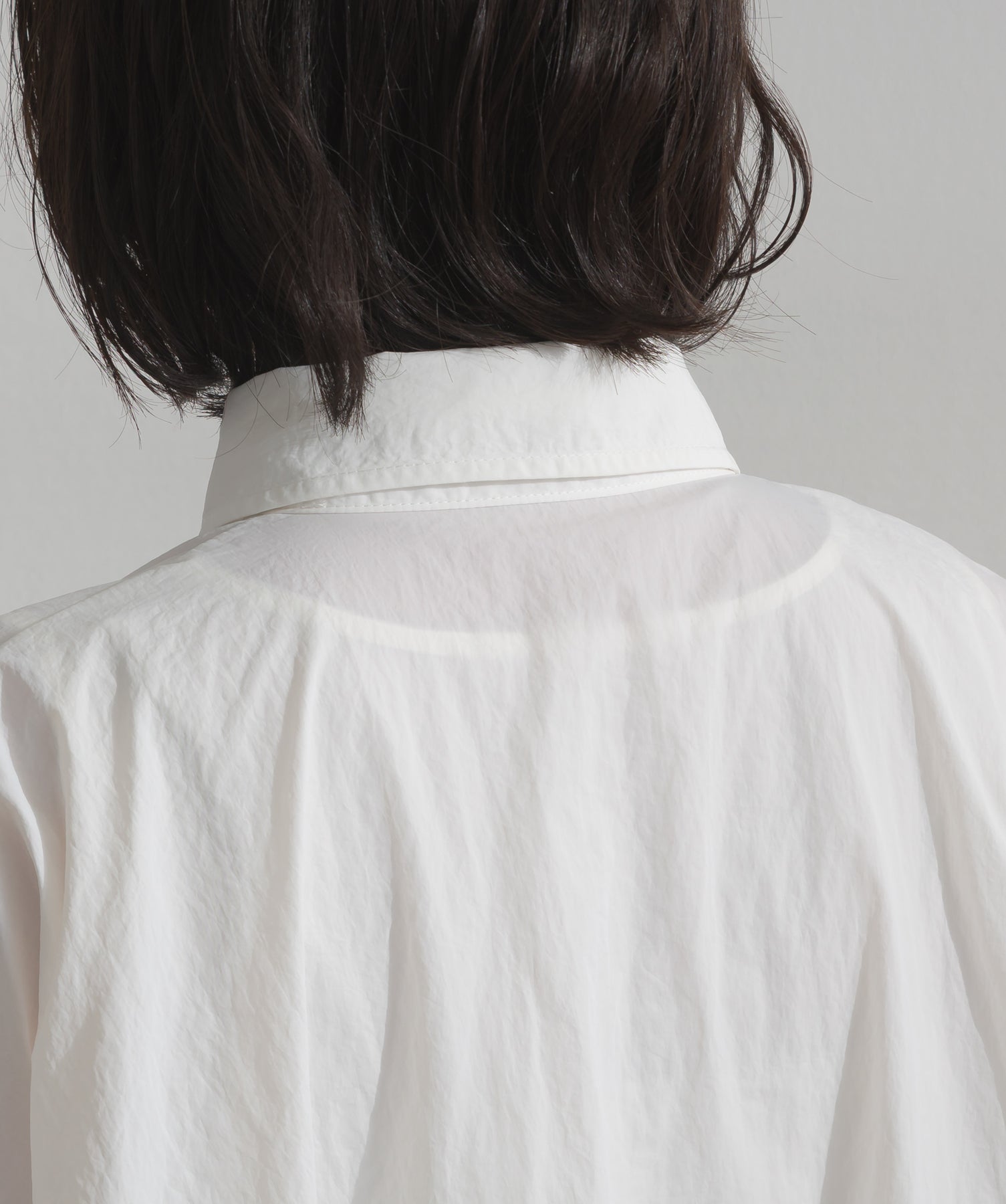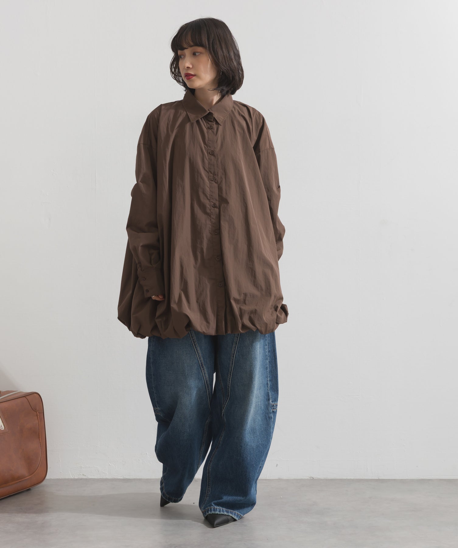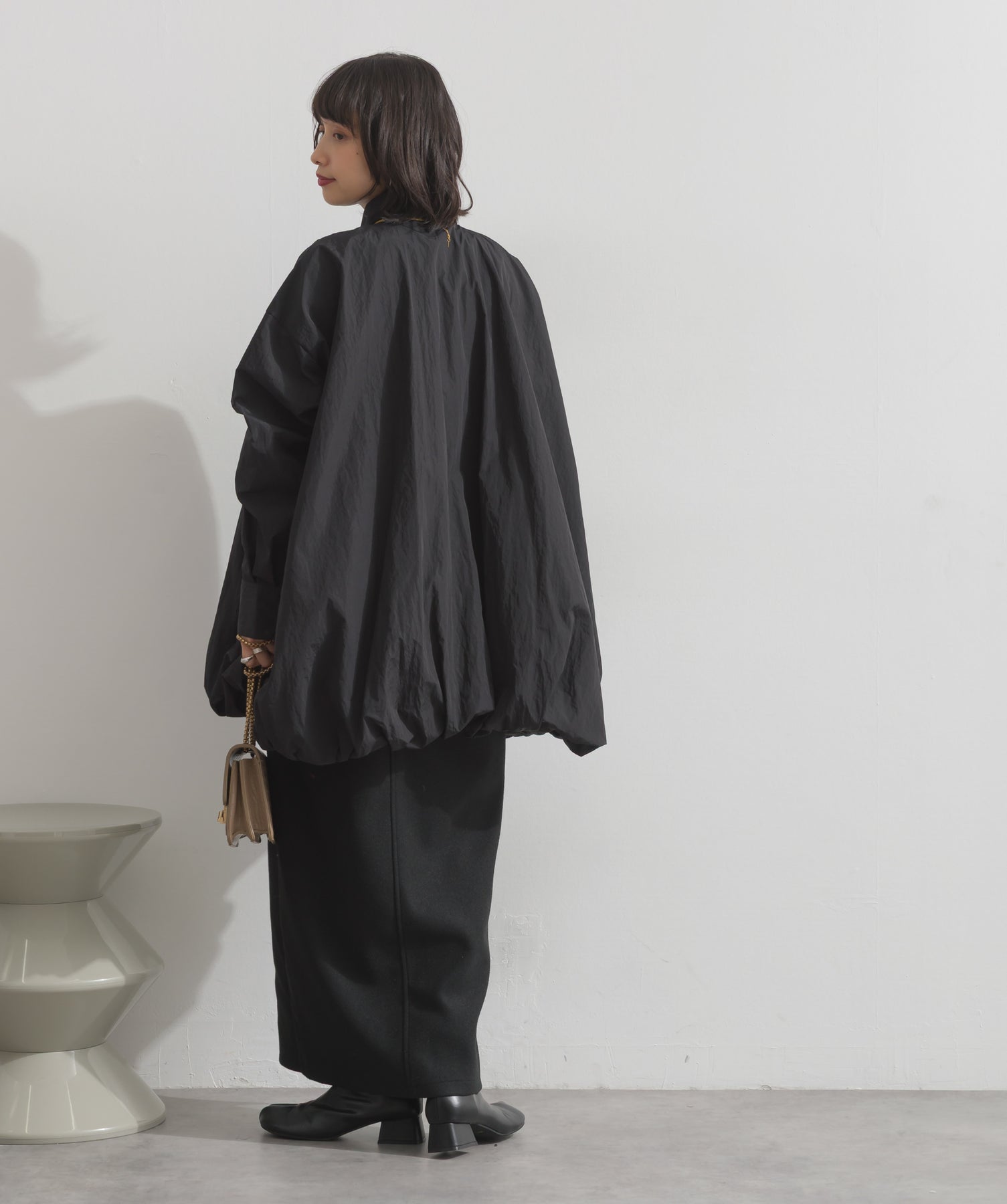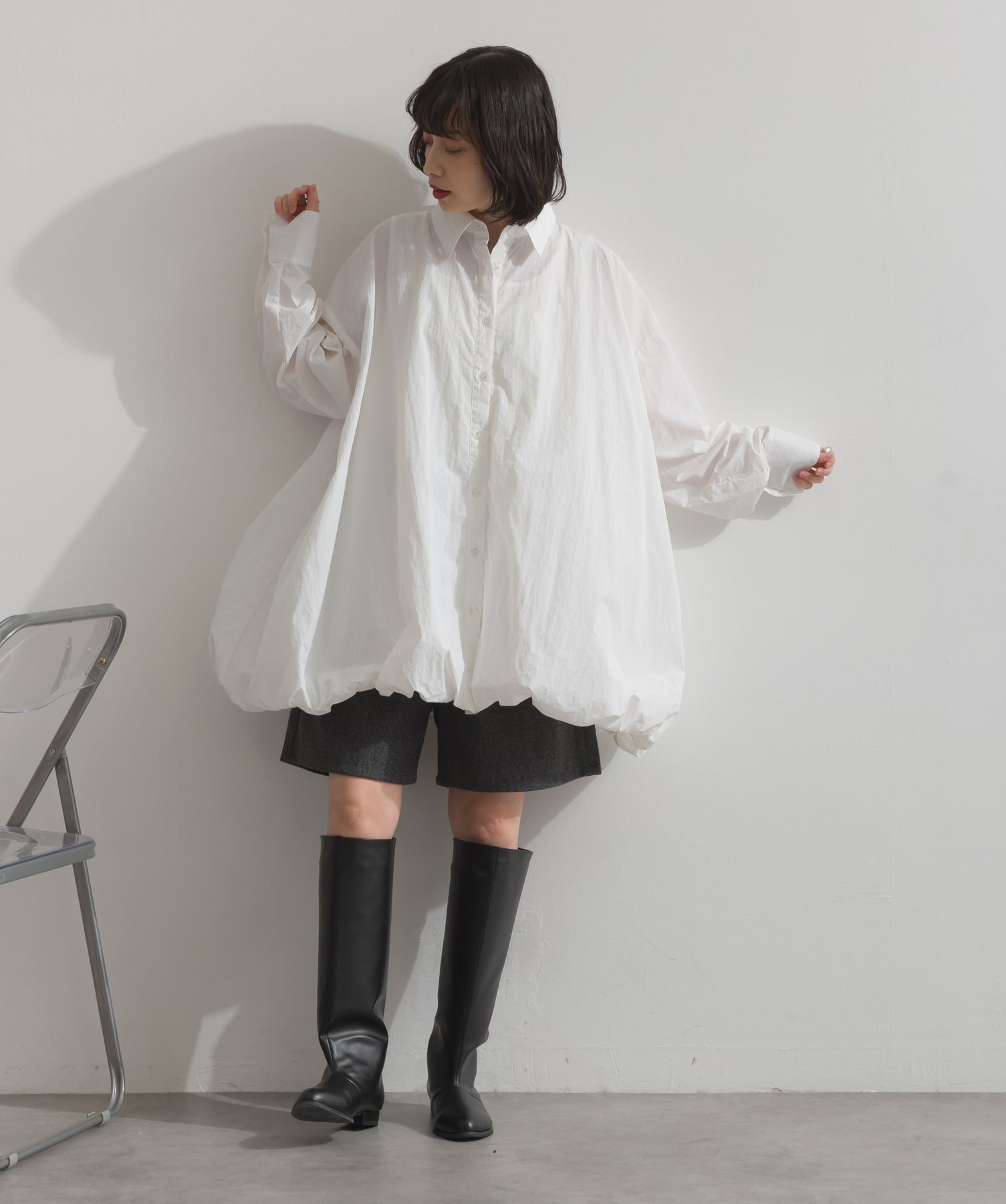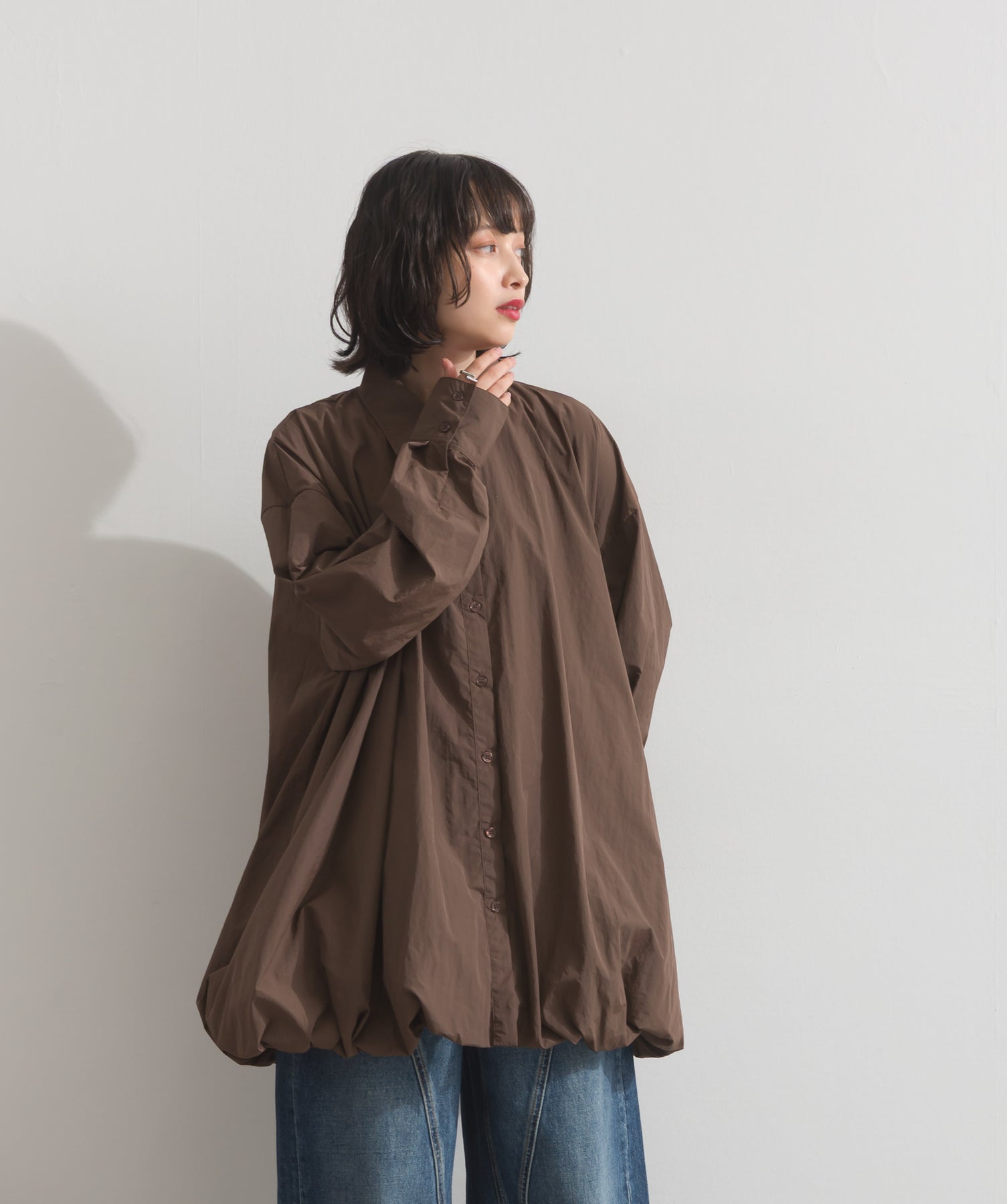 大胆なフォルムで差をつける。シンプル×立体感が冴えるバルーンシャツ。-material-軽やかでハリのあるナイロンタフタ素材を使用。ほのかな光沢感が上品さをプラスし、さらっと羽織るだけでシーズンムードを高めてくれる質感です。-design-裾に向かって膨らむバルーンシルエットが個性を引き立てる一枚。前後差のある丈感とオーバーサイズデザインで、こなれた抜け感を演出します。比翼仕立てのフロントが洗練された印象を与え、モードにもカジュアルにも振れる万能アイテム。デニムやタイトスカートとの相性も抜群で、幅広いスタイリングが楽しめます。