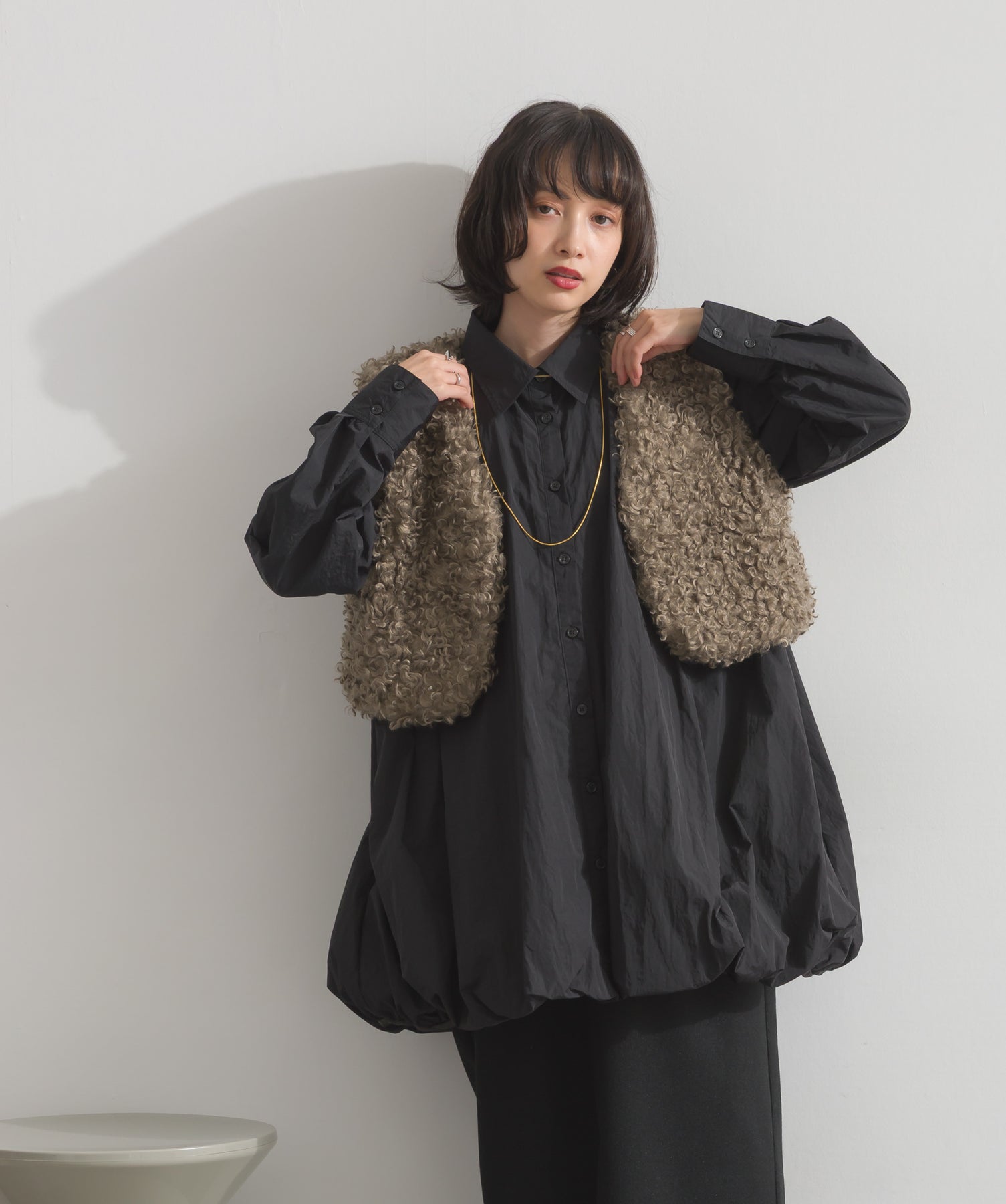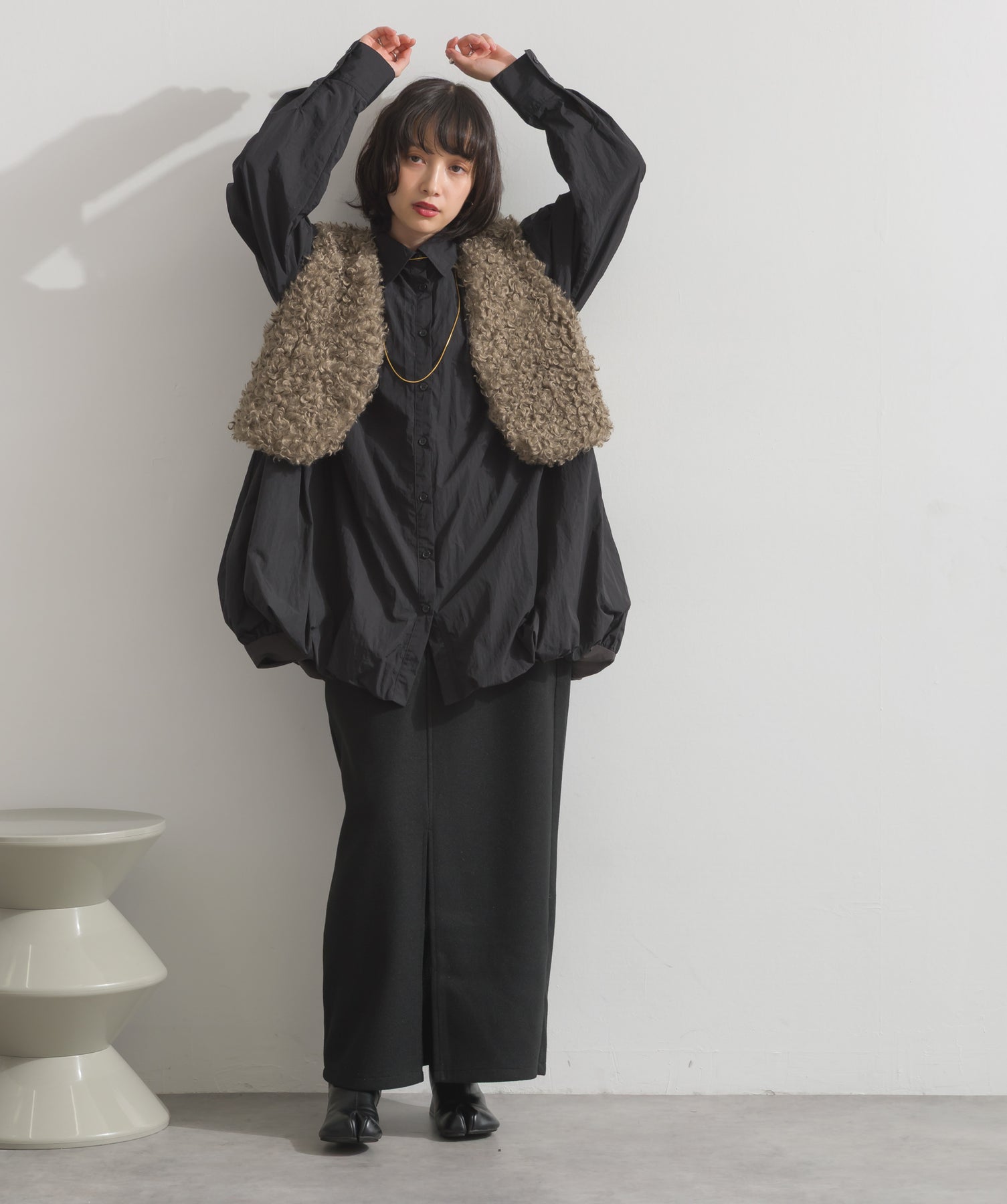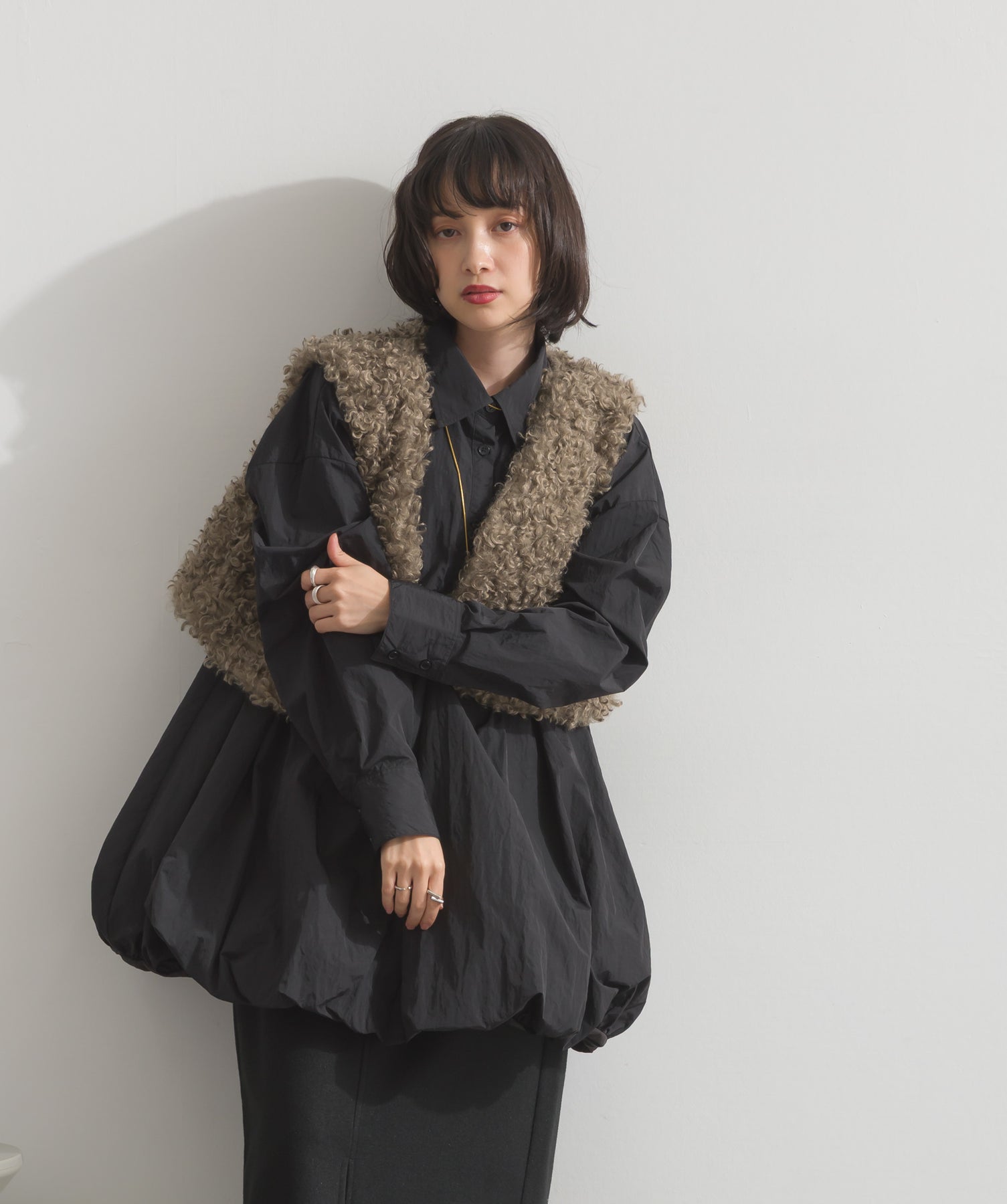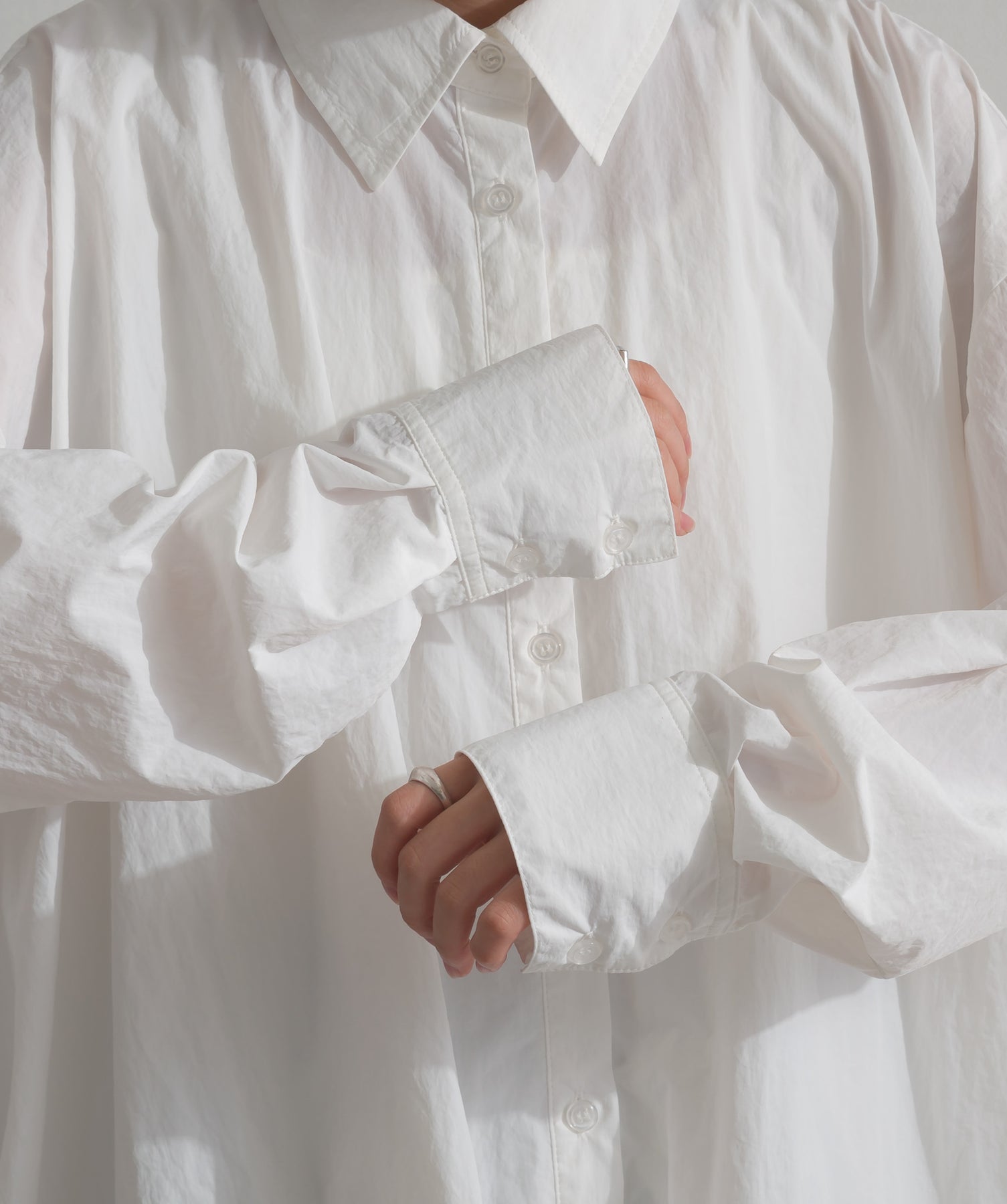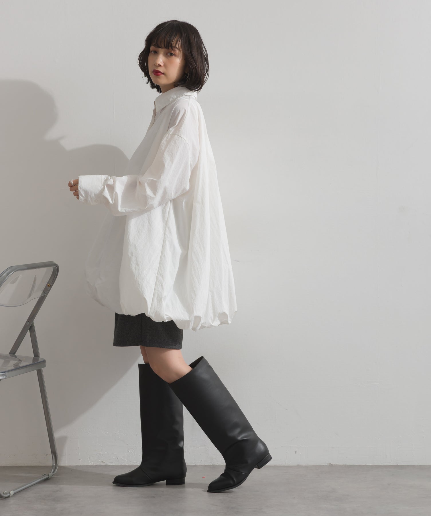 大胆なフォルムで差をつける。シンプル×立体感が冴えるバルーンシャツ。-material-軽やかでハリのあるナイロンタフタ素材を使用。ほのかな光沢感が上品さをプラスし、さらっと羽織るだけでシーズンムードを高めてくれる質感です。-design-裾に向かって膨らむバルーンシルエットが個性を引き立てる一枚。前後差のある丈感とオーバーサイズデザインで、こなれた抜け感を演出します。比翼仕立てのフロントが洗練された印象を与え、モードにもカジュアルにも振れる万能アイテム。デニムやタイトスカートとの相性も抜群で、幅広いスタイリングが楽しめます。