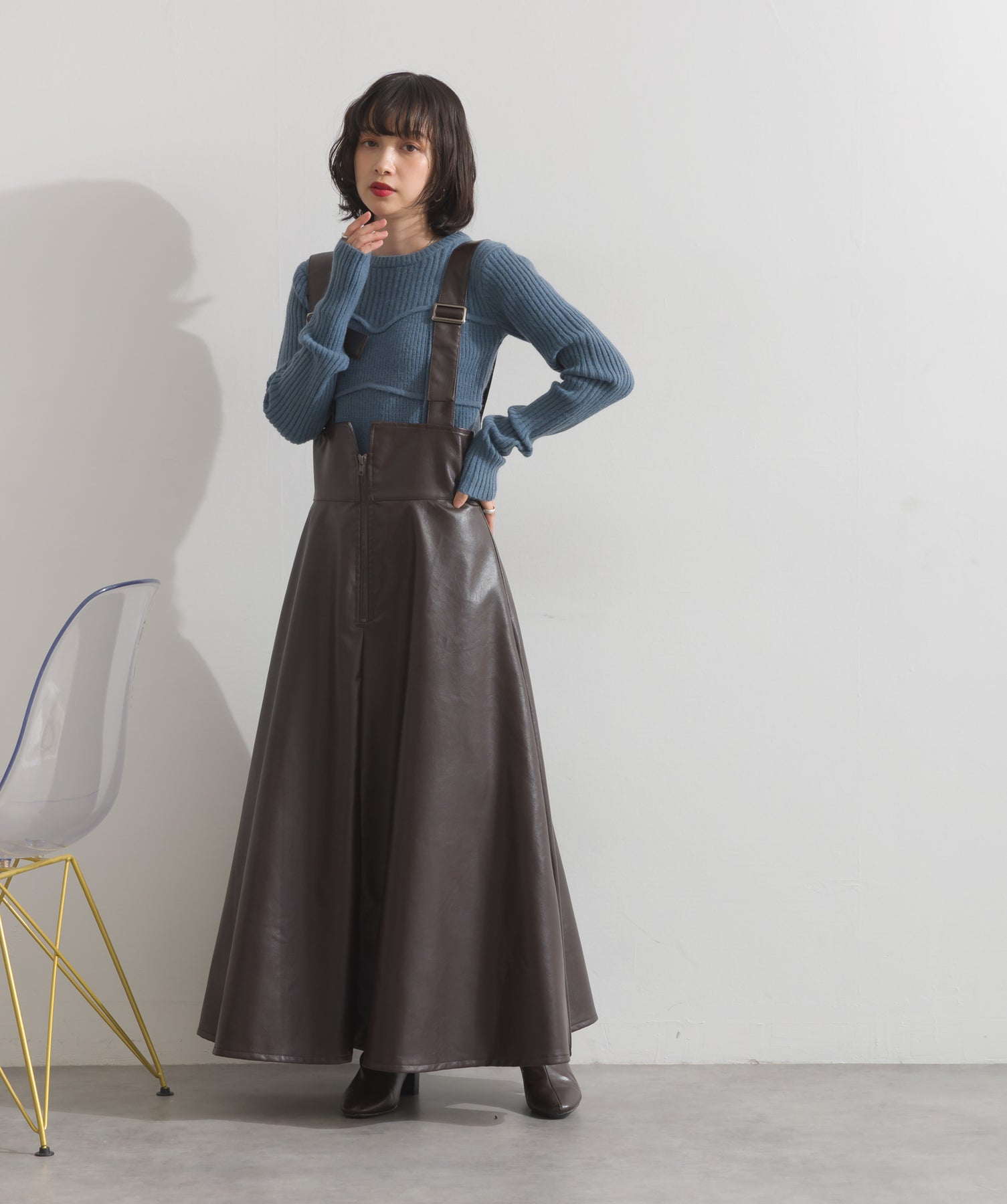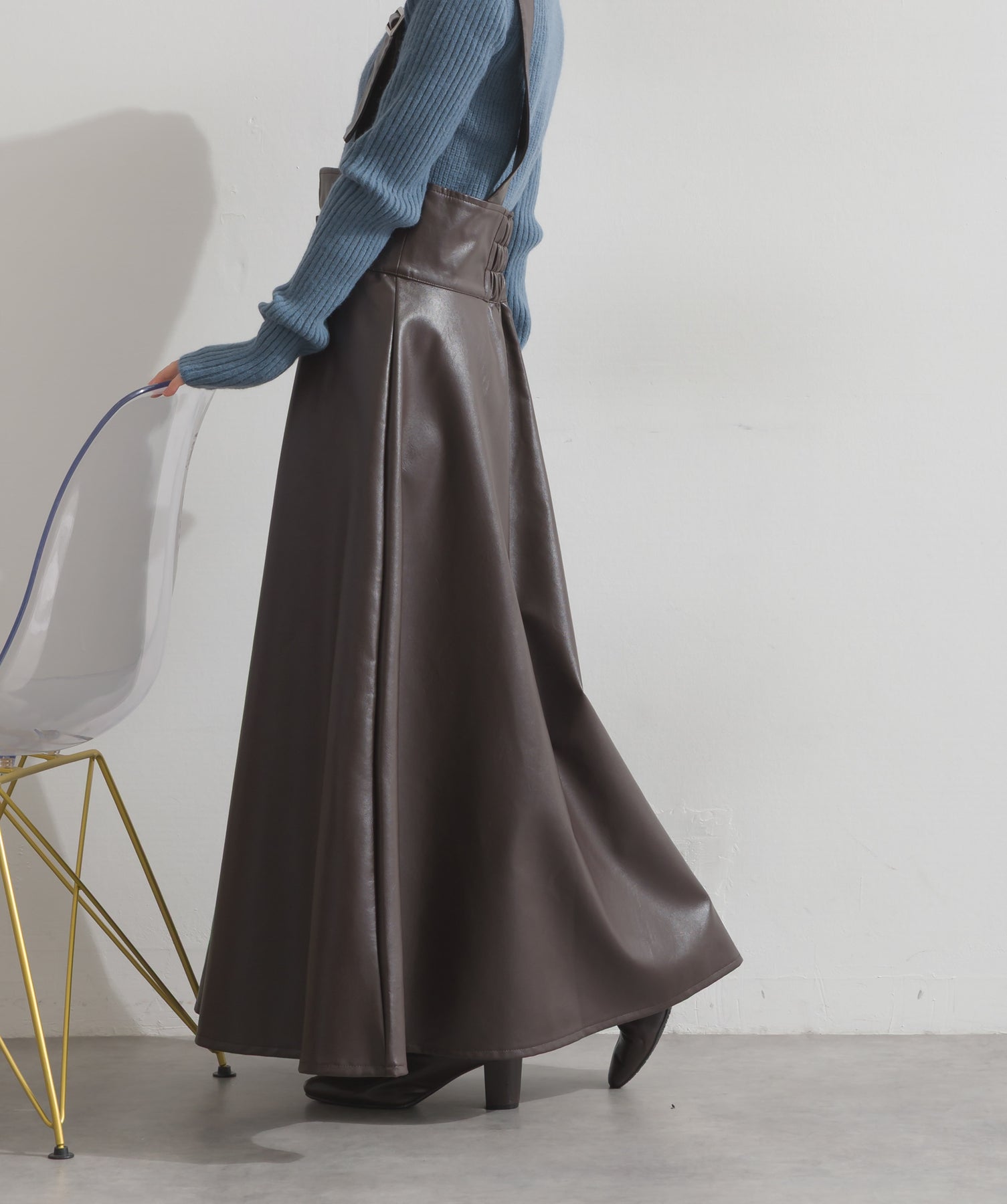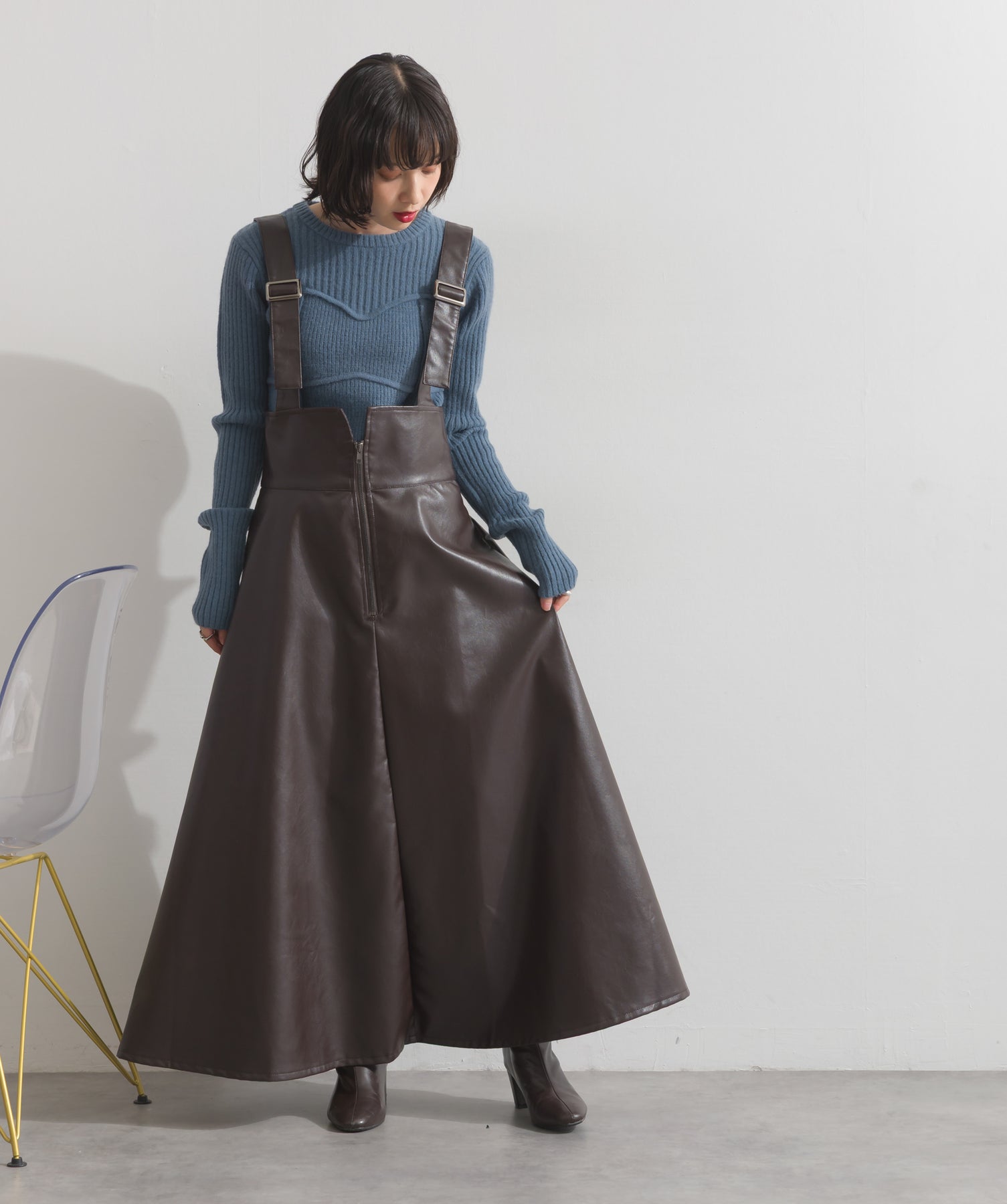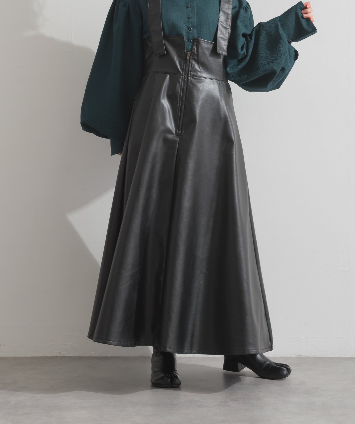 存在感で魅せる。エッジィにキマるフェイクレザージャンスカ。-material-リアルレザー見えする上質なフェイクレザー素材を使用。ほどよい厚みとハリがありつつも、柔らかく軽やかな着心地。オールシーズン活躍できる扱いやすさも魅力。-design-Aラインに広がる美シルエットが印象的なジップアップ仕様のジャンスカ。 アジャスター付きの肩紐で着丈調整が可能。ハードすぎないフェミニンなラインが、大人カジュアルにもモードにもフィット。インナー次第でロングシーズン着まわせる、スタイリング自在な1着です。