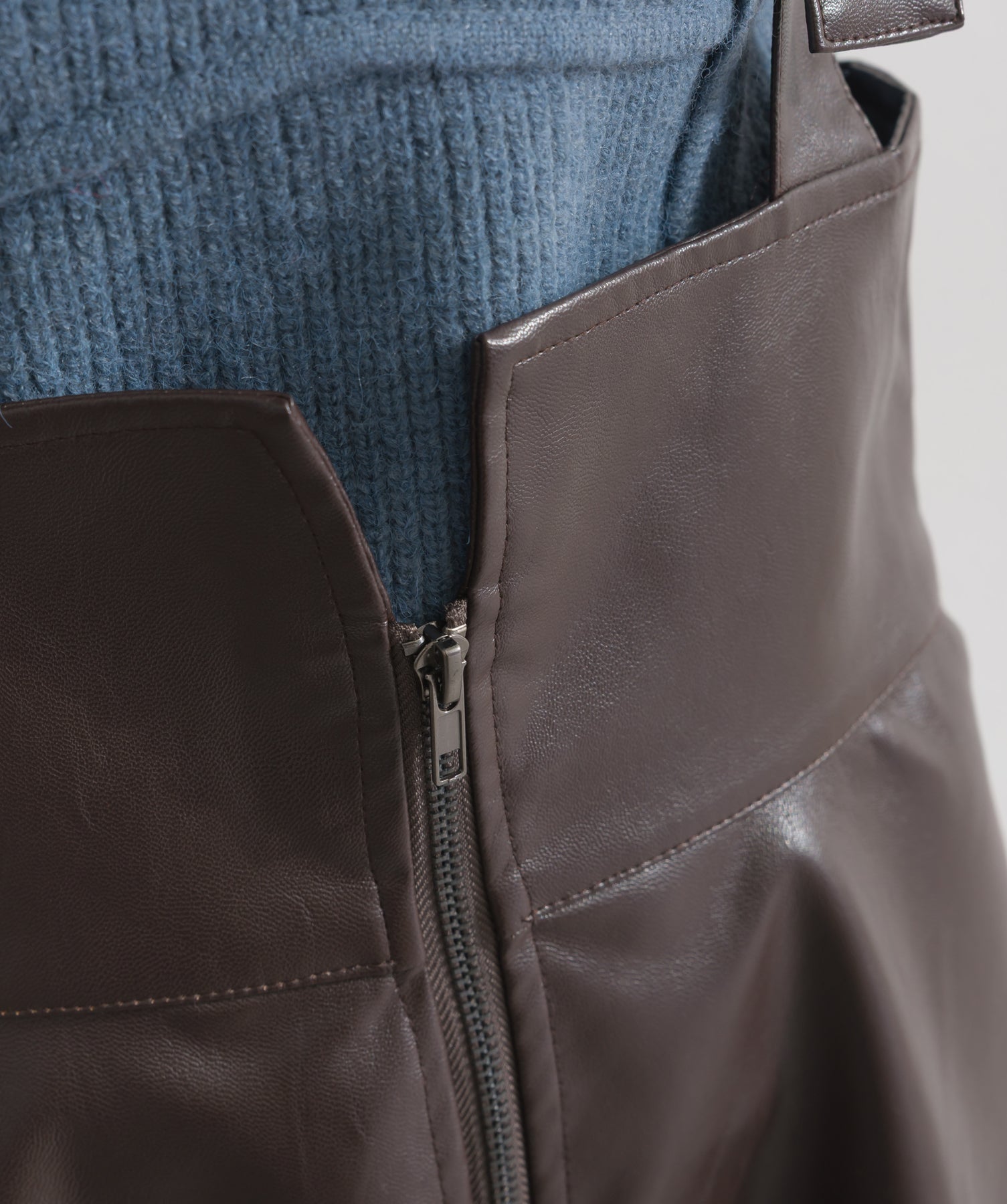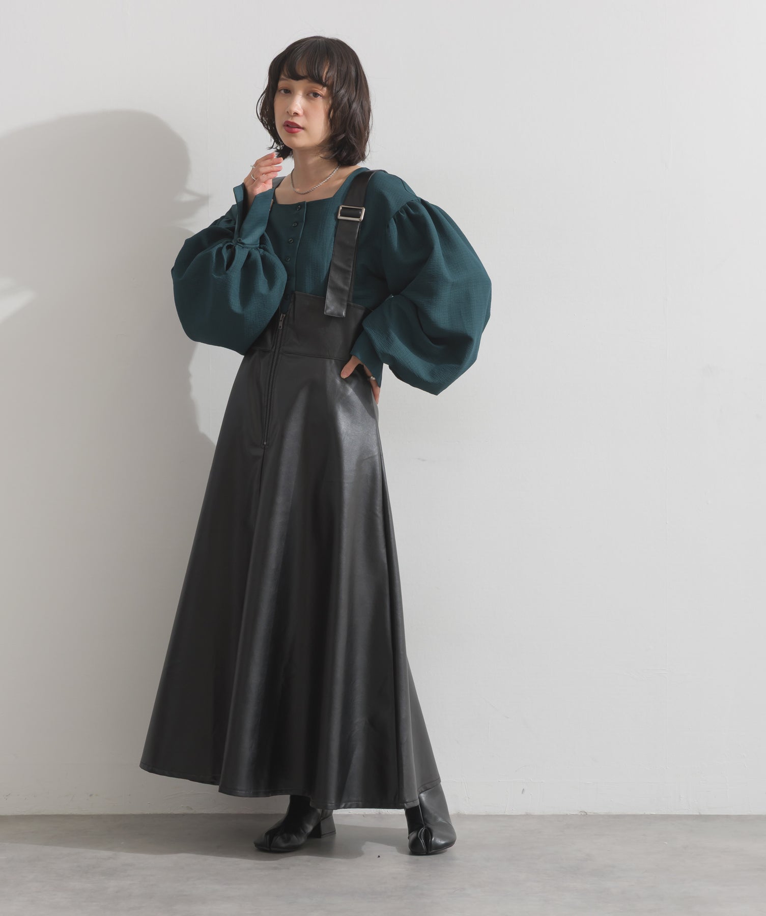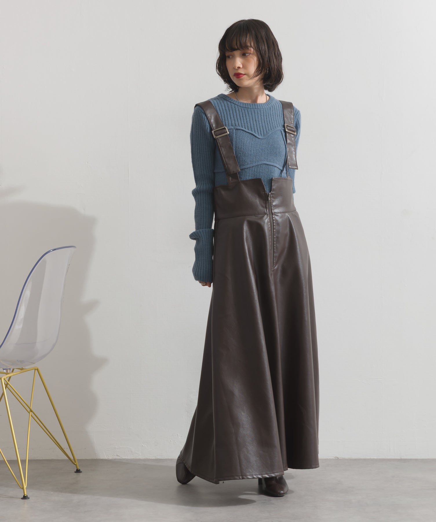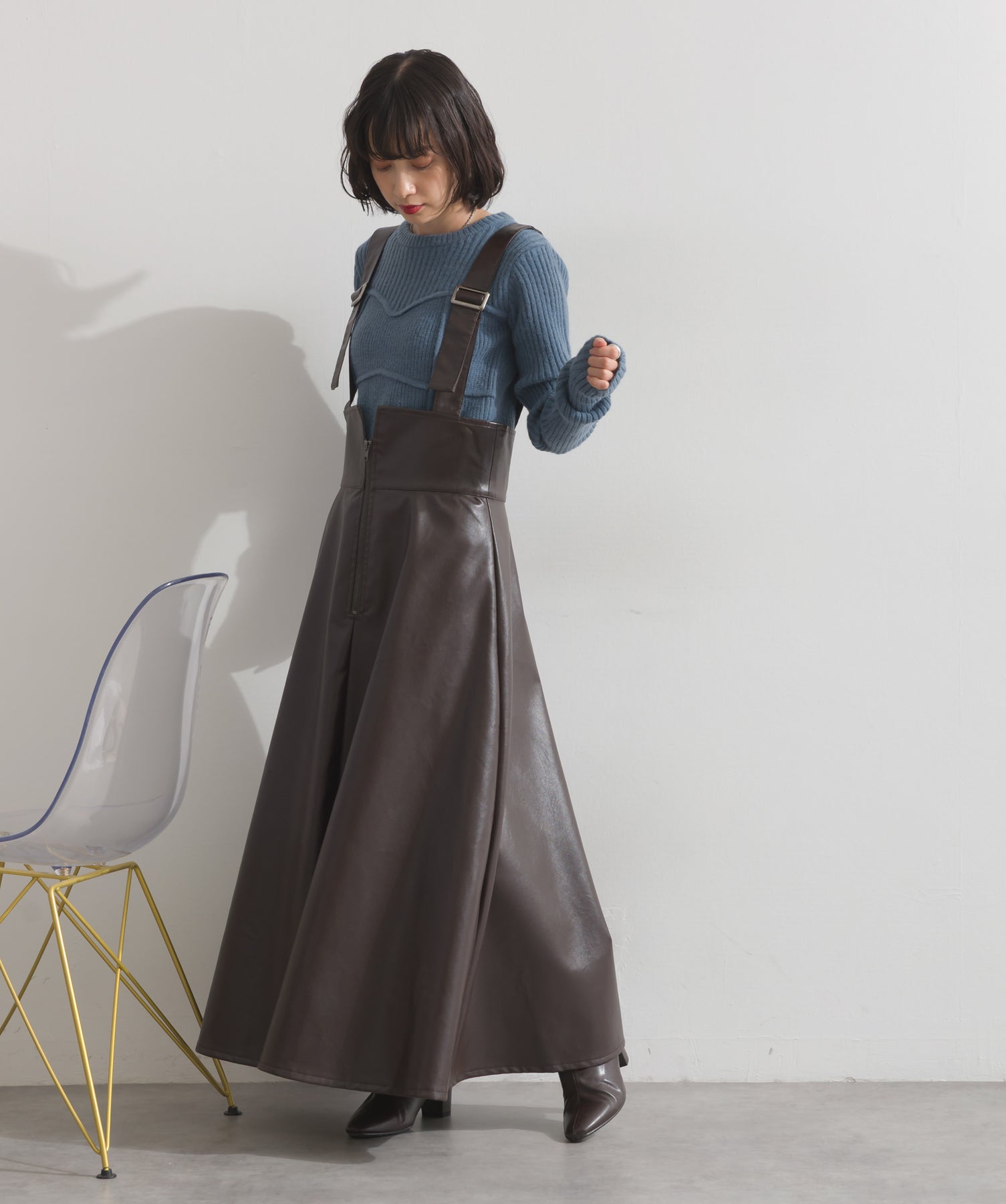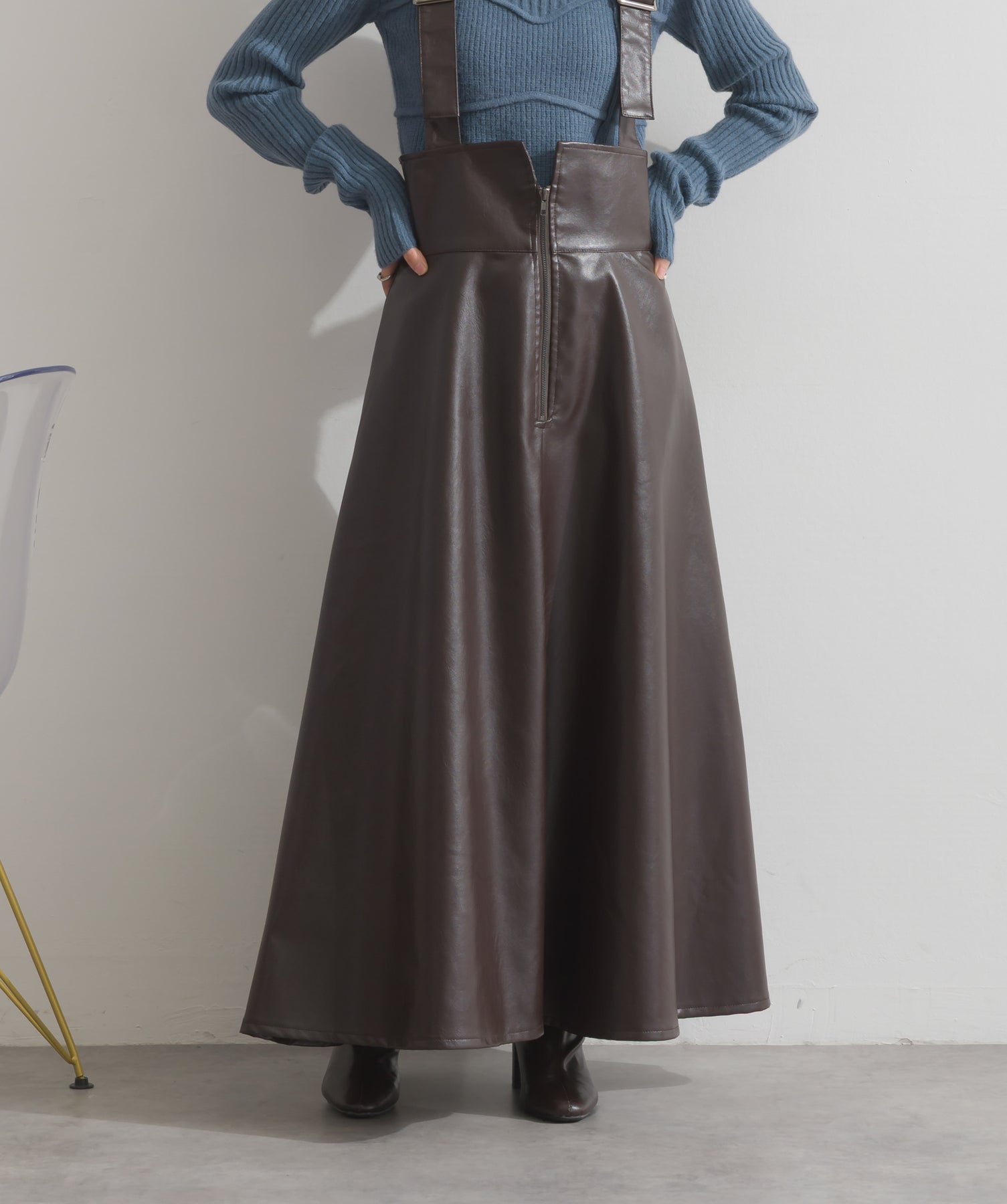 存在感で魅せる。エッジィにキマるフェイクレザージャンスカ。-material-リアルレザー見えする上質なフェイクレザー素材を使用。ほどよい厚みとハリがありつつも、柔らかく軽やかな着心地。オールシーズン活躍できる扱いやすさも魅力。-design-Aラインに広がる美シルエットが印象的なジップアップ仕様のジャンスカ。 アジャスター付きの肩紐で着丈調整が可能。ハードすぎないフェミニンなラインが、大人カジュアルにもモードにもフィット。インナー次第でロングシーズン着まわせる、スタイリング自在な1着です。