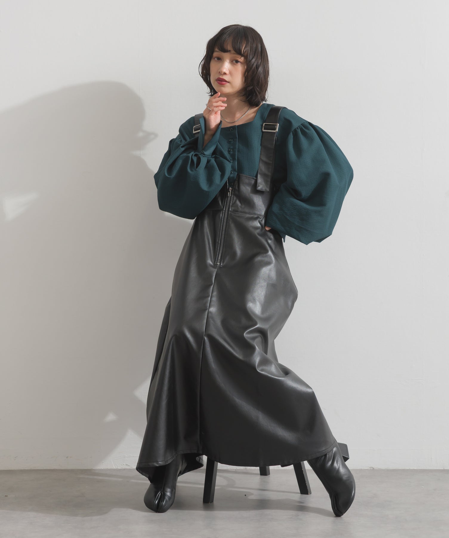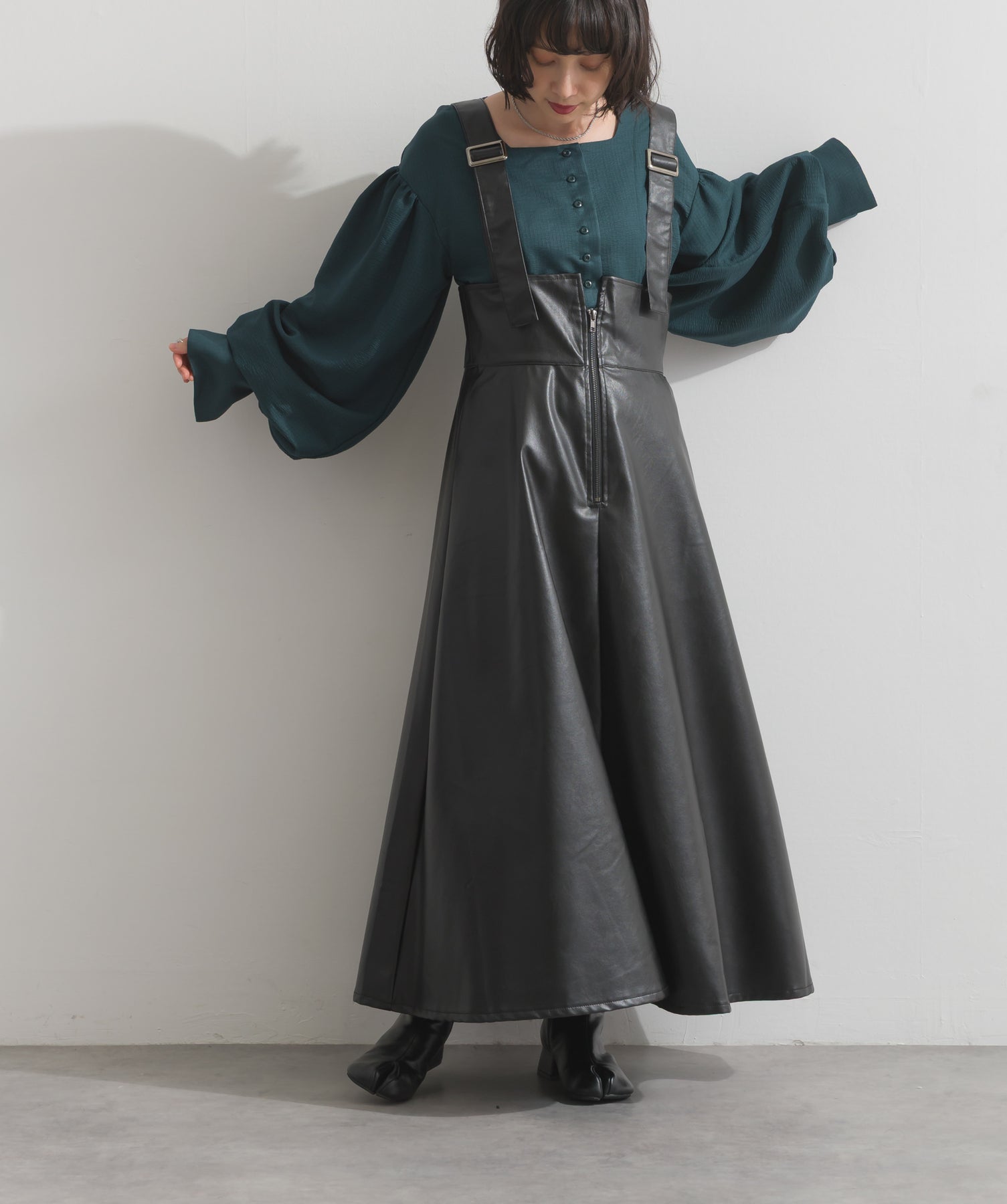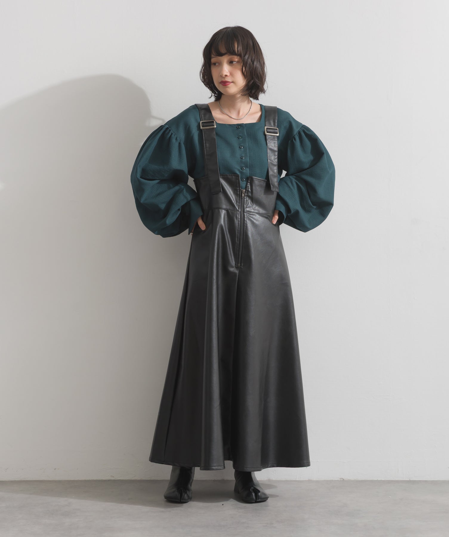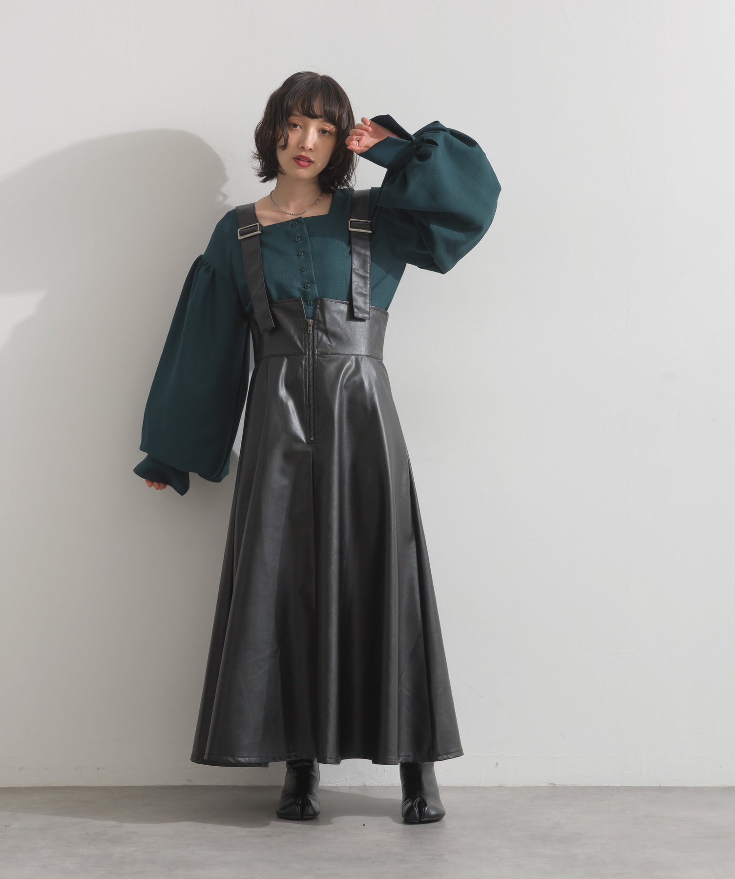 存在感で魅せる。エッジィにキマるフェイクレザージャンスカ。-material-リアルレザー見えする上質なフェイクレザー素材を使用。ほどよい厚みとハリがありつつも、柔らかく軽やかな着心地。オールシーズン活躍できる扱いやすさも魅力。-design-Aラインに広がる美シルエットが印象的なジップアップ仕様のジャンスカ。 アジャスター付きの肩紐で着丈調整が可能。ハードすぎないフェミニンなラインが、大人カジュアルにもモードにもフィット。インナー次第でロングシーズン着まわせる、スタイリング自在な1着です。