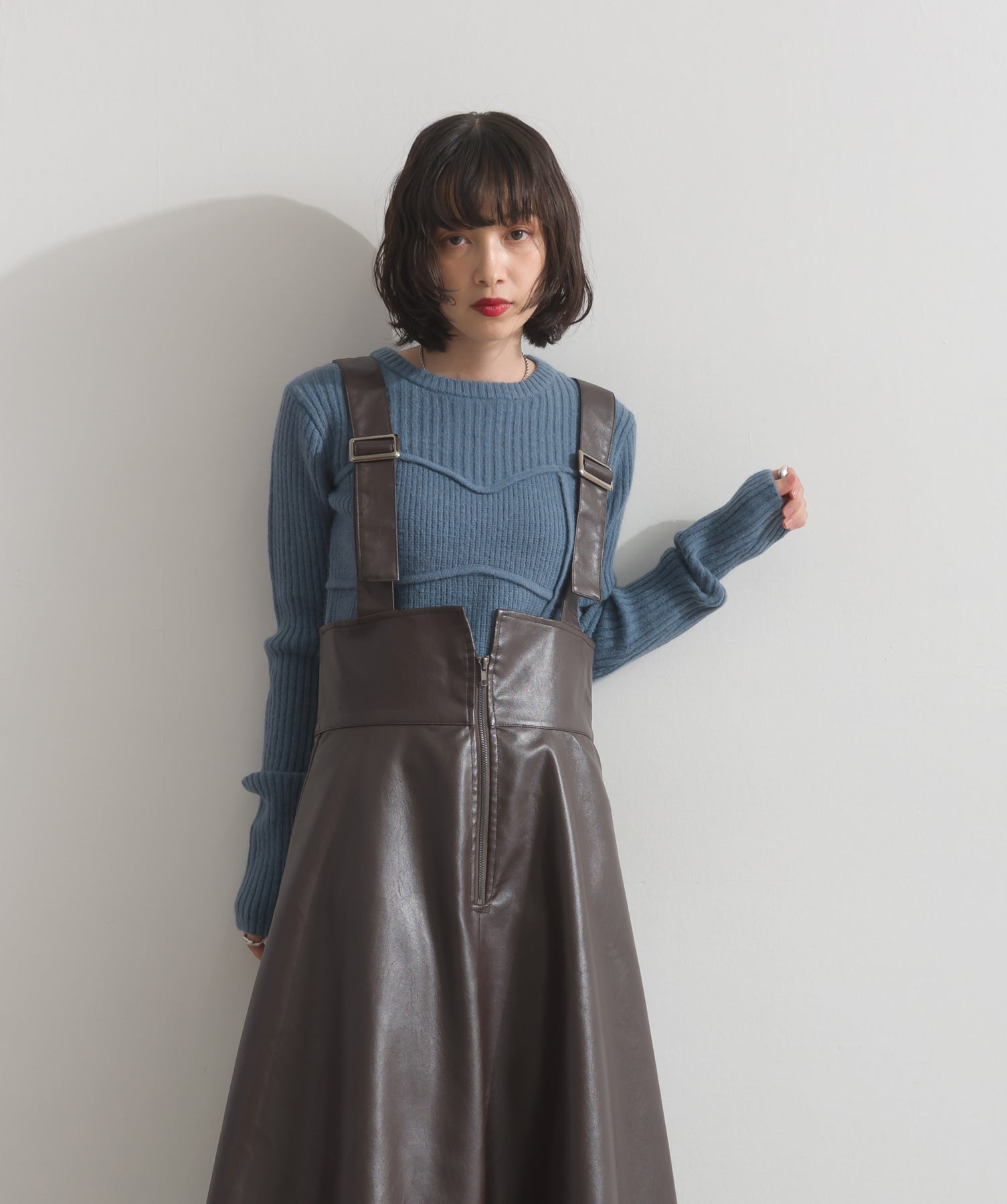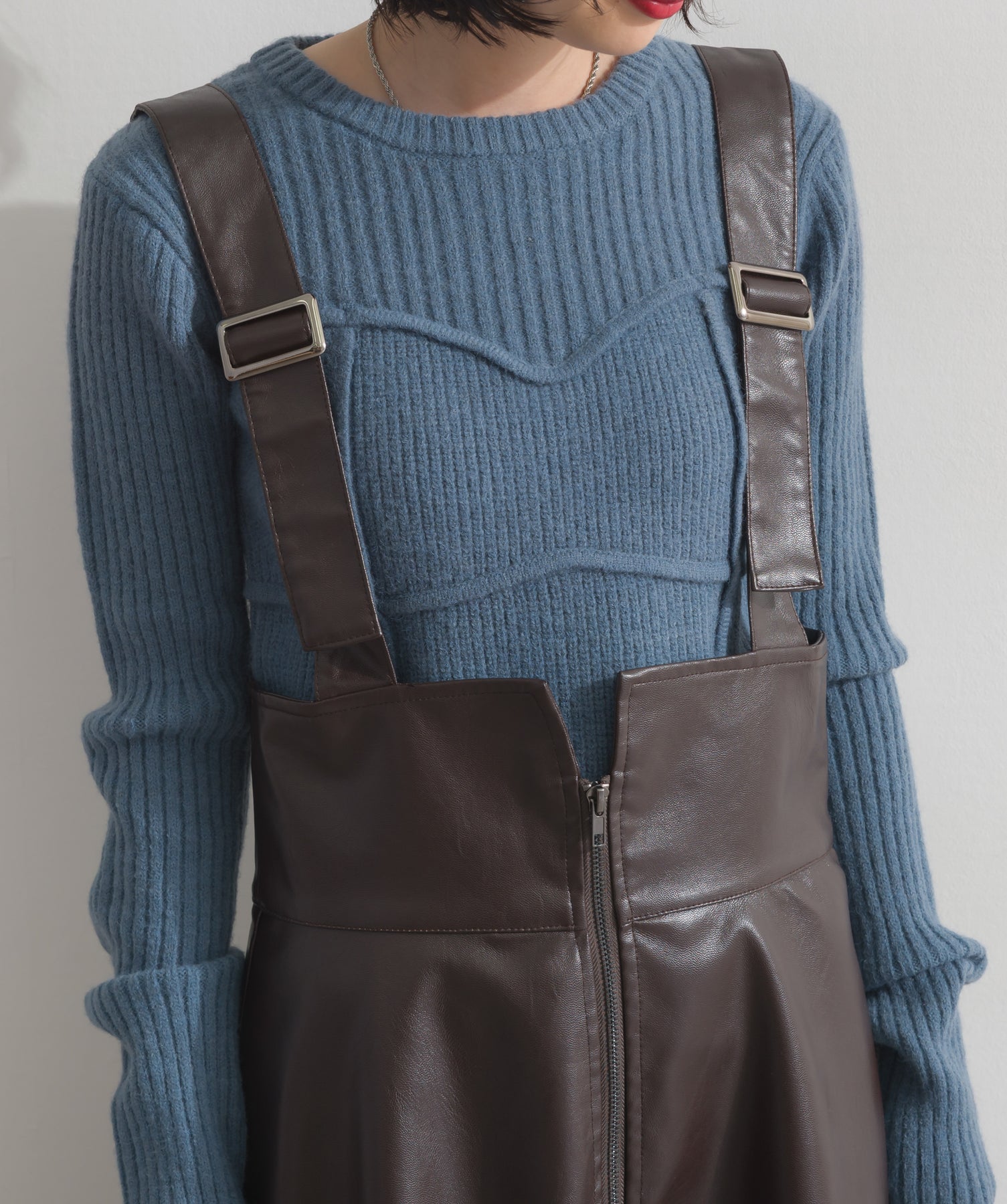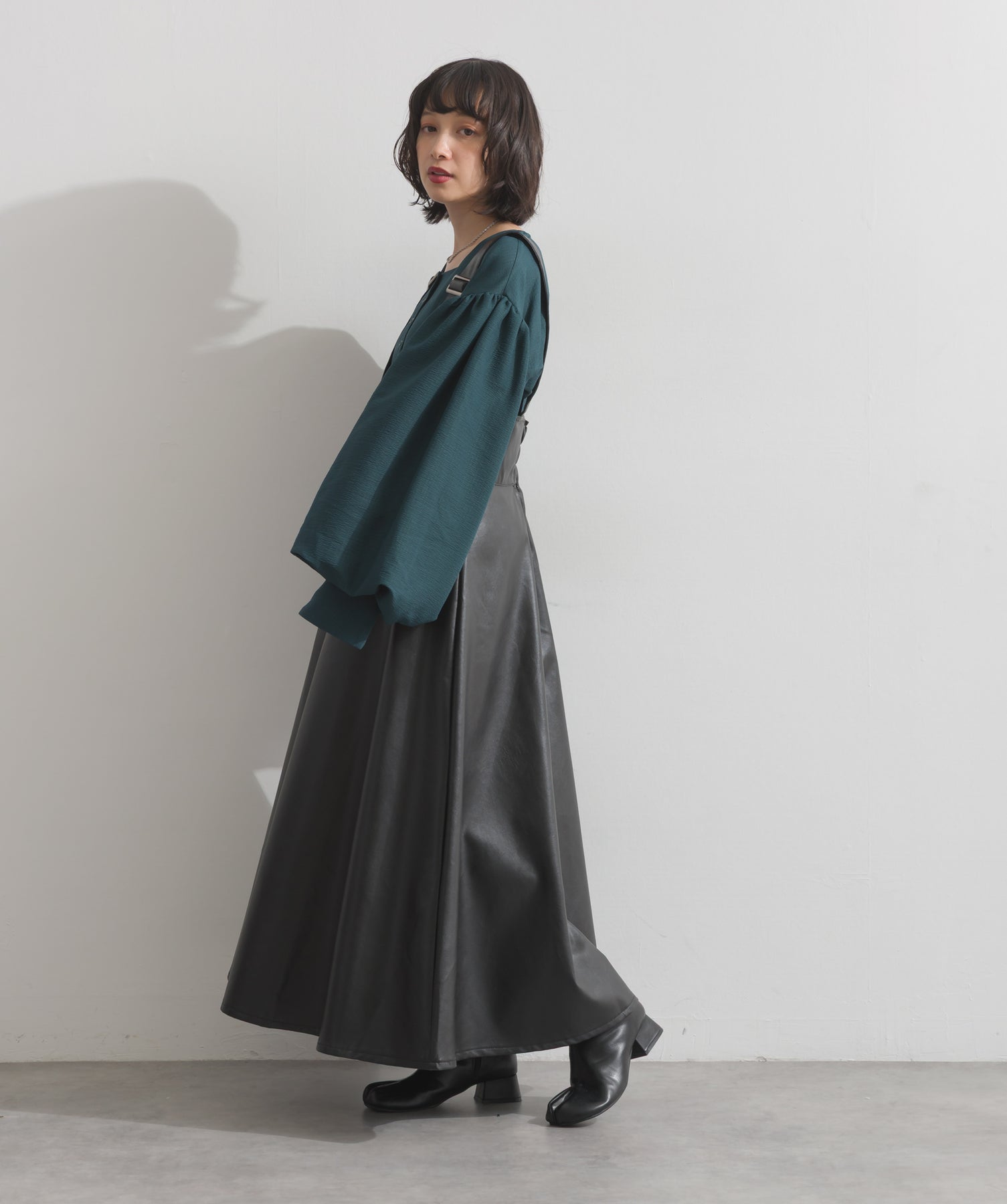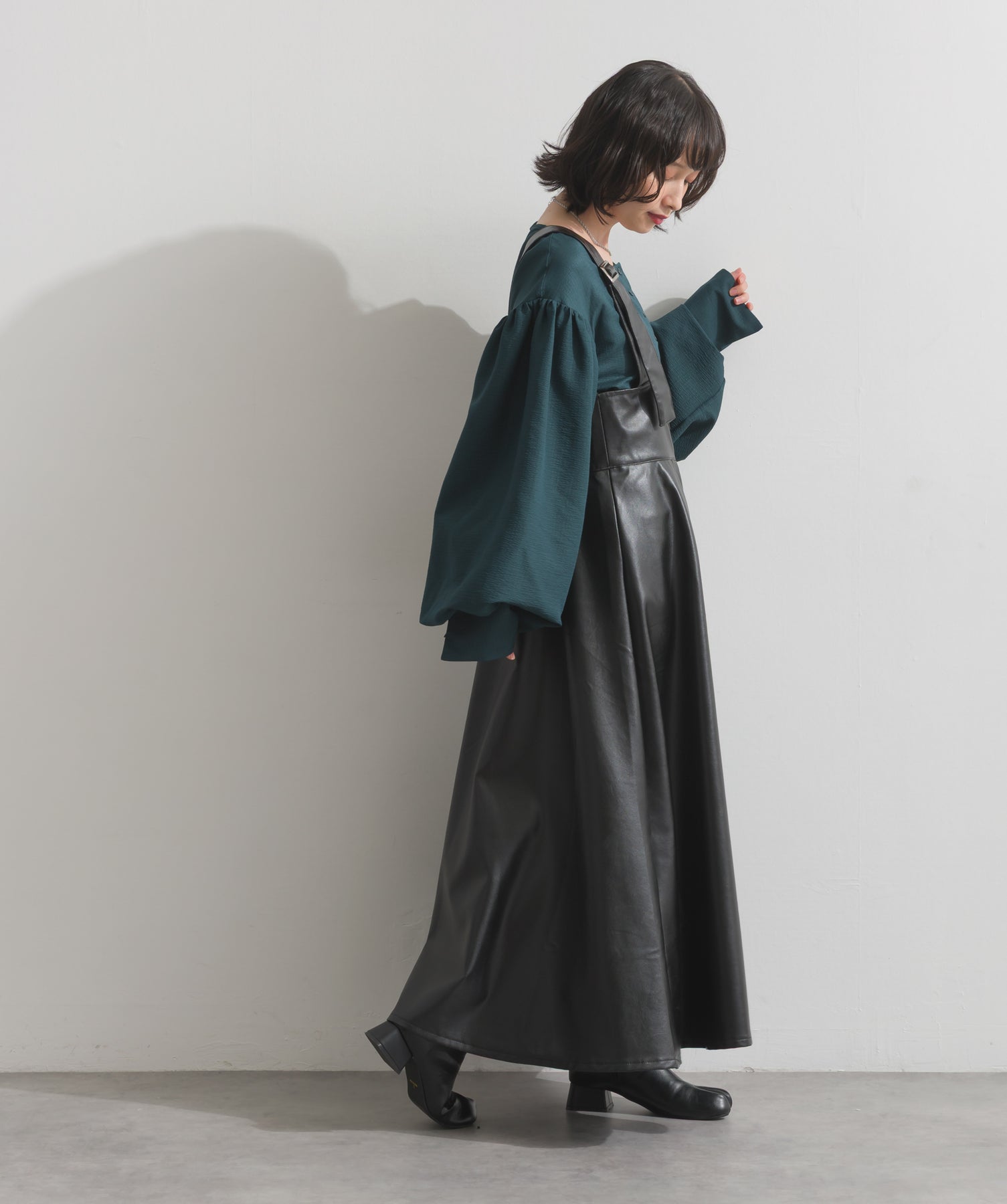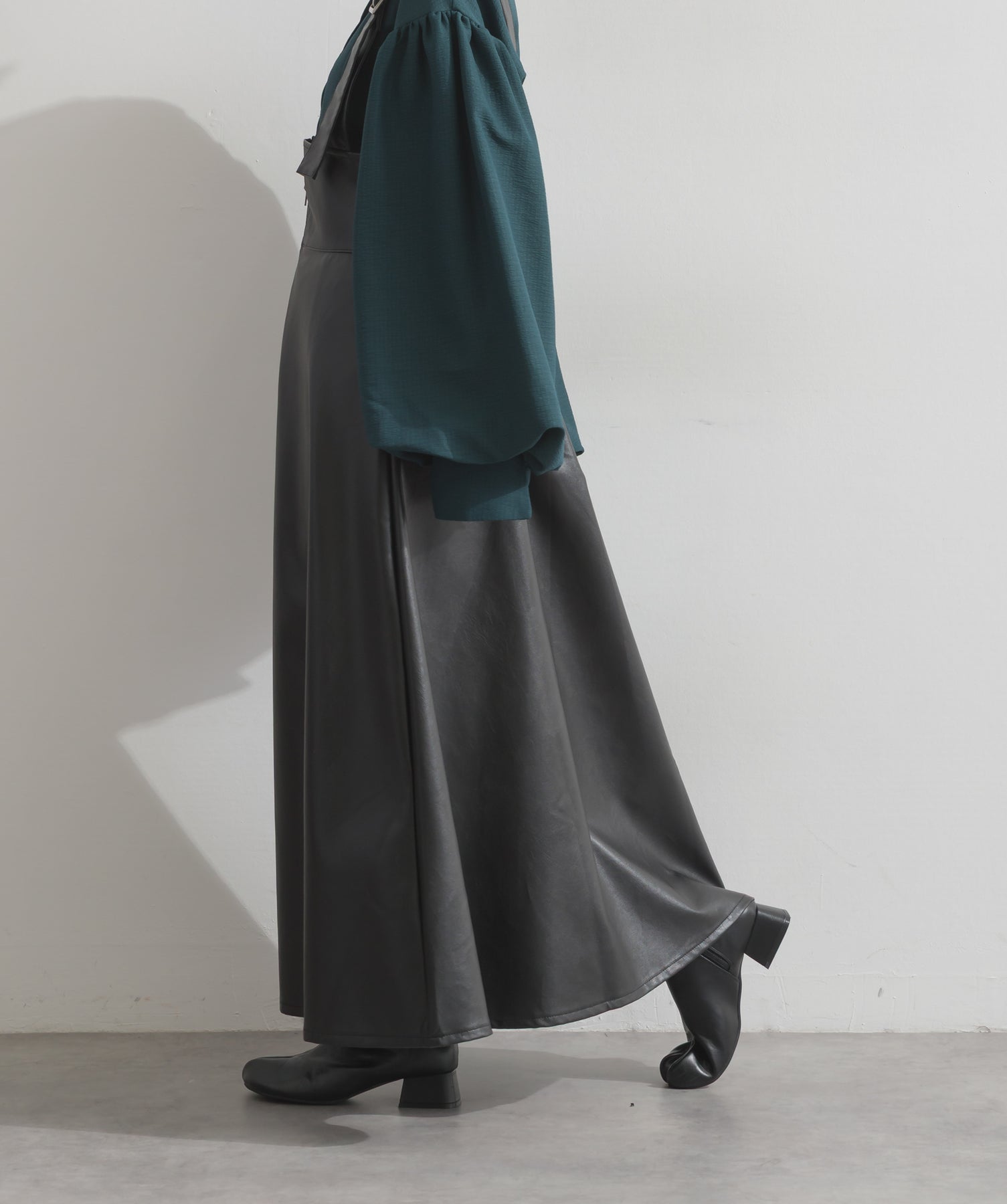 存在感で魅せる。エッジィにキマるフェイクレザージャンスカ。-material-リアルレザー見えする上質なフェイクレザー素材を使用。ほどよい厚みとハリがありつつも、柔らかく軽やかな着心地。オールシーズン活躍できる扱いやすさも魅力。-design-Aラインに広がる美シルエットが印象的なジップアップ仕様のジャンスカ。 アジャスター付きの肩紐で着丈調整が可能。ハードすぎないフェミニンなラインが、大人カジュアルにもモードにもフィット。インナー次第でロングシーズン着まわせる、スタイリング自在な1着です。