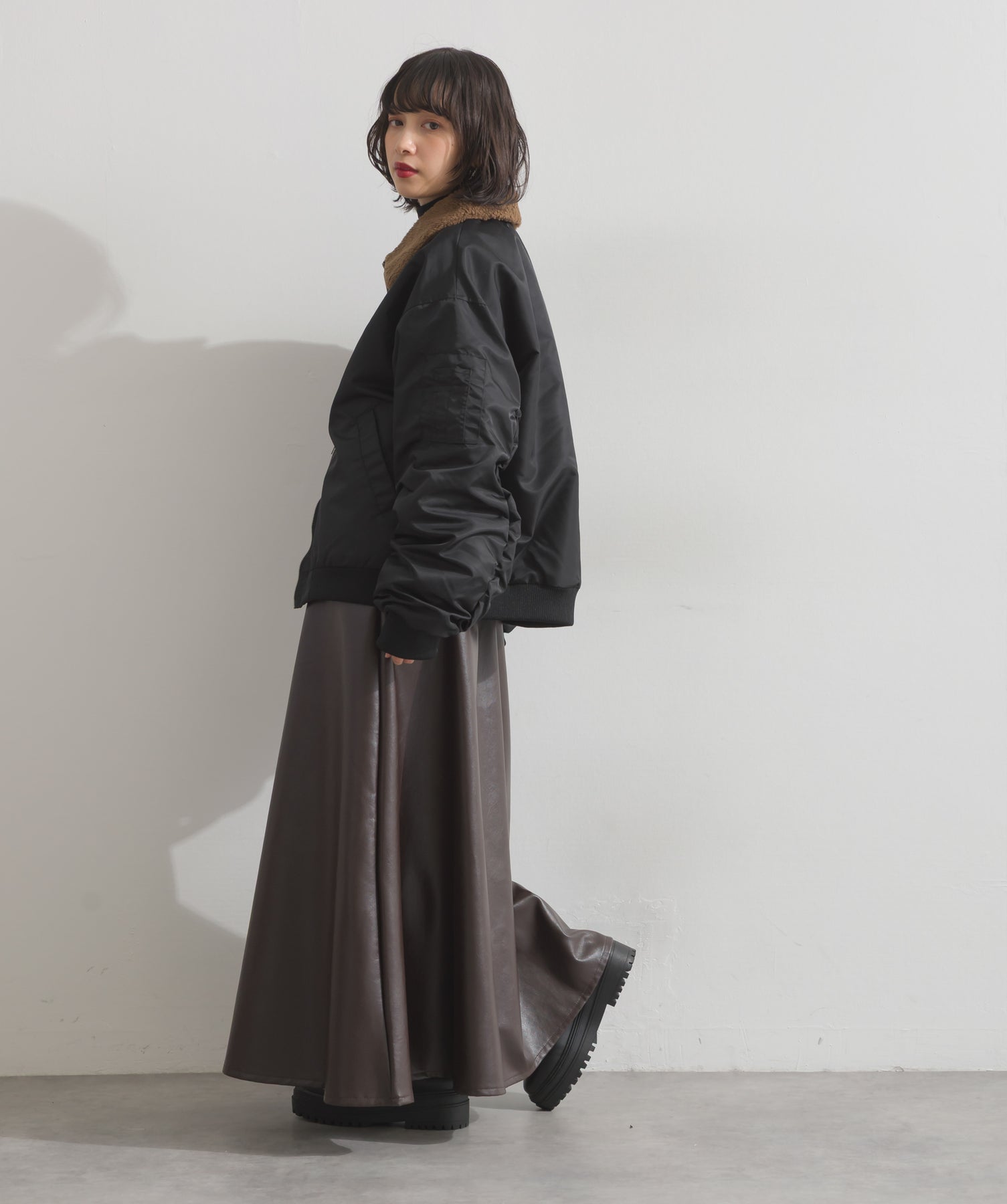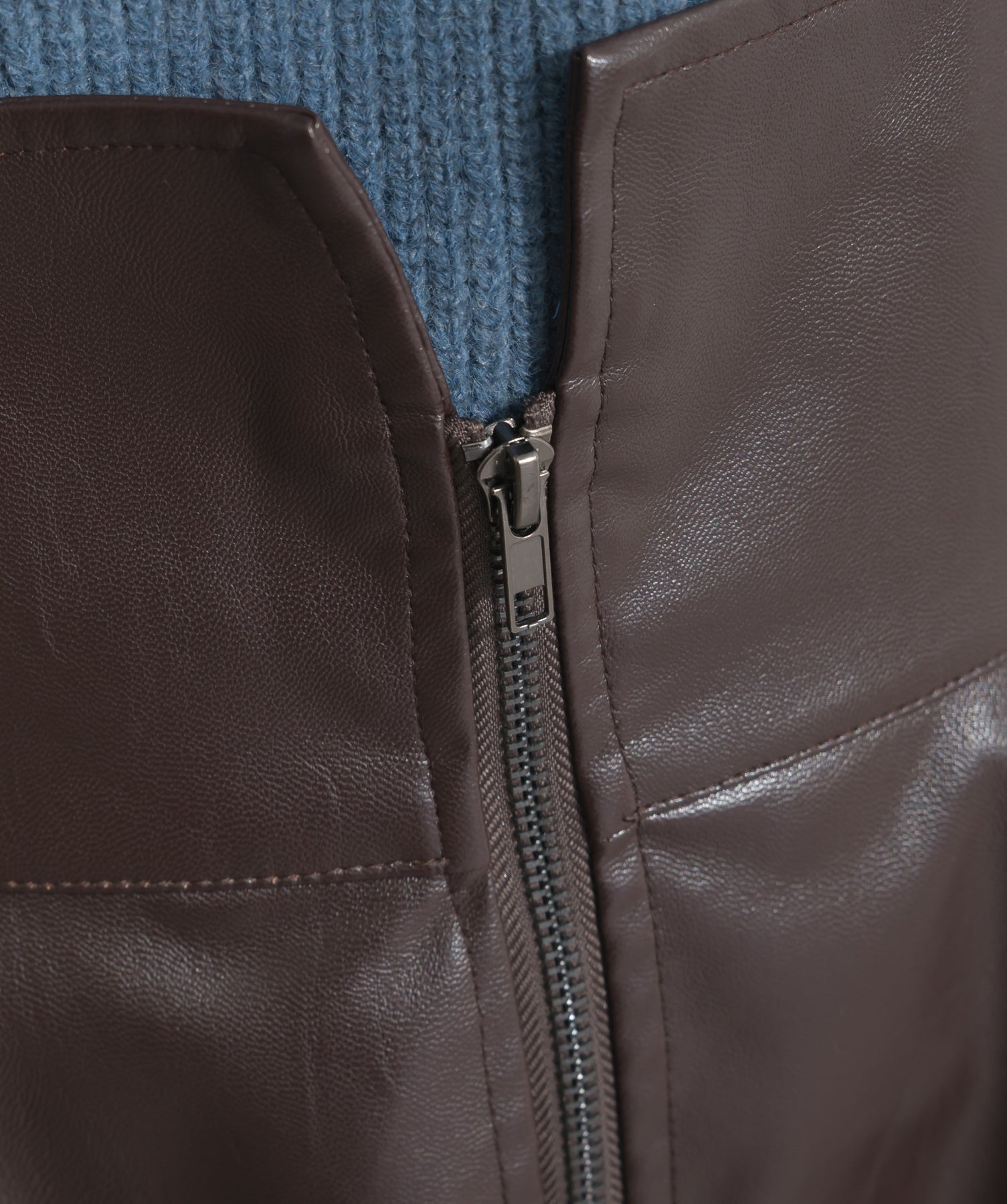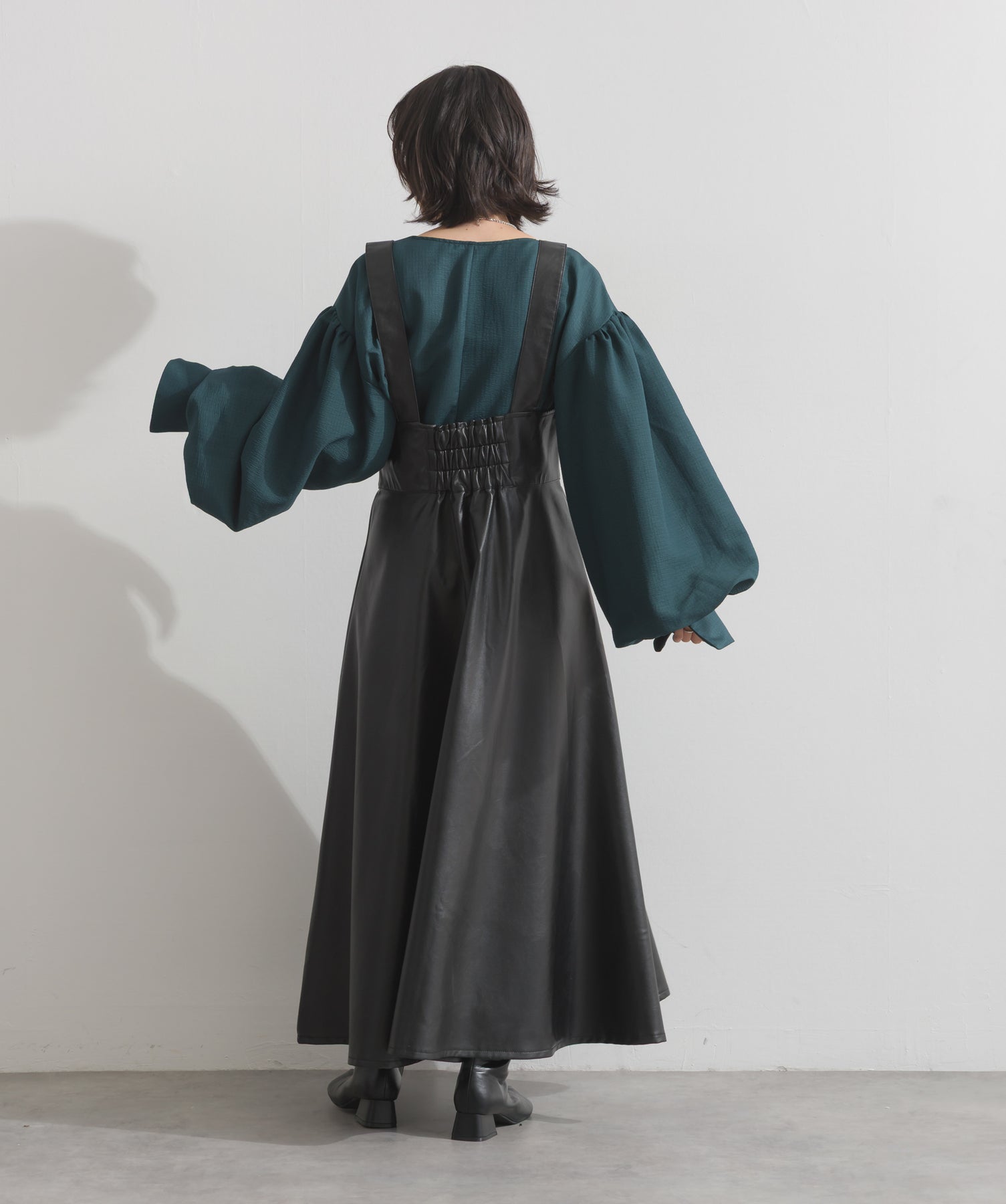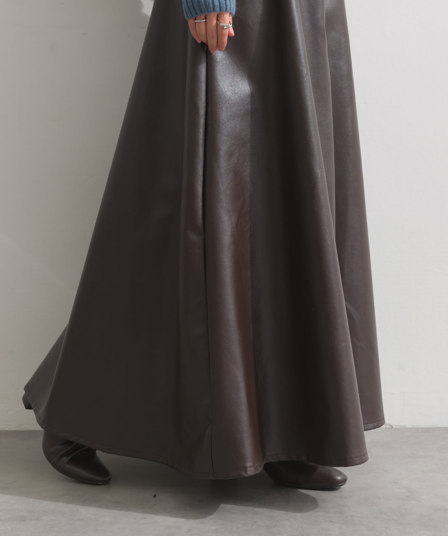 存在感で魅せる。エッジィにキマるフェイクレザージャンスカ。-material-リアルレザー見えする上質なフェイクレザー素材を使用。ほどよい厚みとハリがありつつも、柔らかく軽やかな着心地。オールシーズン活躍できる扱いやすさも魅力。-design-Aラインに広がる美シルエットが印象的なジップアップ仕様のジャンスカ。 アジャスター付きの肩紐で着丈調整が可能。ハードすぎないフェミニンなラインが、大人カジュアルにもモードにもフィット。インナー次第でロングシーズン着まわせる、スタイリング自在な1着です。