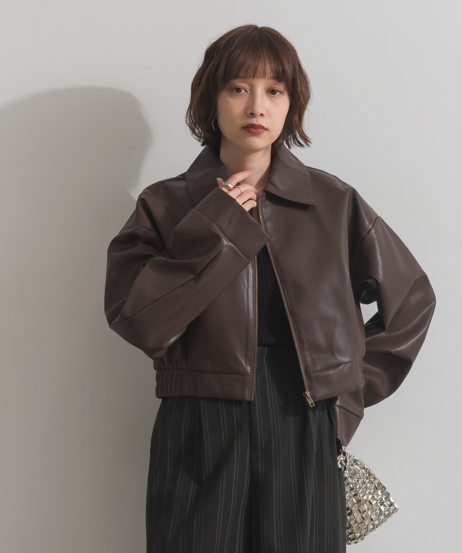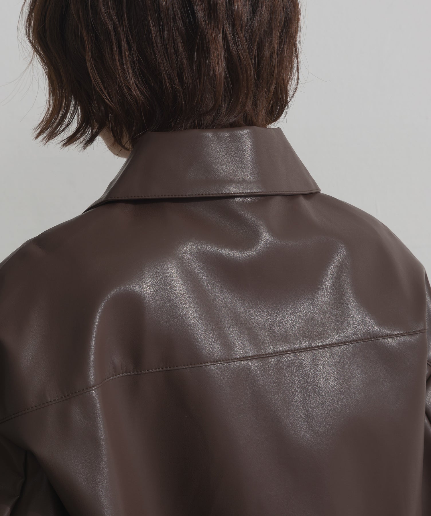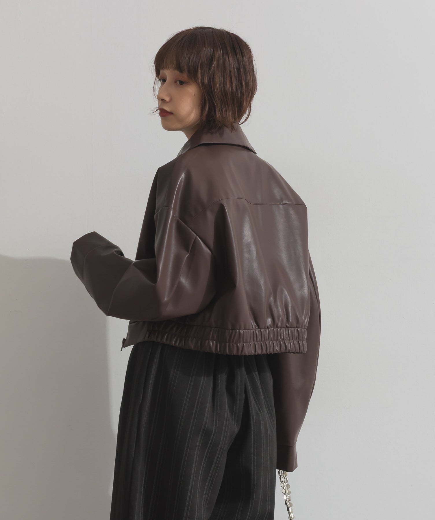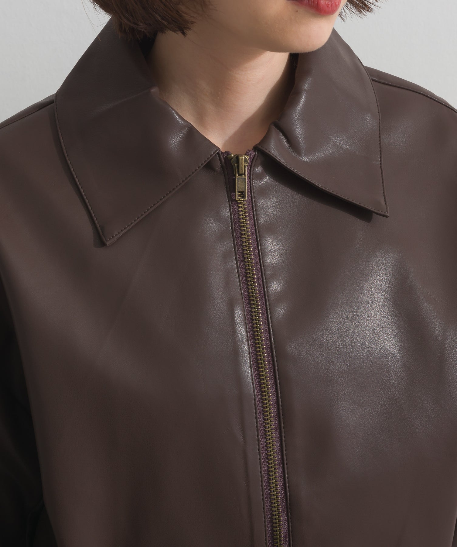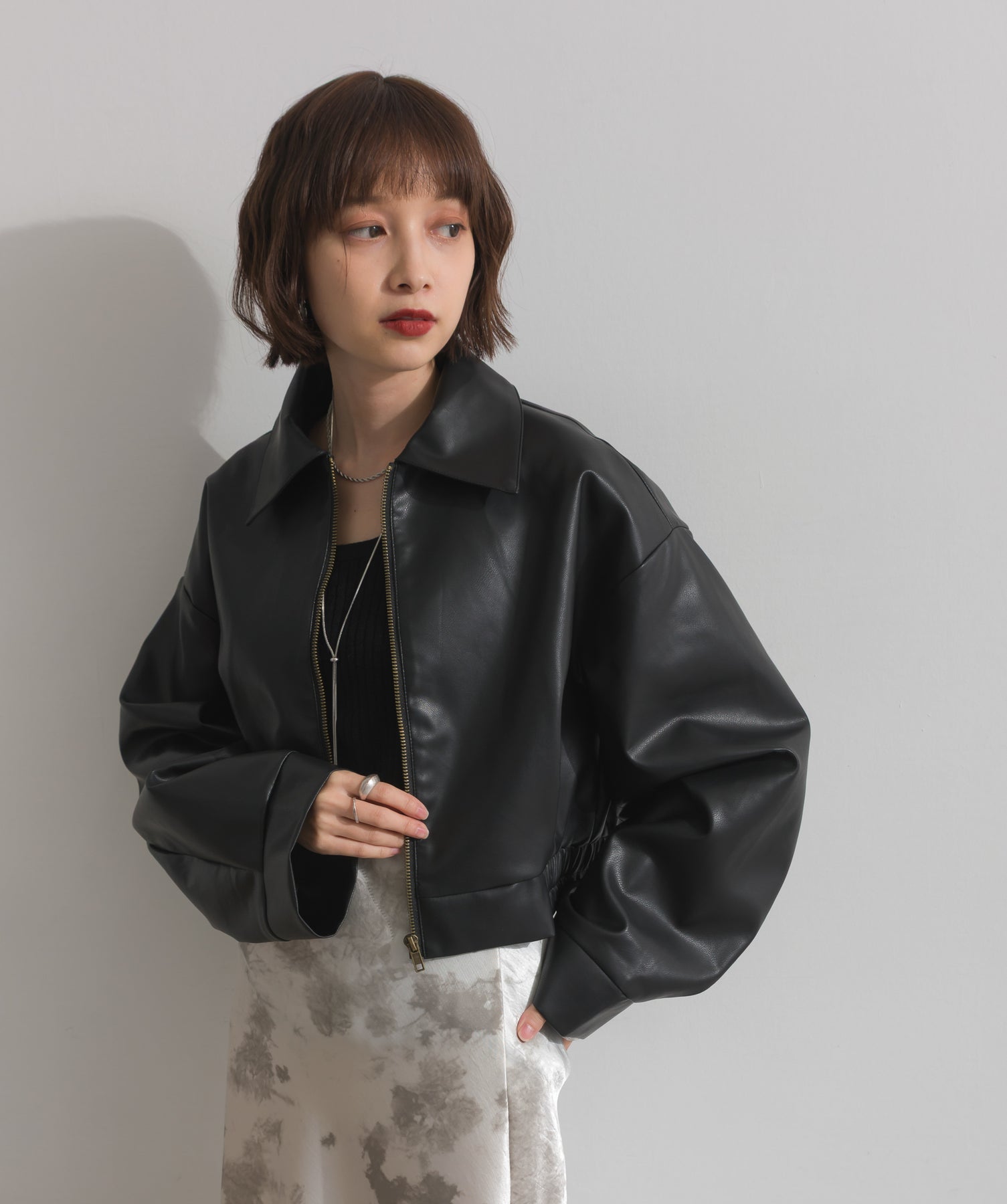 シンプルで映える。洗練された存在感を纏うモードブルゾン-material-フェイクレザー素材を使用。マットな光沢感としなやかなハリ感が特徴で、程よく肉厚な生地がシルエットを美しく保ちます。軽量でストレスの少ない着心地ながら、しっかりと存在感のあるルックスを演出します。-design-クラシカルな襟付きデザインに、程よくドロップしたショルダーラインとワイドスリーブがモードな抜け感をプラス。ウエストラインにかけて自然に絞られたコンパクトな丈感が、どんなボトムスとも好相性。フロントはミニマルなジップ仕様で、洗練された印象に。羽織るだけでスタイリングが決まる、主役級の一着です。