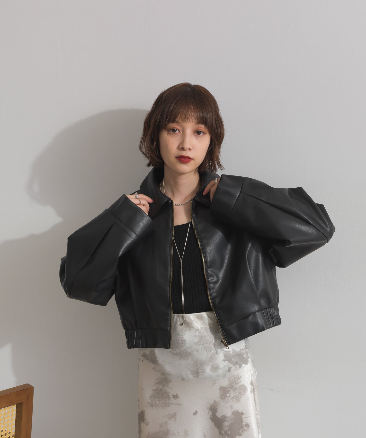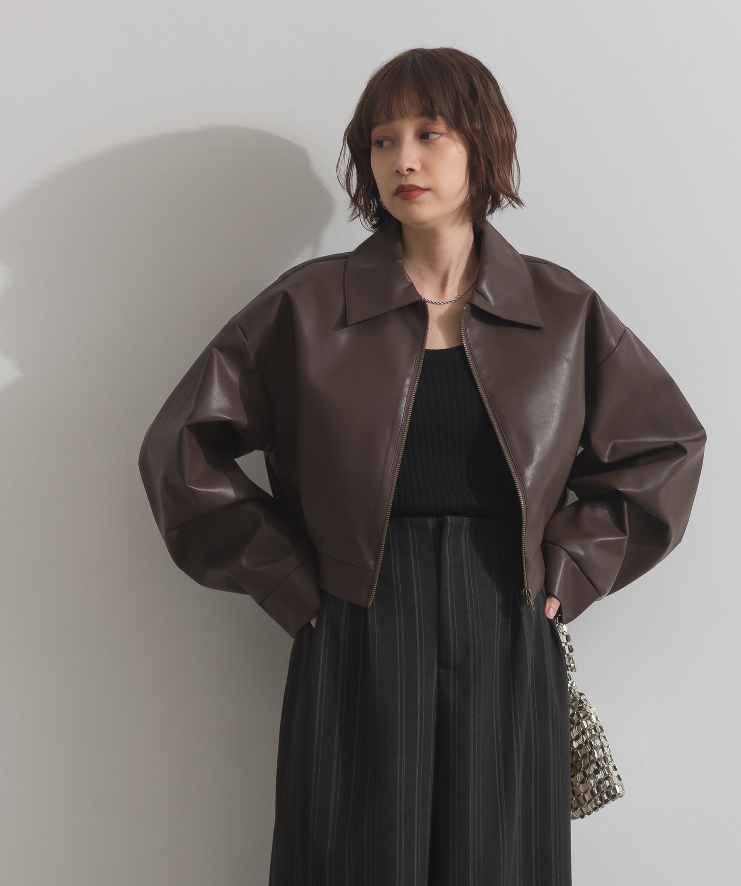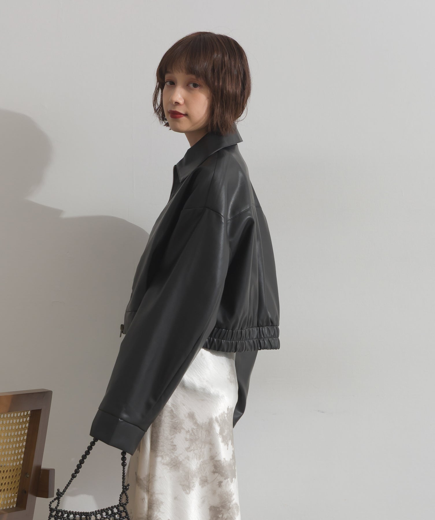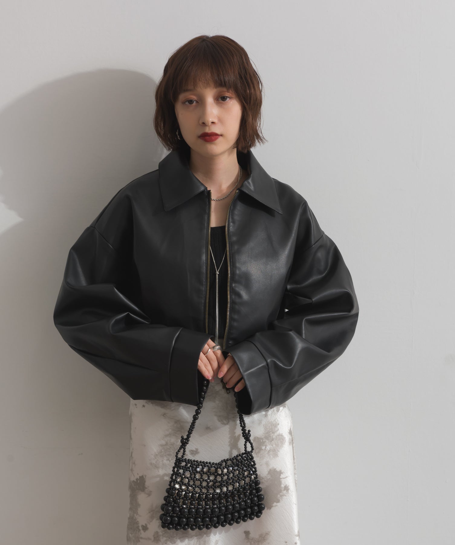 シンプルで映える。洗練された存在感を纏うモードブルゾン-material-フェイクレザー素材を使用。マットな光沢感としなやかなハリ感が特徴で、程よく肉厚な生地がシルエットを美しく保ちます。軽量でストレスの少ない着心地ながら、しっかりと存在感のあるルックスを演出します。-design-クラシカルな襟付きデザインに、程よくドロップしたショルダーラインとワイドスリーブがモードな抜け感をプラス。ウエストラインにかけて自然に絞られたコンパクトな丈感が、どんなボトムスとも好相性。フロントはミニマルなジップ仕様で、洗練された印象に。羽織るだけでスタイリングが決まる、主役級の一着です。
