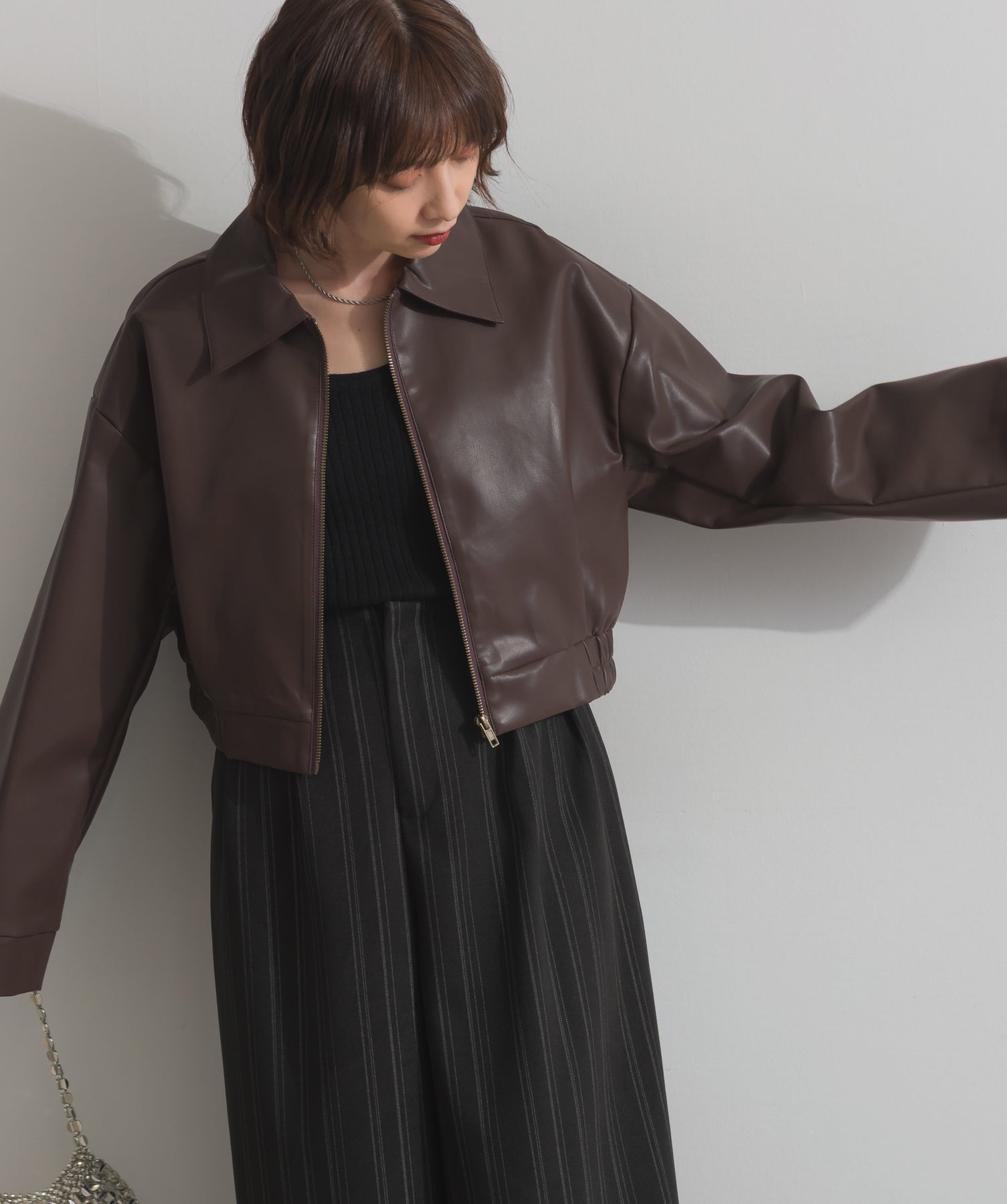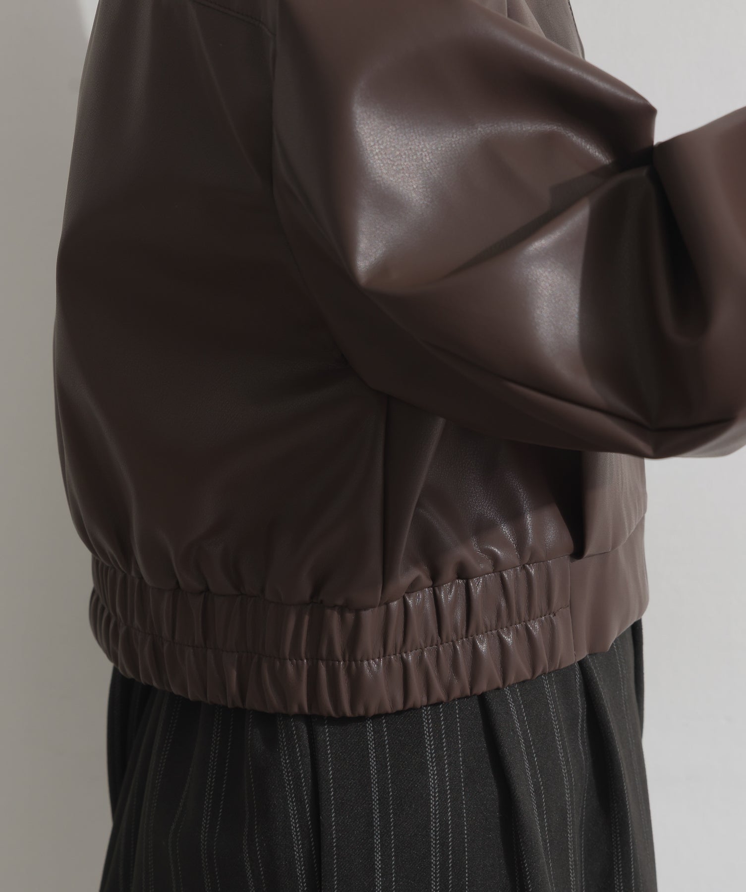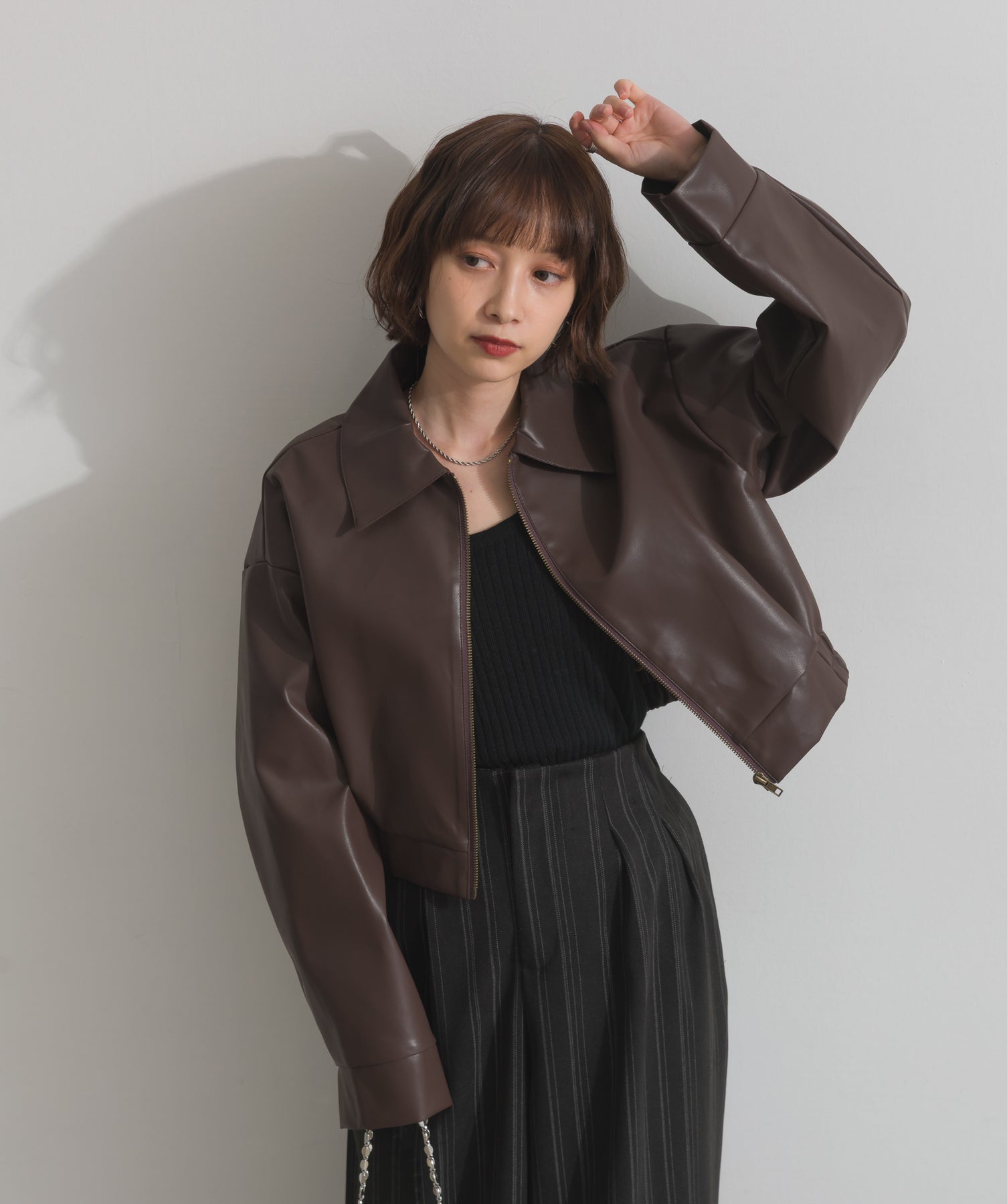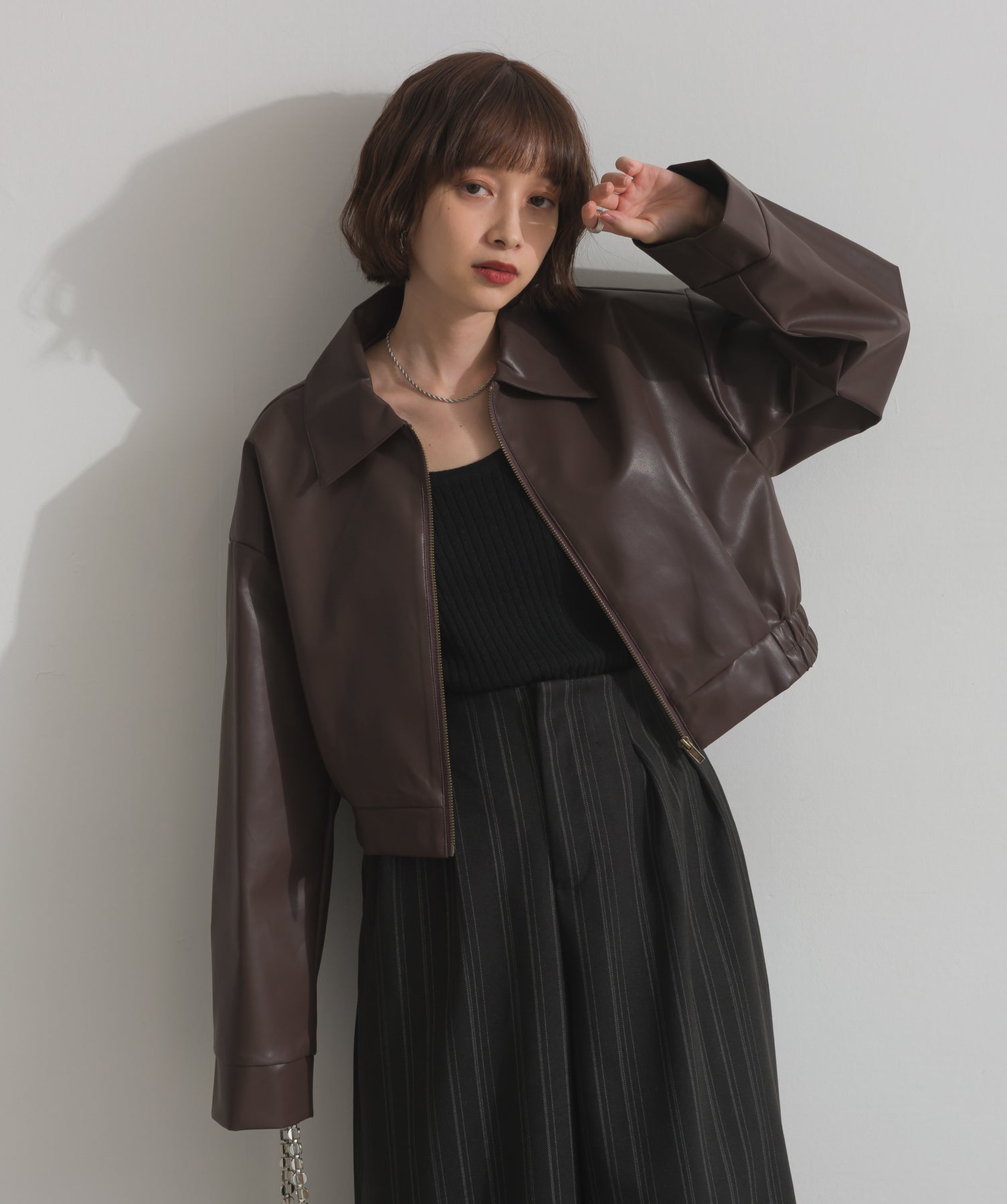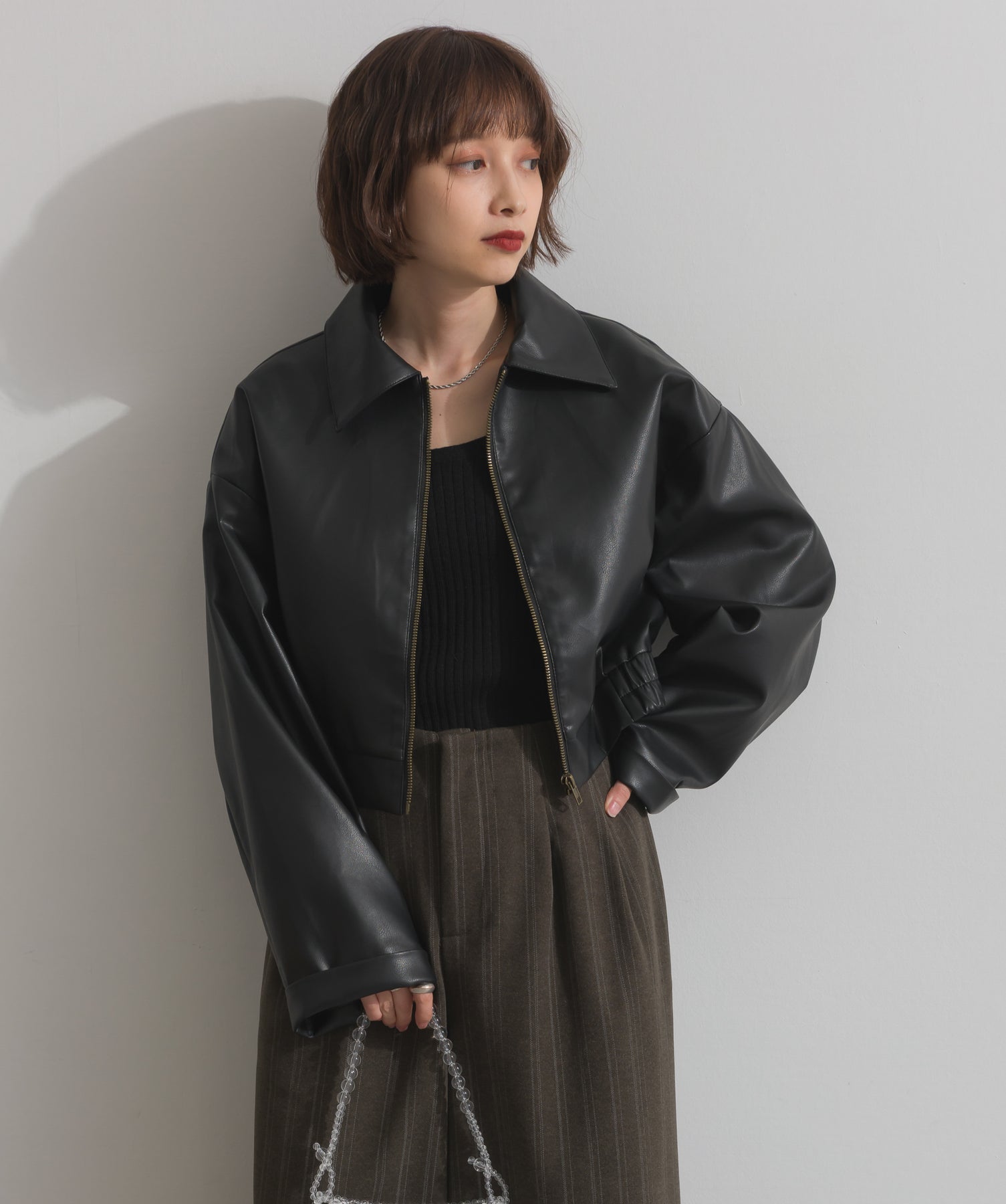 シンプルで映える。洗練された存在感を纏うモードブルゾン-material-フェイクレザー素材を使用。マットな光沢感としなやかなハリ感が特徴で、程よく肉厚な生地がシルエットを美しく保ちます。軽量でストレスの少ない着心地ながら、しっかりと存在感のあるルックスを演出します。-design-クラシカルな襟付きデザインに、程よくドロップしたショルダーラインとワイドスリーブがモードな抜け感をプラス。ウエストラインにかけて自然に絞られたコンパクトな丈感が、どんなボトムスとも好相性。フロントはミニマルなジップ仕様で、洗練された印象に。羽織るだけでスタイリングが決まる、主役級の一着です。