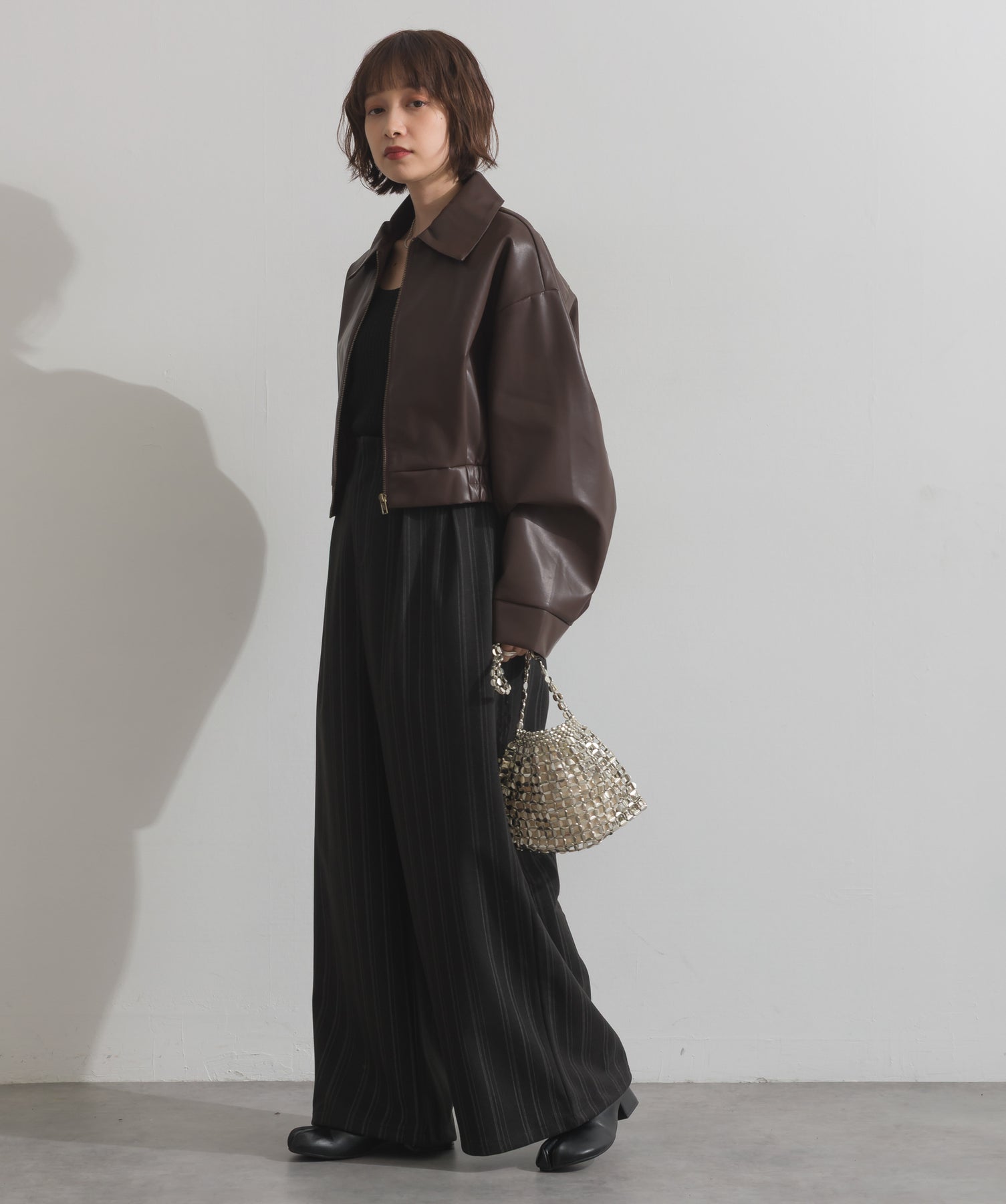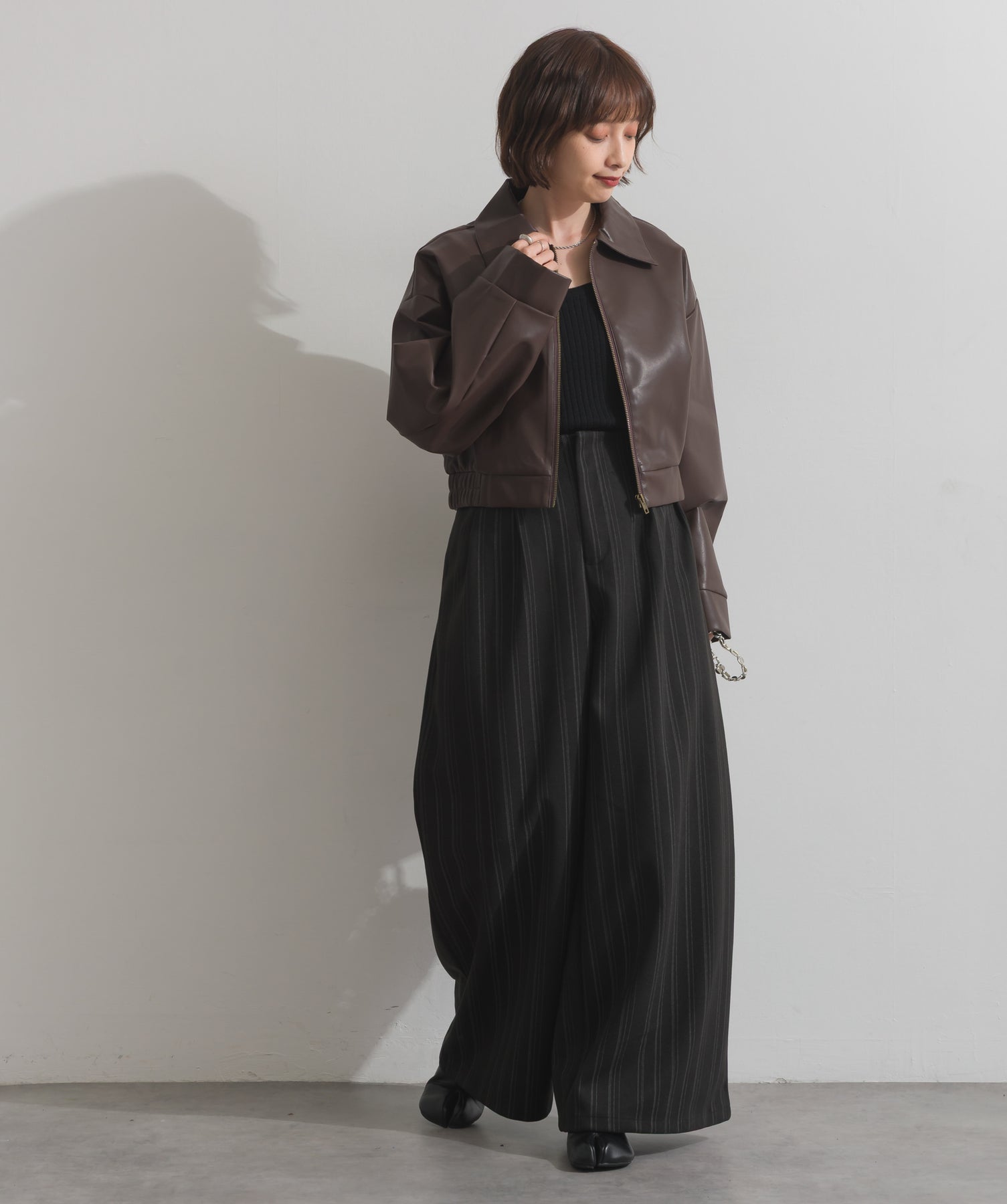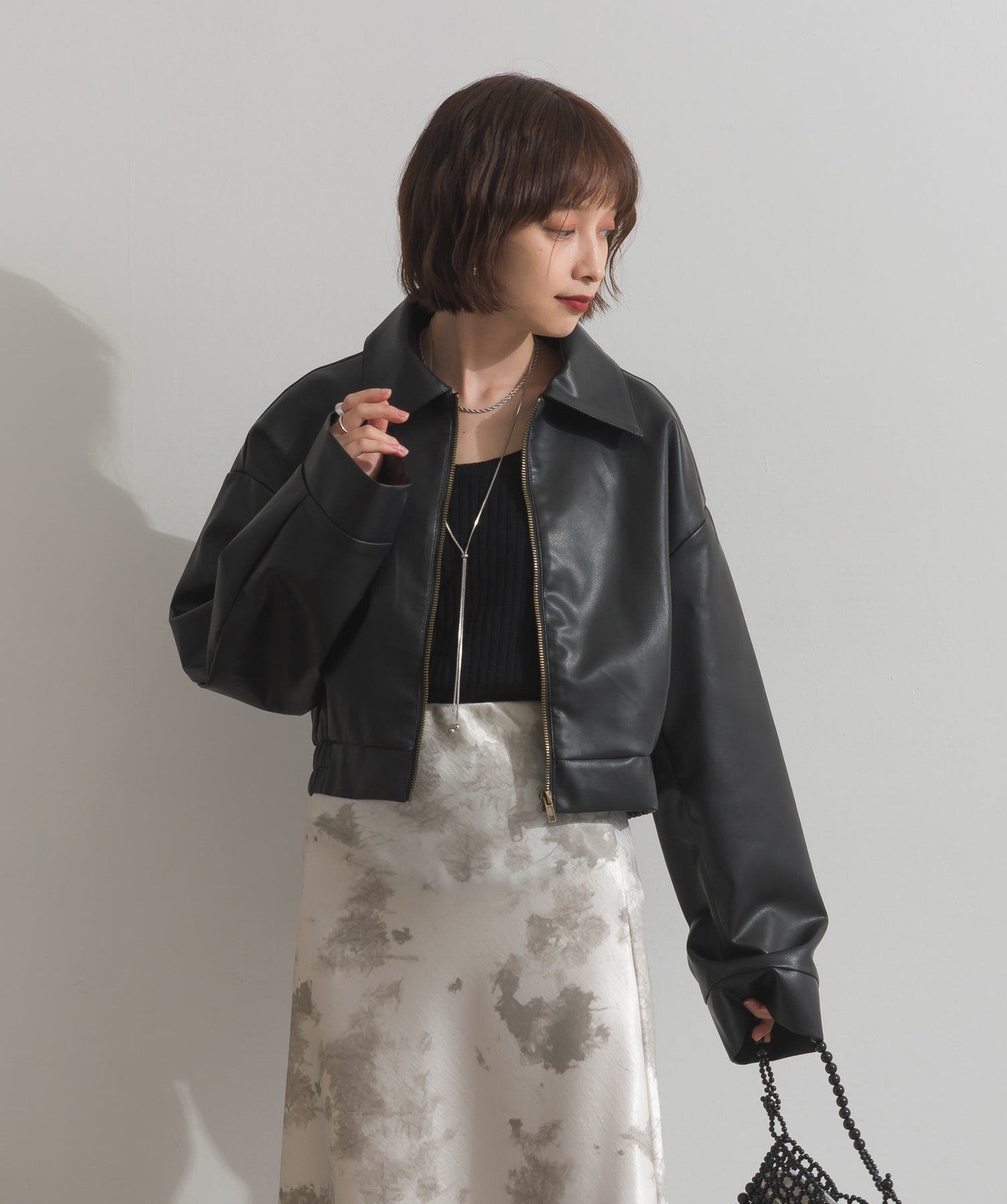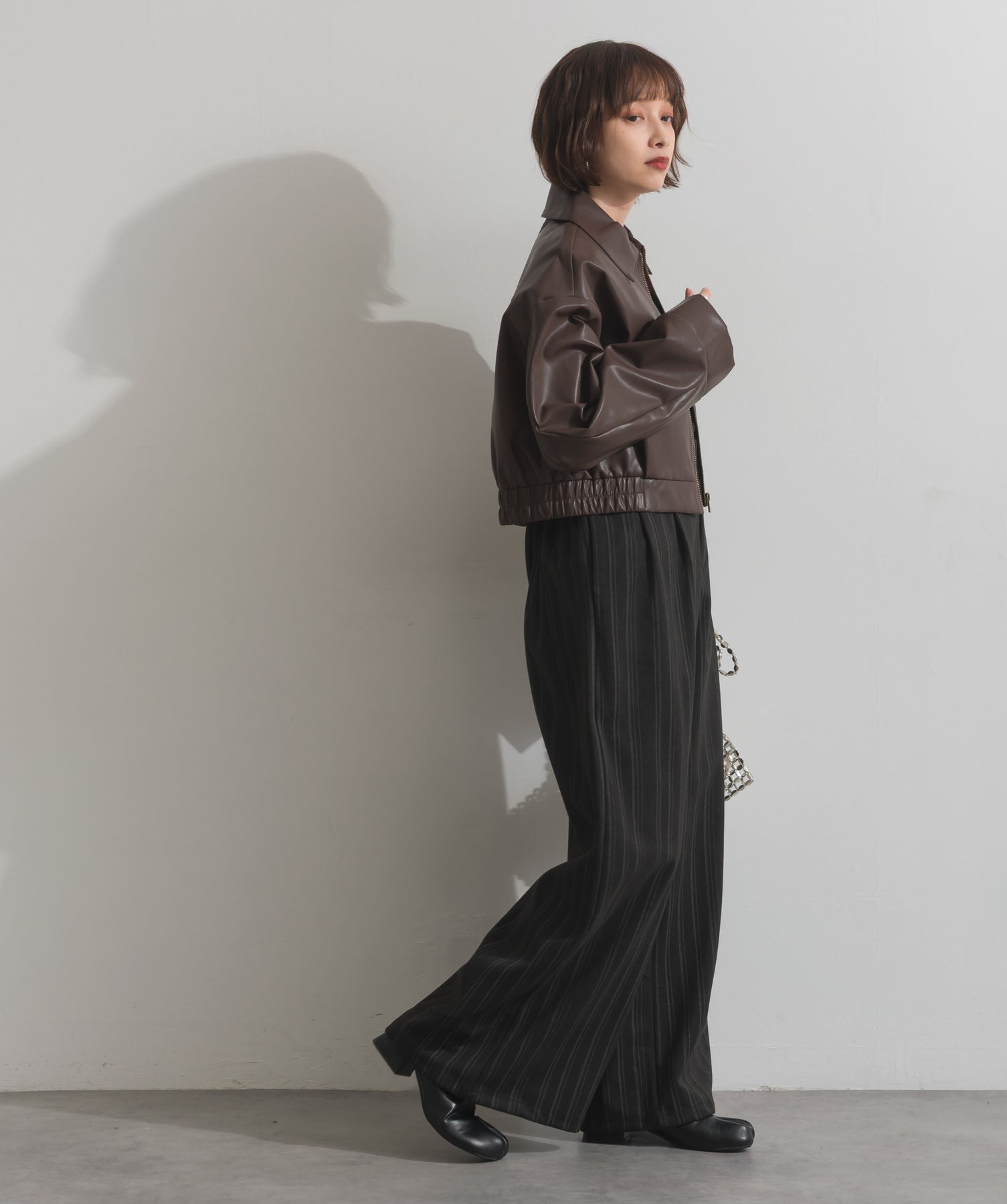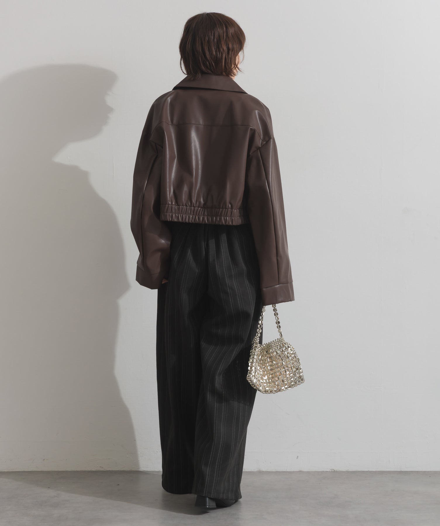 シンプルで映える。洗練された存在感を纏うモードブルゾン-material-フェイクレザー素材を使用。マットな光沢感としなやかなハリ感が特徴で、程よく肉厚な生地がシルエットを美しく保ちます。軽量でストレスの少ない着心地ながら、しっかりと存在感のあるルックスを演出します。-design-クラシカルな襟付きデザインに、程よくドロップしたショルダーラインとワイドスリーブがモードな抜け感をプラス。ウエストラインにかけて自然に絞られたコンパクトな丈感が、どんなボトムスとも好相性。フロントはミニマルなジップ仕様で、洗練された印象に。羽織るだけでスタイリングが決まる、主役級の一着です。