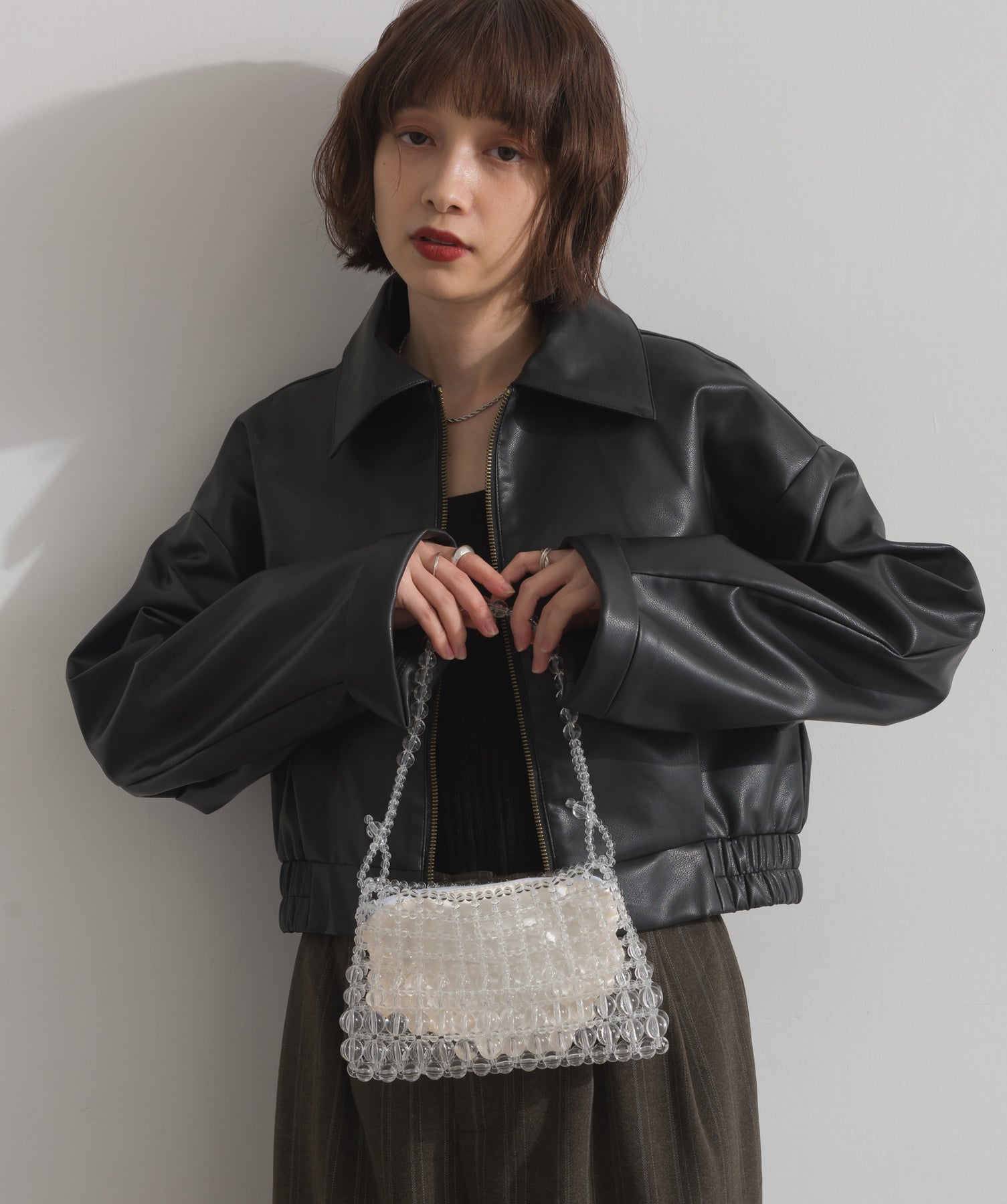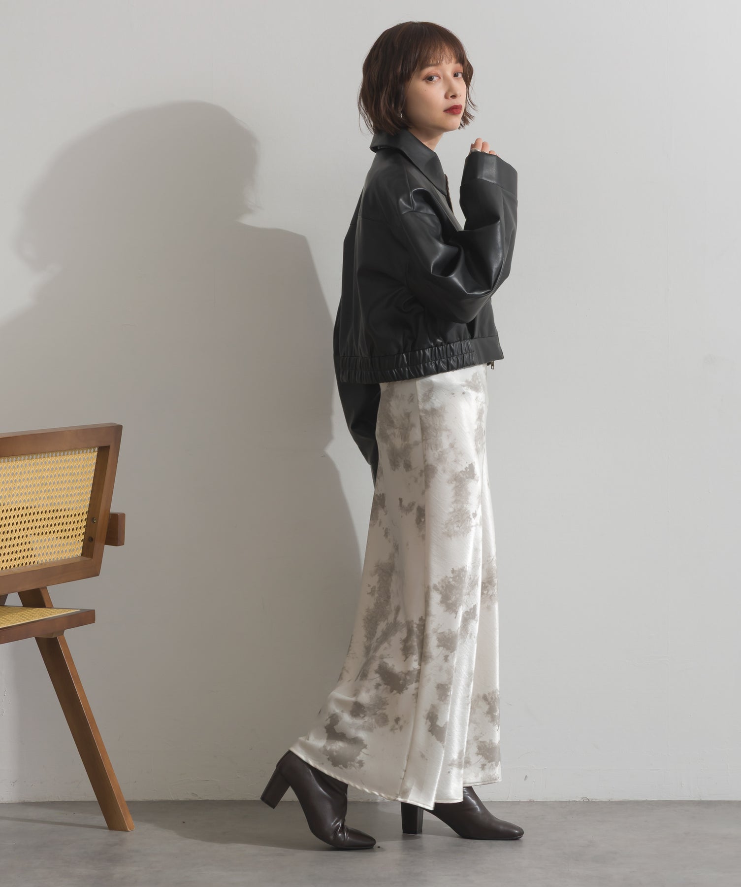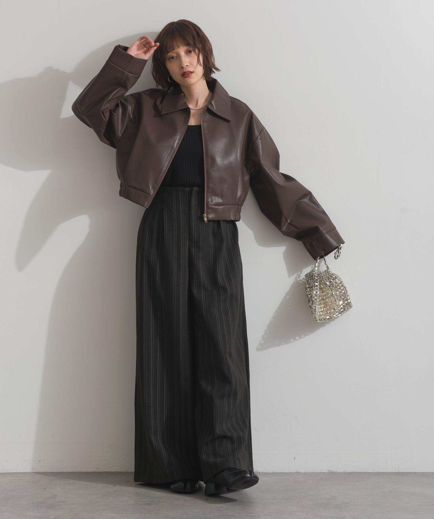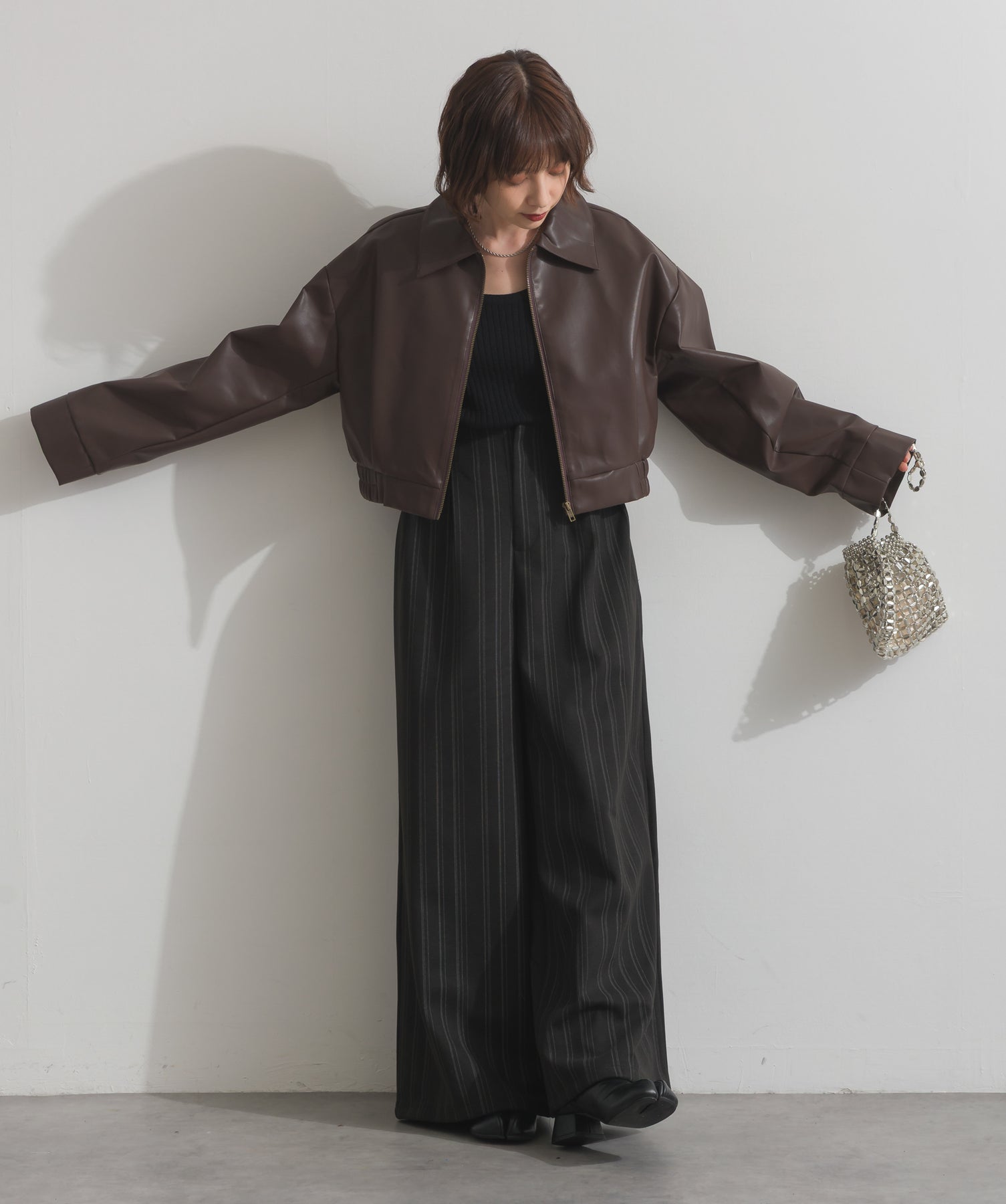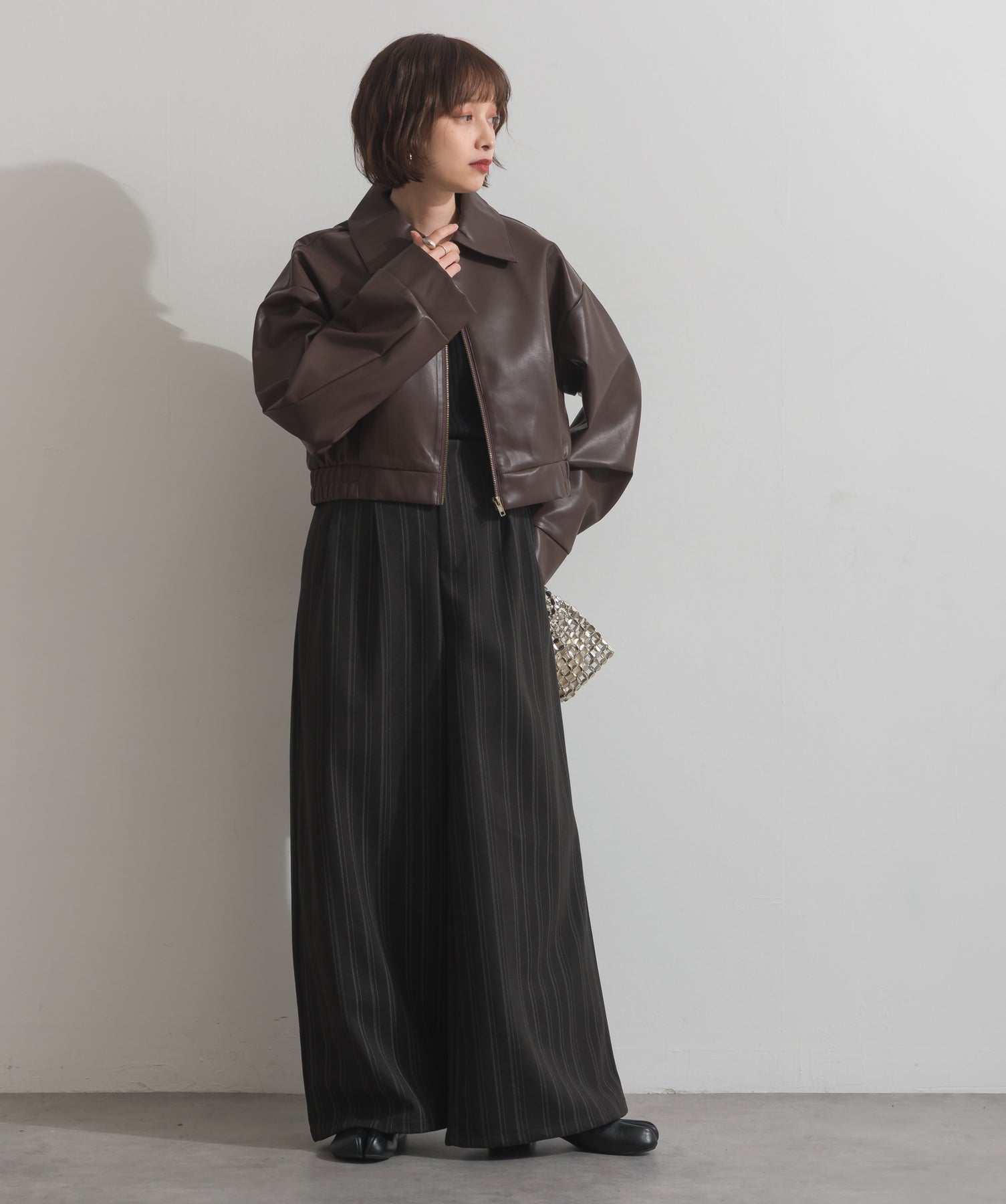 シンプルで映える。洗練された存在感を纏うモードブルゾン-material-フェイクレザー素材を使用。マットな光沢感としなやかなハリ感が特徴で、程よく肉厚な生地がシルエットを美しく保ちます。軽量でストレスの少ない着心地ながら、しっかりと存在感のあるルックスを演出します。-design-クラシカルな襟付きデザインに、程よくドロップしたショルダーラインとワイドスリーブがモードな抜け感をプラス。ウエストラインにかけて自然に絞られたコンパクトな丈感が、どんなボトムスとも好相性。フロントはミニマルなジップ仕様で、洗練された印象に。羽織るだけでスタイリングが決まる、主役級の一着です。