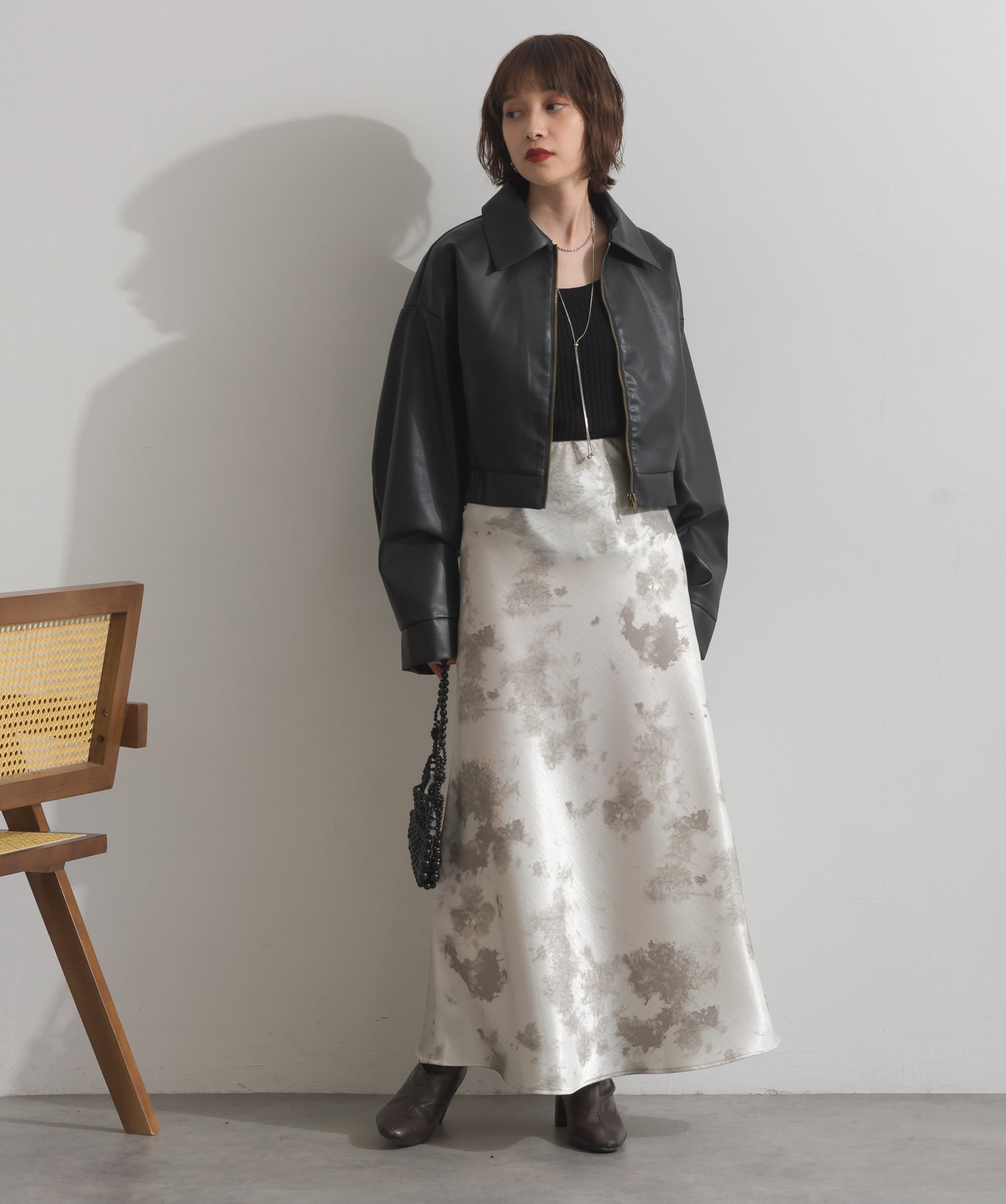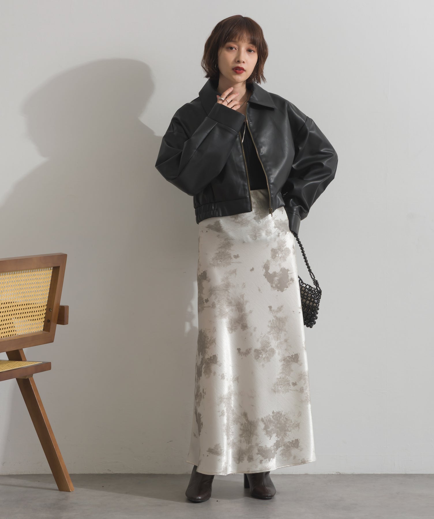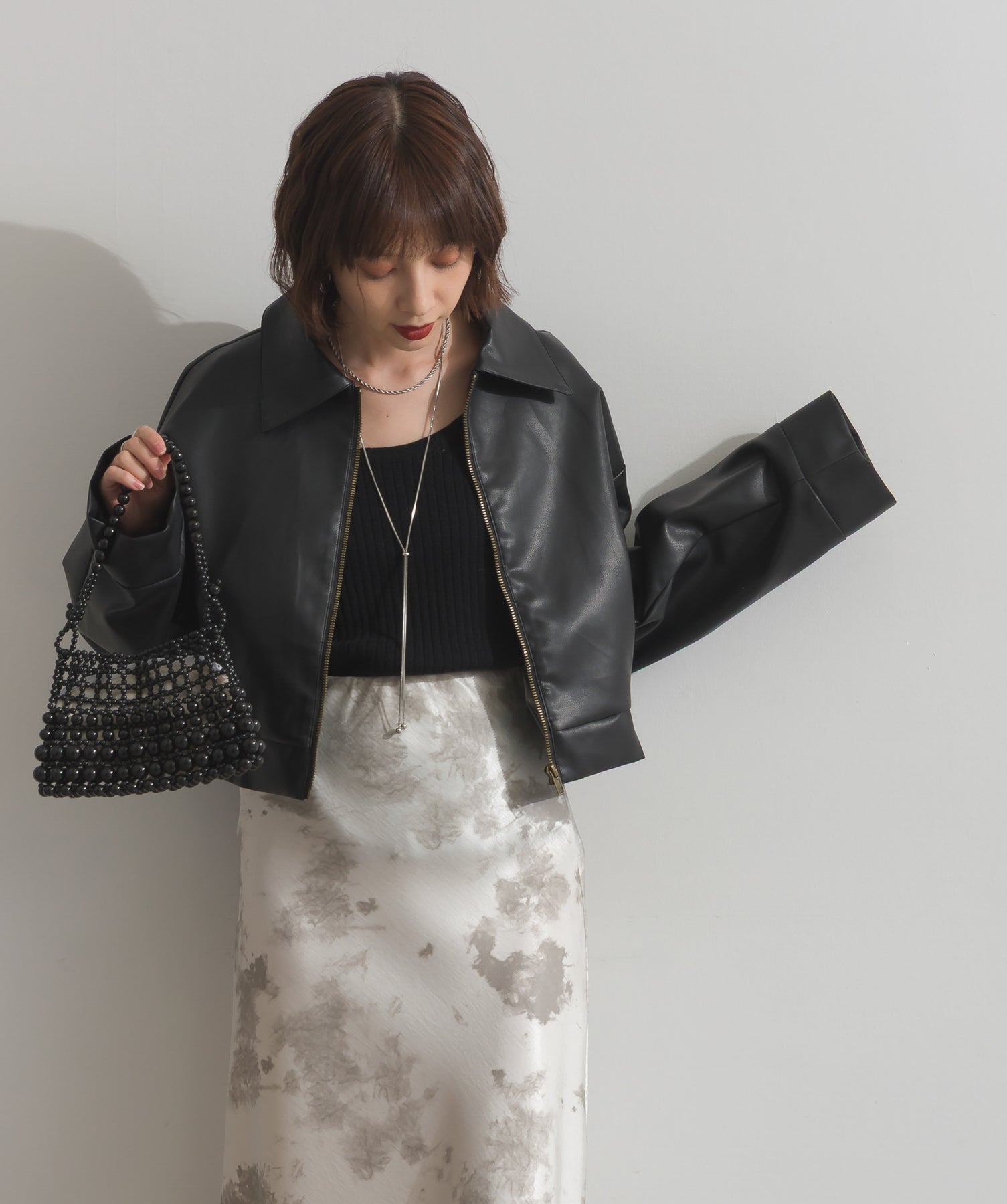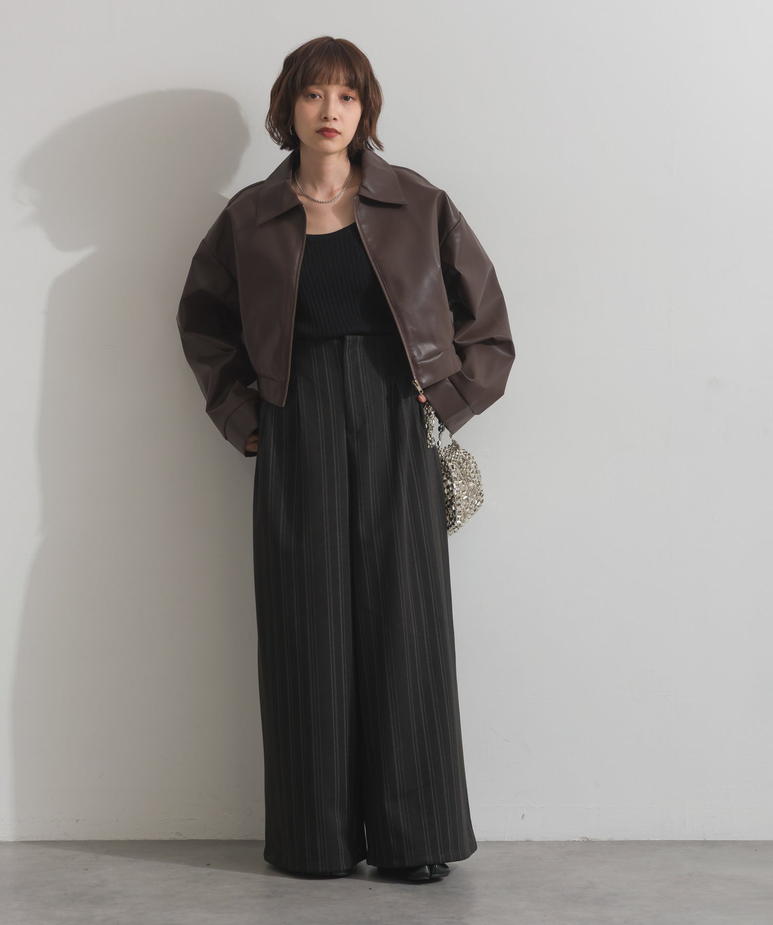 シンプルで映える。洗練された存在感を纏うモードブルゾン-material-フェイクレザー素材を使用。マットな光沢感としなやかなハリ感が特徴で、程よく肉厚な生地がシルエットを美しく保ちます。軽量でストレスの少ない着心地ながら、しっかりと存在感のあるルックスを演出します。-design-クラシカルな襟付きデザインに、程よくドロップしたショルダーラインとワイドスリーブがモードな抜け感をプラス。ウエストラインにかけて自然に絞られたコンパクトな丈感が、どんなボトムスとも好相性。フロントはミニマルなジップ仕様で、洗練された印象に。羽織るだけでスタイリングが決まる、主役級の一着です。