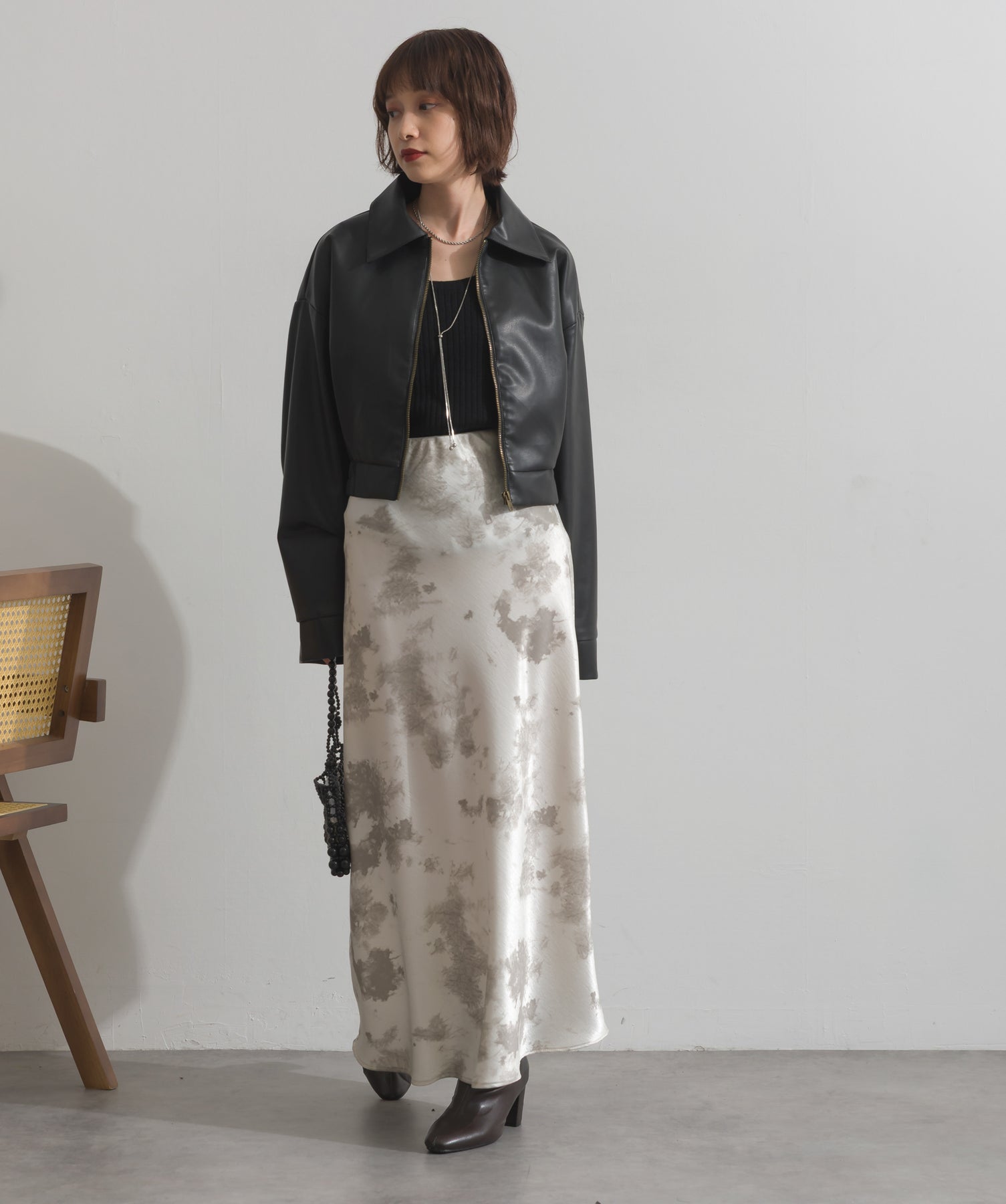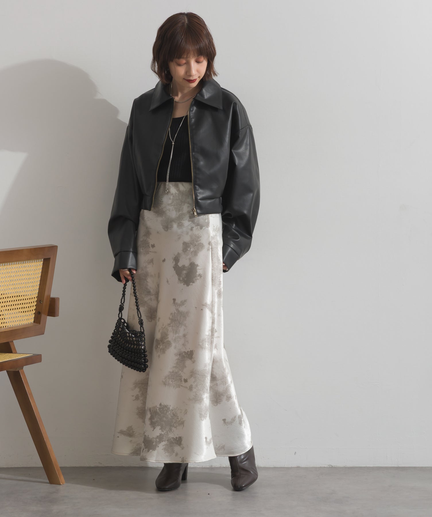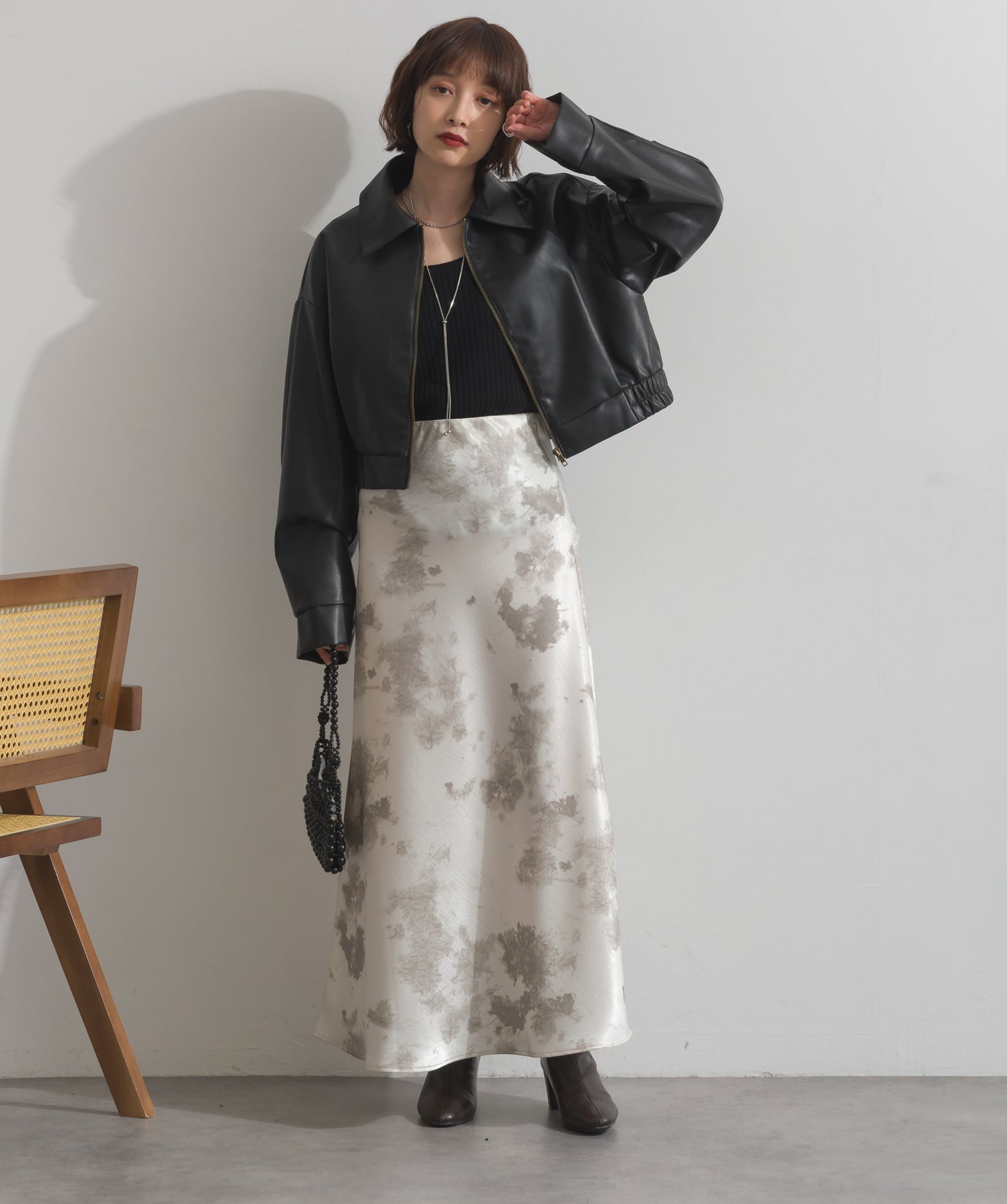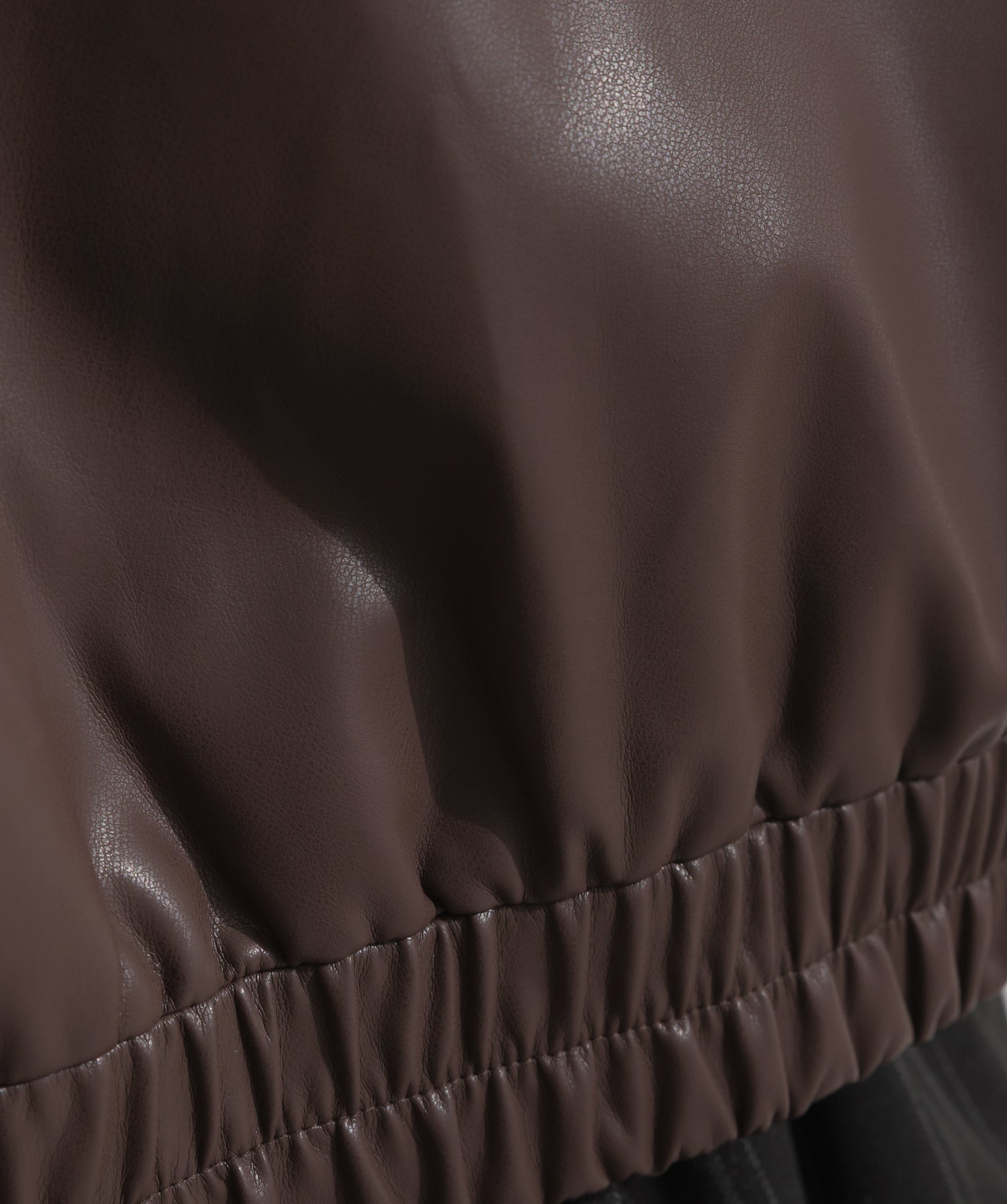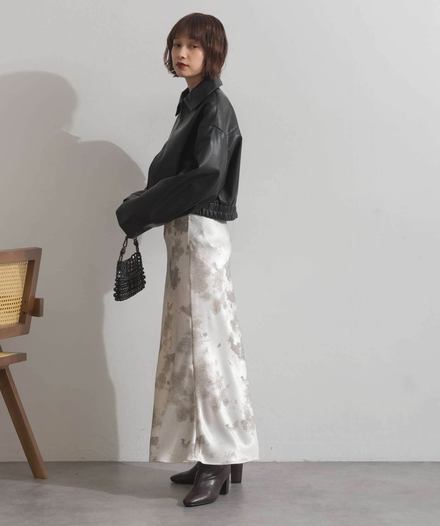 シンプルで映える。洗練された存在感を纏うモードブルゾン-material-フェイクレザー素材を使用。マットな光沢感としなやかなハリ感が特徴で、程よく肉厚な生地がシルエットを美しく保ちます。軽量でストレスの少ない着心地ながら、しっかりと存在感のあるルックスを演出します。-design-クラシカルな襟付きデザインに、程よくドロップしたショルダーラインとワイドスリーブがモードな抜け感をプラス。ウエストラインにかけて自然に絞られたコンパクトな丈感が、どんなボトムスとも好相性。フロントはミニマルなジップ仕様で、洗練された印象に。羽織るだけでスタイリングが決まる、主役級の一着です。