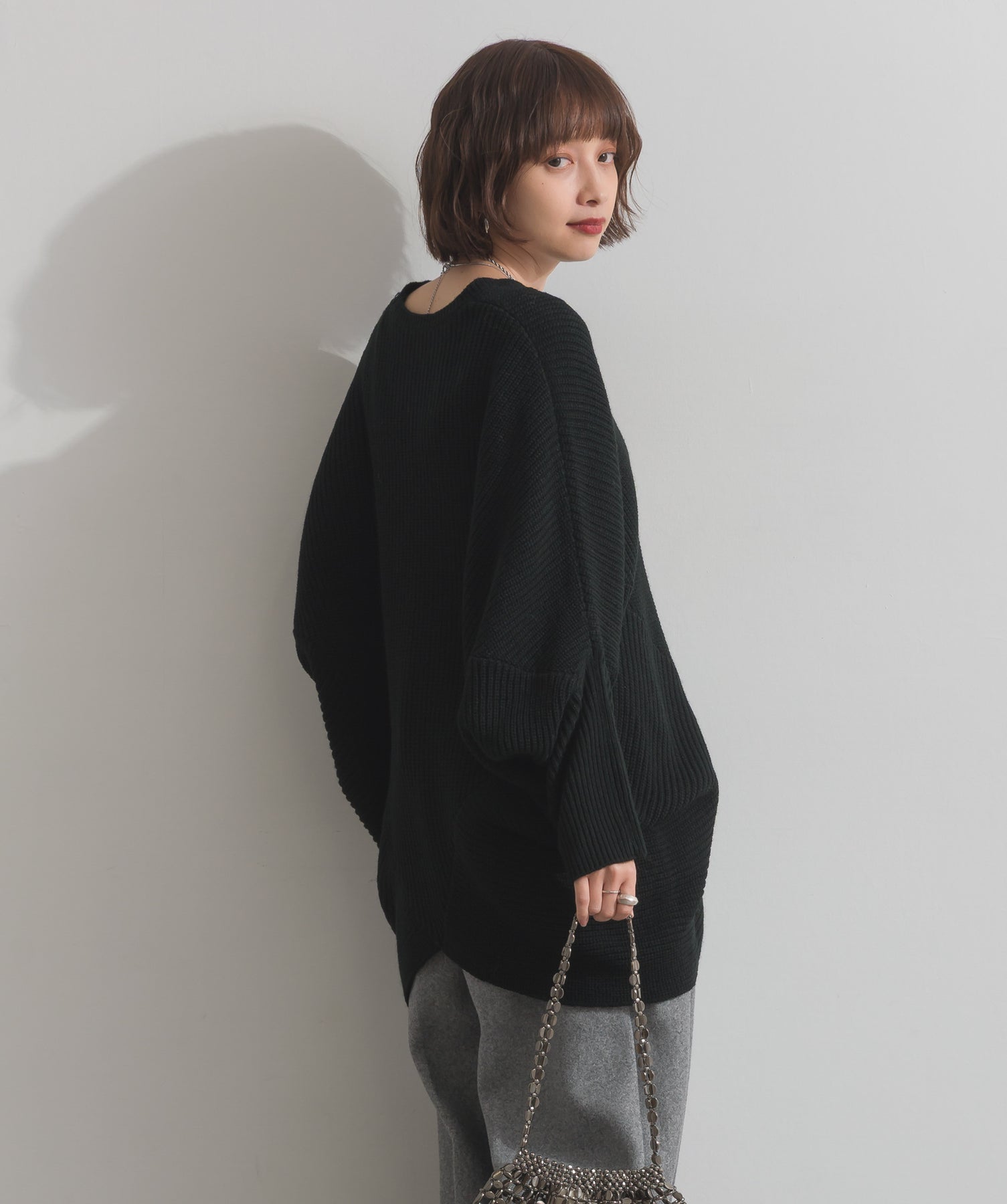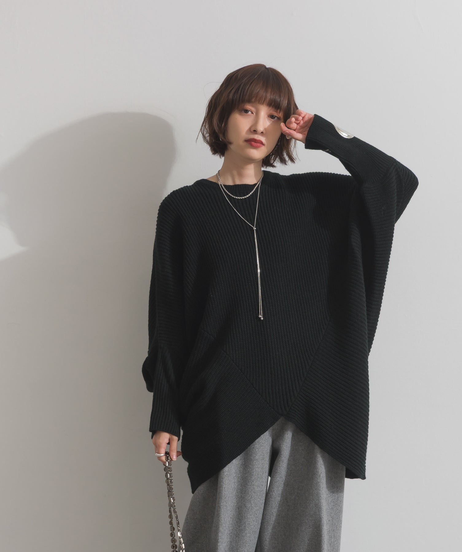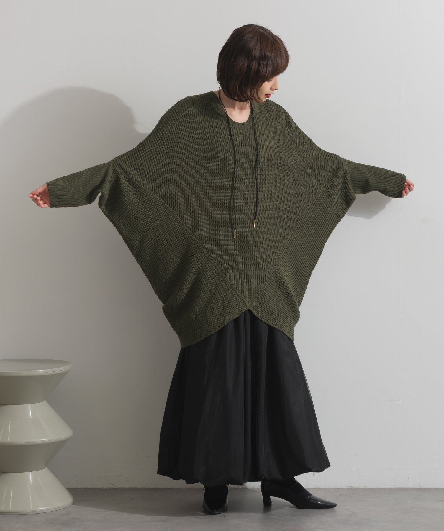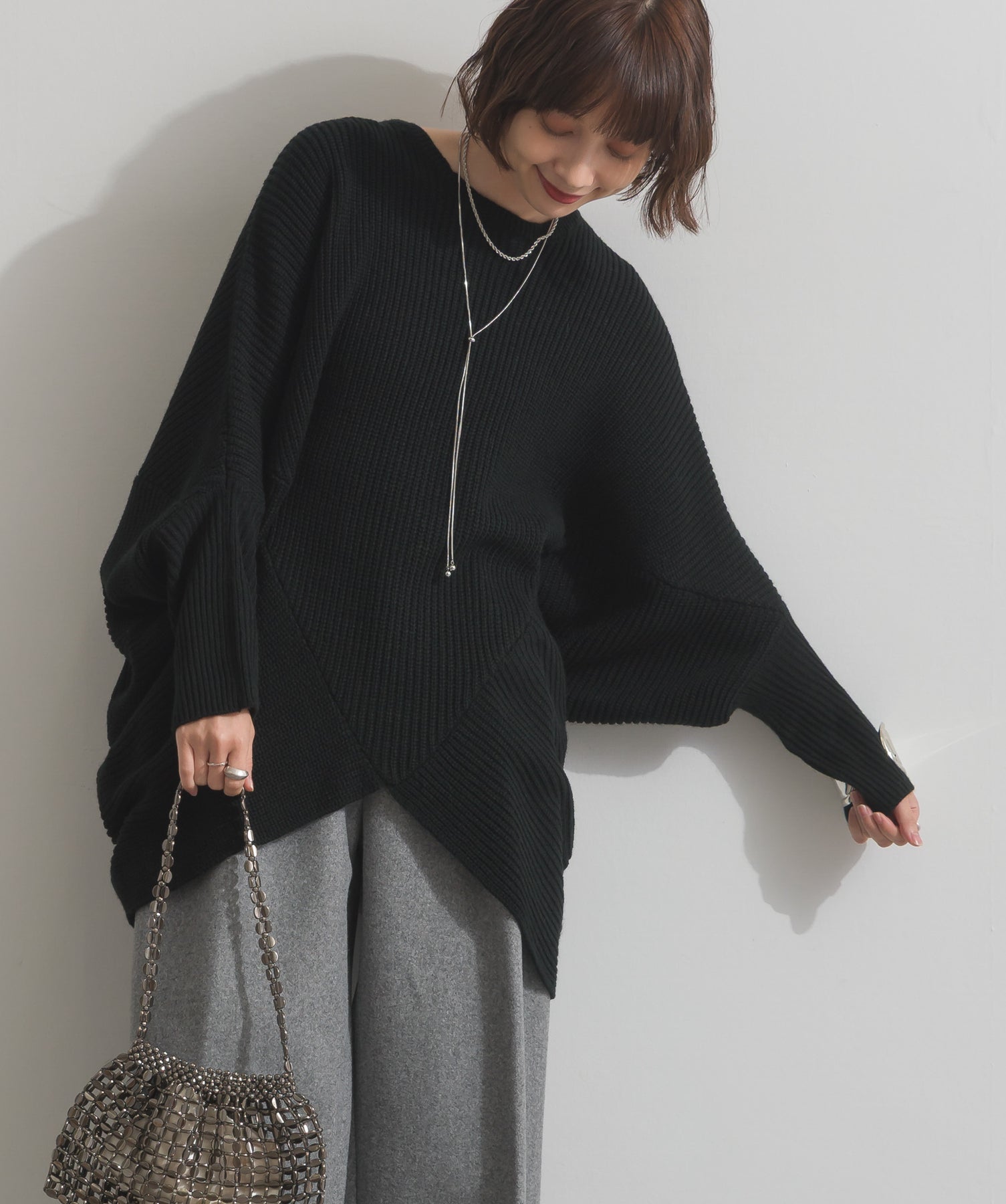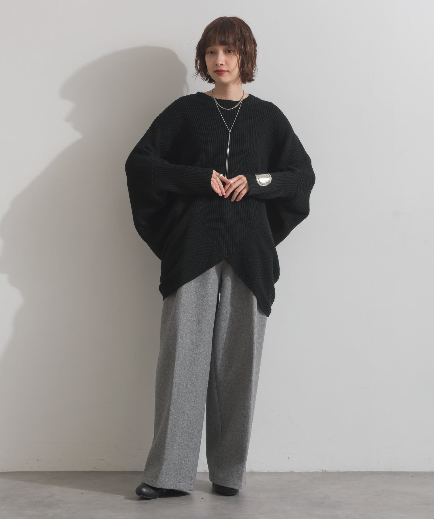 包み込むような存在感。動きを纏うドルマンニット。-material-柔らかな風合いと軽やかさを両立したアクリルニット素材を使用。しっかりとした肉感がありながらも、ふわっと包み込むような着心地を実現します。肌寒い季節も快適に過ごせる保温性が魅力です。-design-大胆なドレープとルーズなドルマンスリーブが描く立体シルエットが、他にはない抜け感とモードなムードを演出します。サイドからバックにかけての自然な落ち感が動きを美しく見せ、どんな角度からも様になる仕上がりに。ヒップラインをカバーする着丈で、細身ボトムやワイドパンツとも好相性。1枚で洒落感が決まる、存在感抜群の主役ニットです。