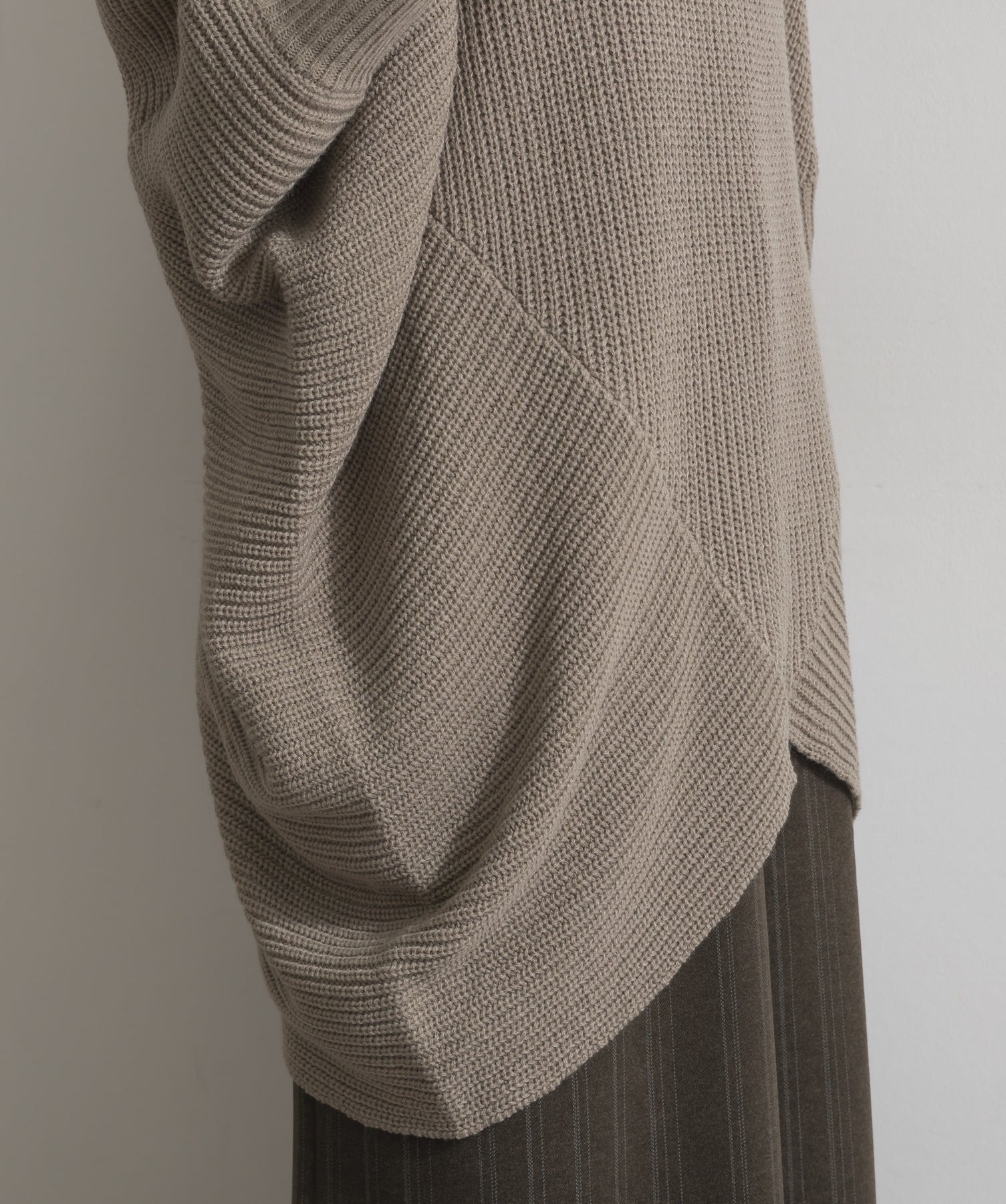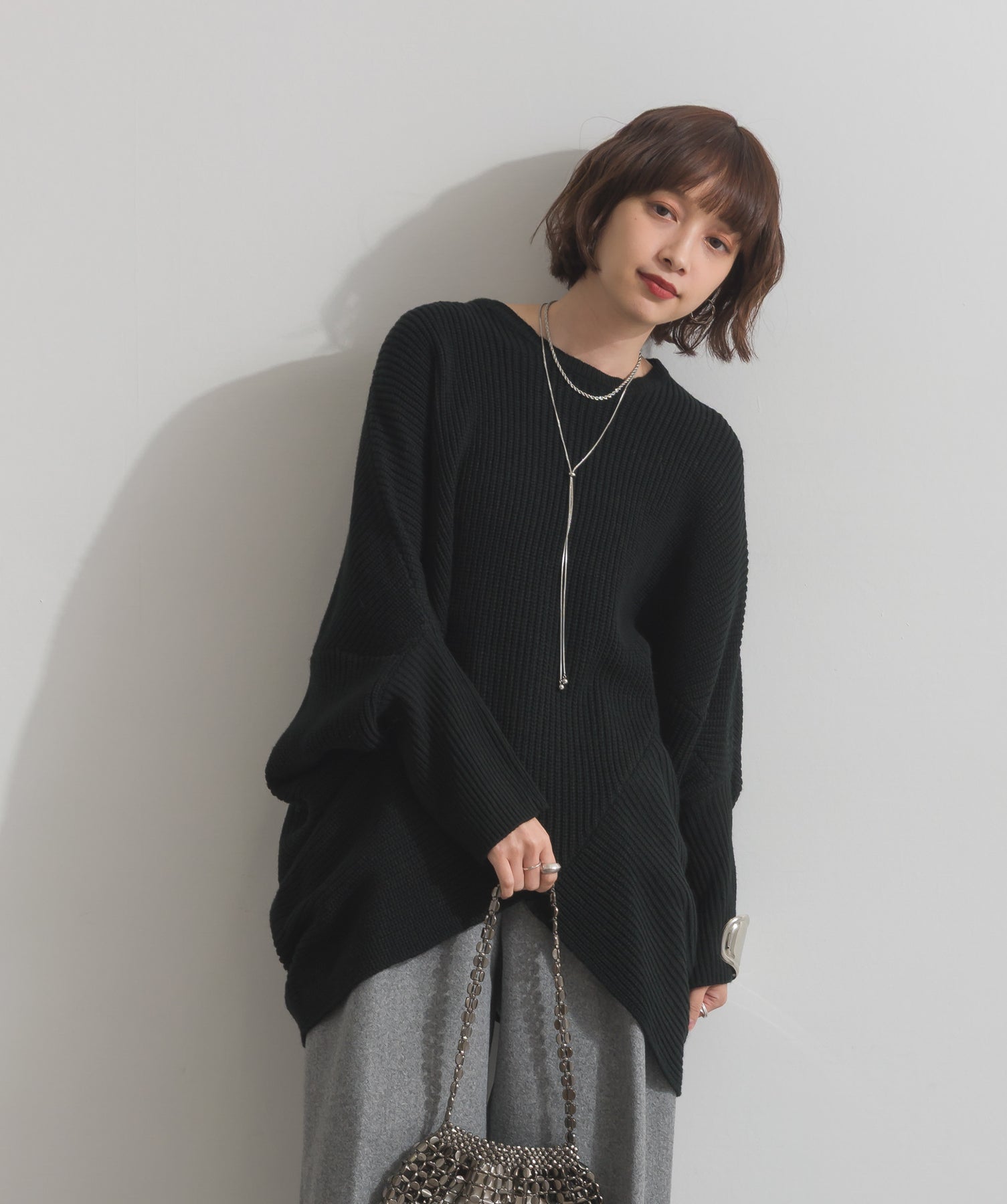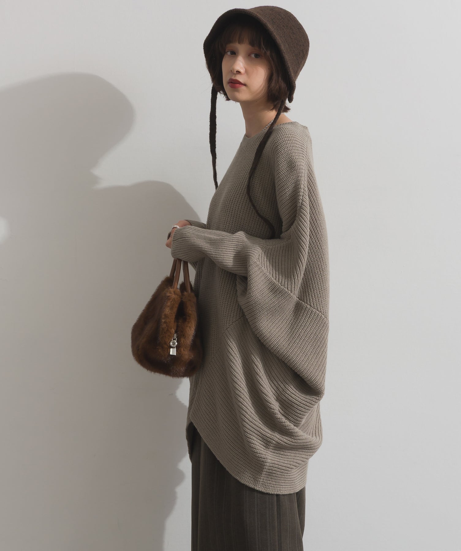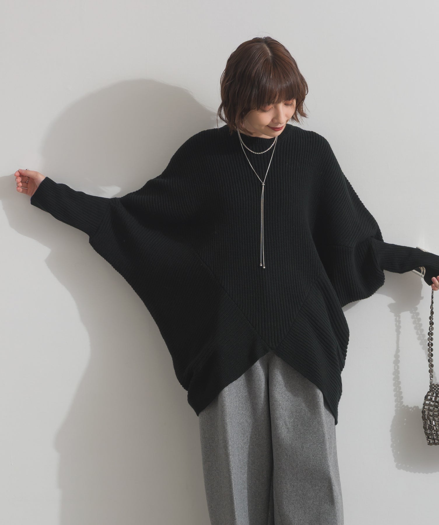 包み込むような存在感。動きを纏うドルマンニット。-material-柔らかな風合いと軽やかさを両立したアクリルニット素材を使用。しっかりとした肉感がありながらも、ふわっと包み込むような着心地を実現します。肌寒い季節も快適に過ごせる保温性が魅力です。-design-大胆なドレープとルーズなドルマンスリーブが描く立体シルエットが、他にはない抜け感とモードなムードを演出します。サイドからバックにかけての自然な落ち感が動きを美しく見せ、どんな角度からも様になる仕上がりに。ヒップラインをカバーする着丈で、細身ボトムやワイドパンツとも好相性。1枚で洒落感が決まる、存在感抜群の主役ニットです。