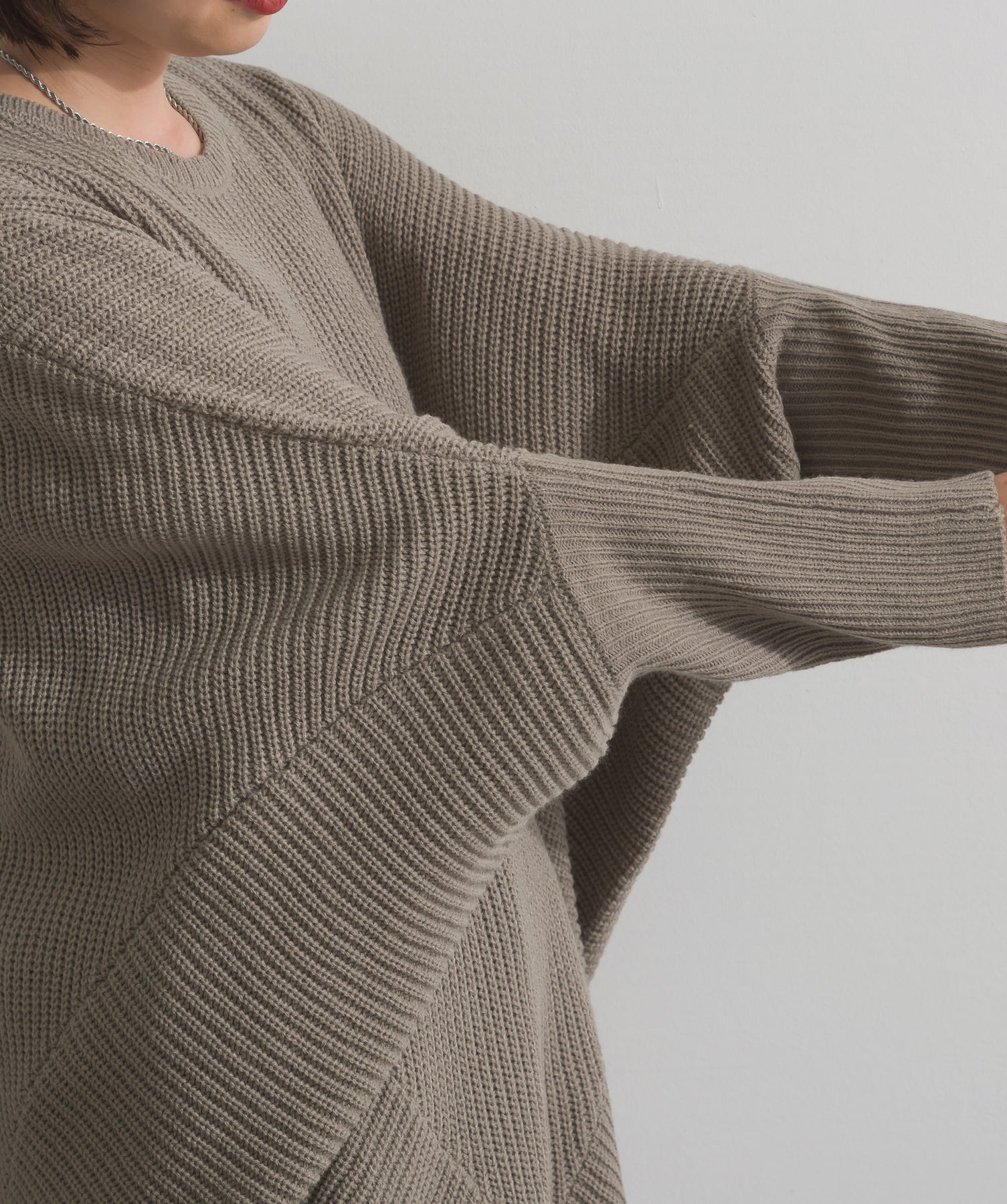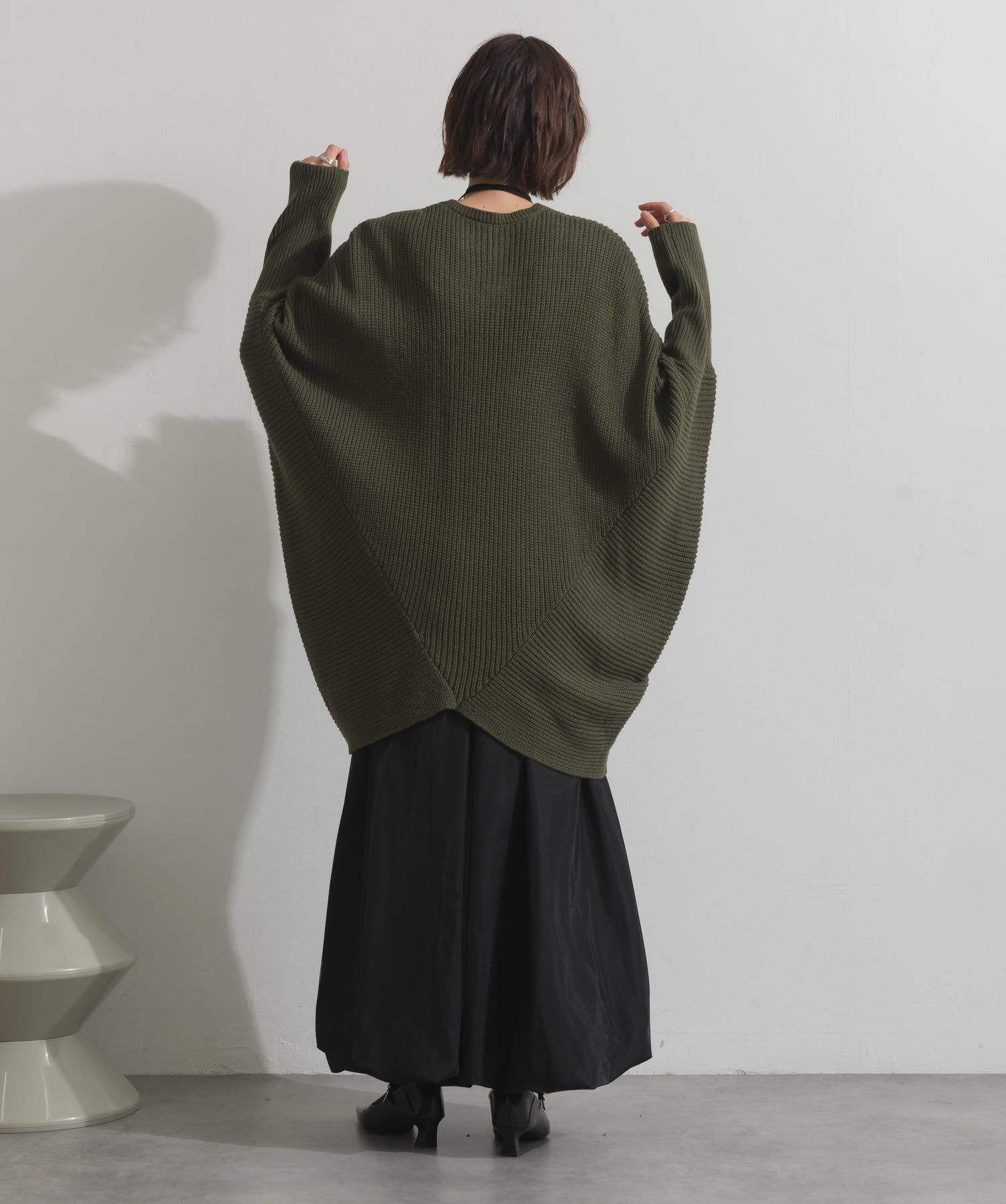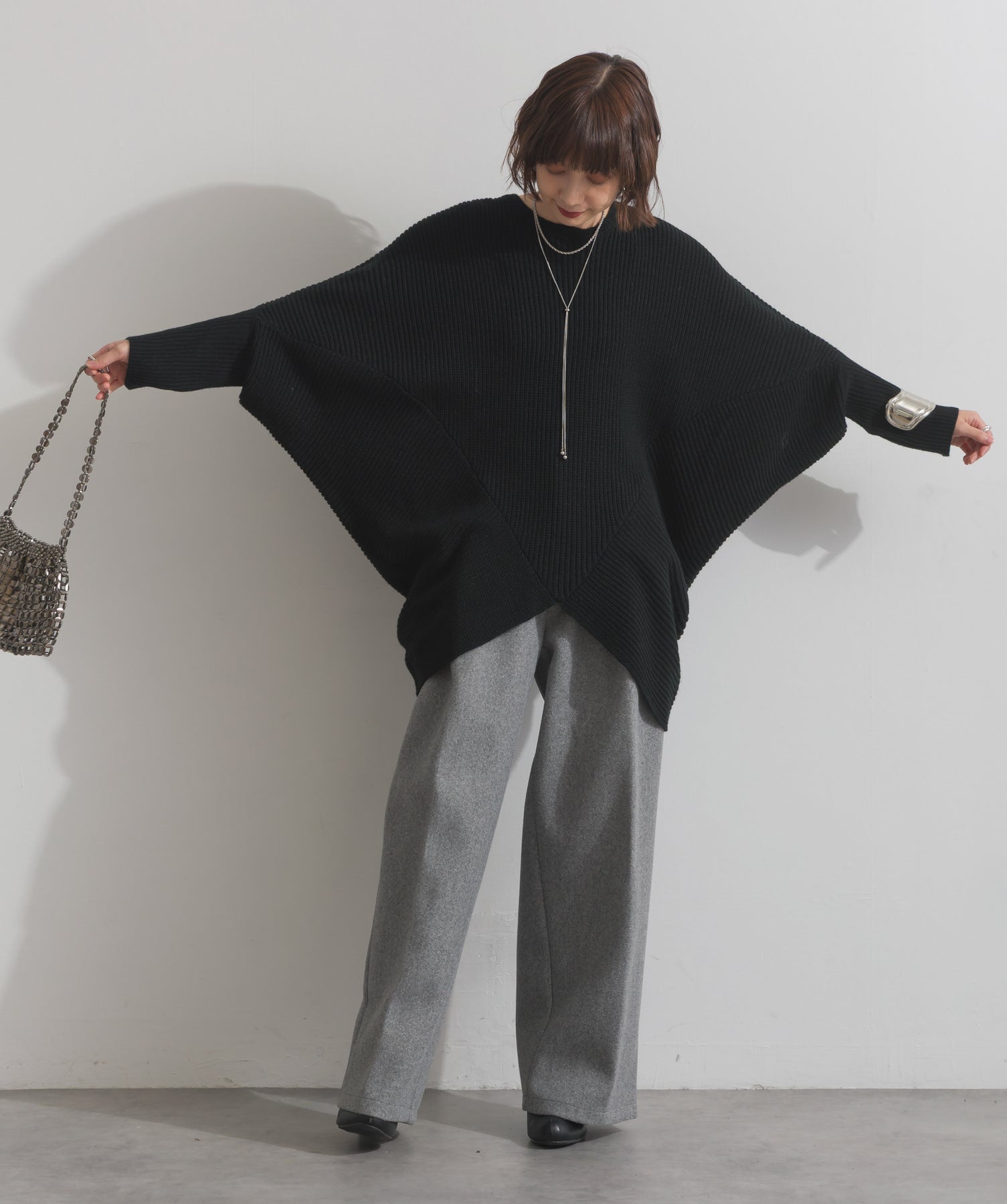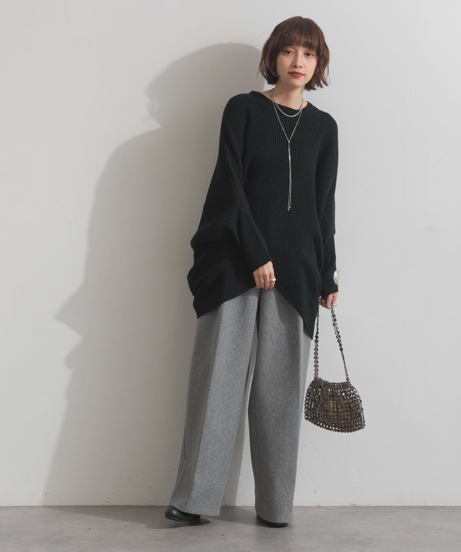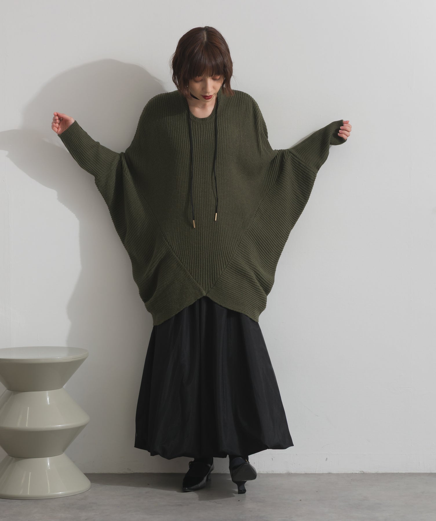 包み込むような存在感。動きを纏うドルマンニット。-material-柔らかな風合いと軽やかさを両立したアクリルニット素材を使用。しっかりとした肉感がありながらも、ふわっと包み込むような着心地を実現します。肌寒い季節も快適に過ごせる保温性が魅力です。-design-大胆なドレープとルーズなドルマンスリーブが描く立体シルエットが、他にはない抜け感とモードなムードを演出します。サイドからバックにかけての自然な落ち感が動きを美しく見せ、どんな角度からも様になる仕上がりに。ヒップラインをカバーする着丈で、細身ボトムやワイドパンツとも好相性。1枚で洒落感が決まる、存在感抜群の主役ニットです。