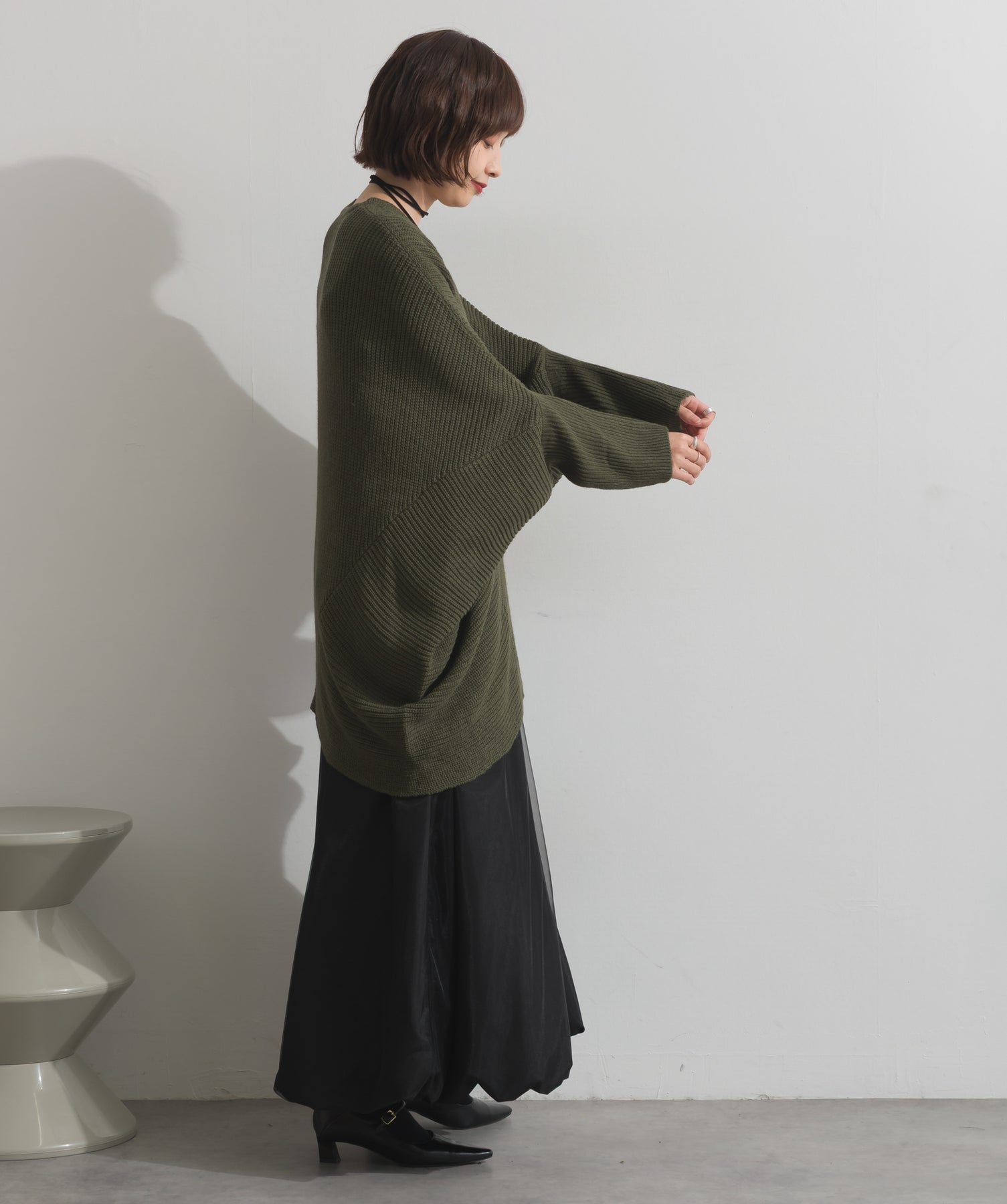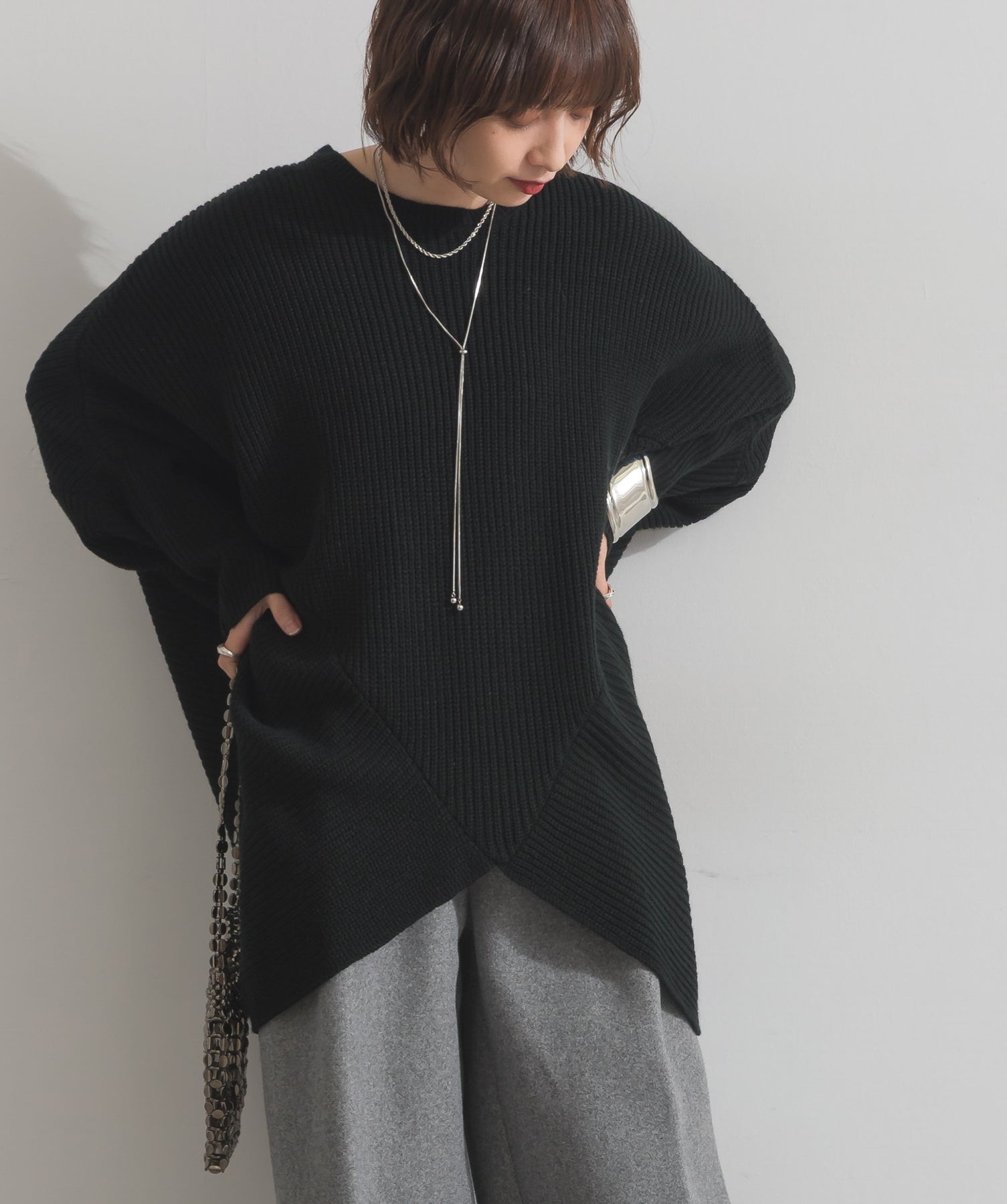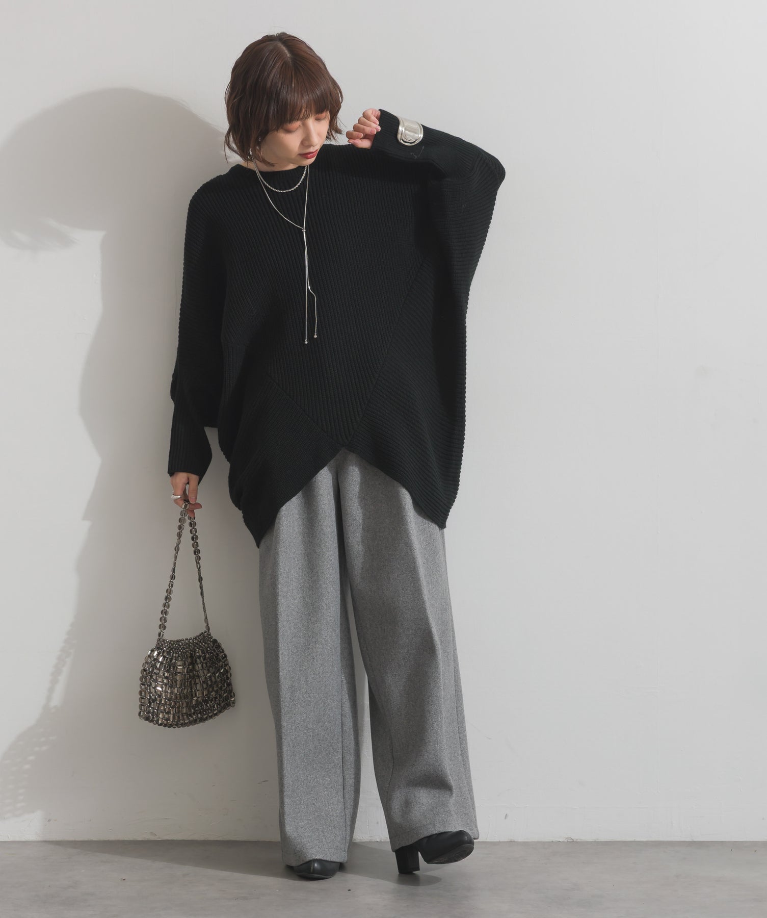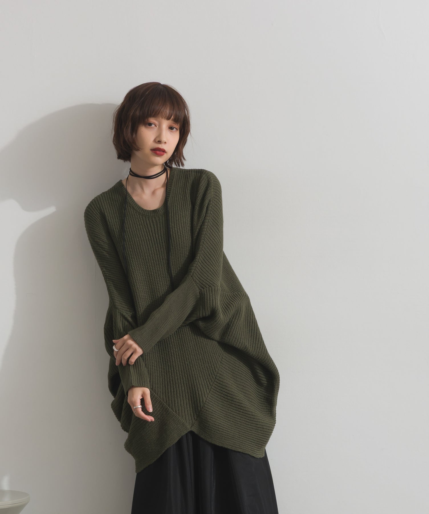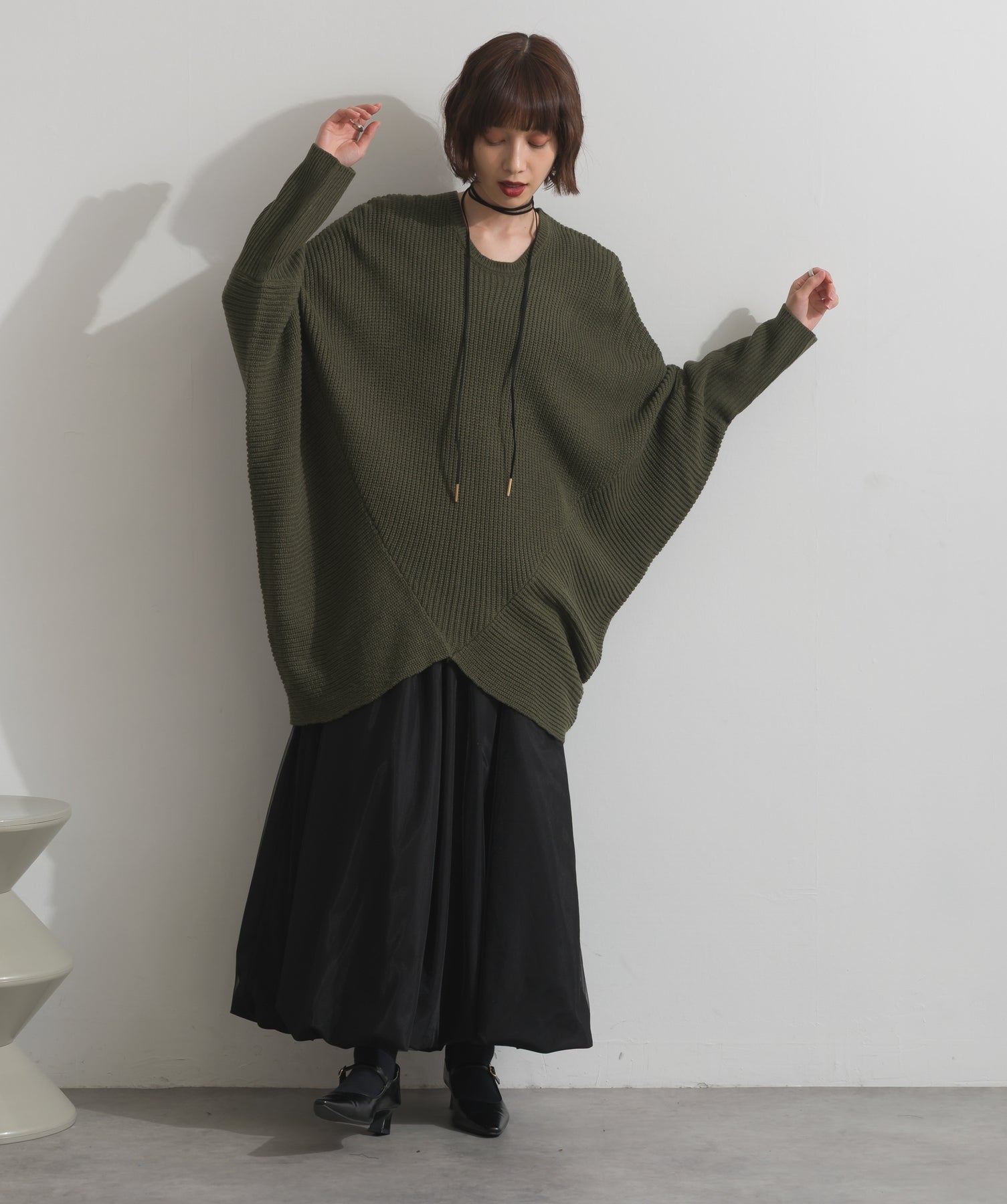 包み込むような存在感。動きを纏うドルマンニット。-material-柔らかな風合いと軽やかさを両立したアクリルニット素材を使用。しっかりとした肉感がありながらも、ふわっと包み込むような着心地を実現します。肌寒い季節も快適に過ごせる保温性が魅力です。-design-大胆なドレープとルーズなドルマンスリーブが描く立体シルエットが、他にはない抜け感とモードなムードを演出します。サイドからバックにかけての自然な落ち感が動きを美しく見せ、どんな角度からも様になる仕上がりに。ヒップラインをカバーする着丈で、細身ボトムやワイドパンツとも好相性。1枚で洒落感が決まる、存在感抜群の主役ニットです。