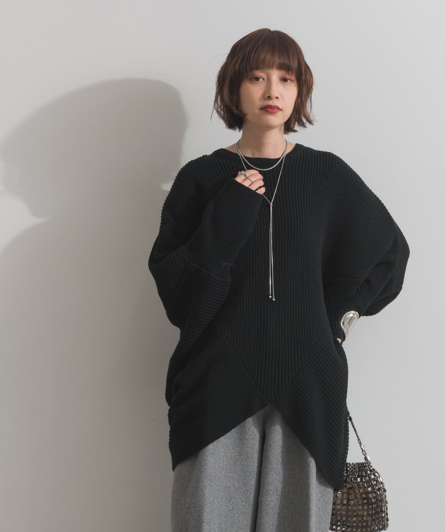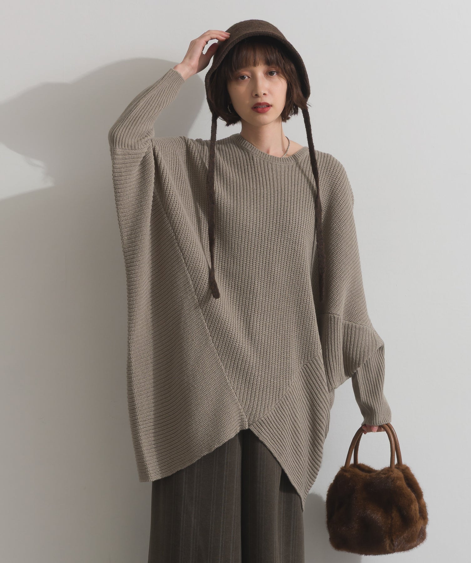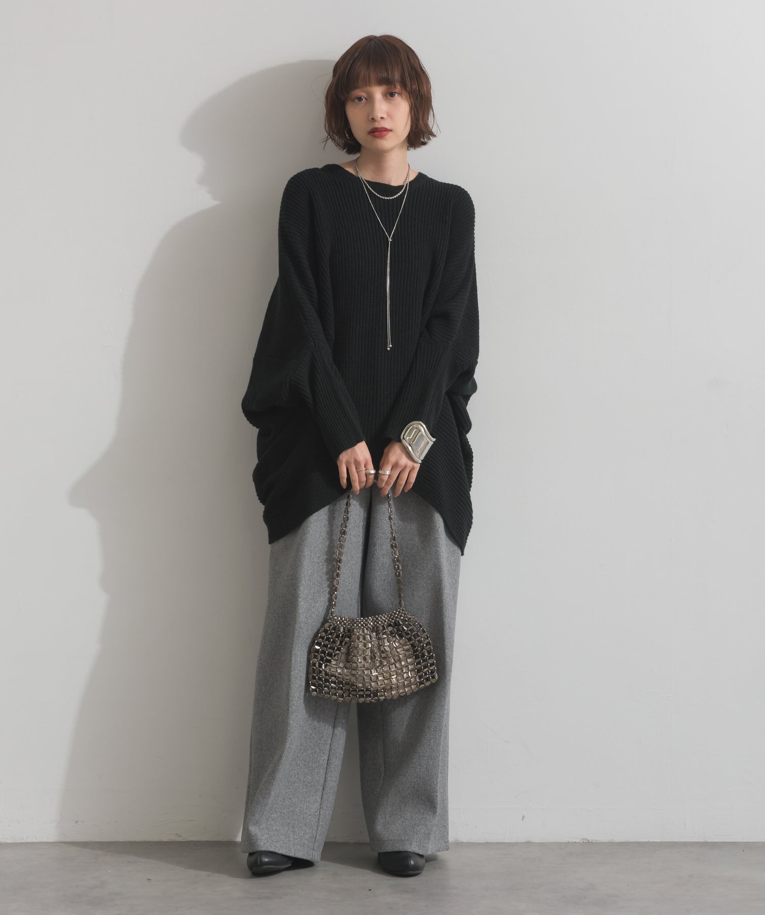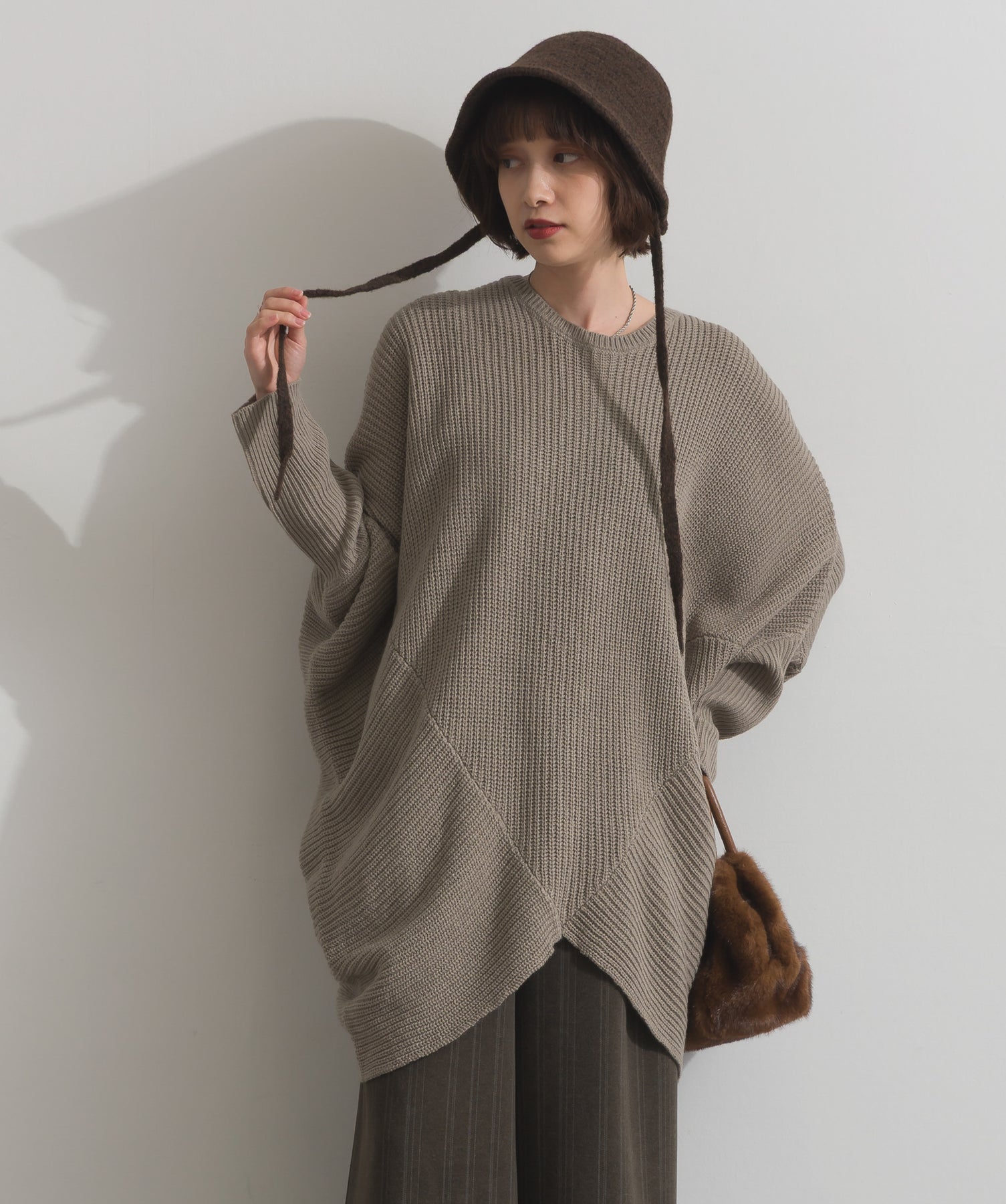 包み込むような存在感。動きを纏うドルマンニット。-material-柔らかな風合いと軽やかさを両立したアクリルニット素材を使用。しっかりとした肉感がありながらも、ふわっと包み込むような着心地を実現します。肌寒い季節も快適に過ごせる保温性が魅力です。-design-大胆なドレープとルーズなドルマンスリーブが描く立体シルエットが、他にはない抜け感とモードなムードを演出します。サイドからバックにかけての自然な落ち感が動きを美しく見せ、どんな角度からも様になる仕上がりに。ヒップラインをカバーする着丈で、細身ボトムやワイドパンツとも好相性。1枚で洒落感が決まる、存在感抜群の主役ニットです。