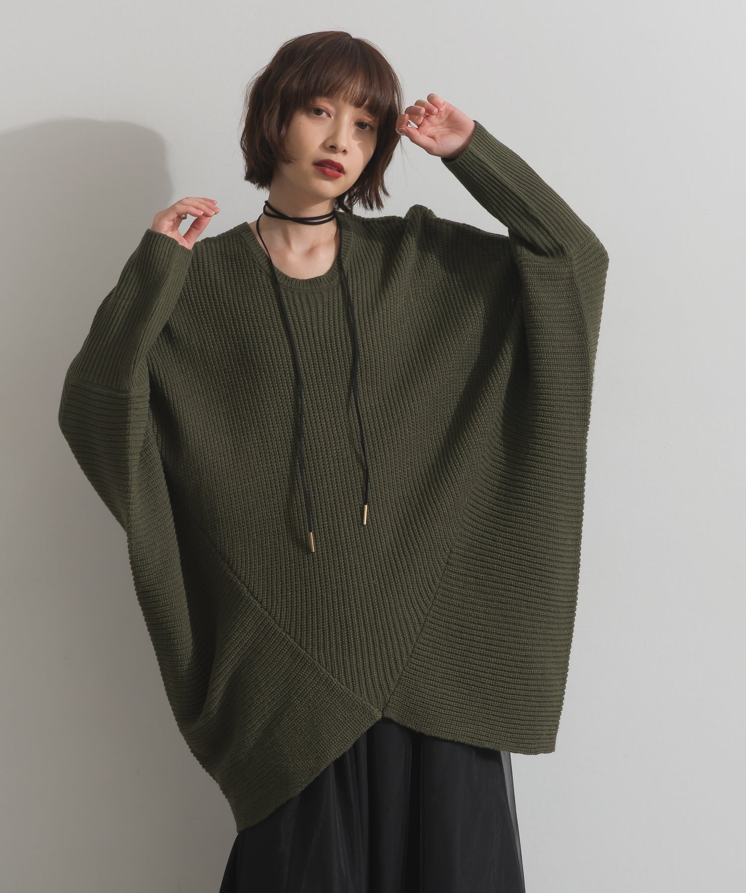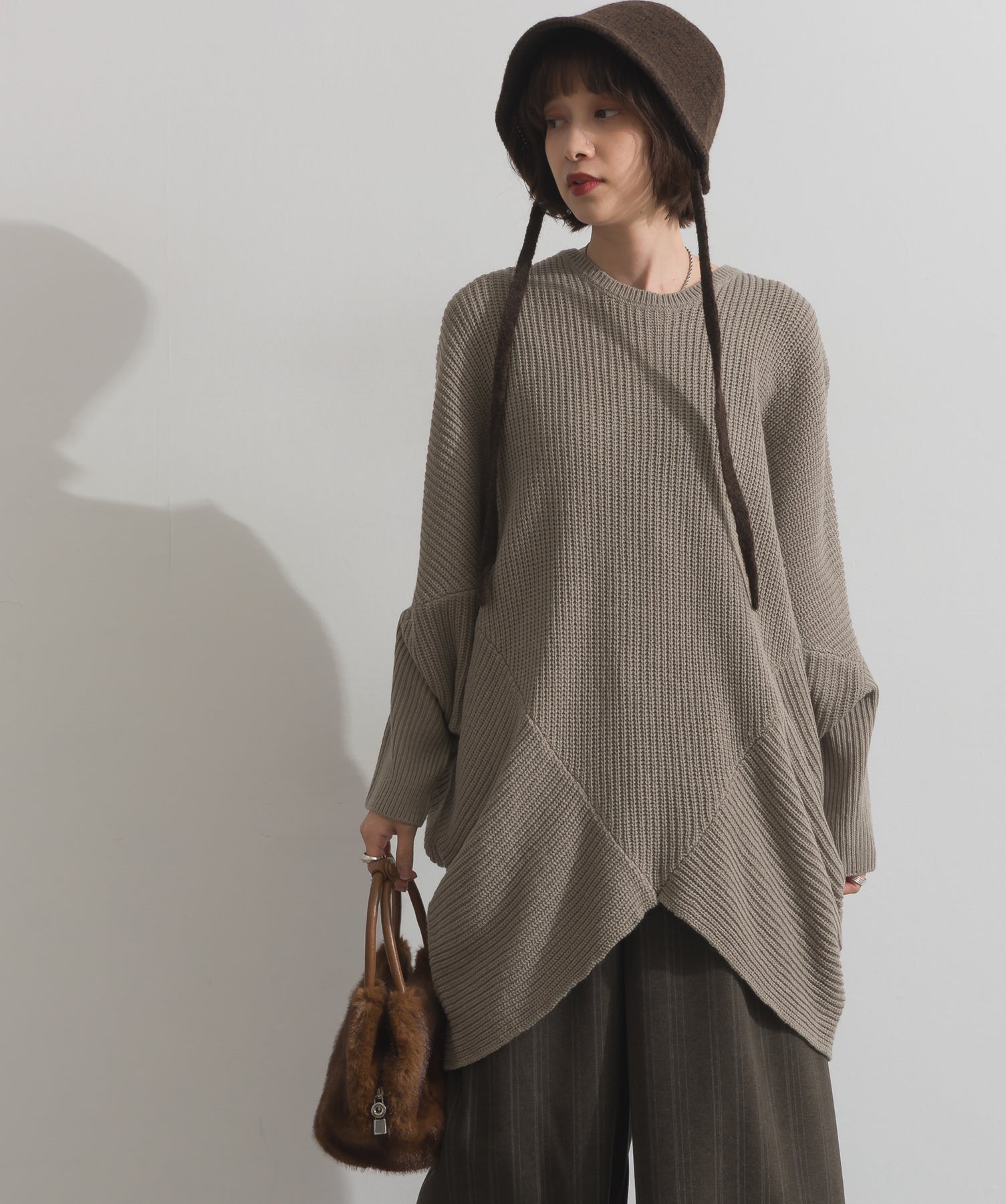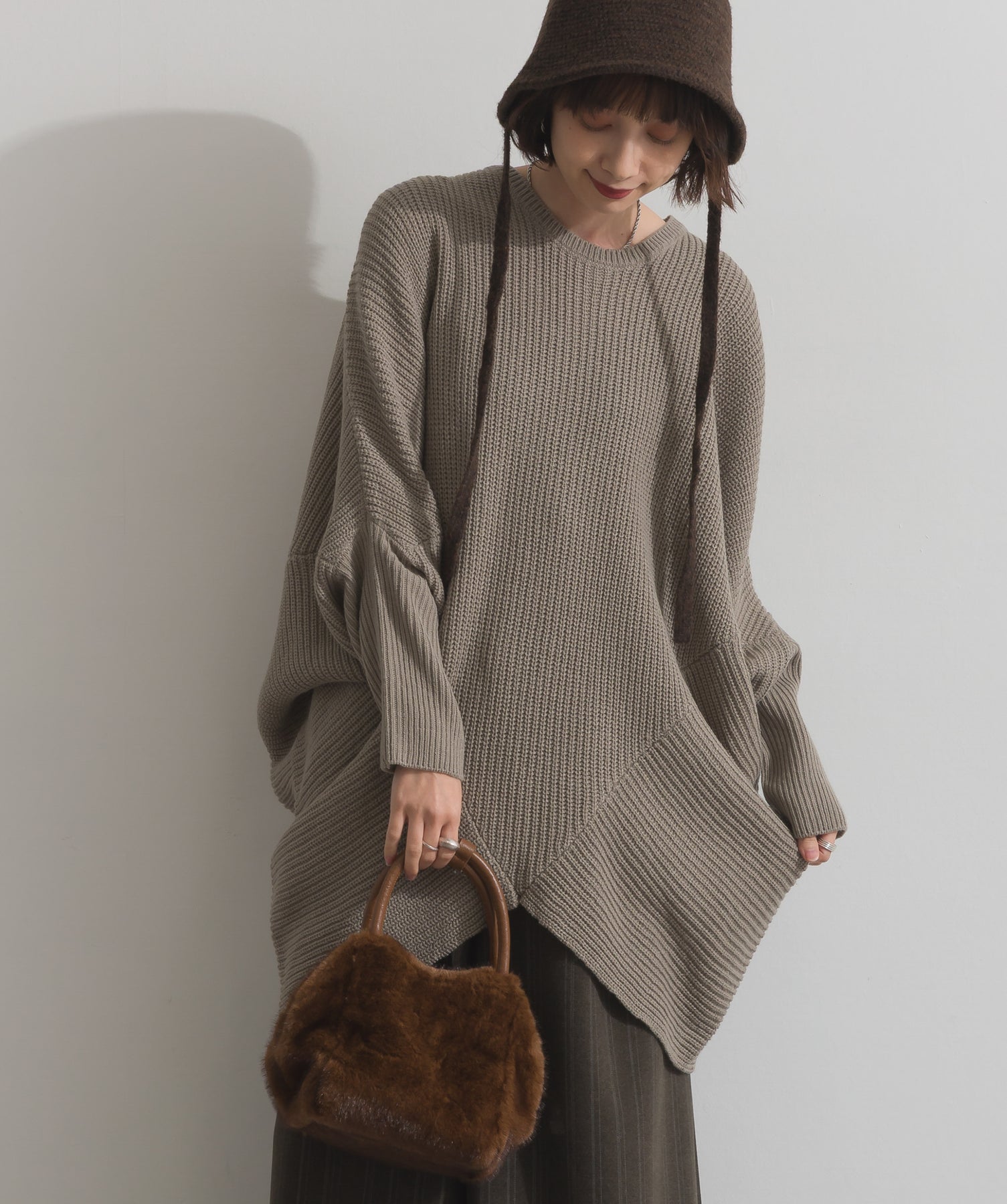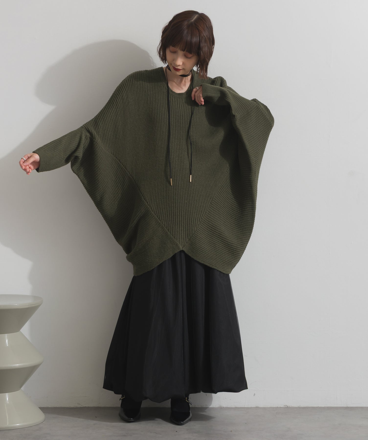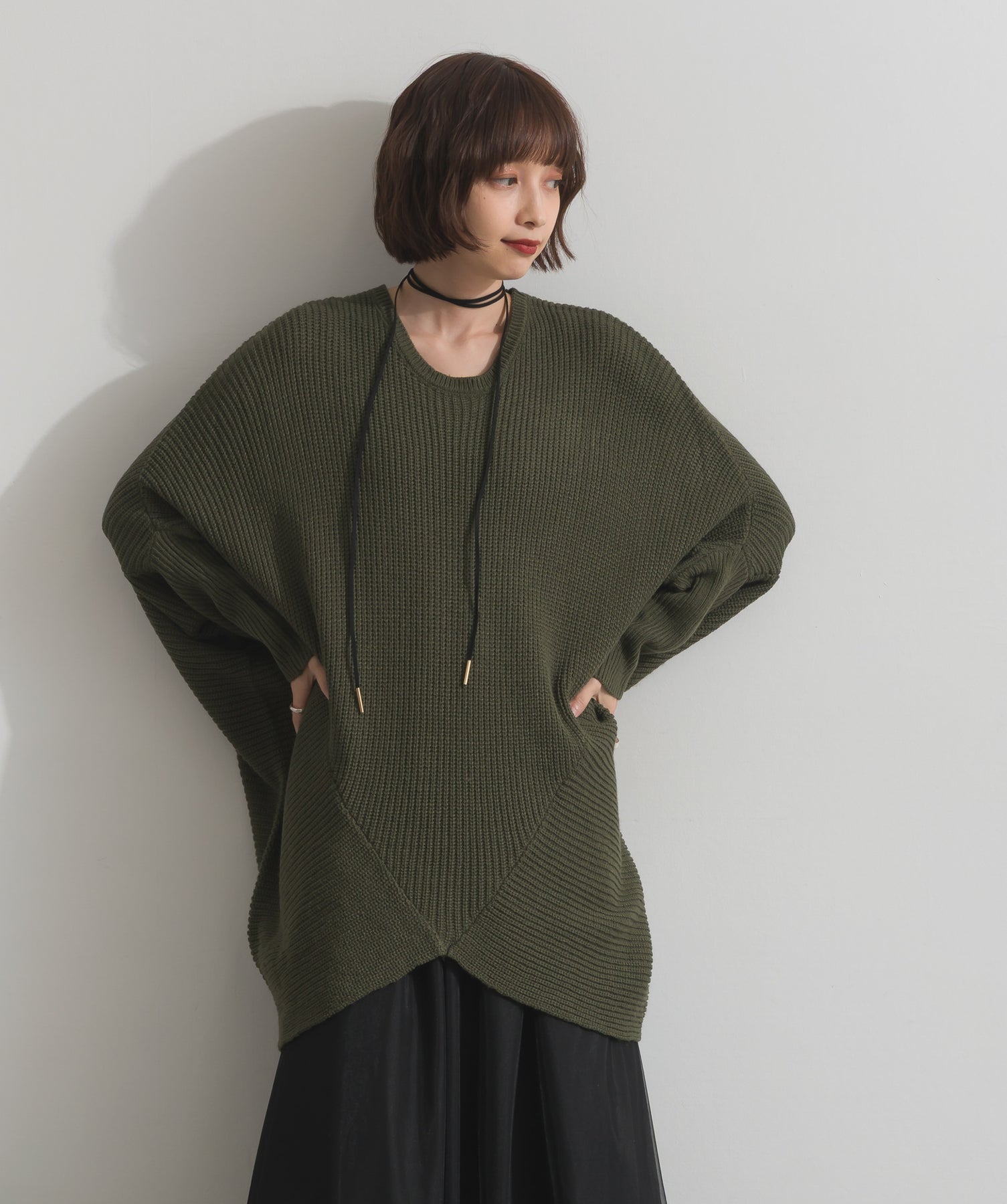 包み込むような存在感。動きを纏うドルマンニット。-material-柔らかな風合いと軽やかさを両立したアクリルニット素材を使用。しっかりとした肉感がありながらも、ふわっと包み込むような着心地を実現します。肌寒い季節も快適に過ごせる保温性が魅力です。-design-大胆なドレープとルーズなドルマンスリーブが描く立体シルエットが、他にはない抜け感とモードなムードを演出します。サイドからバックにかけての自然な落ち感が動きを美しく見せ、どんな角度からも様になる仕上がりに。ヒップラインをカバーする着丈で、細身ボトムやワイドパンツとも好相性。1枚で洒落感が決まる、存在感抜群の主役ニットです。