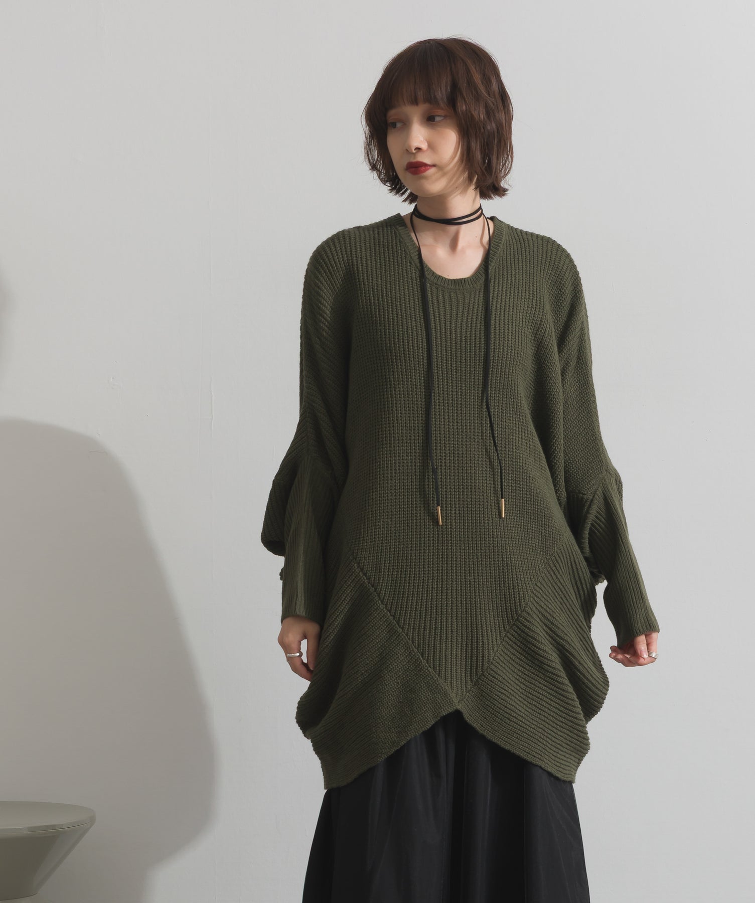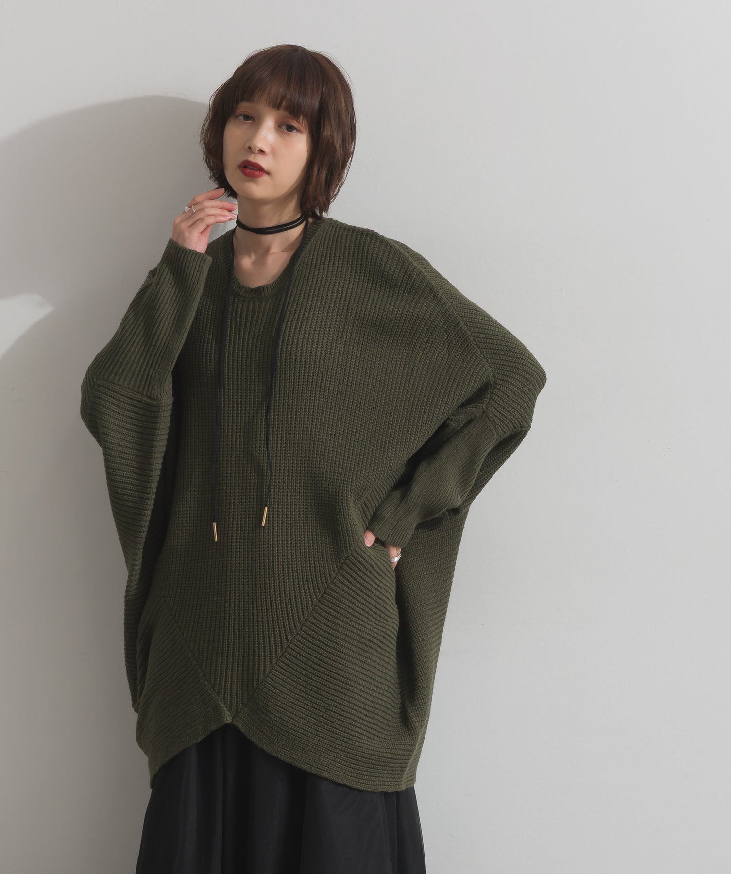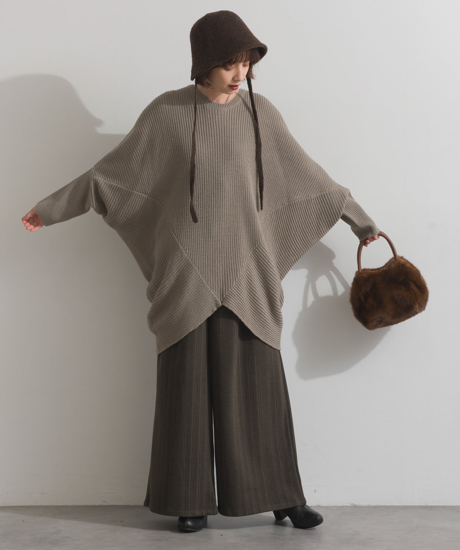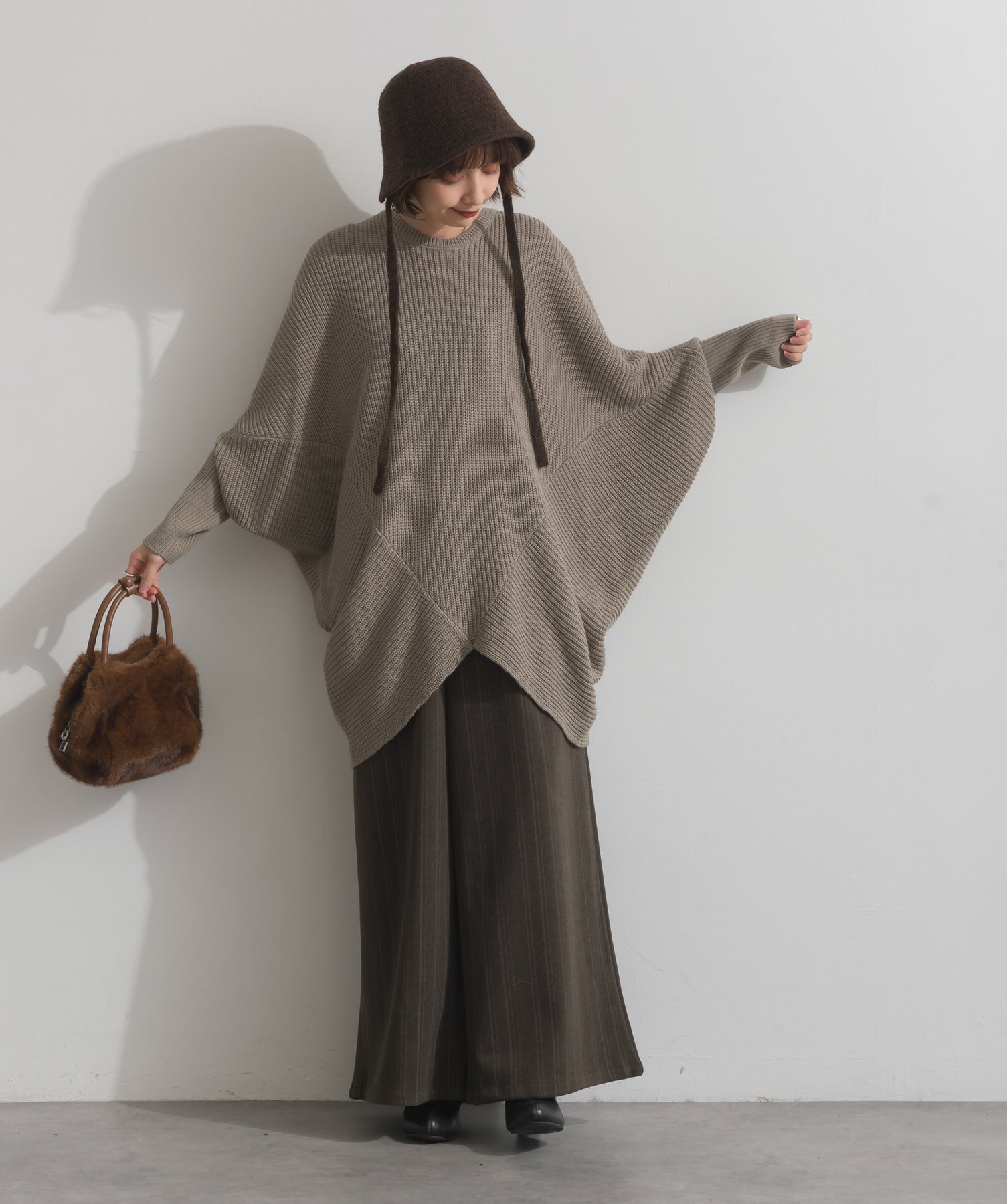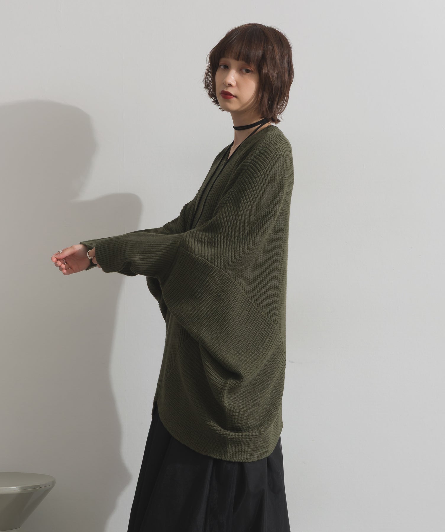 包み込むような存在感。動きを纏うドルマンニット。-material-柔らかな風合いと軽やかさを両立したアクリルニット素材を使用。しっかりとした肉感がありながらも、ふわっと包み込むような着心地を実現します。肌寒い季節も快適に過ごせる保温性が魅力です。-design-大胆なドレープとルーズなドルマンスリーブが描く立体シルエットが、他にはない抜け感とモードなムードを演出します。サイドからバックにかけての自然な落ち感が動きを美しく見せ、どんな角度からも様になる仕上がりに。ヒップラインをカバーする着丈で、細身ボトムやワイドパンツとも好相性。1枚で洒落感が決まる、存在感抜群の主役ニットです。