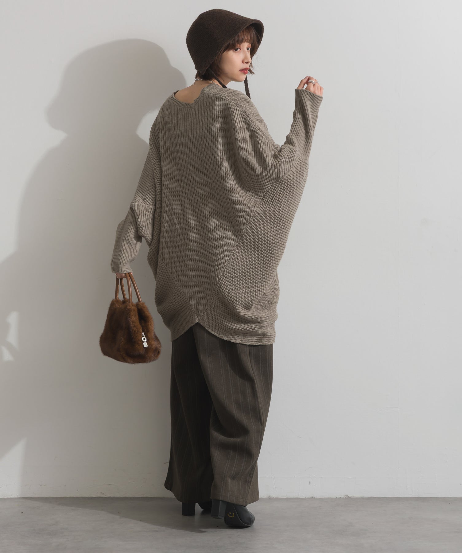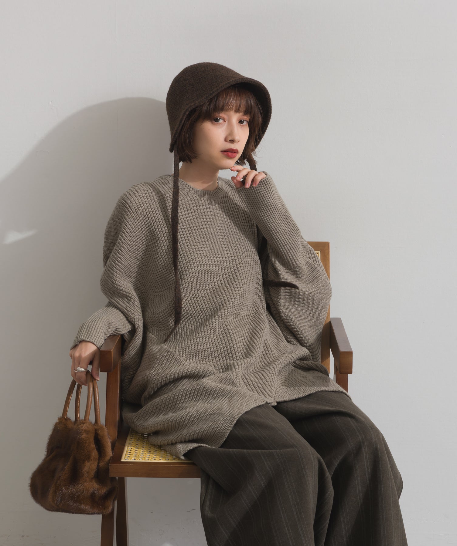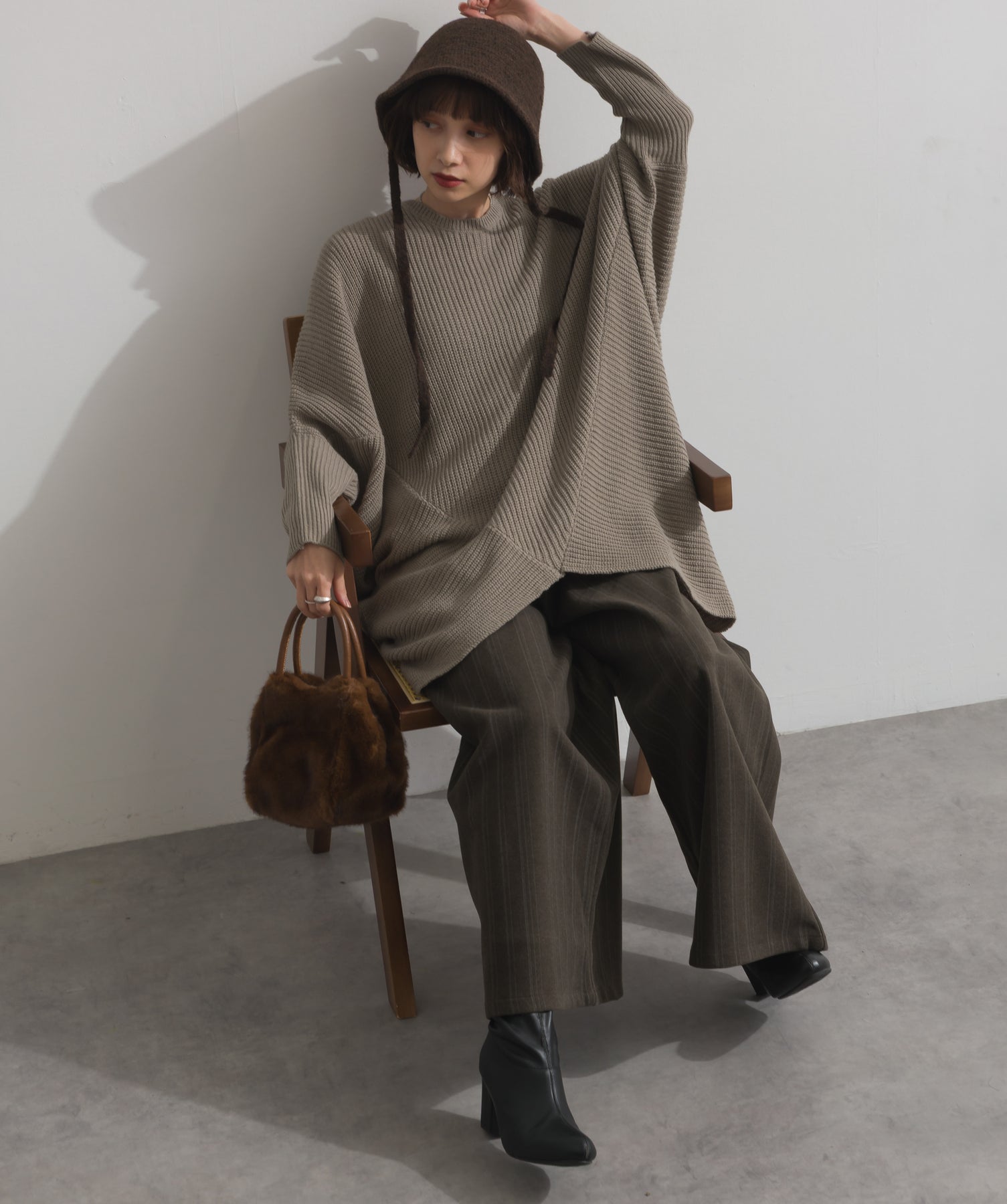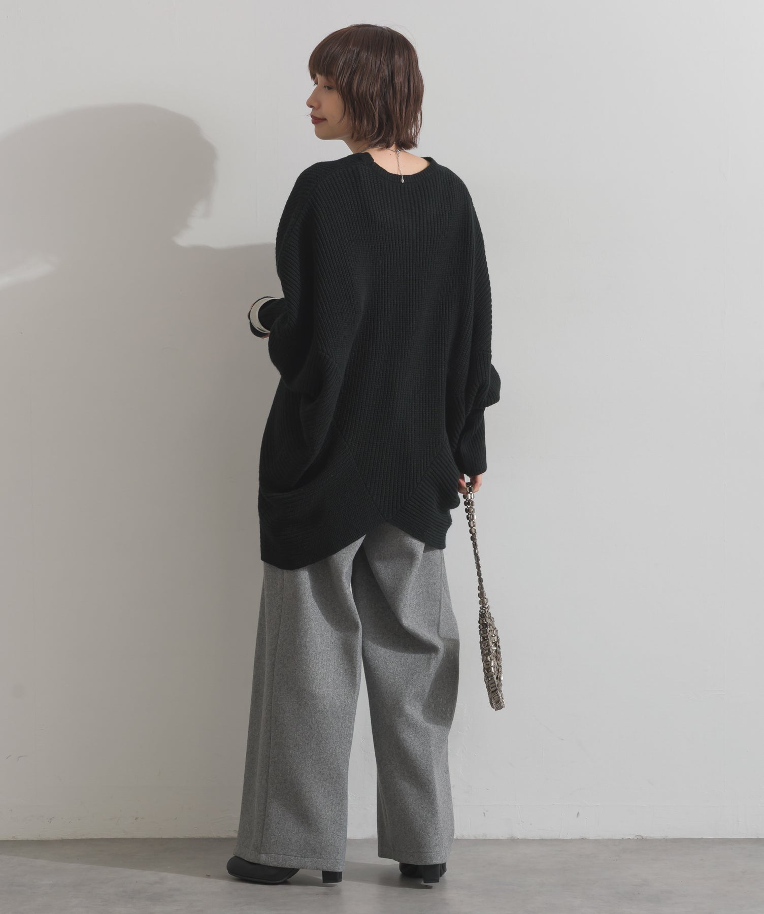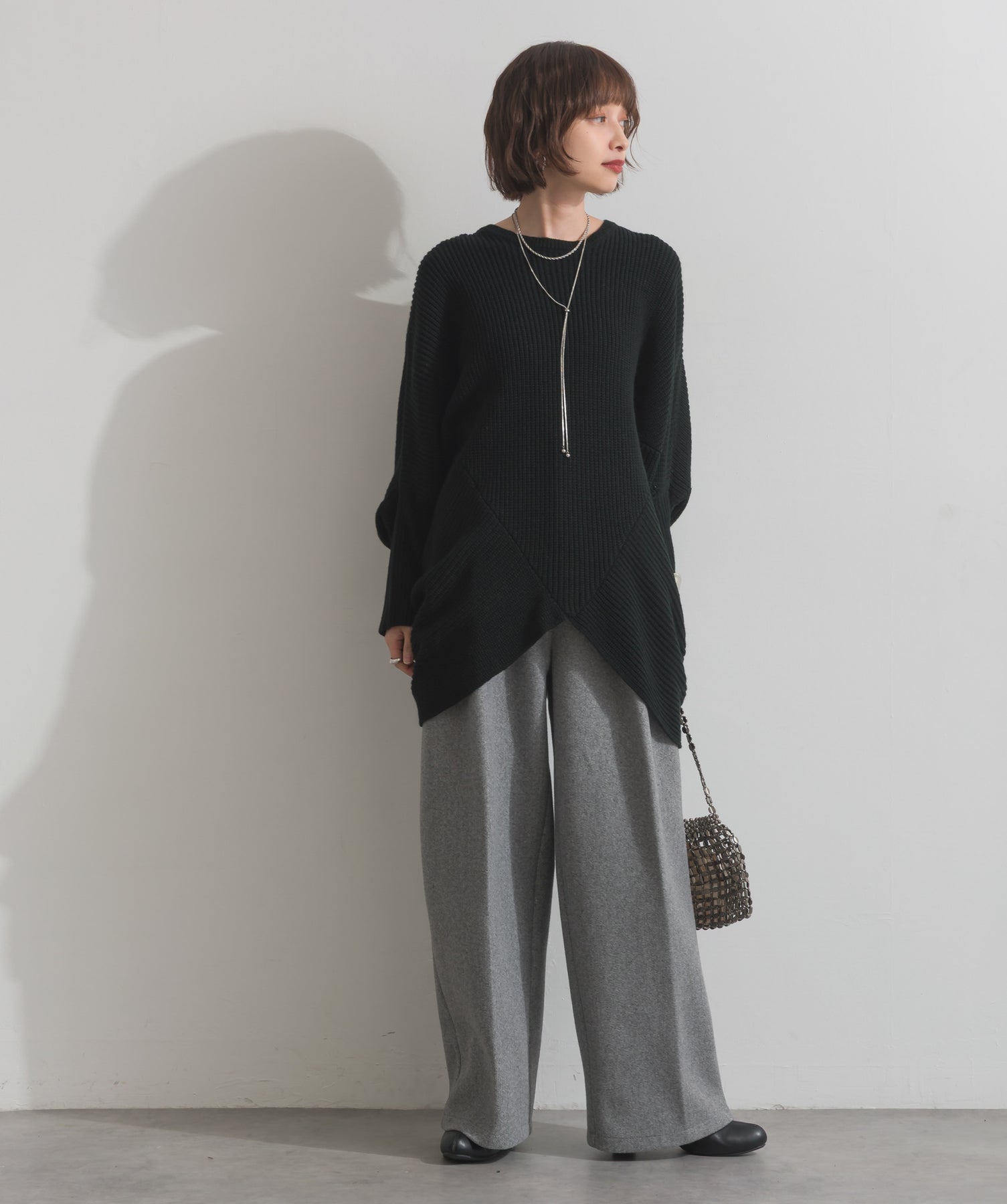 包み込むような存在感。動きを纏うドルマンニット。-material-柔らかな風合いと軽やかさを両立したアクリルニット素材を使用。しっかりとした肉感がありながらも、ふわっと包み込むような着心地を実現します。肌寒い季節も快適に過ごせる保温性が魅力です。-design-大胆なドレープとルーズなドルマンスリーブが描く立体シルエットが、他にはない抜け感とモードなムードを演出します。サイドからバックにかけての自然な落ち感が動きを美しく見せ、どんな角度からも様になる仕上がりに。ヒップラインをカバーする着丈で、細身ボトムやワイドパンツとも好相性。1枚で洒落感が決まる、存在感抜群の主役ニットです。