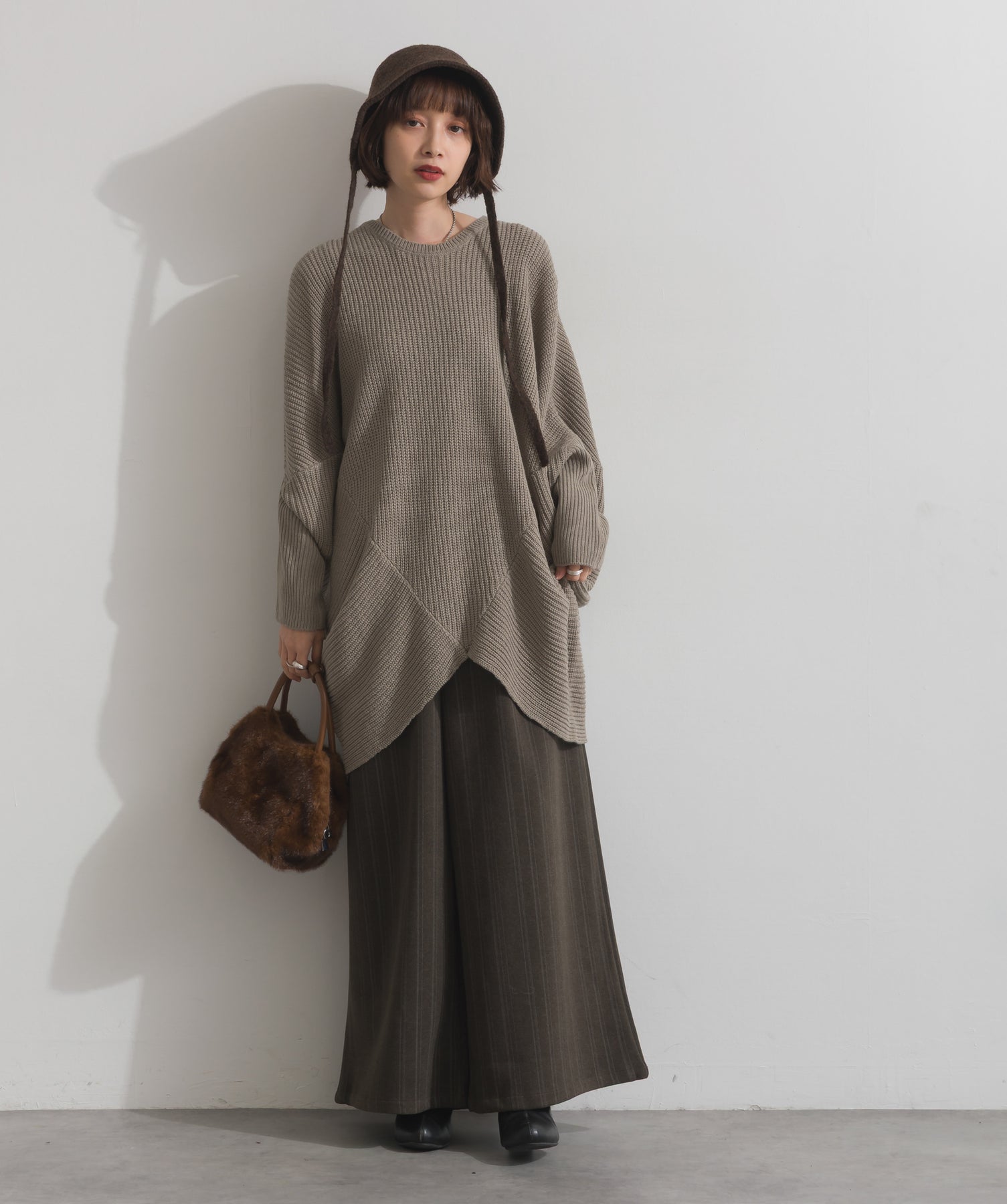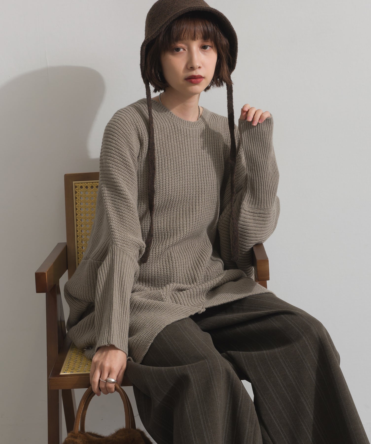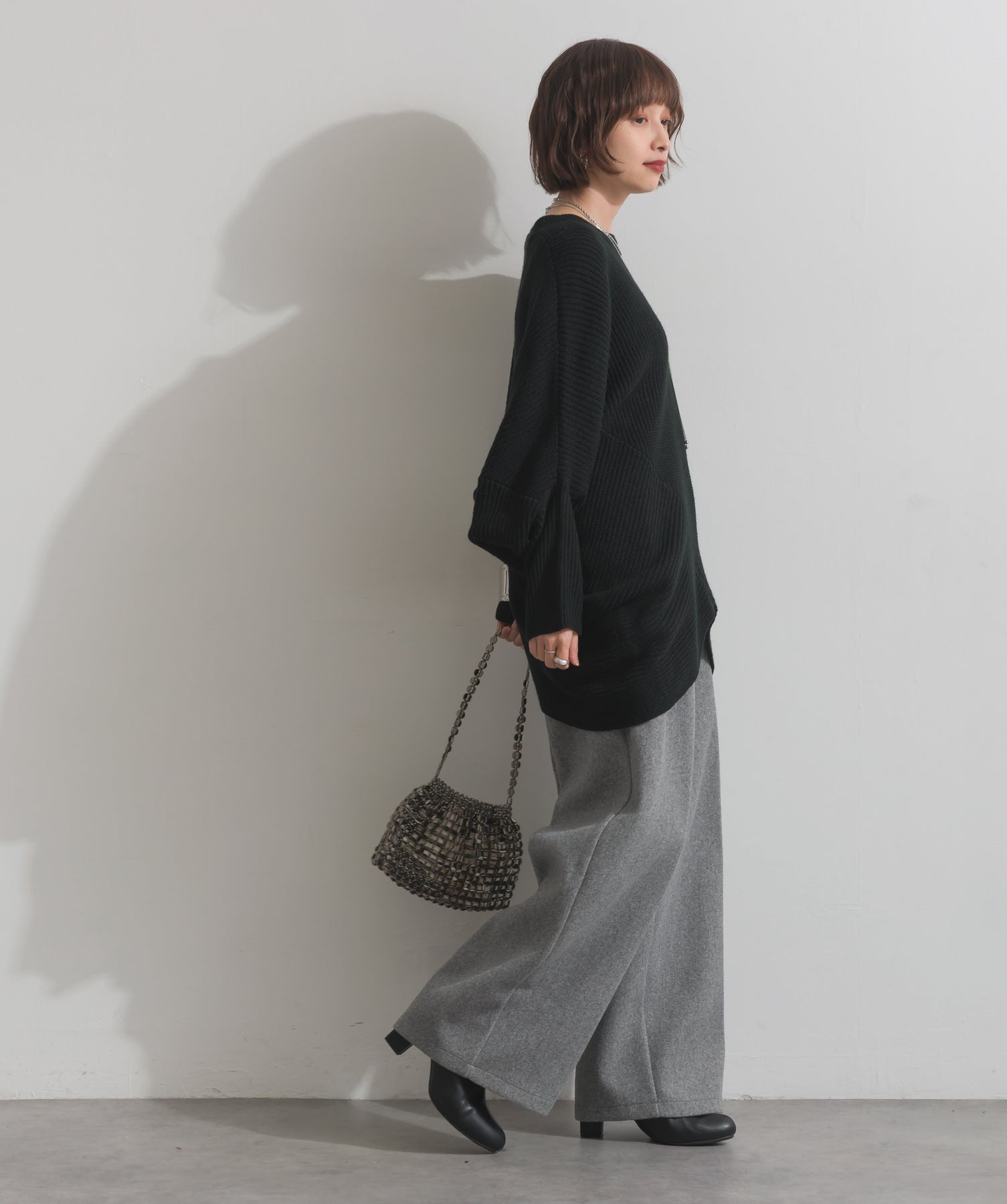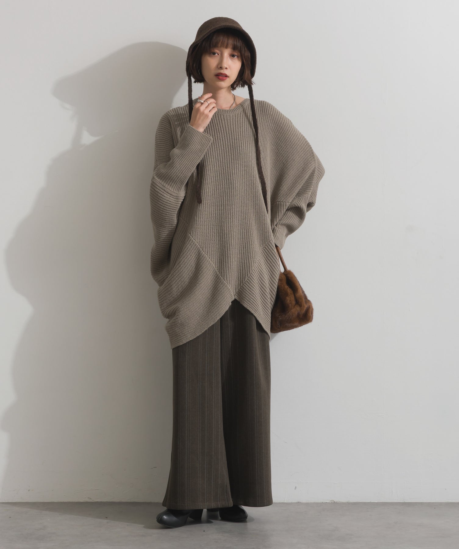 包み込むような存在感。動きを纏うドルマンニット。-material-柔らかな風合いと軽やかさを両立したアクリルニット素材を使用。しっかりとした肉感がありながらも、ふわっと包み込むような着心地を実現します。肌寒い季節も快適に過ごせる保温性が魅力です。-design-大胆なドレープとルーズなドルマンスリーブが描く立体シルエットが、他にはない抜け感とモードなムードを演出します。サイドからバックにかけての自然な落ち感が動きを美しく見せ、どんな角度からも様になる仕上がりに。ヒップラインをカバーする着丈で、細身ボトムやワイドパンツとも好相性。1枚で洒落感が決まる、存在感抜群の主役ニットです。