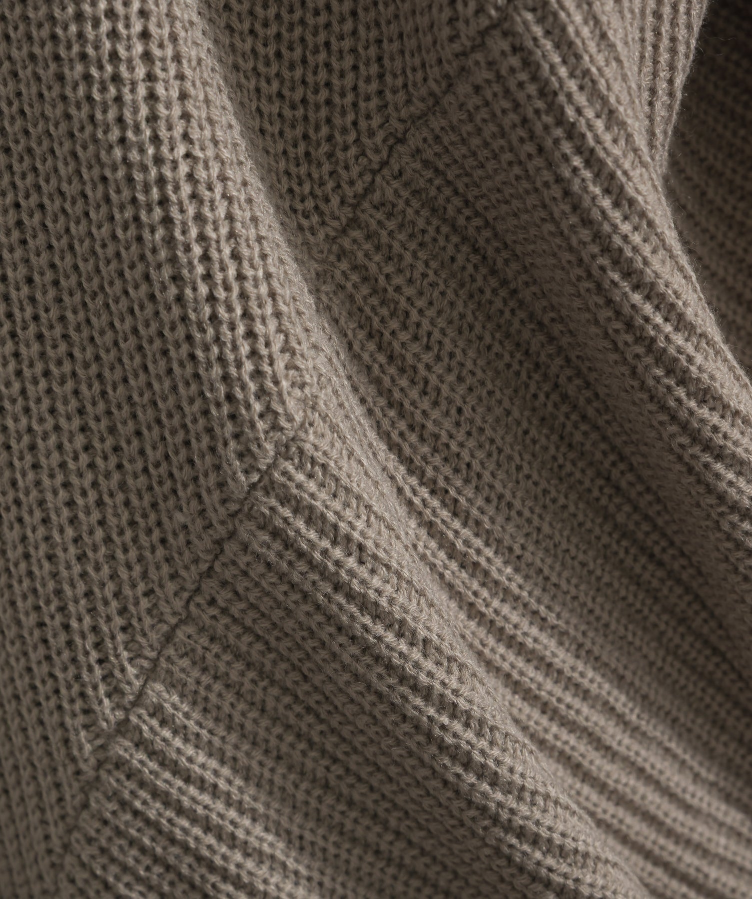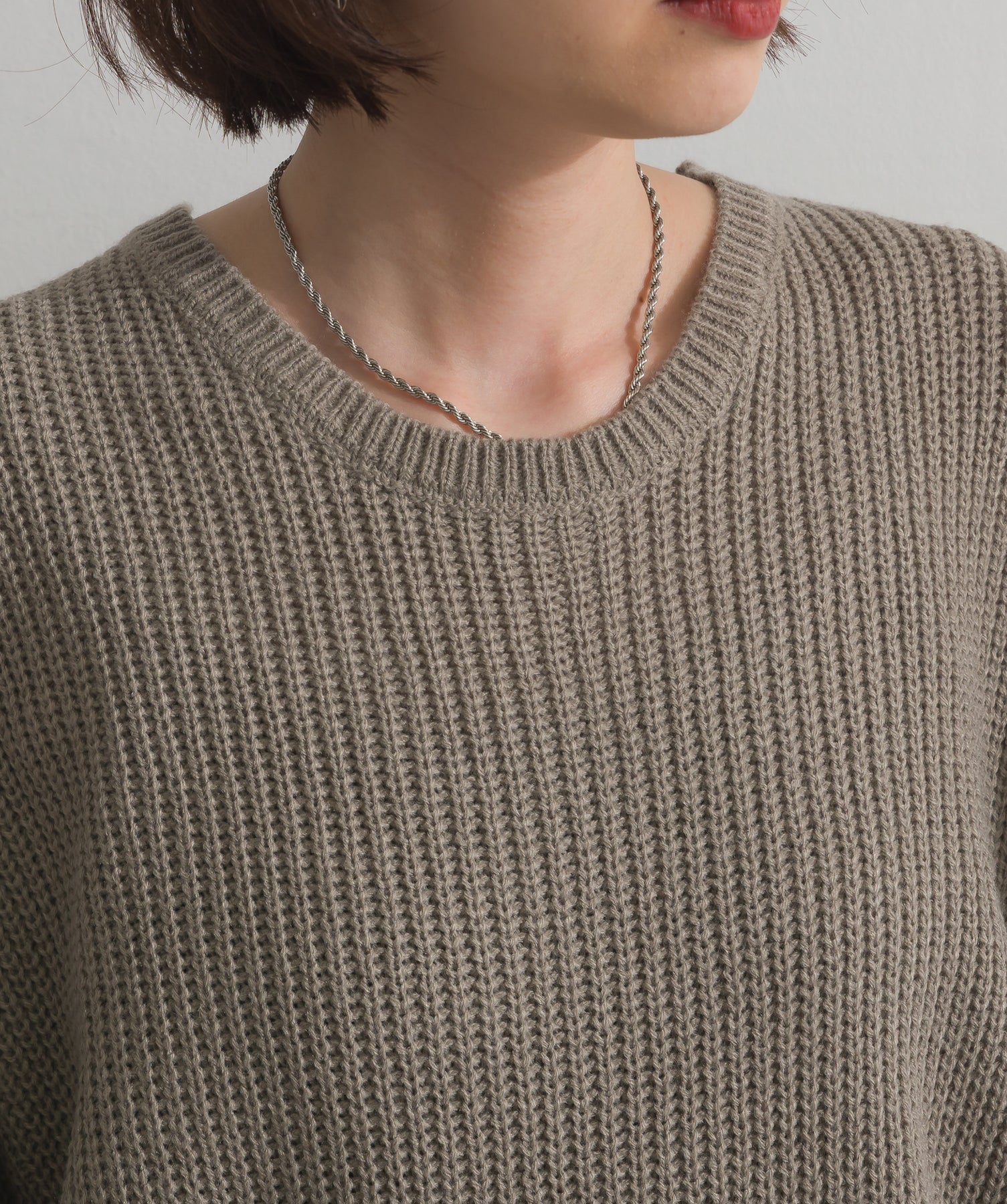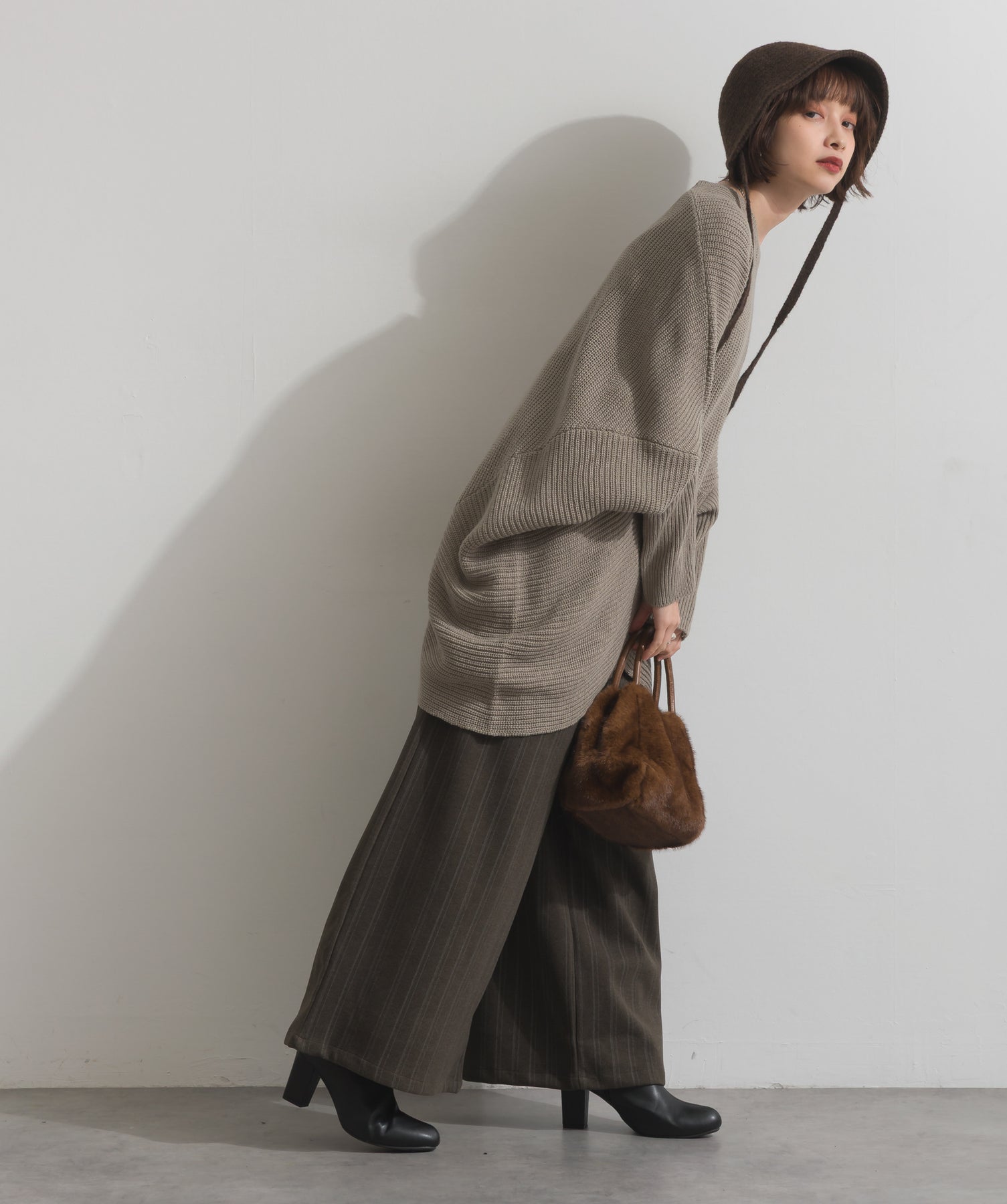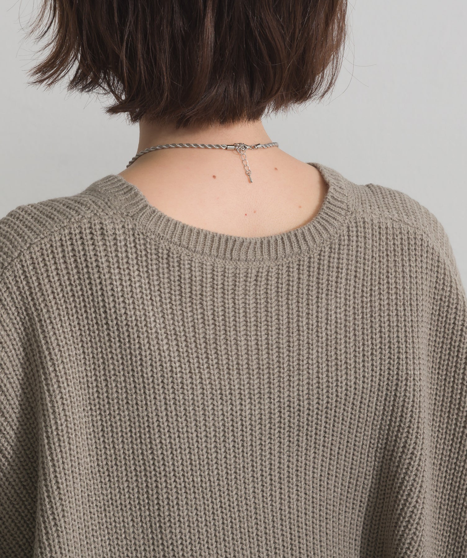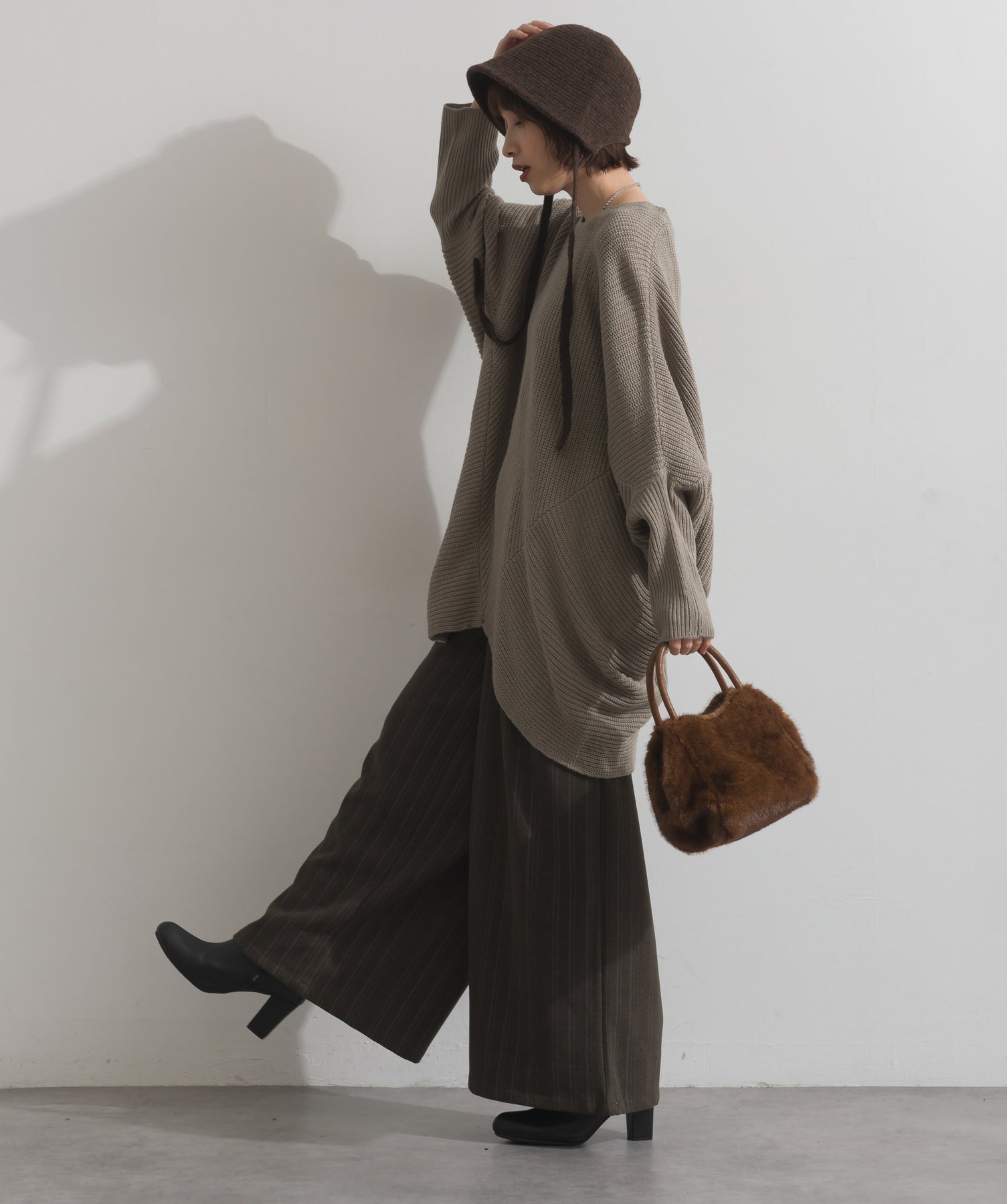 包み込むような存在感。動きを纏うドルマンニット。-material-柔らかな風合いと軽やかさを両立したアクリルニット素材を使用。しっかりとした肉感がありながらも、ふわっと包み込むような着心地を実現します。肌寒い季節も快適に過ごせる保温性が魅力です。-design-大胆なドレープとルーズなドルマンスリーブが描く立体シルエットが、他にはない抜け感とモードなムードを演出します。サイドからバックにかけての自然な落ち感が動きを美しく見せ、どんな角度からも様になる仕上がりに。ヒップラインをカバーする着丈で、細身ボトムやワイドパンツとも好相性。1枚で洒落感が決まる、存在感抜群の主役ニットです。