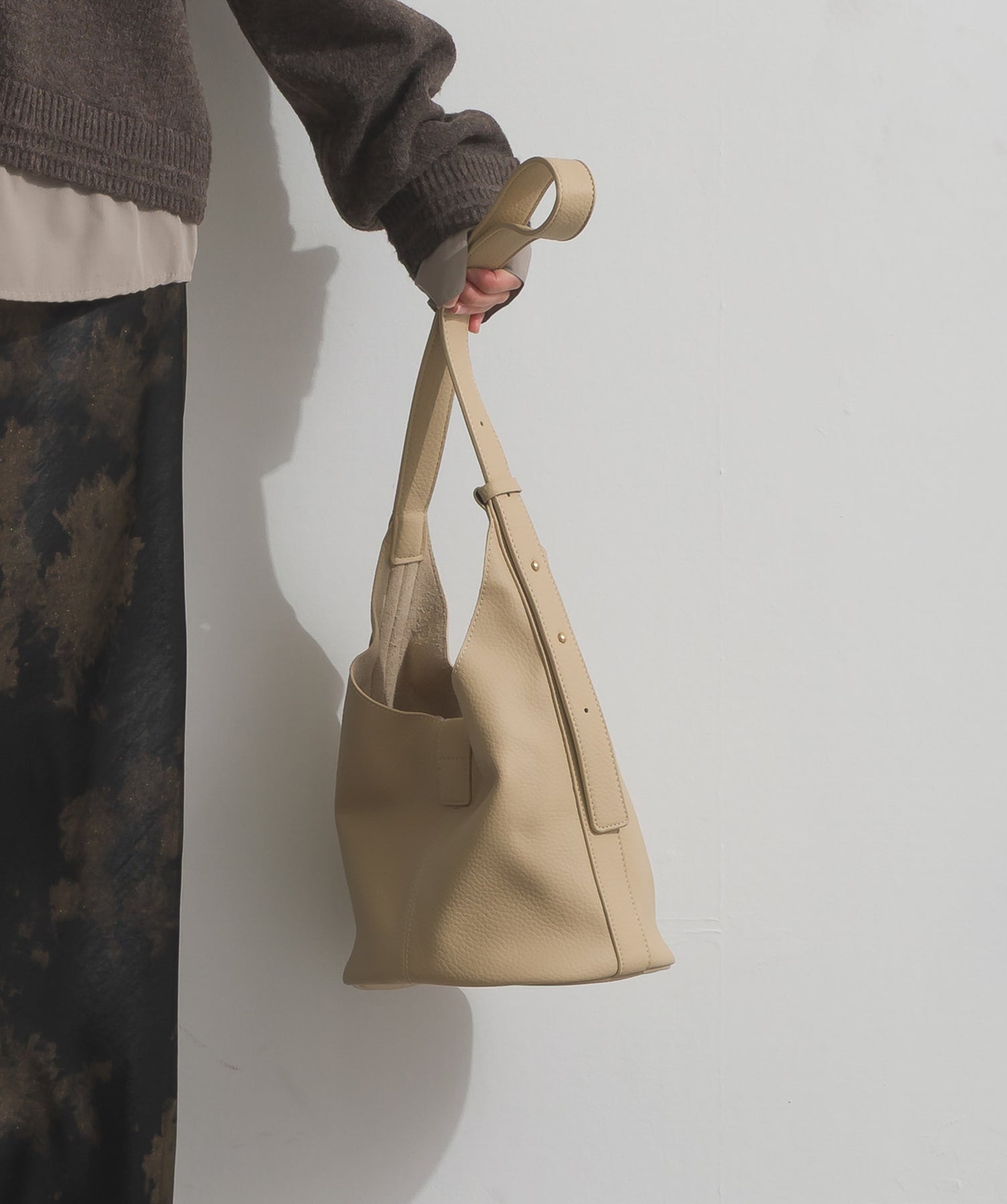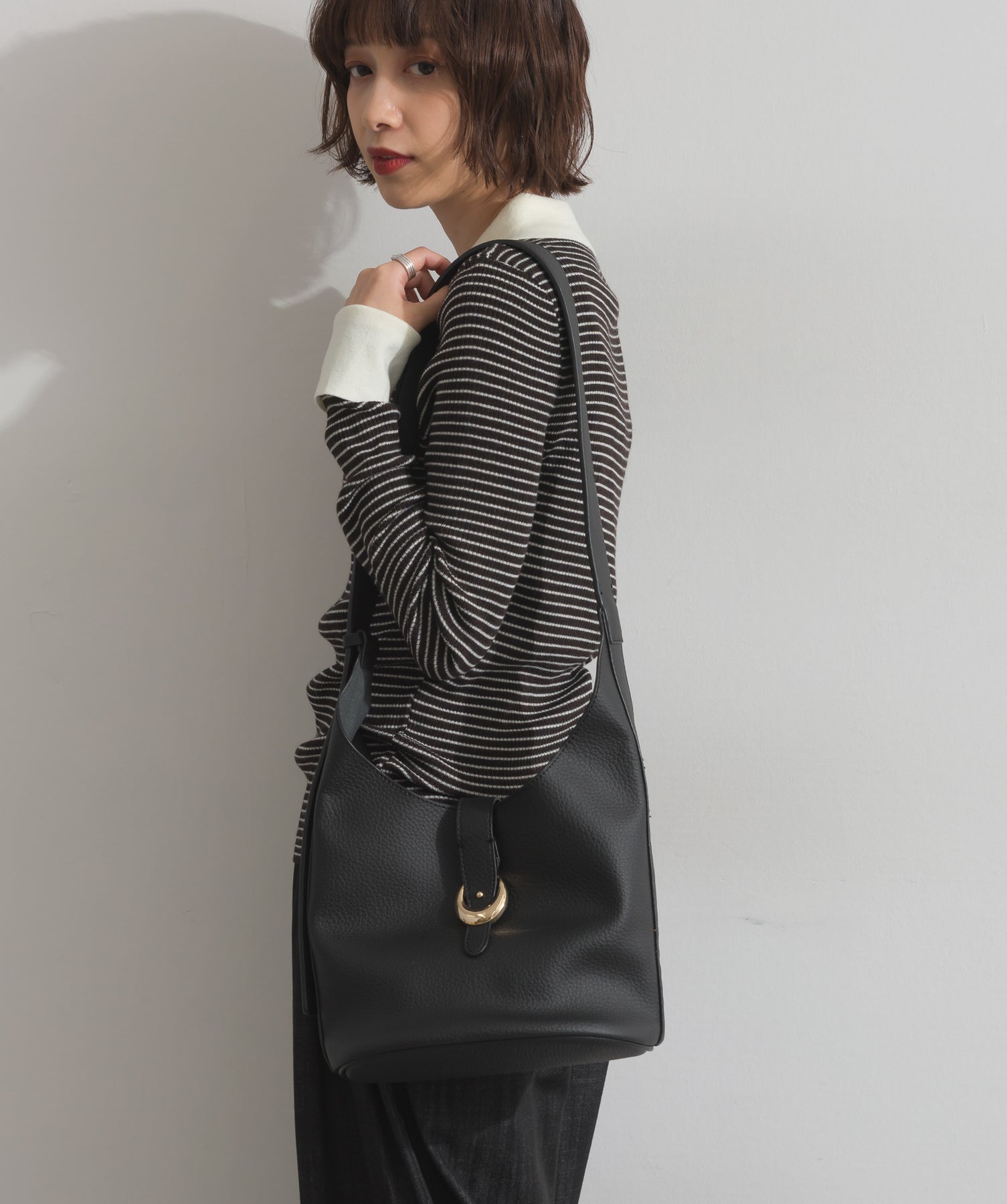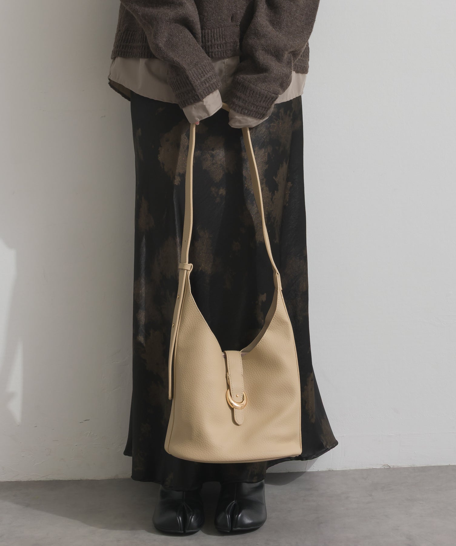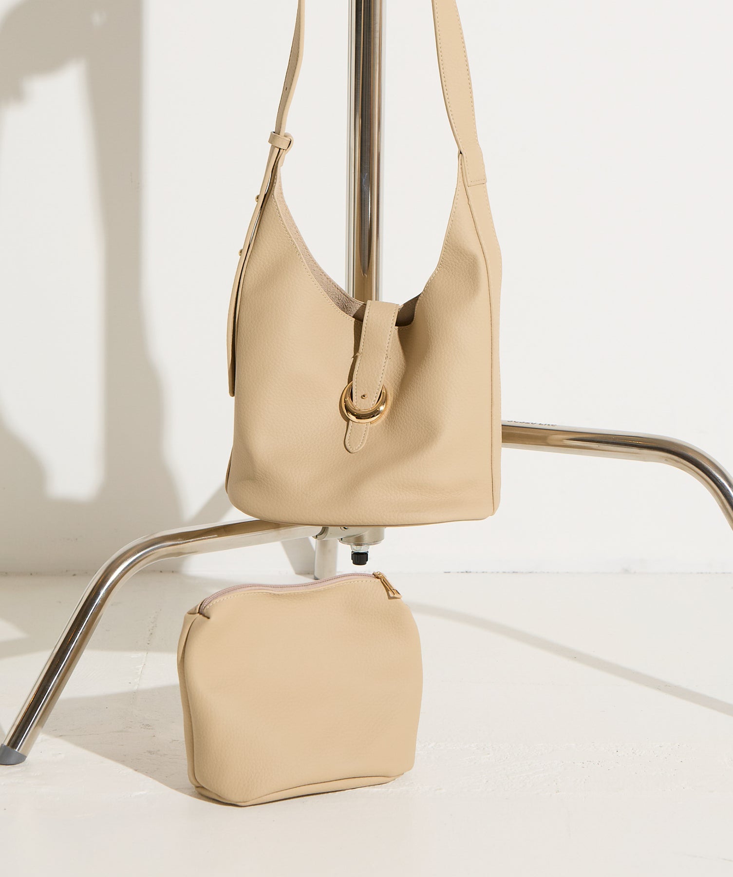 2WAYで魅せる、洗練されたミニマルバッグ。-material-上品なシボ感のあるフェイクレザー素材を使用。しなやかで高級感があり、軽量ながらしっかりとした手触りが魅力です。日常使いにも最適な耐久性を兼ね備えています。-design-シンプルなバケットシルエットに、ゴールドのリングディテールが映えるデザイン。ストラップは調節可能で、ショルダーとしてもリュックとしても使える2WAY仕様です。内側には取り外し可能なミニポーチ付きで、小物整理にも便利。洗練されたデザインと機能性を両立した、モード感あるアイテムです。