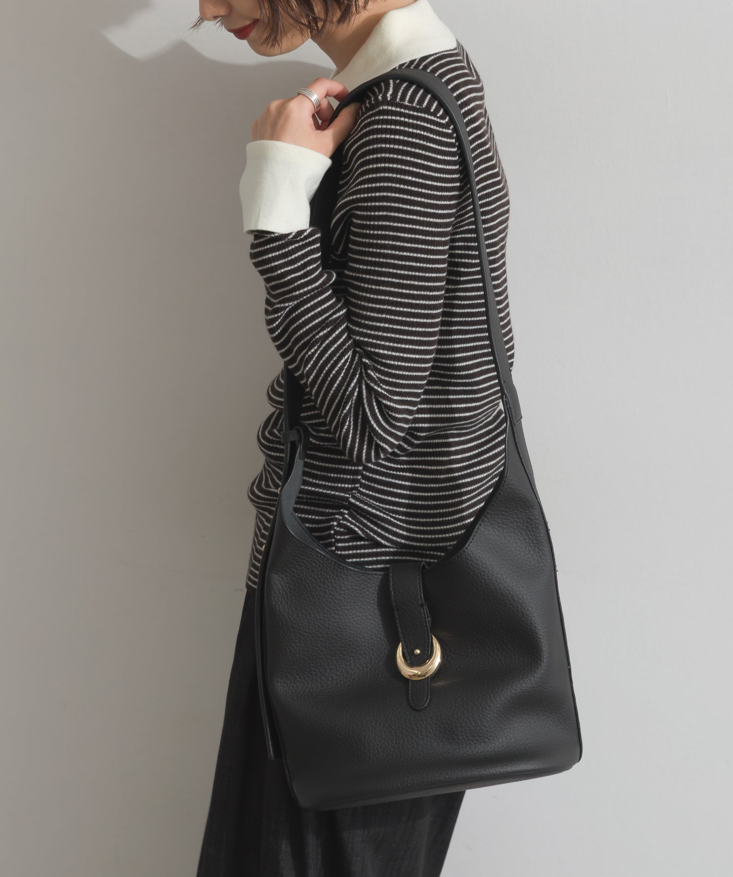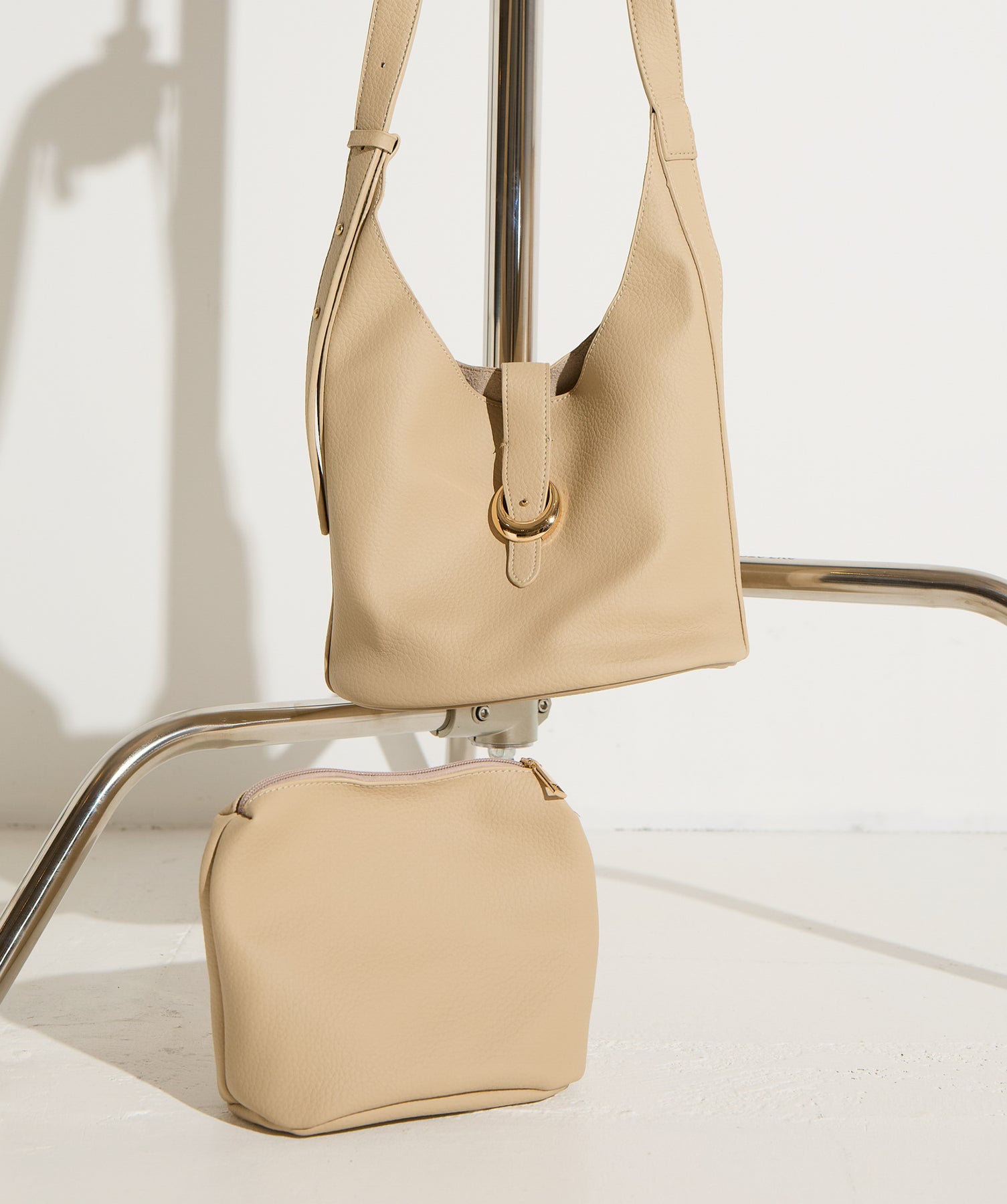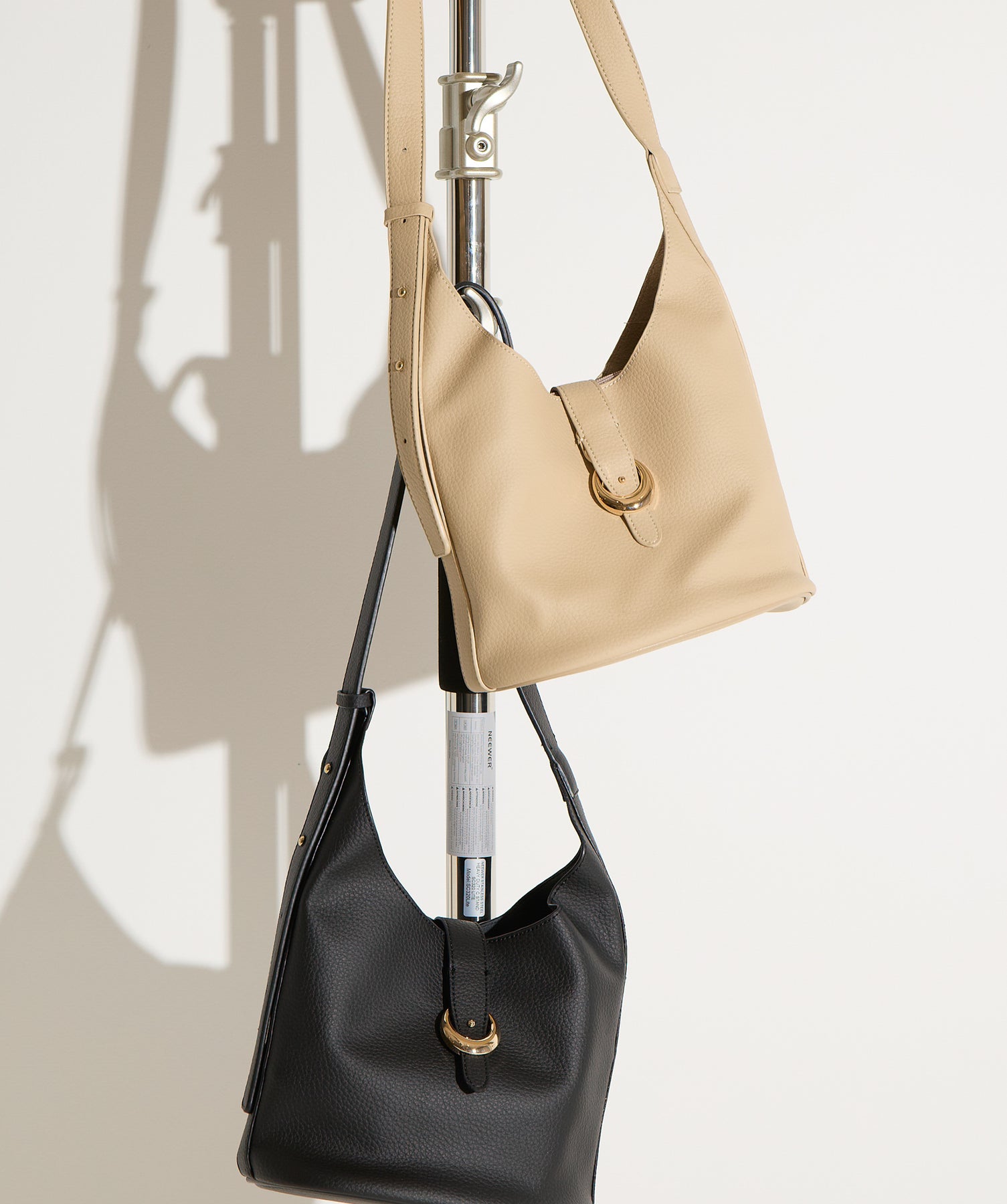 2WAYで魅せる、洗練されたミニマルバッグ。-material-上品なシボ感のあるフェイクレザー素材を使用。しなやかで高級感があり、軽量ながらしっかりとした手触りが魅力です。日常使いにも最適な耐久性を兼ね備えています。-design-シンプルなバケットシルエットに、ゴールドのリングディテールが映えるデザイン。ストラップは調節可能で、ショルダーとしてもリュックとしても使える2WAY仕様です。内側には取り外し可能なミニポーチ付きで、小物整理にも便利。洗練されたデザインと機能性を両立した、モード感あるアイテムです。