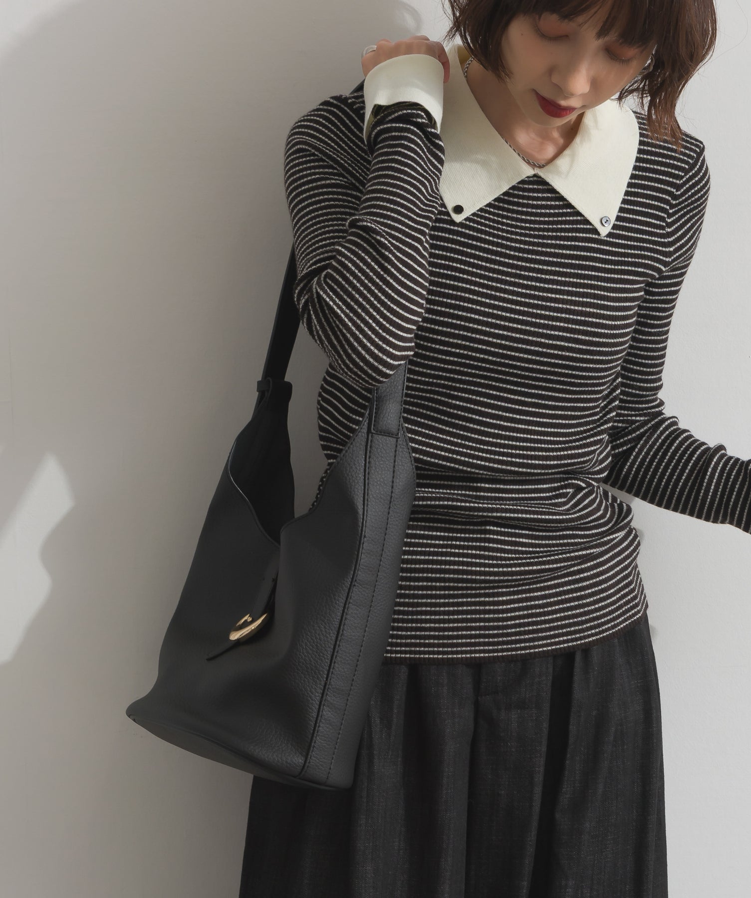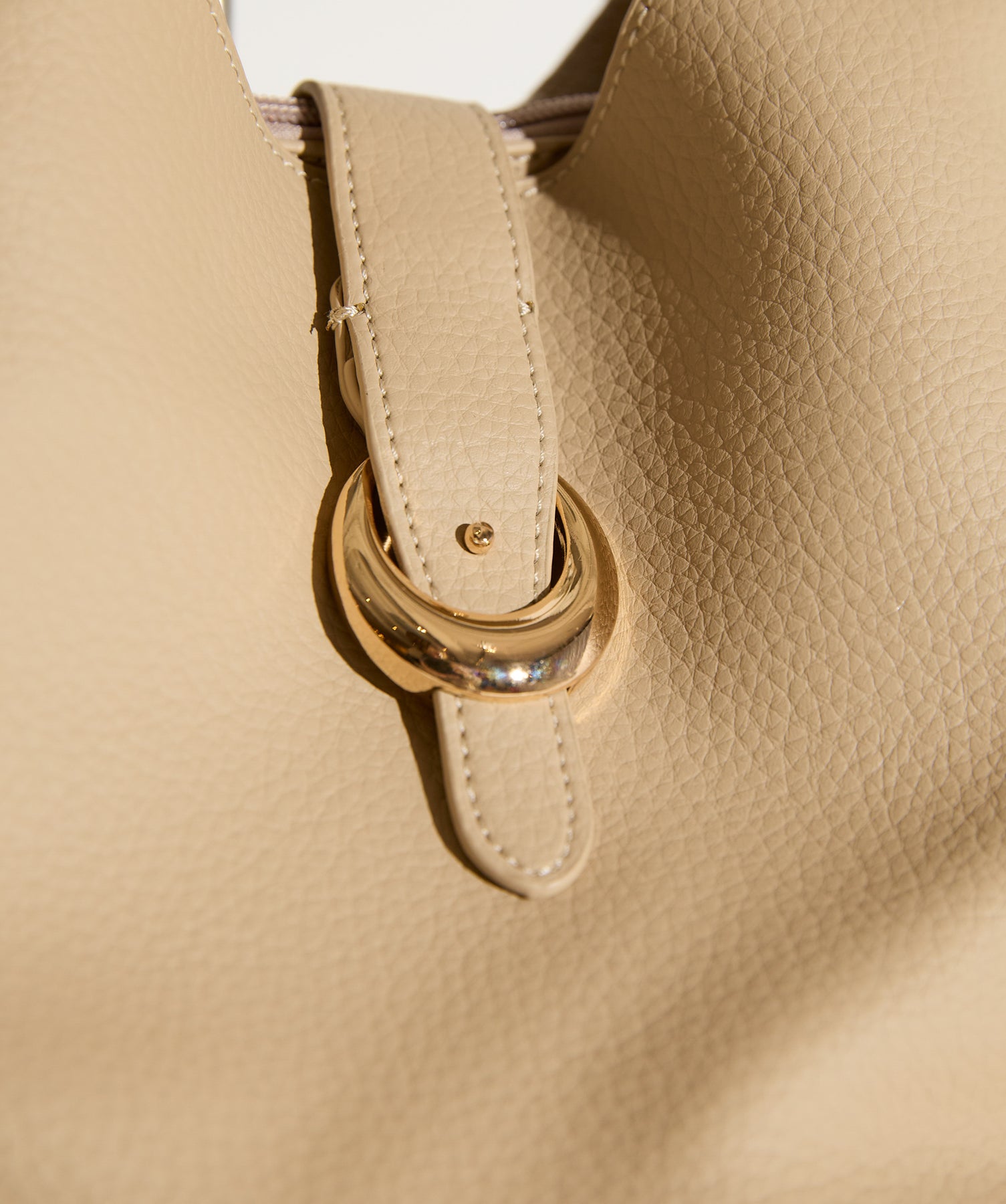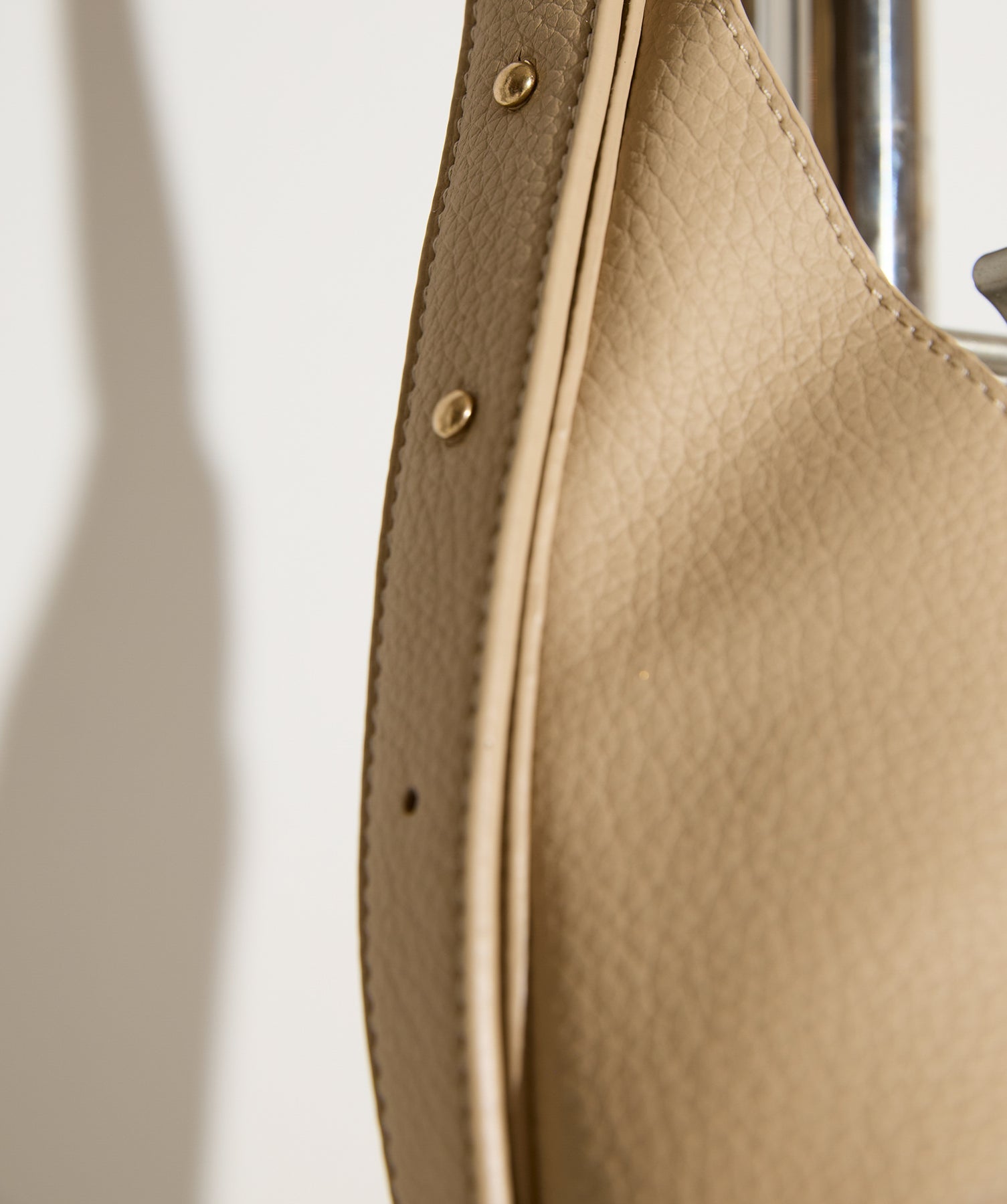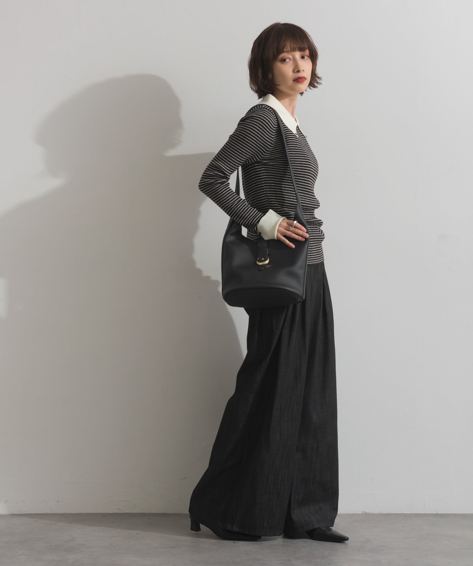 2WAYで魅せる、洗練されたミニマルバッグ。-material-上品なシボ感のあるフェイクレザー素材を使用。しなやかで高級感があり、軽量ながらしっかりとした手触りが魅力です。日常使いにも最適な耐久性を兼ね備えています。-design-シンプルなバケットシルエットに、ゴールドのリングディテールが映えるデザイン。ストラップは調節可能で、ショルダーとしてもリュックとしても使える2WAY仕様です。内側には取り外し可能なミニポーチ付きで、小物整理にも便利。洗練されたデザインと機能性を両立した、モード感あるアイテムです。