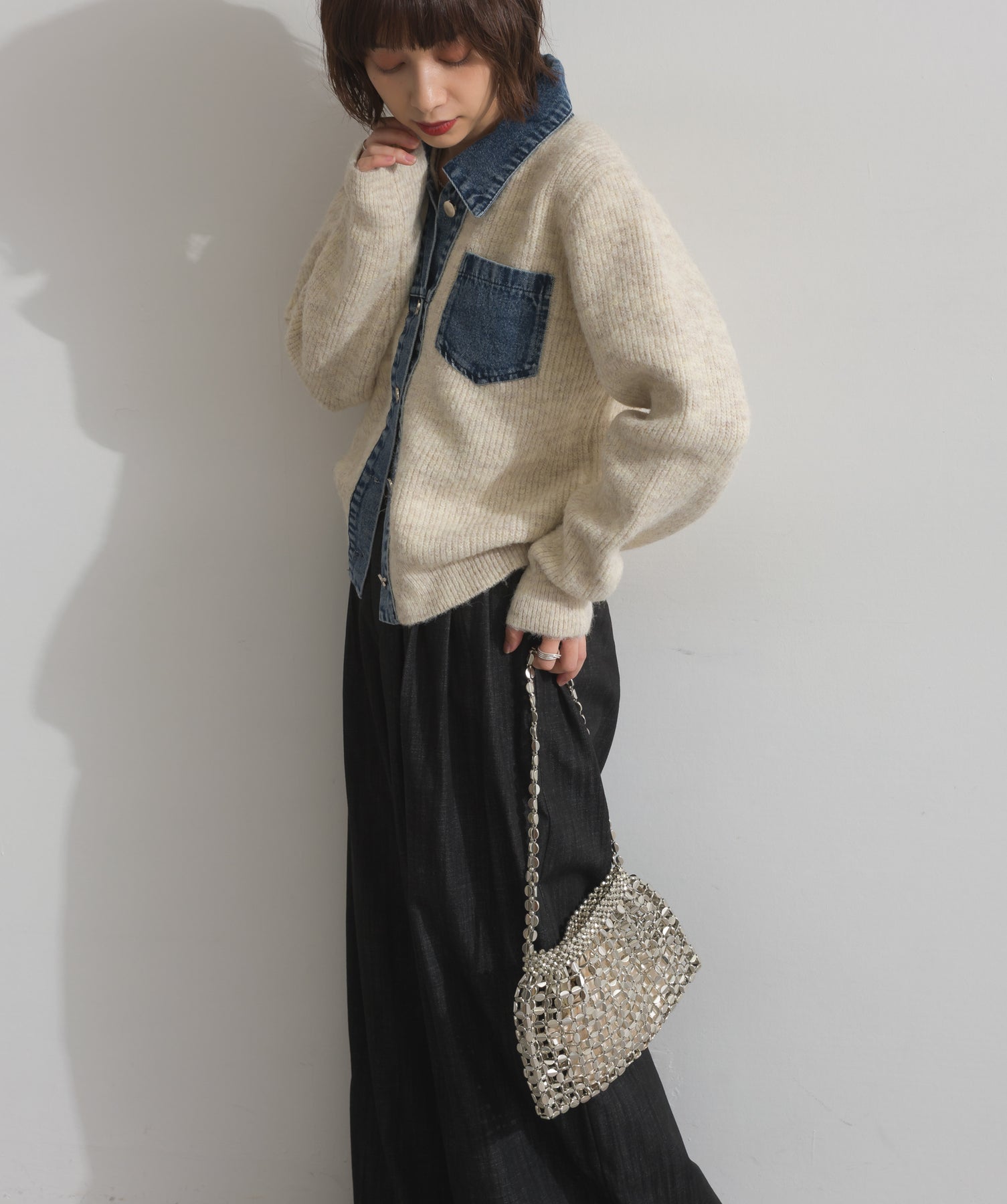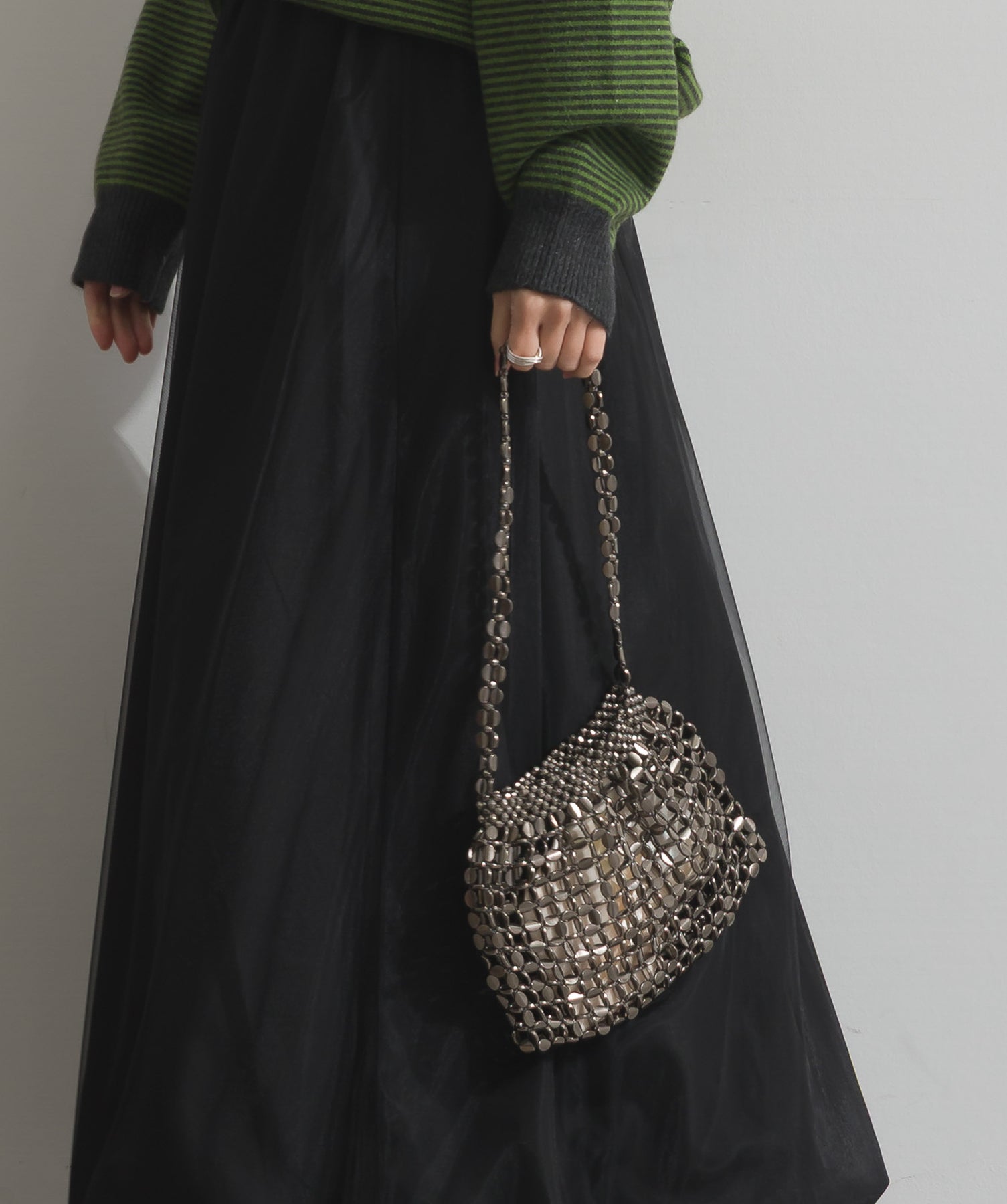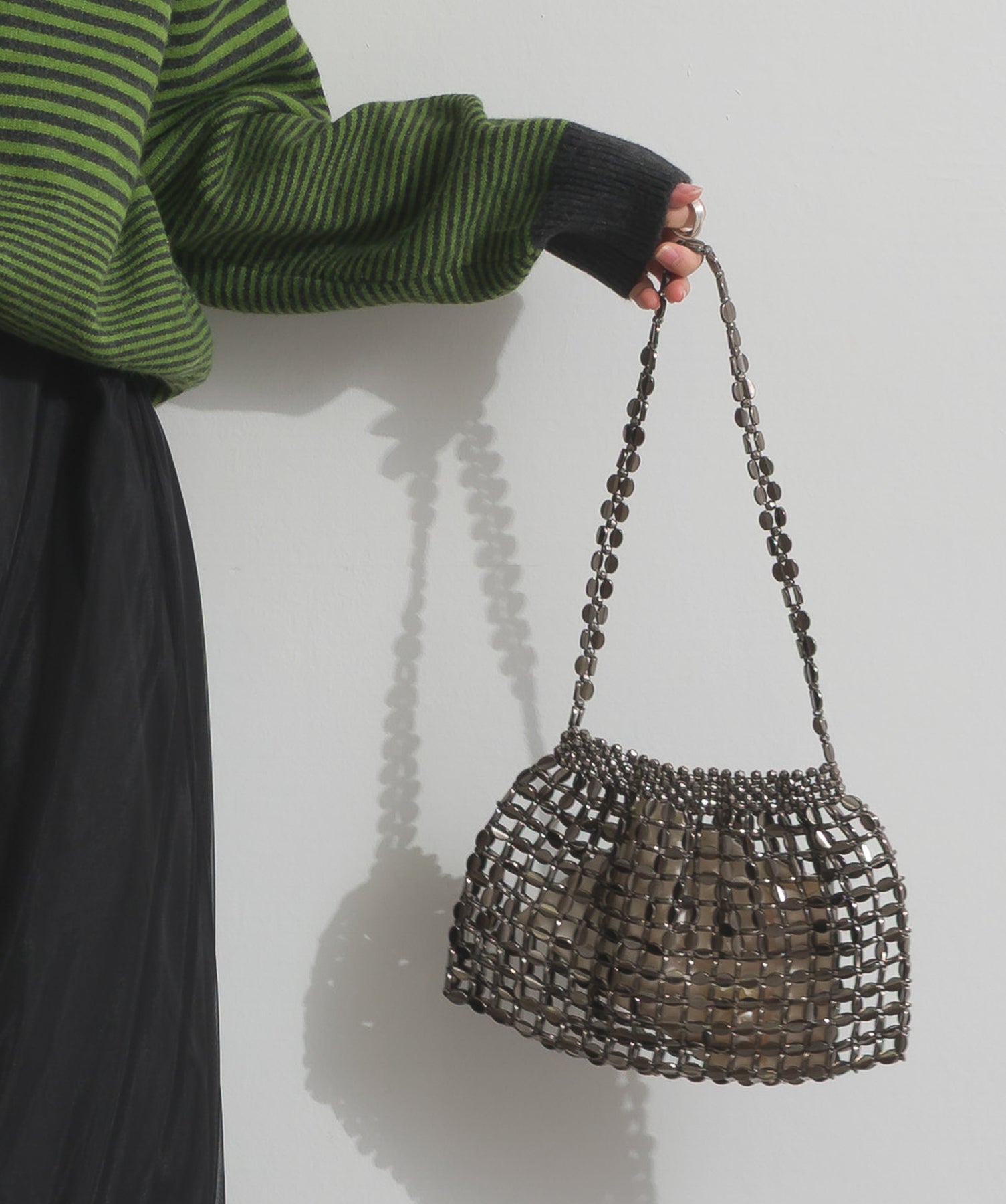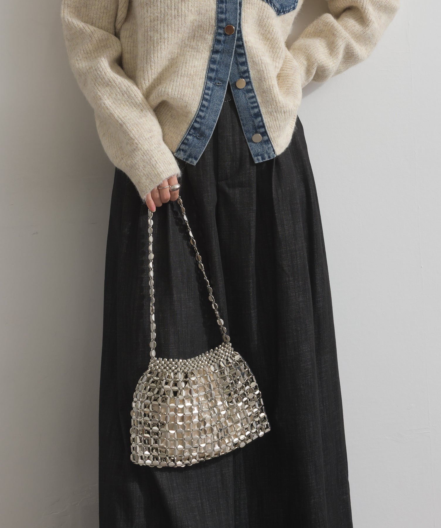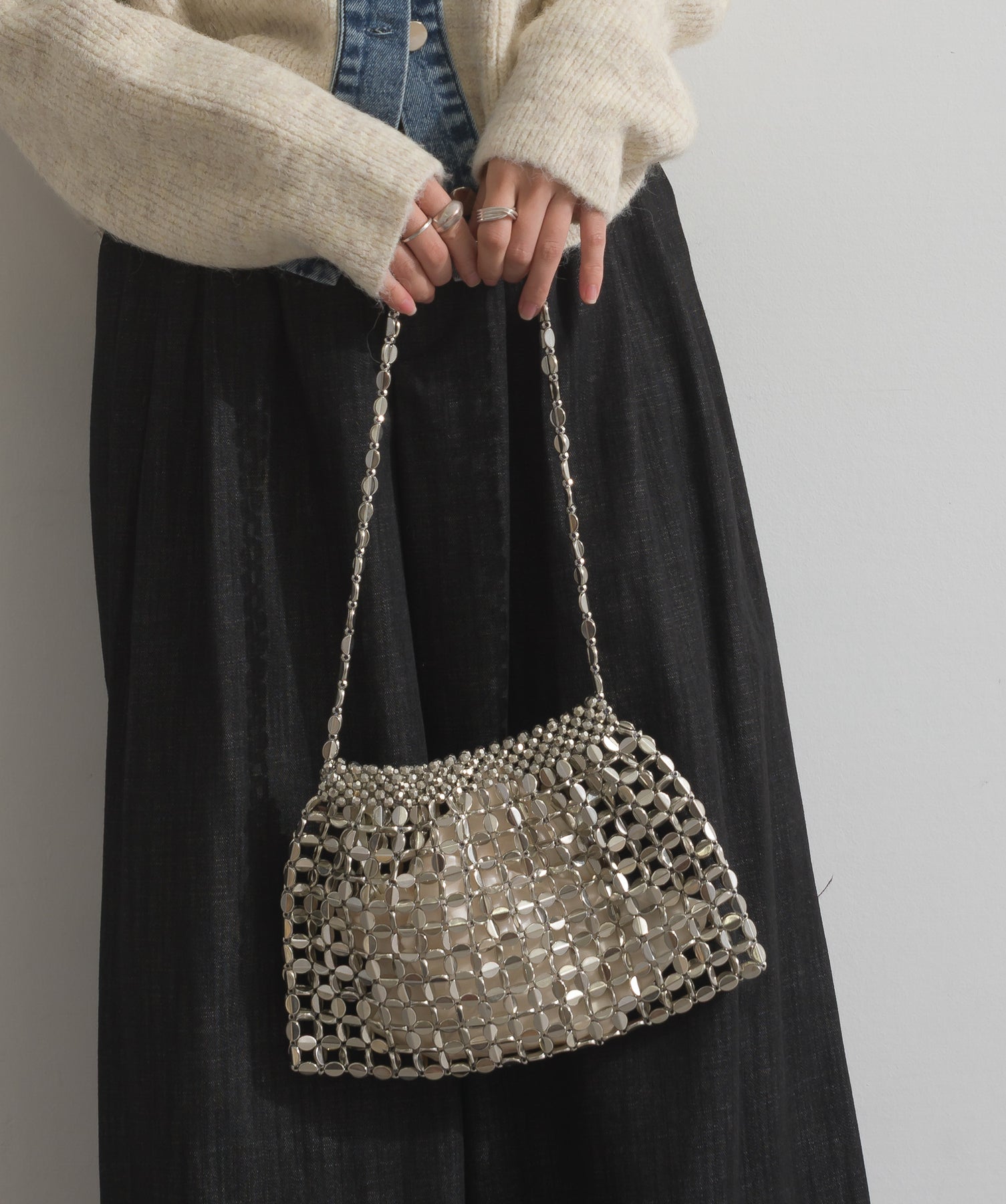光で魅せる、主役級の存在感。-material-メタリックな輝きが目を惹く、軽量アルミチェーン素材を贅沢に使用。繊細ながら強度のある作りで、華奢な見た目以上の実用性を備えています。中には程よい光沢のサテン巾着付き。シアー感のある編み込みとのコントラストで、アイテム自体がアクセサリーのような仕上がりに。-design-シャープな印象を与えるチェーンバッグに、女性らしい丸みを持たせたニュアンスフォルムをミックス。コンパクトなサイズ感ながらも、ミニ財布やリップなど必要最低限のアイテムがしっかり入る設計。ショルダーとしてもハンド持ちでも映える、トレンドに左右されない洗練デザインです。スタイリングを一気に格上げするアクセントバッグとして、ナイトシーンはもちろん、あえてカジュアルに外すのもおすすめ。